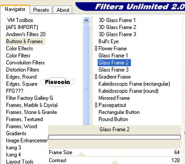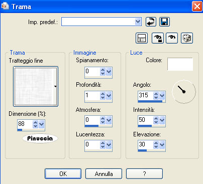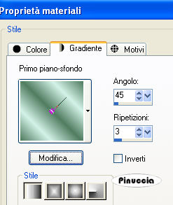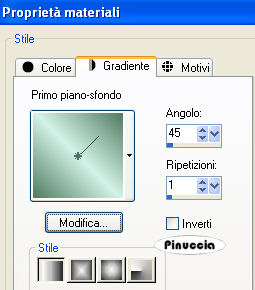 qui puoi trovare qualche risposta ai tuoi dubbi. Se l'argomento che ti interessa non è presente, ti prego di segnalarmelo. Per tradurre questo tutorial ho usato PSP X, ma può essere eseguito anche con le altre versioni di PSP. Occorrente: Materiale: qui Filtri: Filter Unlimited 2.0 qui Graphics Plus qui Metti la selezione nella cartella Selezioni. Imposta il colore di primo piano con #4f7c5f, e il colore di sfondo con #d4f2e8. 1. Apri una nuova immagine trasparente 700 x 500 pixels, e riempila con il colore chiaro.Effetti>Effetti di trama>Trama - seleziona la trama Tratteggio fine, se stai usando PSPX2 Corel_15_019: ![]() 2. Livelli>Nuovo livello raster. Selezione>Seleziona tutto. Apri il tube "Annie Design Cloudy" e vai a Modifica>copia. Torna al tuo lavoro e vai a Modifica>Incolla nella selezione. Selezione>Deseleziona. Effetti>Effetti di trama>Trama, con i settaggi precedenti. Abbassa l'opacità di questo livello al 20%. Livelli>Unisci>Unisci visibile. 3. Apri il tube Paulina-venstertube e vai a Modifica>copia. Torna al tuo lavoro e vai a Modifica>Incolla come nuovo livello. Cambia la modalità di miscelatura di questo livello in Luminanza (Esistente), e abbassa l'opacità al 50%. Non occorre spostare il tube. Eventualmente potrai farlo più tardi. 4. Apri il tube della donna "Pascale 291008". Immagine>ridimensiona, a 500 pixels di altezza, tutti i livelli non selezionato. Modifica>copia. Torna al tuo lavoro e vai a Modifica>Incolla come nuovo livello. Sposta il tube a destra.5. Apri il tube "tiere_chinni36" e vai a Modifica>Copia. Torna al tuo lavoro e vai a Modifica>Incolla come nuovo livello. Immagine>Rifletti. Immagine>Ridimensiona, al 75%, tutti i livelli non selezionato. Livelli>Duplica. Immagine>Ridimensiona, al 75%, tutti i livelli non selezionato. Ancora una volta, Livelli>Duplica. Immagine>Ridimensiona, al 75%, tutti i livelli non selezionato. Di nuovo Livelli>Duplica. Immagine>Ridimensiona, al 75%, tutti i livelli non selezionato. Posiziona armoniosamente le quattro farfalle (vedi il mio esempio per orientarti).![]() Chiudi tutti i livelli tranne quelli della 4 farfalle. Livelli>Unisci>Unisci visibile. Cambia la modalità di miscelatura di questo livello Uniti in Luminanza (esistente). Effetti>Effetti 3D>Sfalsa ombra: ![]() 6. Apri il tube "Anny Design Ringmetbloem" vai a Modifica>copia. Torna al tuo lavoro e vai a Modifica>Incolla come nuovo livello. Immagine>Rifletti. Immagine>Ridimensiona, al 75%, tutti i livelli non selezionato. Immagine>ruota per gradi - 65 gradi a sinistra. Cambia la modalità di miscelatura di questo livello in Luminanza (Esistente). Effetti>Effetti 3D>Sfalsa ombra, con i settaggi precedenti. Sposta il tube un po' più a sinistra.7. Livelli>Nuovo livello raster. Selezione>Carica/Salva selezione>Carica selezione da disco. Cerca e carica la selezione Anny_Greenery: ![]() Riempi la selezione con il colore scuro.Selezione>Modifica>Contrai - 3 pixels. Riempi con il colore chiaro.Selezione>Modifica>Contrai - 4 pixels. Passa il colore di primo piano a Gradiente di primo piano/sfondo, con i seguenti settaggi: ![]() Riempi la selezione con questo gradiente.Effetti>Plugins>Filters Unlimited 2.0 - Buttons and Frames - Glass Frame 2, con i settaggi standard. Selezione>Deseleziona. Effetti>Effetti 3D>Sfalsa ombra, con i settaggi precedenti. Ripeti l'Effetto Sfalsa ombra, cambiando verticale e orizzontale con -3. 8. Livelli>Nuovo livello raster. Attiva lo strumento Testo e scegli un font.Per il mio testo ho usato il font CAC Champagne, crea come vettore. Scrivi il testo. Immagine>Ruota per gradi - 90 gradi a sinistra. ![]() Posizionalo al centro nella striscia a sinistra. Livelli>Converti in livello raster. Applica al testo un Effetto Sfalsa ombra a tua scelta. 9. Livelli>Nuovo livello raster. Aggiungi il tuo nome e/o il tuo watermark. Controlla che tutto sia al posto giusto e vai a Livelli>Unisci>Unisci tutto. 10. Immagine>Aggiungi bordatura, 45 pixels, simmetriche, con il colore scuro. Seleziona questo bordo con la bacchetta magica ![]() ![]() Selezione>modifica>Contrai - 2 pixels. Riempi la selezione con il colore chiaro.Selezione>Modifica>Contrai - 4 pixels. Cambia i settaggi del gradiente portando le ripetizioni a 3. ![]() Riempi la selezione con questo gradiente.Effetti>Plugins>Graphics Plus - Cross Shadow: ![]() Effetti>Plugins>Filters Unlimited - Buttons and Frames - Glass frame 2, con i settaggi standard. ![]() Selezione>Deseleziona. Hai finito. Se non vuoi aggiungere l'animazione, salva in formato jpg. Per creare l'animazione, copia l'immagine: Modifica>Copia. Apri Animation Shop e vai a Modifica>Incolla>Incolla come nuova animazione. Modifica>Duplica e ripeti finchè non avrai ottenuto 5 fotogrammi. clicca sul primo fotogramma per selezionarlo e vai a Modifica>Seleziona tutto. Apri la gif Flonkelster, anche questa composta da 5 fotogrammi. Clicca sul primo fotogramma per selezionarlo e vai a Modifica>Seleziona tutto, poi Modifica>Copia. Torna al tuo lavoro e vai a Modifica>Incolla>Incolla nel fotogramma selezionato. Posiziona il diamantino sulla gemma dell'anello e, quando sei certo di aver trovato la posizione corretta, rilascia il tasto del mouse. Apri la seconda animazione fornita Diamantje, anche questa composta da 5 fotogrammi. Ripeti i passaggi come hai fatto prima per aggiungere questa piccola animazione dove e quante volte vuoi. Animazione>Proprietà fotogramma e imposta la velocità a 15. ![]() Alla fine, controlla il risultato cliccando su Visualizza e salva in formato gif.Variante senza animazione. ![]() Se hai problemi o dubbi, o trovi un link non funzionante, o anche soltanto per un saluto, scrivimi. 1 Febbraio 2009 |