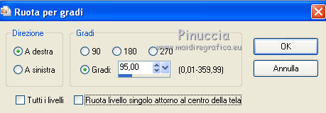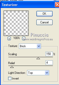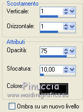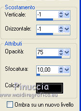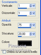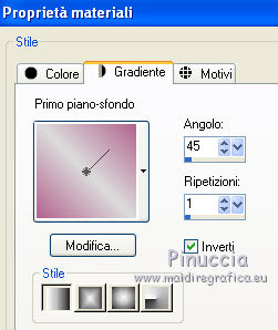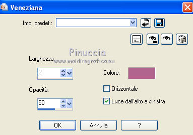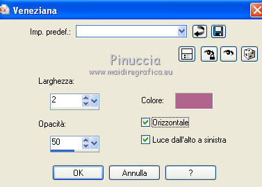 qui puoi trovare qualche risposta ai tuoi dubbi. Se l'argomento che ti interessa non è presente, ti prego di segnalarmelo. Occorrente: Materiale qui Filtri: Graphics Plus - Cross Shadow qui Xero - Porcelain qui Texture - Texturizer qui Animation Shop qui ![]() Imposta il colore di primo piano con #dbdbdb, e il colore di sfondo con #b1648d, (eventualmente, se stai usando un altro tube, scegli due colori da questo tube). 1. Apri una nuova immagine trasparente 600 x 600 pixels, e riempila con il colore di sfondo (Tasto destro del mouse).2. Livelli>Nuovo livello raster. Selezione>Seleziona tutto. 3. Apri il tube Anny_MistedSee_001 e vai a Modifica>Copia. Torna al tuo lavoro e vai a Modifica>Incolla nella selezione. Selezione>Deseleziona. 4. Apri il tube Anny_Boog_001, e vai a Modifica>Copia. Torna al tuo lavoro e vai a Modifica>Incolla come nuovo livello. 5. Effetti>Plugins>Texture - Texturizer. ![]() Effetti>Effetti 3D>sfalsa ombra, con il colore nero. ![]() Ripeti l'Effetto Sfalsa ombra, cambiando verticale e orizzontale con -1. 6. Apri il tube Anny_stenen_001 e vai a Modifica>Copia. Torna al tuo lavoro e vai a Modifica>Incolla come nuovo livello. Livelli>Disponi>Sposta giù. Sposta il tube in basso contro il bordo.Effetti>Effetti 3D>Sfalsa ombra, con il colore nero. ![]() 7. Attiva il livello superiore. Apri il tube Anny_Charlie_O_Neil_001 e vai a Modifica>Copia. Torna al tuo lavoro e vai a Modifica>Incolla come nuovo livello. Immagine>Ridimensiona, al 75%, tuttii livelli non selezionato. Sposta il tube in basso a destra.Effetti>Effetti 3D>sfalsa ombra. ![]() Ripeti l'Effetto Sfalsa ombra, cambiando verticale e orizzontale con -1. 8. Apri il tube Anny_Orchidee_002 e vai a Modifica>Copia. Torna al tuo lavoro e vai a Modifica>Incolla come nuovo livello. Immagine>Ruota per gradi - 95 gradi a destra. ![]() Sposta il tube in basso a sinistra.Livelli>Duplica. Immagine>Rifletti. Sposta questo duplicato soopra gli altri fiori (vedi il mio esempio).Livelli>Unisci>Unisci giù. 9. Apri il tube Anny_Dieren_001 e vai a Modifica>Copia. Torna al tuo lavoro e vai a Modifica>Incolla come nuovo livello. Spostalo in basso accanto alla donna.Effetti>Effetti 3D>Sfalsa ombra: ![]() 10. Apri il tube Anny_Schip_001 e e vai a Modifica>Copia. Torna al tuo lavoro e vai a Modifica>Incolla come nuovo livello. Immagine>Ridimensiona, al 62%, tutti i livelli non selezionato. Posiziona la nave sul mare.Nella paletta dei livelli porta questo livello sotto il livello dell'arco. Cambia la modalità di miscelatura di questo livello in Luminanza (Esistente). 11. Attiva il livello superiore. Aggiungi il tuo nome e/o il tuo watermark su un nuovo livello. 12. Attiva lo strumento Testo , scegli un font (il mio Curlz MT),e scrivi un testo con il colore di sfondo. 13. Controlla che tutto sia al posto giusto. Livelli>Unisci>Unisci tutto. Effetti>Plugins>Xero - Porcelain, con i settaggi standard. ![]() 14. Immagine>Aggiungi bordatura, 1 pixel, simmetriche, con il colore di sfondo. Immagine>Aggiungi bordatura, 20 pixels, simmetriche, con un colore contrastante. Seleziona questo bordo con la bacchetta magica .Livelli>Nuovo livello raster. Passa il colore di primo piano a Gradiente lineare. ![]() Riempi il livello con questo gradiente.Effetti>Plugins>Graphics Plus - Cross Shadow - 2 volte con i seguenti settaggi. ![]() Effetti>Effetti di trama>Veneziana. ![]() Ripeti l'Effetto Veneziana, togliendo la selezione a Orizzontale. ![]() 16. Immagine>Aggiungi bordatura, 1 pixel, simmetriche, con il colore di sfondo. 17. Modifica>Copia. 18. Apri Animation Shop e vai a Modifica>Incolla>Incolla come nuova animazione. Modifica>Duplica e ripeti finchè non avrai 12 fotogrammi. Apri la piccola animazione fornita con il materiale - Flonkelster_ph - e composta da 3 fotogrammi. Questa animazione è composta da tre fotogrammi. Modifica>Seleziona tutto. Modifica>Copia. Attiva il tuo lavoro e seleziona tre fotogrammi alla volta prima di incollare la piccola gif nei fotogrammi selezionati. Se non ti piace il risultato vai a Modifica>Annulla incolla e ripeti. Quando hai finito, controlla il risultato cliccando su Visualizza e salva in formato gif.![]() Se hai problemi o dubbi, o trovi un link non funzionante, o anche soltanto per un saluto, scrivimi. 21 Agosto 2010 |