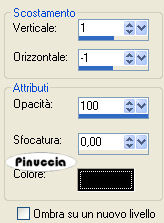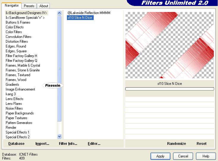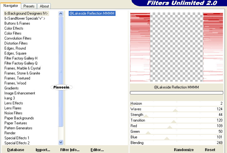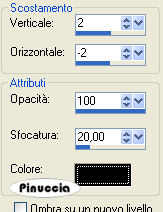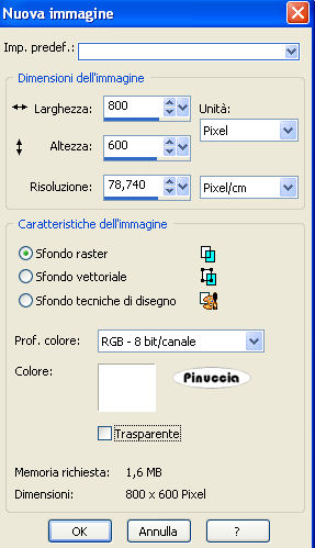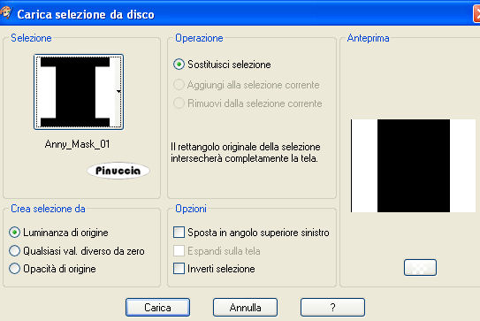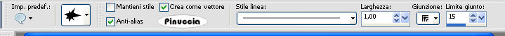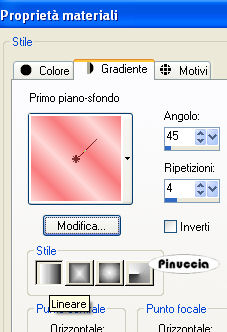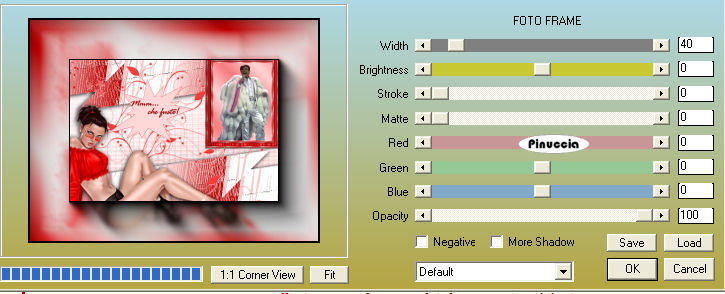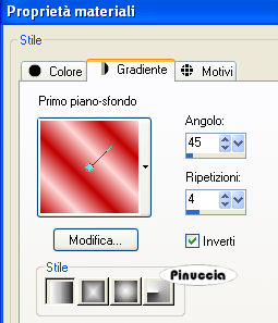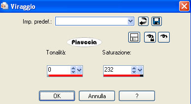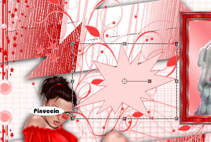 qui puoi trovare qualche risposta ai tuoi dubbi. Se l'argomento che ti interessa non è presente, ti prego di segnalarmelo. Per tradurre questo tutorial ho usato PSP X, ma può essere eseguito anche con le altre versioni di PSP. Occorrente: Materiale qui Filtri: AAA Frames - Foto Frame qui Filters Unlimited 2.0 qui Backgrounddesigners qui quando ti serviranno, importa il filtro in Unlimited. Come fare vedi qui Animation Shop qui ![]() Metti la selezione nella cartella Selezioni. Imposta il colore di primo piano con #fdd8d7, e il colore di sfondo con #c10000. 1. Apri una nuova immagine BIANCA 800 x 600 pixels. ![]() 2. Livelli>Nuovo livello raster. Selezione>Seleziona tutto. Apri ld-material2 e vai a Modifica>Copia. Torna al tuo lavoro e vai a Modifica>Incolla nella selezione. Selezione>Deseleziona. Regola>Tonalità e saturazione>Viraggio ![]() Abbassa l'opacità di questo livello al 30%. 3. Livelli>Duplica. Immagine>Rifletti. Livelli>Unisci>Unisci giù. 4. Livelli>Nuovo livello raster. Selezione>Carica/Salva selezione>Carica selezione da disco. Cerca e carica anny_mask_01. ![]() Riempi la selezione con il colore di primo piano.Selezione>Deseleziona. 5. Effetti>Plugins>Filters Unlimited 2.0 - &<Background DesignersIV> - @Lakeside reflectionsMMMM. ![]() Effetti>Plugins>Filters Unlimited 2.0 - &<Background DesignersIV> - sf10Slice N Dice - 2 volte. ![]() Regola>Messa a fuoco>Metti a fuoco. Effetti>Effetti 3D>Sfalsa ombra. ![]() 6. Apri doodle@ e vai a Modifica>Copia. Torna al tuo lavoro e vai a Modifica>Incolla come nuovo livello. E' già correttamente posizionato. Non occorre spostarlo. Regola>Tonalità e saturazione>Viraggio, come al punto 4. Regola>Messa a fuoco>Metti a fuoco. 7. Apri il tune deco1_stars e vai a Modifica>Copia. Torna al tuo lavoro e vai a Modifica>Incolla come nuovo livello. Spostalo in alto a sinistra contro il bordo.![]() Regola>Tonalità e saturazione>Viraggio, come al punto 4. Livelli>Duplica. Immagine>Capovolgi. Livelli>Unisci>Unisci giù. 8. Apri t1-braz1 (per il mio esempio ho usato un tube di Terry), e vai a Modifica>Copia. Torna al tuo lavoro e vai a Modifica>Incolla come nuovo livello. Immagine>Ridimensiona, 1 volta al 75% e 1 volta all'85%, tutti i livelli non selezionato (questo passaggio si riferisce al tube fornito con il materiale) Sposta un po' più a sinistra in basso, non troppo vicino al bordo.Effetti>Effetti 3D>Sfalsa ombra. ![]() Regola>Messa a fuoco>Metti a fuoco. 9. Apri la cornice "Fotolijst". Adesso lavoriamo sulla cornice. Regola>Tonalità e saturazione>Viraggio, come al punto 4. Livelli>Nuovo livello raster. Imposta il colore di sfondo con #f87a7d. Passa il colore di primo piano a Gradiente lineare. ![]() Riempi il livello con il gradiente.Regola>Sfocatura>Sfocatura gaussiana - raggio 10. ![]() Livelli>Disponi>Sposta giù. 10. Attiva il livello della cornice. Attiva lo strumento Selezione , rettangolo,e seleziona l'interno della cornice. ![]() Livelli>Nuovo livello raster. Apri Anny_Design_Gerard_Joling e vai a Modifica>Copia. Torna al tuo lavoro e vai a Modifica>Incolla nella selezione. Selezione>Deseleziona. Sposta il tube un po' più in basso.Livelli>Disponi>Sposta giù. Regola>Messa a fuoco>Metti a fuoco. Effetti>Effetti 3D>Sfalsa ombra, come al punto 8. Livelli>Unisci>Unisci tutto. 11. Modifica>Copia. Torna al tuo lavoro e vai a Modifica>Incolla come nuovo livello. Immagine>Ridimensiona, al 75%, tutti i livelli non selezionato. Regola>Messa a fuoco>Metti a fuoco. Sposta la cornice in alto a destra.12. Apri il tube "ketting" e vai a Modifica>Copia. Torna al tuo lavoro e vai a Modifica>Incolla come nuovo livello. Regola>Tonalità e Saturazione>Viraggio, come al punto 4. Immagine>Ridimensiona, al 50%, tutti i livelli non selezionato. Sposta la catena al centro della cornice.Livelli>Disponi>Sposta giù. Effetti>Effetti 3D>Sfalsa ombra. ![]() Inverti i colori nella paletta dei materiali. ![]() Attiva lo strumento Forme predefinite ![]() scegli una forma "scoppio" (per il mio esempio ho usato "scoppio 4": puoi scegliere la forma che preferisci, l'importante è che sia nera, altrimenti l'interno della forma resterà trasparente): ![]() Traccia la forma pressappoco come nel mio esempio. ![]() Livelli>Converti in livello raster. Effetti>Effetti 3D>Sfalsa ombra. ![]() 14. Livelli>Nuovo livello raster. Attiva lo strumento Testo , scegli un font,imposta nuovamente il colore scuro come colore di sfondo e chiudi il colore di primo piano. Scrivi un testo sulla forma. Livelli>Converti in livello raster. Effetti>Effetti 3D>Sfalsa ombra. ![]() 15. Passa il colore di primo piano a Gradiente lineare: ![]() Livelli>Unisci>Unisci tutto. Immagine>Aggiungi bordatura, 35 pixels, simmetriche, con un colore contrastante. Seleziona questo bordo con la bacchetta magica ,e riempilo con il gradiente.Selezione>Deseleziona. 16. Effetti>Plugins>AAA Frames - Foto Frame. ![]() Immagine>Aggiungi bordatura, 1 pixel, simmetriche, con il colore di sfondo. Immagine>Aggiungi bordatura, 2 pixels, simmetriche, con il colore di primo piano. Immagine>Aggiungi bordatura, 1 pixel, simmetriche, con il colore di sfondo. 17. Apri Missy_iheartyou_corner2. Regola>Tonalità e saturazione>Viraggio, come al punto 4. Modifica>Copia. Torna al tuo lavoro e vai a Modifica>Incolla come nuovo livello. Immagine>Ridimensiona, al 50%, tutti i livelli non selezionato. Spostalo nell'angolo in basso a sinistra.Effetti>Effetti 3D>Sfalsa ombra. ![]() Livelli>Duplica. Immagine>Capovolgi. Livelli>Unisci>Unisci giù. Livelli>Duplica. Immagine>Rifletti. Livelli>Unisci>Unisci giù. 18. Livelli>Nuovo livello raster. Aggiungi il tuo nome e/o il tuo watermark. Livelli>Unisci>Unisci tutti. Immagine>Ridimensiona, all'80% (o alla dimensione che preferisci), tutti i livelli selezionato. Salva in formato jpg. Se vuoi animare il tuo lavoro, continua al punto 19. 19. Modifica>Copia. Apri Animation Shop e vai a Modifica>Incolla>Incolla come nuova animazione. Modifica>Duplica e ripeti finchè non avrai 8 fotogrammi. Clicca s