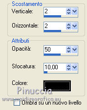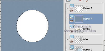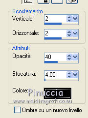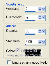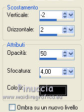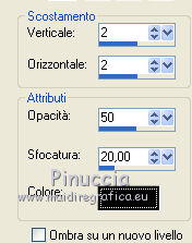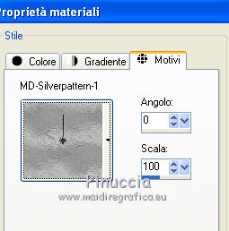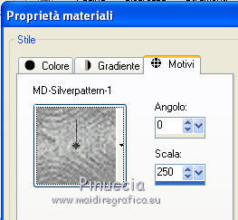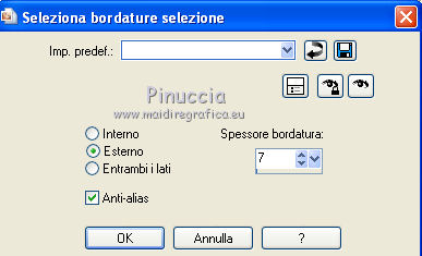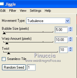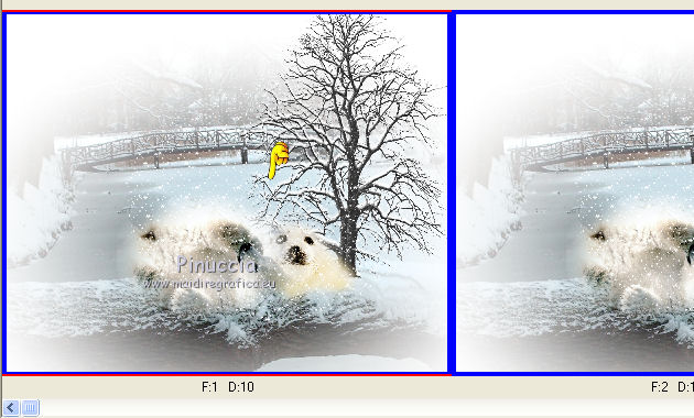 qui puoi trovare qualche risposta ai tuoi dubbi. Se l'argomento che ti interessa non è presente, ti prego di segnalarmelo. Occorrente: Materiale qui Il tube usato è di Pascal che ringrazio per il permesso di usarlo per questo tutorial. Filtri: Eye Candy 4000 - Jiggle qui Animation Shop qui ![]() Metti la trama Weef_fijn nella cartella Trame. Metti il file "Stars" nella cartella Maschere. Metti i motivi argento nella cartella Motivi. Apri il resto del materiale in PSP (tranne M-L-Snow che ti servirà in Animation Shop). Imposta il colore di primo piano con #7d92a7, e il colore di sfondo con il bianco. 1. Apri una nuova immagine trasparente 800 x 650 pixels, e riempila con il colore bianco (tasto destro del mouse).2. Apri il tube Anny_Snowbridge e vai a Modifica>Copia. Torna al tuo lavoro e vai a Modifica>Incolla come nuovo livello. 3. Apri "element 2" e vai a Modifica>Copia. Torna al tuo lavoro e vai a Modifica>Incolla come nuovo livello. Immagine>Rifletti. Sposta il tube a destra.Livelli>Duplica. Livelli>Unisci>Unisci giù. 4. Apri il tube Anny_Isberen e vai a Modifica>Copia. Torna al tuo lavoro e vai a Modifica>Incolla come nuovo livello. Immagine>Ridimensiona, al 65%, tutti i livelli non selezionato. Lascialo come sta, lo potrai posizionare correttamente più tardi. 5. Livelli>Nuovo livello raster. Riempi il livello con il colore di primo piano.Effetti>Effetti di trama>Trama - seleziona la trama Weef_fijn con i seguenti settaggi. ![]() 6. Attiva lo strumento Selezione , cerchio,e traccia un cerchio della dimensione di circa 440 x 440 pixels. Mentre disegni il cerchio, puoi controllare la dimensione nella barra inferiore degli strumenti. ![]() Livelli>Nuovo livello raster. Riempi la selezione con un colore qualsiasi (servirà soltanto per distinguere il livello del cerchio dallo sfondo).Selezione>Deseleziona. ![]() Adesso dobbiamo posizionare il cerchio esattamente al centro dell'immagine. Modifica>Taglia (questo comando oltre a tagliare tiene in memoria). Modifica>Incolla come nuovo livello, e il cerchio sarà perfettamente al centro. Elimina il livello rimasto vuoto. ![]() Attiva nuovamente il livello del cerchio. ![]() Selezione>Seleziona tutto. Selezione>Mobile. Selezione>Immobilizza. Attiva il livello con il colore di primo piano. ![]() Premi sulla tastiera il tasto CANC. Selezione>Deseleziona. Adesso puoi eliminare anche il livello bianco. Posiziona correttamente i tubes sottostanti,e dovresti avere pressappoco questo. ![]() Chiudi il livello superiore e attiva uno degli altri livelli. Livelli>Unisci>Unisci visibile. 8. Riapri e attiva il livello superiore. Selezione>Seleziona tutto. Selezione>Mobile. Selezione>Immobilizza. Selezione>Inverti. Selezione>Modifica>Seleziona bordature selezione. ![]() Livelli>Nuovo livello raster. Passa il colore di primo piano a Motivi e seleziona uno dei motivi argento forniti con il materiale. ![]() Riempi la selezione con il motivo argento.Selezione>Deseleziona. Effetti>Effetti 3D>sfalsa ombra. ![]() Ripeti l'Effetto Sfalsa ombra, cambiando verticale e orizzontale con -2. 9. Attiva il livello con la finestra. Selezione>Seleziona tutto. Selezione>Mobile. Selezione>Immobilizza. Livelli>Nuovo livello raster. Riempi con il colore bianco.Selezione>Deseleziona. Livelli>Carica/Salva maschera da disco>Carica maschera da disco. Cerca e carica l'immagine Stars: ![]() Effetti>Effetti di bordo>Aumenta di più. Livelli>Unisci>Unsici gruppo. Abbassa l'opacità di questo livello al 50%. Chiudi il livello inferiore. Livelli>Unisci>Unisci visibile. Riapri il livello inferiore e rimani posizionato sul livello superiore. 10. Apri il tube dennenappel-Marijke-WT e vai a Modifica>Copia. Torna al tuo lavoro e vai a Modifica>Incolla come nuovo livello. Immagine>Ridimensiona, all'85%, tutti i livelli non selezionato. Effetti>Effetti 3D>Sfalsa ombra. ![]() Regola>Messa a fuoco>Metti a fuoco. Sposta il tube sul bordo del cerchio.11. Apri element3 e vai a Modifica>Copia. Torna al tuo lavoro e vai a Modifica>Incolla come nuovo livello. Immagine>Ridimensiona, all'85%, tutti i livelli non selezionato. Effetti>Effetti 3D>Sfalsa ombra, con i settaggi precedenti. Regola>Messa a fuoco>Metti a fuoco. Sposta il tube sopra le ghiande.Livelli>Unisci>Unisci giù. 12. Attiva lo strumento Testo , scegli un font, crea come vettore,e scrivi un testo a destra. Livelli>Converti in livello raster. Effetti>Effetti 3D>Sfalsa ombra, con settaggi a tua scelta. Immagine>Ruota per gradi - 90 gradi a destra. ![]() 13. Apri driehoekjes e vai a Modifica>Copia. Torna al tuo lavoro e vai a Modifica>Incolla come nuovo livello. Effetti>Effetti 3D>Sfalsa ombra. ![]() Ripeti l'Effetto Sfalsa ombra, cambiando verticale e orizzontale con -2. Sposta il tube accanto al testo (Vedi il mio esempio).Livelli>Duplica. Immagine>Capovolgi. Sposta questo duplicato in basso a sinistra.Chiudi il livello inferiore. Livelli>Unisci>Unisci visibile. Riapri il livello inferiore e rimani posizionato sul livello superiore. 14. Apri il tube paddenstoelen e vai a Modifica>Copia. Torna al tuo lavoro e vai a Modifica>Incolla come nuovo livello. Effetti>Effetti 3D>Sfalsa ombra: ![]() Livelli>Duplica. Immagine>Ridimensiona, all'85%, tutti i livelli non selezionato. Immagine>Rifletti. Sposta questo tube accanto al precedente.![]() Livelli>Unisci>Unisci giù. 15. Apri il tube della donna di Pascale e vai a Modifica>Copia. Torna al tuo lavoro e vai a Modifica>Incolla come nuovo livello. Immagine>Ridimensiona, al 60%, tutti i livelli non selezionato. Immagine>Rifletti. Effetti>Effetti 3D>Sfalsa ombra. ![]() Ripeti l'Effetto Sfalsa ombra, cambiando verticale e orizzontale con -2. Sposta il tube a sinistra.16. Apri il tube "ster" e vai a Modifica>Copia. Torna al tuo lavoro e vai a Modifica>Incolla come nuovo livello. Livelli>Duplica. Immagine>Ridimensiona, all'85%, tutti i livelli non selezionato. Livelli>Duplica. Immagine>Ridimensiona, all'85%, tutti i livelli non selezionato. Posiziona le tre stelle in alto a sinistra - vedi il mio esem