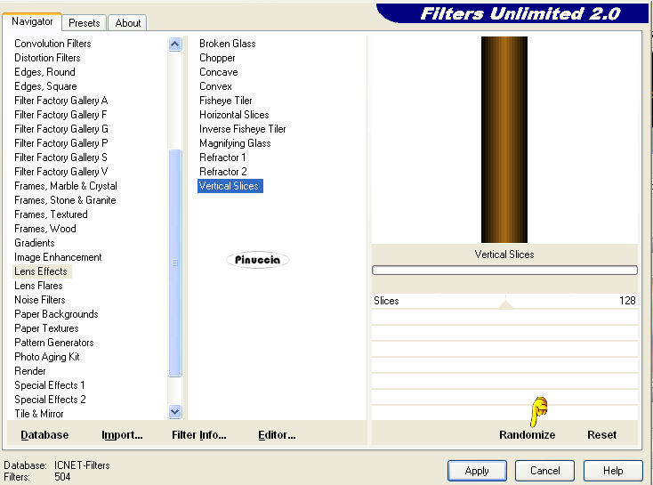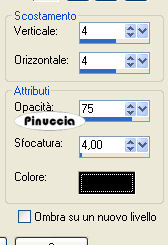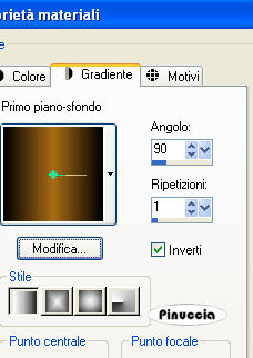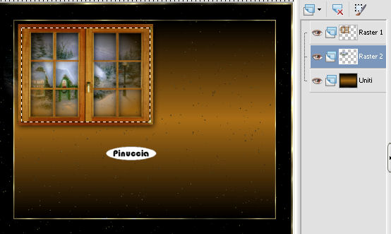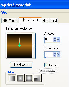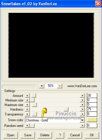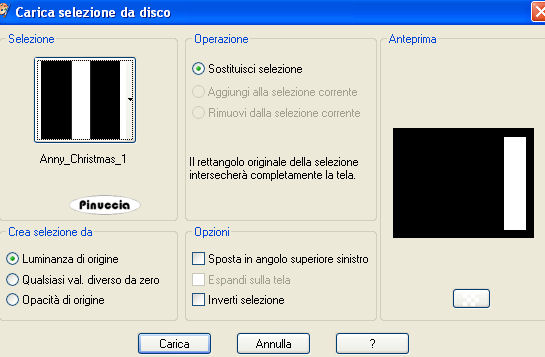 qui puoi trovare qualche risposta ai tuoi dubbi. Se l'argomento che ti interessa non è presente, ti prego di segnalarmelo. Per tradurre questo tutorial ho usato PSP X, ma può essere eseguito anche con le altre versioni di PSP. Occorrente: Materiale qui Filtri: Graphics Plus - Cross Shadow qui Filters Unlimited qui VanDerLee - Snowflakes qui Animation Shop qui ![]() Metti la selezione nella cartella Selezioni, e apri il resto del materiale in PSP, tranne "kaarsje branden" che ti servirà in Animation Shop. Imposta il colore di primo piano con #a96d17, e il colore di sfondo con il nero. 1. Apri una nuova immagine trasparente 700 x 550 pixels, e riempila con il colore nero.2. Livelli>Nuovo livello raster. Passa il colore di primo piano a Motivi, e seleziona un motivo oro. ![]() Riempi il livello con questo motivo.Selezione>Seleziona tutto. Selezione>Modifica>Contrai - 4 pixels. Premi sulla tastiera il tasto CANC. Effetti>Plugins>Graphics Plus - Cross Shadow con i settaggi standard. ![]() Selezione>Deseleziona. Livelli>Unisci>Unisci giù. 3. Attiva lo strumento Bacchetta magica , sfumatura e tolleranza 0,e clicca sulla parte nera per selezionarla. Effetti>Plugins>VanDerLee - Snowflakes: ![]() Selezione>Deseleziona. 4. Selezione>Deseleziona tutto. Selezione>Modifica>Contrai - 40 pixels. Passa il colore di primo piano a Gradiente di primo piano/sfondo: ![]() Riempi la selezione con questo gradiente.Mantieni selezionato. 5. Livelli>Nuovo livello raster. Riempi con il motivo oro.Selezione>Modifica>Contrai - 2 pixels. Premi sulla tastiera il tasto CANC. Selezione>Deseleziona. Effetti>Plugins>Graphics Plus - Cross Shadow, con i settaggi standard. Livelli>Unisci>Unisci visibile. 6. Apri il tube Anny_Design_Window e vai a Modifica>copia. Torna al tuo lavoro e vai a Modifica>Incolla come nuovo livello. Immagine>Ridimensiona, al 90%, tutti i livelli non selezionato. Sposta la finestra nell'angolo in alto a sinistra.Effetti>Effetti 3D>Sfalsa ombra. ![]() 7. Apri il tube Kerstachtergron1 e vai a Modifica>copia. Torna al tuo lavoro e vai a Modifica>Incolla come nuovo livello. Immagine>Ridimensiona, al 70%, tutti i livelli non selezionato. Spostalo sulla finestra.Livelli>Disponi>Sposta giù (sotto il livello della finestra). Attiva lo strumento Selezione , rettangolo,e seleziona la finestra entro i bordi. ![]() Selezione>Inverti. Premi sulla tastiera il tasto CANC. Abbassa l'opacità di questo livello al 75%. 8. Apri il tube No SantaClaus e vai a Modifica>copia. Torna al tuo lavoro e vai a Modifica>Incolla come nuovo livello. Immagine>Ridimensiona, 1 volta al 50%, una volta all'80% e una volta al 90%, tutti i livelli non selezionato (dopo non mettere a fuoco). Sposta il tube sotto la finestra.Nella paletta dei livelli questo livelli si troverà tra la finestra e il paesaggio. ![]() 9. Apri il tube kerst_poser e vai a Modifica>copia. Torna al tuo lavoro e vai a Modifica>Incolla come nuovo livello. Immagine>Ridimensiona, al 90%, tutti i livelli non selezionato. Sposta il tube a destra della finestra.10. Apri il tube kerstkaars e vai a Modifica>copia. Torna al tuo lavoro e vai a Modifica>Incolla come nuovo livello. Immagine>Ridimensiona, al 70%, tutti i livelli non selezionato. Sposta il tube in basso a sinistra.Attiva lo strumento Gomma e cancella la parte di tube che copre il bordo dorato.11. Livelli>Nuovo livello raster. Selezione>Carica/Salva selezione>Carica selezione da disco. Cerca e carica la selezione Anny_Christmas_1. ![]() Cambia i settaggi del gradiente. ![]() Riempi la selezione con il gradiente.Effetti>Plugins>Filters Unlimited - Lens Effects - Vertical Slices: sui settaggi standard clicca 4 volte su Randomize. ![]() Abbassa l'opacità di questo livello al 40%. Mantieni selezionato. 12. Livelli>Nuovo livello raster. Riempi con il motivo oro.Selezione>Modifica>contrai - 2 pixels. Premi sulla tastiera il tasto CANC. Selezione>Deseleziona. Livelli>Unisci>Unisci giù. Effetti>Effetti 3D>Sfalsa ombra. ![]() 13. Controlla che tutti i tubes siano al posto giusto. Livelli>Unisci>Unisci visibile. Aggiungi il tuo nome e/o il tuo watermark su un nuovo livello. 14. Attiva lo strumento Testo , scegli un font e scrivi un testo.Immagine>Ruota per gradi - 90 gradi a destra. Posiziona il testo nella striscia a destra. Livelli>Converti in livello raster. Effetti>Effetti 3D>Sfalsa ombra, a tua scelta. Livelli>Unisci>Unisci tutto e salva in formato jpg. Se vuoi animare: Modifica>Copia. Apri Animation Shop e vai a Modifica>Incolla>Incolla come nuova animazione. Modifica>Duplica e ripeti finchè non avrai 4 fotogrammi. Puoi anche usare sulla barra degli strumenti le icone corrispondenti, cliccando prima sull'icona copia e poi 3 volte su Incolla dopo. ![]() Clicca sul primo fotogramma per selezionarlo e vai a Modifica>Seleziona tutto. Apri "kaarsje branden", anche questo composto da 4 fotogrammi. Modifica>Seleziona tutto. Modifica>Copia. Torna al tuo lavoro e vai a Modifica>Incolla>Incolla nel fotogramma selezionato. Posiziona la fiamma sulla candela e, quando sei certo di aver trovato la posizione corretta, rilascia il tasto del mouse. Animazione>Proprietà fotogramma, e imposta la velocità a 25. ![]() Controlla il risultato cliccando su Visualizza e salva in formato gif.![]() Se hai problemi o dubbi, o trovi un link non funzionante, o anche soltanto per un saluto, scrivimi. 13 Dicembre 2009 |