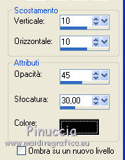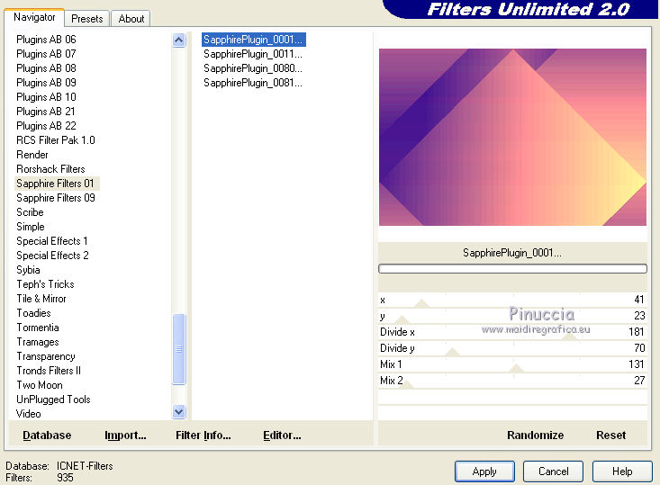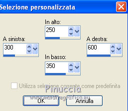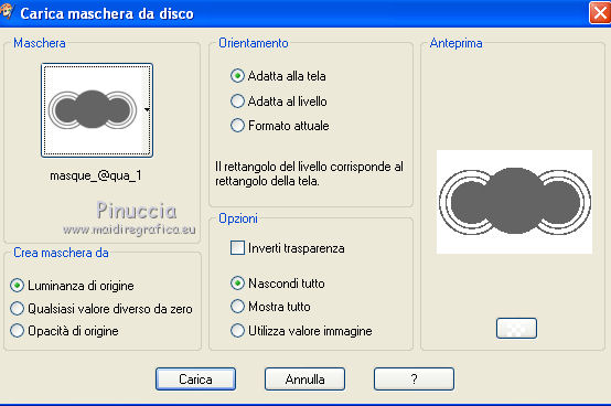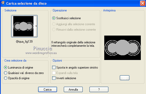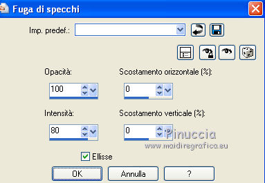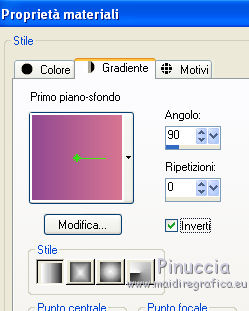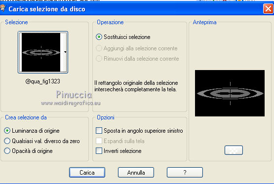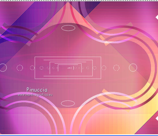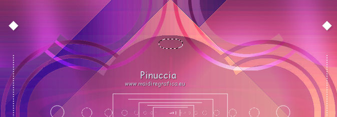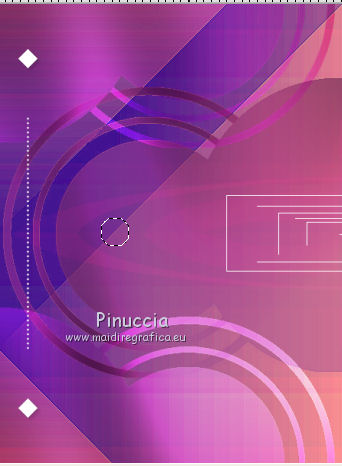qui puoi trovare qualche risposta ai tuoi dubbi. Se l'argomento che ti interessa non è presente, ti prego di segnalarmelo. Questo tutorial è stato creato con PSP X3, ma può essere eseguito anche con le altre versioni di PSP. Per tradurlo, ho usato PSP X. Occorrente: Materiale qui Il tube della donna è di Mary, che ringrazio per il suo magnifico lavoro. Grazie a tutti i creatori di tubes per le loro immagini. Lascia intatto il nome del tube. Il © appartiene all'artista originale. Mantieni il credito di chi ha creato il tube. Filtri in caso di dubbi, ricorda di consultare la mia sezione filtri qui Filters Unlimited 2.0 qui Sapphire 01 qui Simple qui Graphics Plus qui ![]() Metti le selezioni nella cartella Selezioni. Metti la maschera nella cartella Maschere. Nel corso del tutorial sono stati usati questi colori. ![]() 1. Imposta il colore di primo piano con il colore chiaro #d77692, e il colore di sfondo con il colore scuro #924891. Passa il colore di primo piano a Gradiente, stile Lineare. ![]() 2. Apri una nuova immagine trasparente 900 x 600 pixels, e riempila con il gradiente.3. Effetti>Plugins>Simple - Blintz. Livelli>Duplica. Effetti>Plugins>Simple - Blintz. Risultato. ![]() 4. Effetti>Effetti di bordo>Aumenta. 5. Effetti>Plugins>Filters Unlimited 2.0 - Sapphire Filters 01 - SapphirePlugin_001. se stai usando altri colori sperimenta i settaggi per ottenere l'effetto ![]() 6. Livelli>Carica/Salva maschera>Carica maschera da disco. Cerca e carica la maschera masque_@qua_1 ![]() Effetti>Effetti di bordo>Aumenta. Livelli>Unisci>Unisci gruppo. 7. Livelli>Nuovo livello raster. Selezione>Carica/Salva selezione>Carica selezione da disco. Cerca e carica la selezione @qua_139. ![]() Riempi la selezione con il colore scuro.Selezione>Deseleziona. 8. Effetti>Plugins>Simple - Half Wrap. 9. Effetti>Plugins>Graphics Plus - Cross Shadow, 2 volte con i settaggi standard. ![]() 10. Cambia la modalità di miscelatura di questo livello in Sovrapponi, e abbassa l'opacità al 70%. Regola>Messa a fuoco>Metti a fuoco. 11. Livelli>Nuovo livello raster. Selezione>Carica/Salva selezione>Carica selezione da disco. Carica nuovamente la selezione @qua_139. ![]() 12. Riempi la selezione con il gradiente.Selezione>Deseleziona. 13. Effetti>Plugins>Graphics Plus - Cross Shadow - 2 volte, con i settaggi standard. 14. Cambia la modalità di miscelatura di questo livello in Moltiplica, e abbassa l'opacità al 70%. 15. Livelli>Nuovo livello raster. Selezione>Carica/Salva selezione>Carica selezione da disco. Cerca e carica la selezione @qua_1323. ![]() Riempi la selezione con il colore chiaro.Selezione>Deseleziona. 16. Cambia la modalità di miscelatura di questo livello in Sovrapponi, e abbassa l'opacità al 50%. 17. Apri @qua_deco2 e vai a Modifica>Copia. Torna al tuo lavoro e vai a Modifica>Incolla come nuovo livello. 18. Effetti>Effetti 3D>Sfalsa ombra. ![]() 19. Regola>Messa a fuoco>Metti a fuoco. 20. Livelli>Nuovo livello raster. Attiva lo strumento Selezione ,clicca sull'icona Selezione personalizzata ![]() e imposta i seguenti settaggi: ![]() Riempi la selezione con il colore bianco.21. Selezione>Modifica>Contrai - 1 pixel. ![]() Premi sulla tastiera il tasto CANC. Selezione>Deseleziona. Regola>Messa a fuoco>Accentua messa a fuoco. 22. Effetti>Effetti di riflesso>Fuga di specchi. ![]() 23. Livelli>Nuovo livello raster. Attiva lo strumento Selezione , cerchio,e traccia un cerchio a sinistra. ![]() Riempi la selezione con il colore bianco.Selezione>Modifica>Contrai - 1 pixel. Premi sulla tastiera il tasto CANC. Selezione>Deseleziona. 24. Livelli>Duplica. Livelli>Unisci>Unisci giù. 25. Livelli>Duplica. Immagine>Rifletti. Livelli>Unisci>Unisci giù. 26. Regola>Messa a fuoco>Accentua messa a fuoco. 27. Effetti>Effetti di riflesso>Fuga di specchi, con i settaggi precedenti. 28. Attiva lo strumento Selezione , ellisse,e traccia un'ellisse in alto al centro. ![]() 29. Riempi la selezione con il colore bianco.Selezione>Modifica>Contrai - 1 pixel. Premi sulla tastiera il tasto CANC. Selezione>Deseleziona. 30. Livelli>Duplica. Livelli>Unisci>Unisci giù. 31. Livelli>Duplica. Immagine>Capovolgi. Posiziona correttamente l'ellisse in basso, come nel mio esempio.![]() Livelli>Unisci>Unisci giù. Regola>Messa a fuoco>Accentua messa a fuoco. 32. Effetti>Effetti di riflesso>Fuga di specchi, con i settaggi precedenti. 33. Apri @qua_deco3 e vai a Modifica>Copia. Torna al tuo lavoro e vai a Modifica>Incolla come nuovo livello. Regola>Messa a fuoco>Metti a fuoco. 34. Apri il tube Mary110312-1 e vai a Modifica>Copia. Torna al tuo lavoro e vai a Modifica>Incolla come nuovo livello. Immagine>Ridimensiona, al 55%, tutti i livelli non selezionato. Spostalo a destra, come nel mio esempio.35. Effetti>Effetti 3D>Sfalsa ombra. ![]() 36. Attiva lo strumento Testo , font Allembert,dimensione 65 (che dovrai regolare in base al tuo testo e alla versione di PSP che stai usando). Chiudi il colore di primo piano; colore di sfondo: bianco. ![]() Scrivi il testo. Immagine>Ruota per gradi - 45 gradi a sinistra. ![]() Approfitta della griglia dello strumento per posizionare il testo. 37. Livelli>Converti in livello raster. 38. Effetti>Effetti 3D>Sfalsa ombra, come al punto 18. ![]() 39. Immagine>Aggiungi bordatura, 2 pixels, simmetriche, con il colore chiaro. 40. Immagine>Aggiungi bordatura, 35 pixels, simmetriche, con il colore scuro. Seleziona questo bordo con la bacchetta magica ![]() e riempilo con il gradiente.41. Effetti>Plugins>Graphics Plus - Cross Shadow, con i settaggi standard. 42. Selezione>Inverti. Effetti>Effetti 3D>Sfalsa ombra. ![]() Ripeti l'Effetto Sfalsa ombra, cambiando verticale e orizzontale con -5. Selezione>Deseleziona. 43. Immagine>Aggiungi bordatura, 2 pixels, simmetriche, con il colore chiaro. Firma il tuo lavoro e salva in formato jpg. Per questo esempio ho usato un tube di ClaudiaViza. ![]() ![]() Se hai problemi o dubbi, o trovi un link non funzionante, o anche soltanto per un saluto, scrivimi. 1 Aprile 2012 |