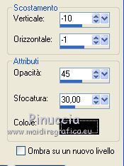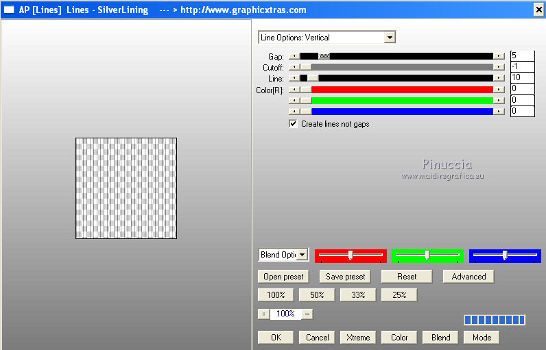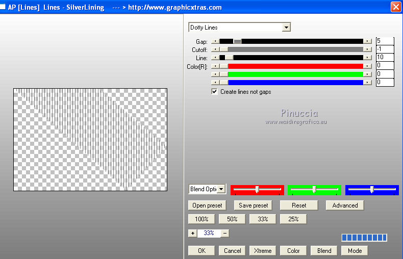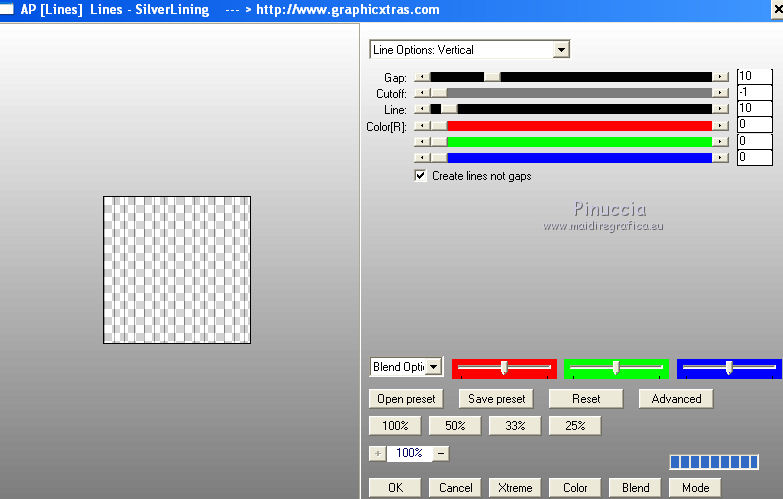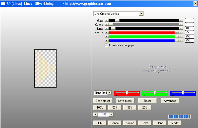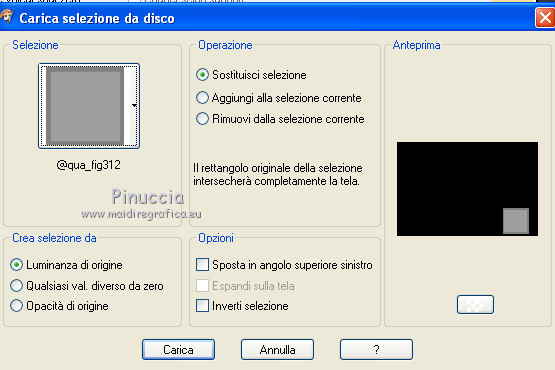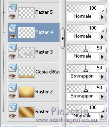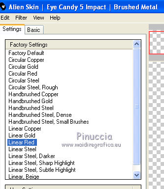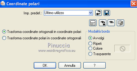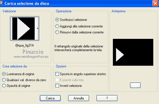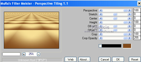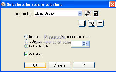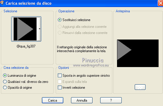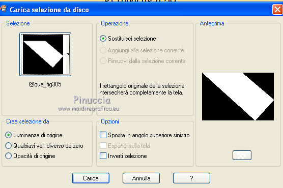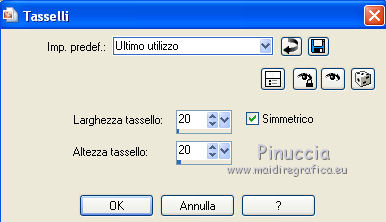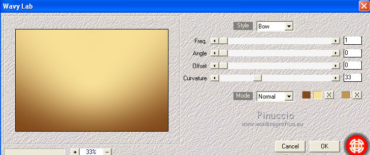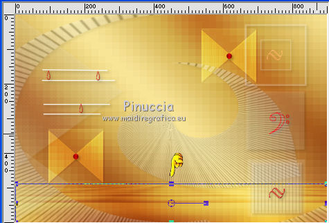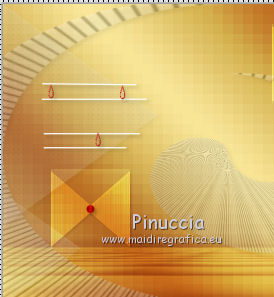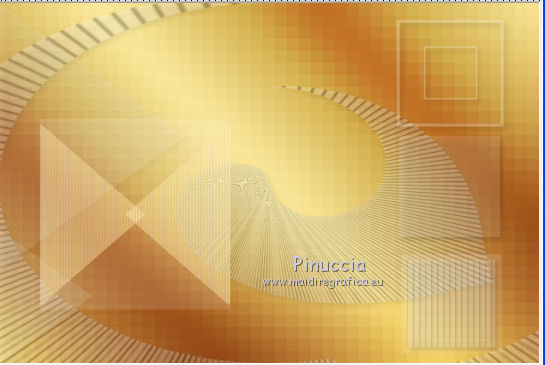 qui puoi trovare qualche risposta ai tuoi dubbi. Se l'argomento che ti interessa non è presente, ti prego di segnalarmelo. Questo tutorial è stato creato con PSP X3, ma può essere eseguito anche con le altre versioni di PSP. Per tradurlo, ho usato PSP X. Occorrente: Materiale qui Per il tube grazie Liza. Grazie a tutti i creatori di tubes per le loro immagini. Lascia intatto il nome del tube. Il © appartiene all'artista originale. Mantieni il credito di chi ha creato il tube. Filtri in caso di dubbi, ricorda di consultare la mia sezione filtri qui Alien Skin Eye Candy 5 Impact qui Mura's Meister - Perspective Tiling qui Mehdi - Wavy Lab qui Graphics Plus - Cross Shadow qui AP Lines - Lines SilverLining qui ![]() Metti le selezioni nella cartella Selezioni. Nel corso del tutorial sono stati usati questi colori. ![]() 1. Imposta il colore di primo piano con #f8e197, e il colore di sfondo con #82491b. Passa il colore di primo piano a Gradiente. ![]() 2. Apri una nuova immagine trasparente 900 x 600 pixels, e riempila con il gradiente.3. Regola>Sfocatura>Sfocatura gaussiana - raggio 25. ![]() 4. Effetti>Effetti di distorsione>Tasselli. ![]() 5. Livelli>Nuovo livello raster. Effetti>Plugins>Mehdi - Wavy Lab. ![]() Cambia la modalità di miscelatura di questo livello in Sovrapponi, e abbassa l'opacità al 50%. in fondo al tutorial l'esempio cambiando la modalità di miscelatura in Rafforza 6. Livelli>Nuovo livello raster. Selezione>Carica/Salva selezione>Carica selezione da disco. Cerca e carica la selezione ©qua_fig305. ![]() Riempi la selezione con il colore bianco,con opacità a 50. ![]() Selezione>Deseleziona. 7. Abbassa l'opacità di questo livello al 50%. 8. Effetti>Plugins>AP Lines - Lines SilverLining. ![]() 9. Effetti>Effetti di distorsione>Stringi. ![]() 10. Effetti>Effetti di distorsione>Coordinate polari. ![]() 11. Effetti>Effetti 3D>Sfalsa ombra. ![]() 12. Livelli>Nuovo livello raster. Selezione>Carica/Salva selezione>Carica selezione da disco. Cerca e carica la selezione ©qua_fig307. ![]() Riempi la selezione con il colore bianco,opacità a 50. Selezione>Deseleziona. 13. Effetti>Plugins>AP Lines - Lines SilverLining. ![]() 14. Effetti>Effetti 3D>Sfalsa ombra, con i settaggi precedenti. 15. Livelli>Nuovo livello raster. Selezione>Carica/Salva selezione>Carica selezione da disco. Cerca e carica la selezione ©qua_fig308. ![]() Riempi la selezione con il colore bianco,opacità a 50. Selezione>Deseleziona. 16. Effetti>Effetti 3D>Sfalsa ombra, con i settaggi precedenti. 17. Livelli>Nuovo livello raster. Selezione>Carica/Salva selezione>Carica selezione da disco. Cerca e carica la selezione ©qua_fig309. ![]() Riempi la selezione con il colore bianco,con opacità a 100. 18. Effetti>Effetti 3D>Sfalsa ombra, con i settaggi precedenti. 19. Livelli>Nuovo livello raster. Selezione>Carica/Salva selezione>Carica selezione da disco. Cerca e carica la selezione ©qua_fig310. la nuova selezione sostituirà la precedente. Per questo non è necessario deselezionare ![]() Riempi la selezione con il colore bianco,con opacità a 100. 20. Effetti>Effetti 3D>Sfalsa ombra, con i settaggi precedenti. 21. Livelli>Nuovo livello raster. Selezione>Carica/Salva selezione>Carica selezione da disco. Cerca e carica la selezione ©qua_fig311. ![]() Riempi la selezione con il colore bianco,con opacità a 50. 22. Effetti>Effetti 3D>Sfalsa ombra, con i settaggi precedenti. 23. Livelli>Nuovo livello raster. Selezione>Carica/Salva selezione>Carica selezione da disco. Cerca e carica la selezione ©qua_fig312. ![]() Riempi la selezione con il colore bianco,con opacità a 50. 24. Selezione>Modifica>Contrai - 10 pixels. ![]() Riempi ancora la selezione con il colore bianco,sempre con opacità a 50. 25. Effetti>Plugins>AP Lines - Lines SilverLining line options: Vertical. ![]() per il mio esempio ho impostato Gap a 10. ![]() 26. Effetti>Effetti 3D>Sfalsa ombra, con i settaggi precedenti. 27. Livelli>Nuovo livello raster. Selezione>Carica/Salva selezione>Carica selezione da disco. Cerca e carica la selezione ©qua_fig313. ![]() Riempi la selezione con il colore bianco,con opacità a 50. 28. Livelli>Nuovo livello raster. Selezione>Carica/Salva selezione>Carica selezione da disco. Cerca e carica la selezione ©qua_fig314. ![]() Riempi la selezione con il colore bianco,con opacità a 50. 29. Effetti>Plugins>AP Lines - Lines SilverLining. ![]() Selezione>Deseleziona. 30. Livelli>Duplica. Immagine>Rifletti. Posiziona il triangolo contro l'originale.![]() 31. Livelli>Unisci>Unisci giù - 2 volte. Effetti>Effetti 3D>Sfalsa ombra, con i settaggi precedenti. 32. Immagine>Ridimensiona, al 50%, tutti i livelli non selezionato. Cambia la modalità di miscelatura di questo livello in Sovrapponi. 33. Livelli>Duplica. Posiziona le due forme come nell'esempio.![]() 34. Livelli>Nuovo livello raster. Selezione>Carica/Salva selezione>Carica selezione da disco. Cerca e carica la selezione ©qua_fig300. ![]() la selezione dovrebbe trovarsi al centro della forma. Se necessario, o sposti la forma,o sposti la selezione, tenendo premuto il tasto destro del mouse sulla selezione. ![]() Riempi la selezione con il colore chiaro.Mantieni selezionato. 35. Effetti>Plugins>Alien Skin Eye Candy 5 Impact - Brushed Metal. Seleziona il preset Linear Red e ok. se stai usando altri colori, scegli l'effetto in base a questi ![]() Selezione>Deseleziona. 36. Effetti>Effetti 3D>Sfalsa ombra, con i settaggi precedenti. 37. Livelli>Duplica. Posiziona il duplicato sulla forma a destra.![]() 38. Attiva lo strumento Penna ![]() crea su vettore, linea di stile pieno, larghezza 3: ![]() Imposta il colore di primo piano con il colore bianco, e traccia quattro linee a sinistra (vedi il mio esempio per orientarti). Mentre tracci le linee, tieni premuto il tasto della maiuscola, per averle perfettamente diritte. 39. Livelli>Converti in livello raster. Effetti>Effetti 3D>Sfalsa ombra, con i settaggi precedenti. 40. Apri il tube "divers". Attiva lo strumento Selezione a m