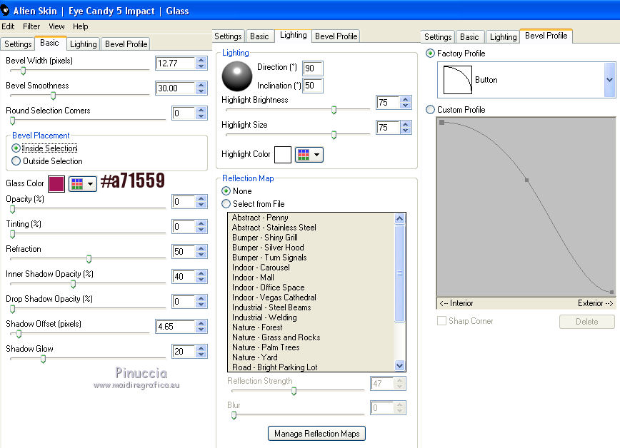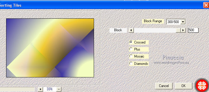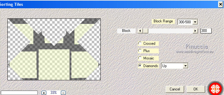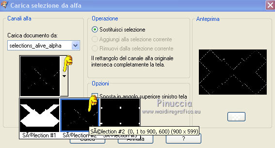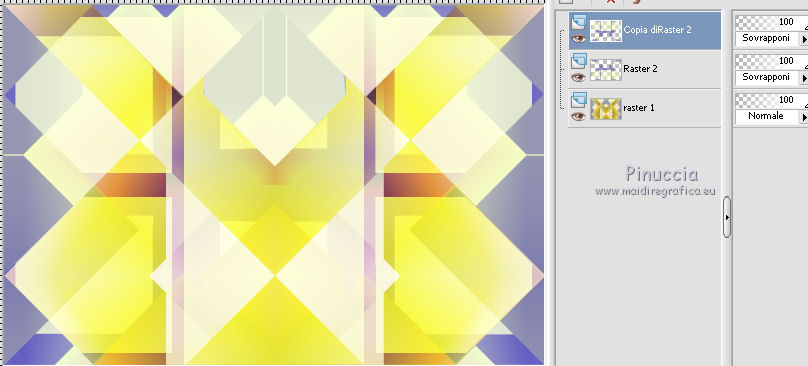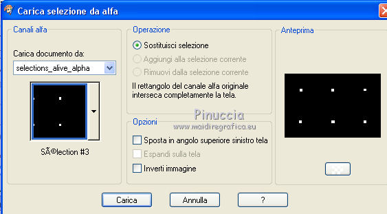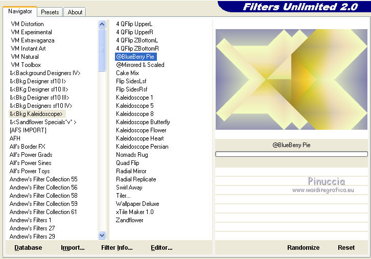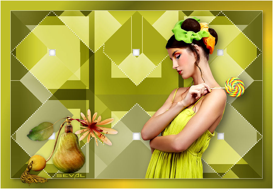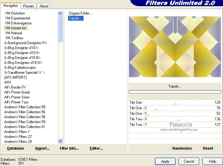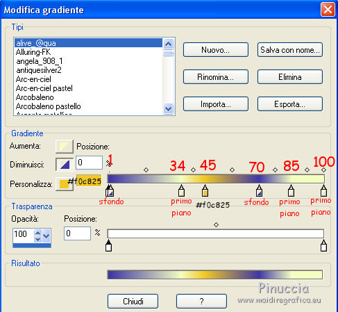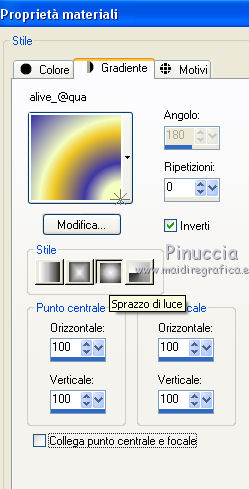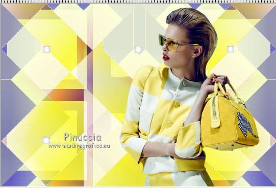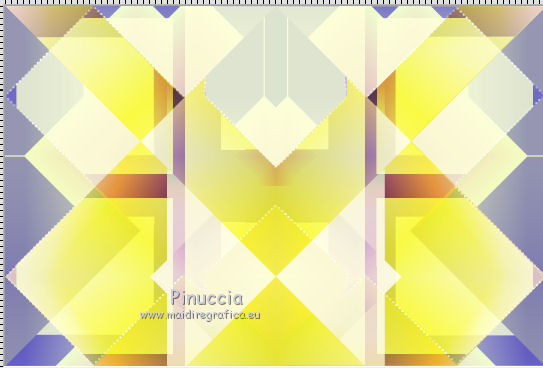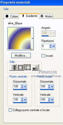 qui puoi trovare qualche risposta ai tuoi dubbi. Se l'argomento che ti interessa non è presente, ti prego di segnalarmelo. Questo tutorial è stato creato con CorelX6, ma può essere realizzato anche con le altre versioni di PSP. Per tradurlo ho usato PSP X, ma può essere eseguito anche con le altre versioni di PSP. Nelle versioni più recenti X4, X5 e X6, il comando Immagine>Rifletti è stato sostituito con Immagine>Capovolgi in orizzontale, e il comando Immagine>Capovolgi con Immagine>Capovolgi in verticale. Nelle versioni X5 e X6 le funzioni sono state migliorate con la disponibilità del menu "Oggetti". Vedi la scheda sull'argomento qui Occorrente: Materiale qui Il tube della donna è di Aquarellice. Filtri in caso di dubbi, ricorda di consultare la mia sezione filtri qui Mehdi - Sorting Tiles qui Filters Unlimited 2.0 qui &<Bkg Kaleidoscope> - @BlueBerry Pie (da importare in Unlimited) qui VM Instant Art - Tripolis qui Alien Skin Eye Candy 5 Impact - Glass qui I filtri della serie VM (VM Instant Art) si possono usare da soli o importati in Filters Unlimited (come fare vedi qui) Se un filtro fornito appare con questa icona ![]() Se utilizzi altri tubes e/o altri colori, puoi sperimentare le modalità di miscelatura e opacità più adatte. Metti il preset Cliccando sul file una o due volte (a seconda delle tue impostazioni), automaticamente il preset si installerà nella cartella corretta. perchè uno o due clic vedi qui Metti il gradiente alive_@qua nella cartella Gradienti. 1. Imposta il colore di primo piano con #f3fdc1, e il colore di sfondo con #3f37a4. ![]() Passa il colore di primo piano a Gradiente, e seleziona il gradiente alive_@qua, con i seguenti settaggi. ![]() il gradiente assume i colori impostati nella paletta dei materiali. usando la funzione Modifica, alcuni PSP bloccano e chiudono il programma. Per questo, ti consiglio, se vuoi cambiare colore al gradiente, di cambiare i colori della paletta. ![]() 2. Apri selections_alpha_alive. Duplica l'immagine usando la combinazione di tasti maiuscola+D. Chiudi l'originale e lavora sulla copia. L'immagine non è vuota, ma contiene le selezioni salvate sul canale alfa. Rinomina il livello Raster 1. 3. Riempi l'immagine trasparente con il gradiente.4. Effetti>Plugins>Mehdi - Sorting Tiles. ![]() 5. Effetti>Plugins>Filters Unlimited 2.0 - &<Bkg Kaleidoscope> - @BlueBerry Pie ![]() 6. Effetti>Plugins>Filters Unlimited 2.0 - VM Instant Art - Tripolis. ![]() 7. Livelli>Nuovo livello raster. Selezione>Carica/Salva selezione>Carica selezione da canale alfa. La selezione "sélection#1" è subito disponibile. Devi soltanto cliccare Carica. ![]() 8. Riporta il colore di primo piano al colore iniziale #f3fdc1. Abbassa l'opacità dello strumento Riempimento a 50 ![]() Riempi la selezione con il colore di primo piano.9. Effetti>Plugins>Mehdi - Sorting Tiles. ![]() Selezione>Deseleziona. 10. Livelli>Duplica. Immagine>Capovolgi. Cambia la modalità di miscelatura di questi due livelli in Sovrapponi. ![]() 11. Livelli>Nuovo livello raster. Selezione>Carica/Salva selezione>Carica selezione da canale alfa. Apri il menu delle selezioni e carica selection#2. ![]() 12. Ingrandisci l'immagine per vedere meglio lo spazio da riempire.Imposta il colore di primo piano con il colore bianco #ffffff. Riporta l'opacità dello strumento Riempimento a 100, modalità di corrispondenza Nessuno per riempire le selezioni con un solo clic, ![]() Riempi la selezione con il colore bianco.Selezione>Deseleziona. Dovresti avere queto. ![]() 13. Regola>Messa a fuoco>Maschera di contrasto. ![]() 14. Livelli>Nuovo livello raster. Selezione>Carica/Salva selezione>Carica selezione da canale alfa. Apri il menu delle selezioni e carica selection#3. ![]() Riempi la selezione con il colore bianco #ffffff,opacità sempre a 100 15. Effetti>Plugins>Alien Skin Eye Candy 5 Impact - Glass. Seleziona il preset glass@qua_9 e ok. ![]() In caso di problemi con il preset, puoi impostare manualmente i settaggi che vedi nella schermata. ![]() Selezione>Deseleziona. 16. Apri il tube della donna @qua_femme24 e vai a Modifica>Copia. Torna al tuo lavoro e vai a Modifica>Incolla come nuovo livello. Immagine>Ridimensiona, al 90%, tutti i livelli non selezionato. Immagine>Rifletti. Sposta il tube in basso a destra.![]() 17. Effetti>Effetti 3D>Sfalsa ombra, colore nero. ![]() 18. Immagine>Aggiungi bordatura, 2 pixels, simmetriche, con il colore bianco #ffffff. Immagine>Aggiundi bordatura, 35 pixels, simmetriche, con il colore di primo piano iniziale #f3fdc1. 19. Attiva lo strumento Bacchetta magica ![]() e clicca nel bordo da 35 pixels per selezionarlo. 20. Riporta il colore di primo piano al colore iniziale #f3fdc1 e passa il colore di primo piano al Gradiente iniziale, togliendo la selezione a Inverti. ![]() 21. Riempi la selezione con il gradiente.22. Selezione>Inverti. Effetti>Effetti 3D>Sfalsa ombra, colore nero. ![]() Selezione>Deseleziona. 23. Immagine>Aggiungi bordatura, 2 pixels, simmetriche, con il colore bianco #ffffff. 24. Firma il tuo lavoro e salva in formato jpg. Per questi esempi ho usato tubes di Marif ![]() Verlaine ![]() ![]() Le vostre versioni. ![]() Se hai problemi o dubbi, o trovi un link non funzionante, o anche soltanto per un saluto, scrivimi. 11 Marzo 2014 |