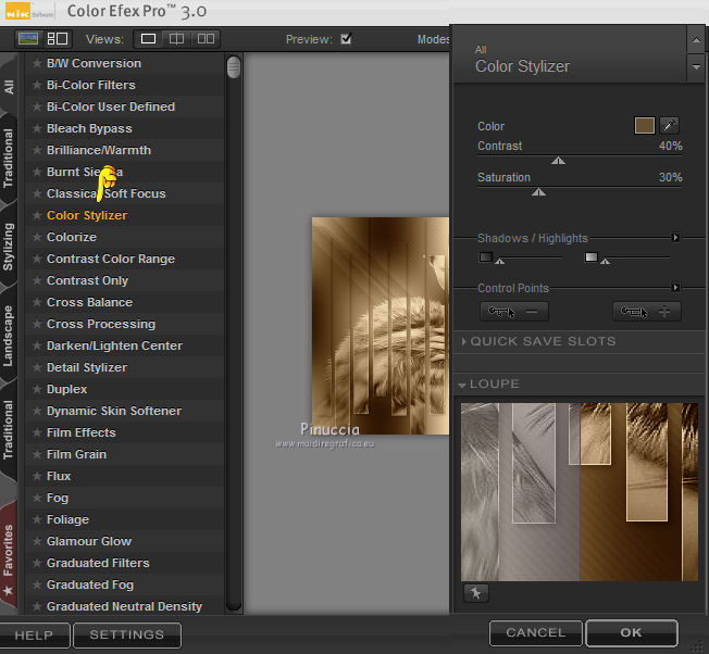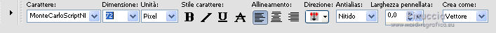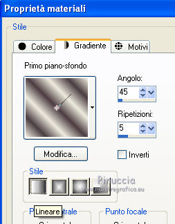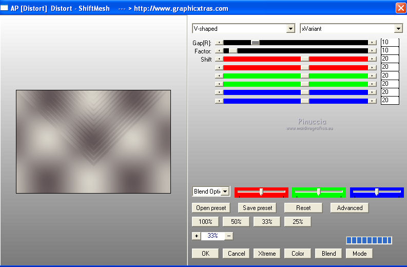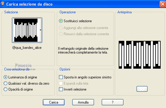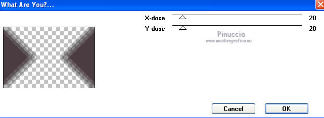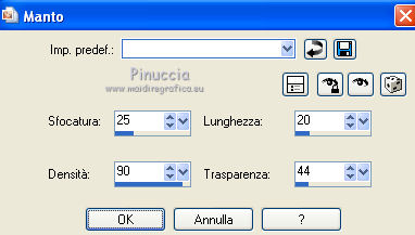 qui puoi trovare qualche risposta ai tuoi dubbi. Se l'argomento che ti interessa non è presente, ti prego di segnalarmelo. Questo tutorial è stato creato con PSP X3, ma può essere eseguito anche con le altre versioni di PSP. Per tradurlo, ho usato PSP X. Occorrente: Materiale qui I tube sono di TReagen e Mtm. Grazie a tutti i creatori di tubes che con il loro meraviglioso lavoro, permettono di creare questi tutorials. Lascia intatto il nome del tube. Il © appartiene all'artista originale. Mantieni il credito di chi ha creato il tube. Filtri in caso di dubbi, ricorda di consultare la mia sezione filtri qui Toadies qui AP Distort - Shift Mesh qui Nik Software - Color Efex Pro qui ![]() Apri il font e minimizzalo. Lo troverai nella lista dei font disponibili quando ti servirà. Metti le selezioni nella cartella Selezioni. 1. Imposta il colore di primo piano con il colore #edebde, e il colore di sfondo con il colore #4b3c41. ![]() Passa il colore di primo piano a Gradiente. ![]() Apri una nuova immagine trasparente 900 x 600 pixels, e riempila con il gradiente.2. Regola>Sfocatura>Sfocatura gaussiana - raggio 35. ![]() 3. Selezione>Carica/Salva selezione>Carica selezione da disco. Cerca e carica la selezione @qua_bandes_alice. ![]() 4. Livelli>Nuovo livello raster. 5. Apri il tube TReagen_2578 e vai a Modifica>Copia. Torna al tuo lavoro e vai a Modifica>Incolla nella selezione. Cambia la modalità di miscelatura di questo livello in Luminanza (esistente), e abbassa l'opacità al 50%. ![]() 6. Effetti>Effetti 3D>Sfalsa ombra. ![]() Selezione>Deseleziona. 7. Attiva il livello sottostante - Raster 1. Livelli>Nuovo livello raster. Riempi con il gradiente.8. Regola>Sfocatura>Sfocatura gaussiana - raggio 35. ![]() 9. Livelli>Duplica. Immagine>Rifletti. Abbassa l'opacità di questo livello al 50%. Livelli>Unisci>Unisci giù. 10. Effetti>Plugins>AP Distort - Shift Mesh. ![]() 11. Livelli>Duplica. Immagine>Capovolgi. Cambia la modalità di miscelatura di questo livello in Moltiplica, e abbassa l'opacità al 50%. 12. Livelli>Nuovo livello raster. Selezione>Carica/Salva selezione>Carica selezione da disco. Cerca e carica la selezione @qua_2triangles@alice. ![]() Riempi la selezione con il colore scuro.Selezione>Deseleziona. 13. Effetti>Plugins>Toadies - What are you. ![]() Attenzione, il filtro Toadies si può usare anche importandolo in Filters Unlimited, ma otterresti un risultato differente. Vedi la schermata sotto. ![]() Per questo tutorial, il filtro va usato da solo Cambia la modalità di miscelatura di questo livello in Moltiplica, e abbassa l'opacità al 35%. ![]() 14. Attiva il livello superiore - Raster 2. Effetti>Effetti di bordo>Aumenta. 15. Livelli>Unisci>Unisci visibile. 16. Effetti>Plugins>Nik Software - Color Efex Pro. ![]() 17. Modifica>Incolla come nuovo livello (il tube TReagen_2578 è ancora in memoria). Immagine>Ridimensiona, all'80%, tutti i livelli non selezionato. Immagine>Rifletti. Spostalo a sinistra, come nel mio esempio.18. Effetti>Effetti 3D>Sfalsa ombra. ![]() 19. Apri il tube del pendolo Mtm_Misc170-26juni2007 e vai a Modifica>Copia. Torna al tuo lavoro e vai a Modifica>Incolla come nuovo livello. Immagine>Ridimensiona, al 50%, tutti i livelli non selezinato. Spostalo in alto a destra, come nel mio esempio.20. Effetti>Effetti 3D>Sfalsa ombra. ![]() 21. Livelli>Unisci>Unisci visibile. 22. Immagine>Aggiungi bordatura, 2 pixels, simmetriche, con il colore chiaro. Modifica>Copia. 23. Immagine>Aggiungi bordatura, 30 pixels, simmetriche, con il colore scuro. Seleziona il bordo scuro con la bacchetta magica ![]() Modifica>Incolla nella selezione. 24. Effetti>Effetti di trama>Manto. ![]() Selezione>Innalza selezione a livello. 25. Livelli>Duplica. Immagine>Capovolgi. Cambia la modalità di miscelatura di questo livello in Luminanza. 26. Attiva il livello sottostante. Cambia la modalità di miscelatura in Luminanza. Selezione>Inverti. 27. Effetti>Effetti 3D>Sfalsa ombra. ![]() Ripeti l'Effetto Sfalsa ombra, cambiando verticale e orizzontale con -3. ![]() Selezione>Deseleziona. 28. Immagine>Aggiungi bordatura, 2 pixels, simmetriche, con il colore chiaro. 29. Attiva lo strumento Testo ![]() font MonteCarloScript, dimensione 72. ![]() Scrivi il testo e posizionalo. Livelli>Converti in livello raster. 30. Firma il tuo lavoro. Livelli>Unisci>Unisci tutto e salva in formato jpg. ![]() Se hai problemi o dubbi, o trovi un link non funzionante, o anche soltanto per un saluto, scrivimi. 26 Maggio 2012 |
