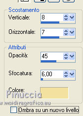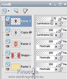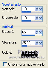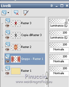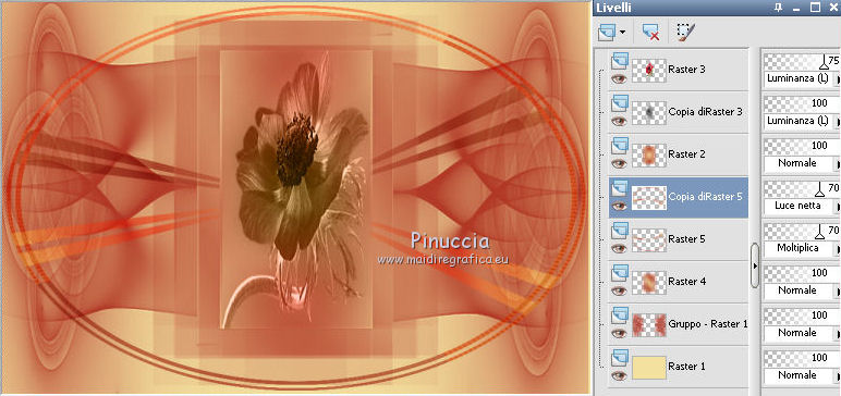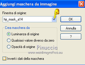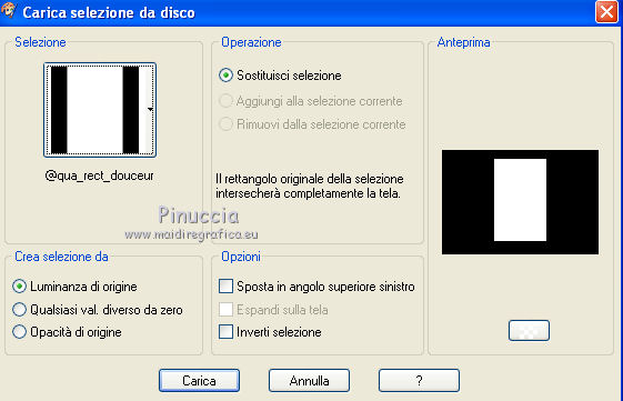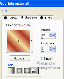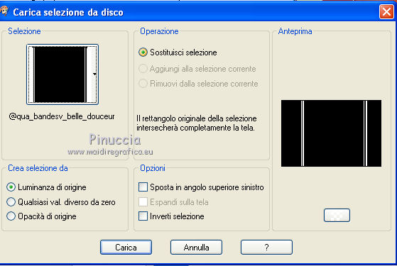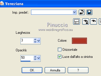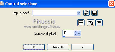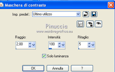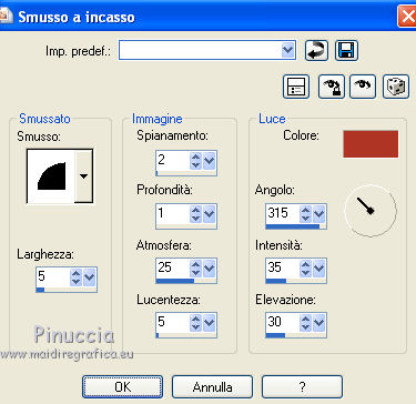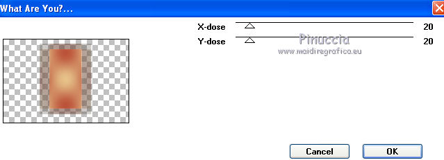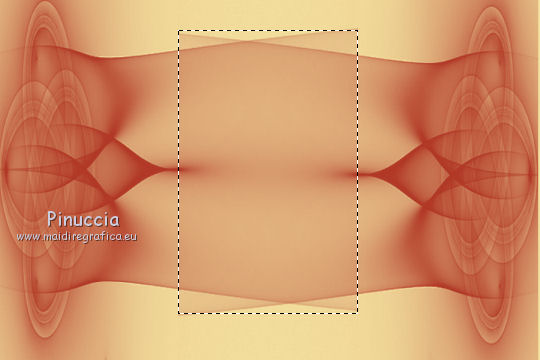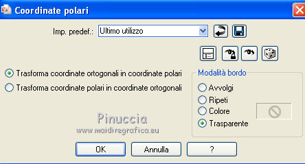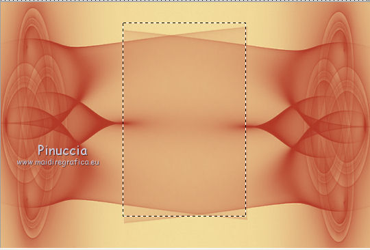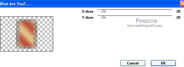 qui puoi trovare qualche risposta ai tuoi dubbi. Se l'argomento che ti interessa non è presente, ti prego di segnalarmelo. Questo tutorial è stato creato con PSP X3, ma può essere eseguito anche con le altre versioni di PSP. Per tradurlo, ho usato PSP X. Occorrente: Materiale qui Per i tubes delle donne grazie Ket e LuzCristina. Per il tube dei fiori grazie Gerry. Grazie a tutti i creatori di tubes per le loro immagini. Lascia intatto il nome del tube. Il © appartiene all'artista originale. Mantieni il credito di chi ha creato il tube. Filtri in caso di dubbi, ricorda di consultare la mia sezione filtri qui Toadies qui ![]() Apri il font e minimizzalo. Lo troverai nella lista dei font disponibili quando ti servirà. Metti le selezioni nella cartella Selezioni. Apri la maschera in PSP e minimizzala con il resto del materiale. 1. Imposta il colore di primo piano con #f3e19f, e il colore di sfondo con #b03525. ![]() 2. Apri una nuova immagine trasparente 900 x 600 pixels, e riempila con il colore di sfondo.3. Livelli>Nuovo livello maschera>Da immagine. Apri il menu sotto la finestra di origine e vedrai la lista dei files aperti. Seleziona la maschera hjr_mask_a14. ![]() Regola>Messa a fuoco>Metti a fuoco. Livelli>Unisci>Unisci gruppo. 4. Livelli>Nuovo livello raster. Livelli>Disponi>Porta sotto. Riempi con il colore chiaro di primo piano.5. Attiva il livello superiore della maschera. Livelli>Duplica. 6. Immagine>Ruota per gradi - 90 gradi a sinistra. ![]() 7. Sposta l'immagine a destra.Attiva nuovamente il livello sottostante dell'originale della maschera. 8. Immagine>Ruota per gradi - 90 gradi a destra. ![]() 9. Sposta l'immagine a sinistra.Dovresti avere questo. ![]() 10. Assicurati di essere posizionato sul livello superiore. Livelli>Unisci>Unisci giù. 11. Regola>Messa a fuoco>Maschera di contrasto. ![]() 12. Selezione>Carica/Salva selezione>Carica selezione da disco. Cerca e carica la selezione @qua_rect_douceur. ![]() Assicurati che il rettangolo contenga correttamente il centro, se dovesse essere decentrato come nell'esempio ![]() tieni premuto il tasto destro del mouse sulla selezione e posizionala correttamente. ![]() Premi sulla tastiera il tasto CANC. Mantieni selezionato. 13. Passa il colore di primo piano a Gradiente. ![]() Livelli>Nuovo livello raster. Riempi con il gradiente.Selezione>Deseleziona. 14. Livelli>Duplica. Immagine>Rifletti. Abbassa l'opacità di questo livello al 50%. Livelli>Unisci>Unisci giù. 15. Effetti>Plugins>Toadies - What are you. ![]() Regola>Messa a fuoco>Maschera di contrasto, con i settaggi precedenti. 16. Livelli>Nuovo livello raster. Selezione>Carica/Salva selezione>Carica selezione da disco. Cerca e carica la selezione @qua_centre2_belle_douceur. ![]() 17. Se la selezione non è correttamente centrata, come hai fatto prima, tieni premuto il tasto destro del mouse e correggi la posizione. ![]() 18. Apri il tube Gerry-Bloemen37-9 april 20. Immagine>Ridimensiona, al 50%, tutti i livelli selezionato. Modifica>Copia. Torna al tuo alvoro e vai a Modifica>Incolla nella selezione. Selezione>Deseleziona. 19. Cambia la modalità di miscelatura di questo livello in Luminanza (esistente), e abbassa l'opacità al 75%. Regola>Messa a fuoco>Maschera di contrasto, con i settaggi precedenti. 20. Livelli>Duplica. Regola>Tonalità e saturazione>Tonalità/Saturazione/Luminosità. ![]() 21. Regola>Sfocatura>Sfocatura gaussiana - raggio 20. ![]() Porta l'opacità di questo livello a 100. Livelli>Disponi>Sposta giù. 22. Attiva il livello Raster 3. Regola>Messa a fuoco>Metti a fuoco. 23. Dovresti avere questo. ![]() 24. Attiva il livello Gruppo-Raster 1. ![]() 25. Selezione>Carica/Salva selezione>Carica selezione da disco. Cerca e carica la selezione @qua_centre3_douceur. ![]() Riempi la selezione con il gradiente.Selezione>Deseleziona. 26. Effetti>Plugins>Toadies - What are you. ![]() Ripeti l'Effetto una seconda volta. 27. Attiva nuovamente il livello superiore. 28. Selezione>Carica/Salva selezione>Carica selezione da disco. Cerca e carica la selezione @qua_bandesh_belle_douceur. ![]() Livelli>Nuovo livello raster. Riempi la selezione con il gradiente.Selezione>Deseleziona. 29. Effetti>Effetti di trama>Veneziana - con il colore scuro. ![]() 30. Sullo stesso livello: Selezione>Carica/Salva selezione>Carica selezione da disco. Cerca e carica la selezione @qua_bandesv_belle_douceur. ![]() Riempi la selezione con il gradiente.Selezione>Deseleziona. 31. Effetti>Effetti di trama>Veneziana, questa volta spuntato anche Orizzontale. ![]() 32. Effetti>Effetti di distorsione>Coordinate polari. ![]() 33. Livelli>Disponi>Sposta giù - 3 volte. Livelli>Duplica. Immagine>Capovolgi. 34. Cambia la modalità di miscelatura del livello originale in Moltiplica, e abbassa l'opacità al 70%. Cambia la modalità del livello della copia in Luce netta, opacità 70. ![]() 35. Torna a posizionarti sul livello superiore. Apri il tube ketwoman082 e vai a Modifica>Copia. non chiuderlo perchè ti servirà ancora Torna al tuo lavoro e vai a Modifica>Incolla come nuovo livello. Immagine>Ridimensiona, 2 volte all'80%, tutti i livelli non selezionato. Posiziona il tube a destra.36. Effetti>Effetti 3D>Sfalsa ombra. ![]() 37. Apri il tube 3872-luzcristina e vai a Modifica>Copia. Torna al tuo lavoro e vai a Modifica>Incolla come nuovo livello. Immagine>Rifletti. Immagine>Ridimensiona, al 50%, tutti i livelli non selezionato. Cambia la modalità di miscelatura di questo livello in Luce netta, e abbassa l'opacità al 50%. Sposta il tube in alto a sinistra.38. Effetti>Effetti 3D>Sfalsa ombra. ![]() 39. Immagine>Aggiungi bordatura, 3 pixels, simmetriche, con il colore scuro di sfondo. Seleziona questo bordo con la bacchetta magica ![]() 40. Effetti>Effetti 3D>Smusso a incasso - con il colore di sfondo. ![]() Selezione>Deseleziona. 41. Immagine>Aggiungi bordatura, 35 pixels, simmetriche, con il colore chiaro. Seleziona questo bordo con la bacchetta magica ![]() 43. Livelli>Nuovo livello raster. Attiva nuova