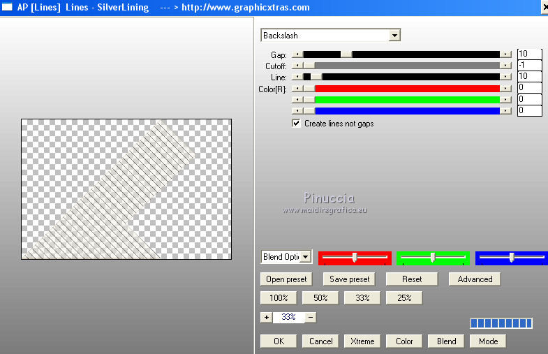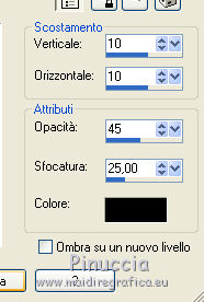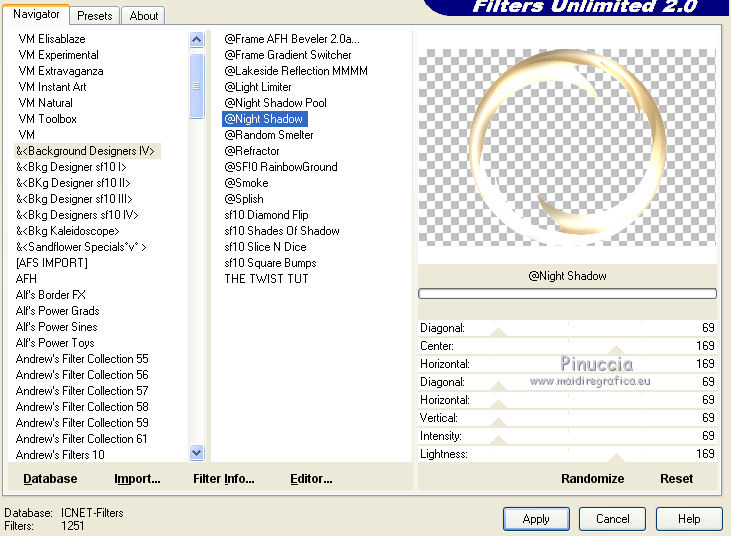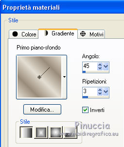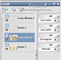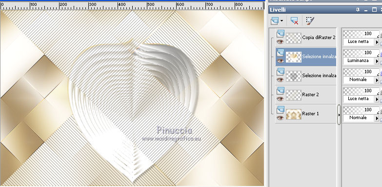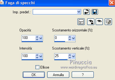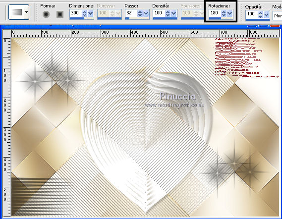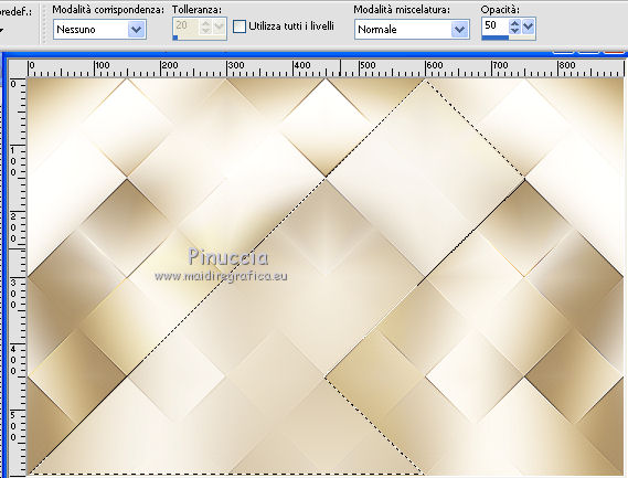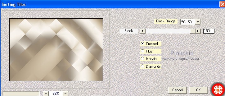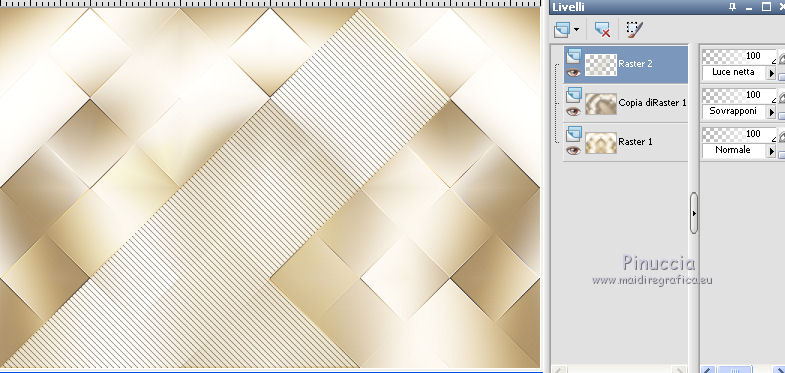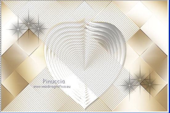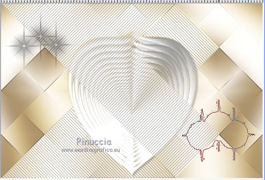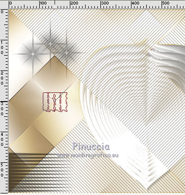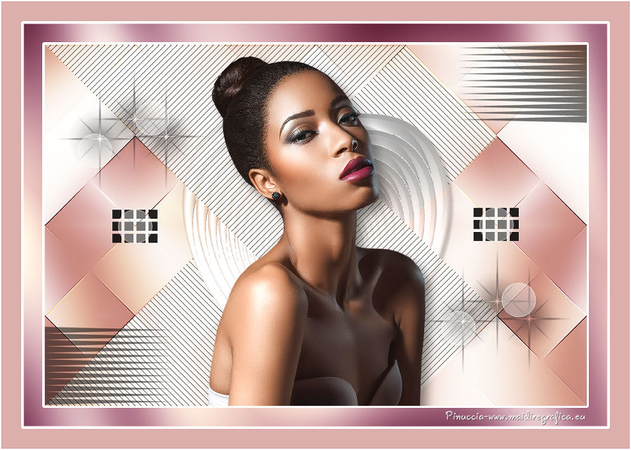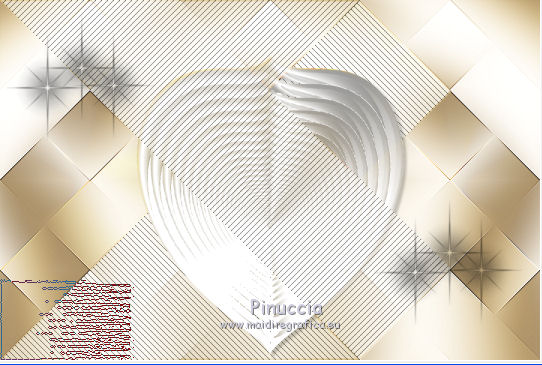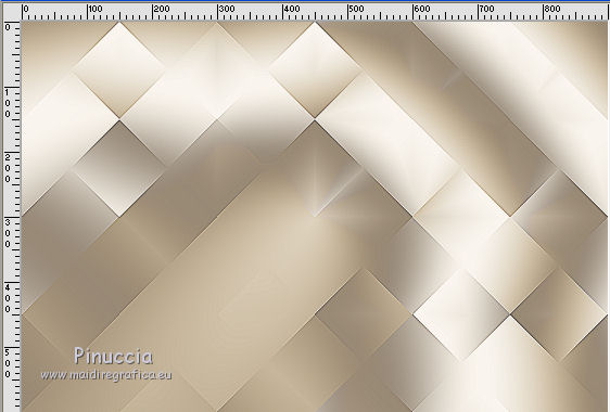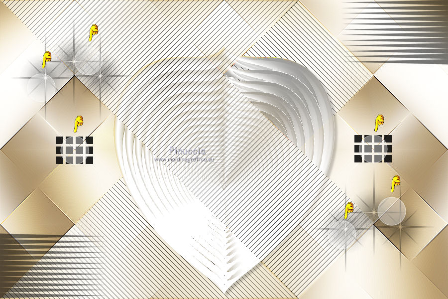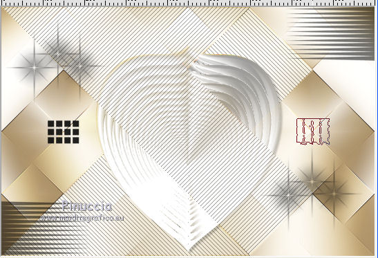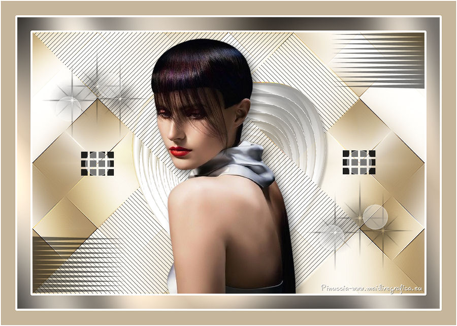 qui puoi trovare qualche risposta ai tuoi dubbi. Se l'argomento che ti interessa non è presente, ti prego di segnalarmelo. Questo tutorial è stato creato con CorelX7, ma può essere realizzato anche con le altre versioni di PSP. Dalla versione X4, il comando Immagine>Rifletti è stato sostituito con Immagine>Capovolgi in orizzontale, e il comando Immagine>Capovolgi con Immagine>Capovolgi in verticale. Nelle versioni X5 e X6, le funzioni sono state migliorate rendendo disponibile il menu Oggetti. Con la nuova versione X7, sono tornati Rifletti/Capovolgi, ma con nuove funzioni. Vedi la scheda sull'argomento qui Per tradurre questo tutorial ho usato PSP X. Occorrente: Materiale qui Per il tube della donna grazie K@rine Dreams. Filtri in caso di dubbi, ricorda di consultare la mia sezione filtri qui AP [Lines] - Lines SilverLining qui Mehdi - Wavy Lab 1.1 qui Mehdi - Sorting Tiles qui Flaming Pear - Flexify 2 qui Filters Unlimited 2.0 qui &<Background Designers IV> - @Night Shadow (da importare in Unlimited) qui Graphics Plus - Cross Shadow qui I filtri Graphics Plus si possono usare da soli o importati in Filters Unlimited (come fare vedi qui) Se un filtro fornito appare con questa icona A seconda della versione di Unlimited utilizzata potresti ottenere risultati differenti. ![]() Se non vuoi sentire la musica, premi il tasto ESC Se utilizzi altri tubes e/o altri colori, puoi sperimentare le modalità di miscelatura e opacità più adatte. Ti consiglio di usare colori piuttosto chiari per questo tutorial. Avrai un risultato migliore. Metti i pennelli nella cartella Pennelli. Attenzione, ogni pennello è composto da due files che non devono essere separati. Vedi gli appunti sui pennelli qui 1. Imposta il colore di primo piano con #c6b69c, e il colore di sfondo con #e4ddd2. ![]() 2. Apri selections_alpha_bip. Finestra>Duplica, oppure sulla tastiera maiuscola+D, oppure Modifica>Copia/Modifica>Incolla come nuova immagine, per fare una copia. Chiudi l'originale e lavora sulla copia. L'immagine non è vuota, ma contiene le selezioni salvate sul canale alfa. 3. Effetti>Plugins>Mehdi - Wavy Lab 1.1. questo filtro lavora con i colori della paletta: il primo è il colore di sfondo, il secondo quello di primo piano; cambia il terzo colore con #9a8c7a e il quarto con #f3eee5. ![]() 4. Effetti>Plugins>Mehdi - Sorting Tiles. ![]() 5. Effetti>Effetti di bordo>Aumenta di più. Risultato. ![]() 6. Livelli>Duplica. Immagine>Rifletti (con Corel17: Immagine>Rifletti>Rifletti orizzontale). Cambia la modalità di miscelatura di questo livello in Sovrapponi. ![]() 7. Livelli>Nuovo livello raster. Selezione>Carica/Salva selezione>Carica selezione da canale alfa. La selezione sélection#1 è subito disponibile. Devi soltanto cliccare Carica. ![]() Riempi la selezione con il colore di primo piano #c6b69c.8. Selezione>Modifica>Contrai - 2 pixels. ![]() Premi sulla tastiera il tasto CANC ![]() 9. Imposta il colore di primo piano con #f3eee5. ![]() Abbassa l'opacità dello strumento Riempimento a 50 e riempi la selezione con il colore di primo piano #f3eee5.![]() Selezione>Deseleziona. 10. AP [Lines] - Lines SilverLining - Backslash, con i settaggi standard. ![]() Cambia la modalità di miscelatura di questo livello in Luce netta. ![]() 11. Livelli>Duplica. Immagine>Capovolgi (con CorelX17: Immagine>Capovolgi o Rifletti>Rifletti verticale. 12. Attiva il livello copia di Raster 1. ![]() Livelli>Unisci>Unisci giù. ![]() 13. Sempre sul livello Raster 1. Selezione>Carica/Salva selezione>Carica selezione da canale alfa. Apri il menu delle selezioni e carica sélection#2. ![]() Selezione>Innalza selezione a livello. Selezione>Deseleziona. 14. Livelli>Duplica. Immagine>Rifletti (con CorelX17: Immagine>Rifletti>Rifletti orizzontale). Livelli>Unisci>Unisci giù. 15. Effetti>Plugins>Flaming Pear - Flexify 2. ![]() 16. Effetti>Plugins>Filters Unlimited 2.0 - &<Background Designers IV> - @Night Shadow, con i settaggi standard. ![]() 17. Effetti>Plugins>Flaming Pear - Flexify 2 cambia soltanto Output con Werner. ![]() 18. Effetti>Effetti di riflesso>Fuga di specchi. ![]() Livelli>Disponi>Sposta su. 19. Effetti>Effetti 3D>Sfalsa ombra, ombra su nuovo livello selezionato. ![]() 20. Attiva il livello Selezione innalzata, e cambia la modalità di miscelatura di questo livello in Luminanza. ![]() 21. Attiva il livello superiore. Livelli>Nuovo livello raster. Imposta il colore di primo piano con il colore nero #000000. ![]() 22. Attiva lo strumento Pennello ![]() cerca e seleziona il pennello @qua_deco_bip1 ![]() Cliccando con il tasto sinistro del mouse per usare il colore di primo piano, applica il pennello in alto a sinistra, ![]() e nell'angolo in basso a destra. ![]() Se preferisci, puoi anche duplicare il pennello, in modo da poterlo posizionare più comodamente. ![]() 23. Livelli>Nuovo livello raster. Seleziona il pennello @qua_deco_bip2 ![]() e applicalo in basso a sinistra, sempre cliccando con il tasto sinistro del mouse ![]() Cambia la rotazione del pennello a 180 gradi e applica nuovamente il pennello in alto a destra. ![]() 24. Livelli>Nuovo livello raster. Seleziona il pennello @qua_carre3 ![]() e applicalo al centro del rombo a sinistra ![]() e al centro del rombo a destra. ![]() 25. Imposta il colore di primo piano con il colore bianco #ffffff. Livelli>Nuovo livello raster. Seleziona il pennello @qua_deco_rond10, riduci la dimensione a 100 ![]() e applicalo 6 volte cliccando con il tasto sinistro del mouse per usare il colore bianco di primo piano ![]() Naturalmente, anche qui, puoi duplicare il primo livello del pennello e posizionare i duplicati a tuo piacimento.![]() 26. Apri il tube Karine_dreams_hear_style_2961_mai_2014, e vai a Modifica>Copia. Torna al tuo lavoro e vai a Modifica>Incolla come nuovo livello. Immagine>Ridimensiona, all'80%, tutti i livelli non selezionato. ![]() 27. Effetti>Effetti di immagine>Scostamento. ![]() 28. Effetti>Effetti 3D>Sfalsa ombra, ombra su nuovo livello non selezionato. ![]() 29. 