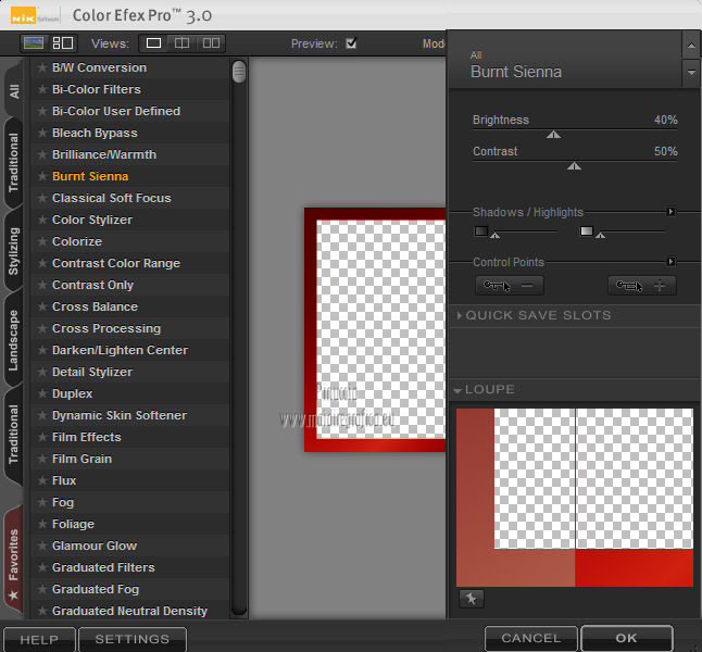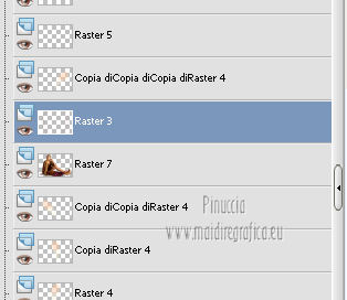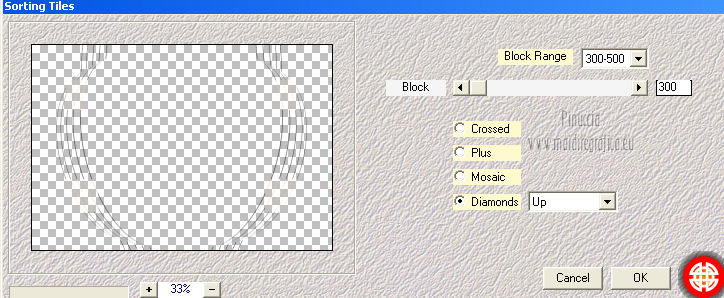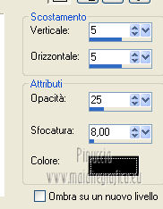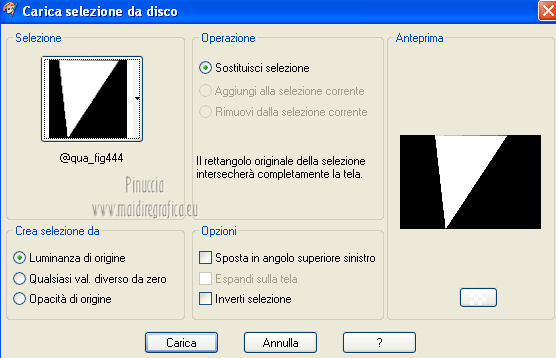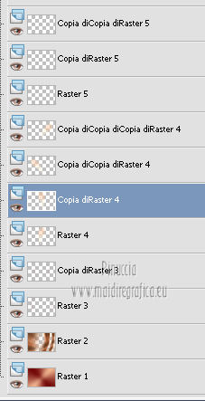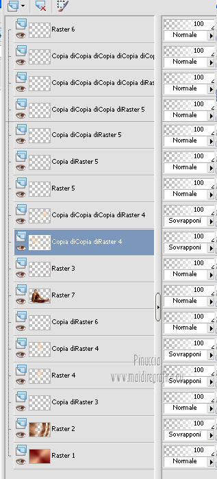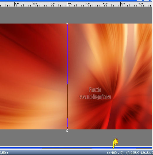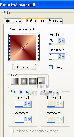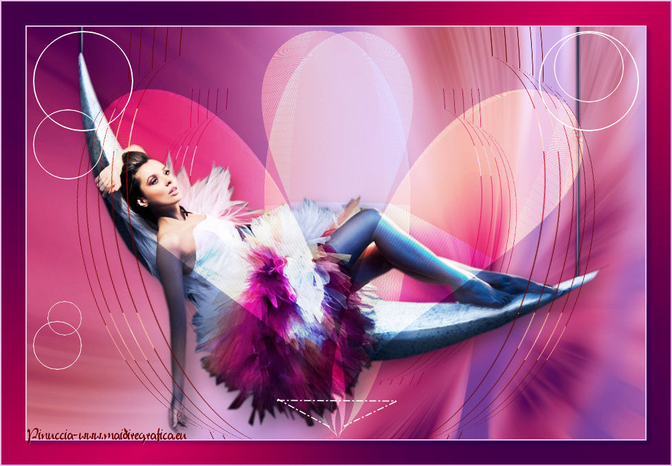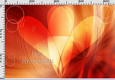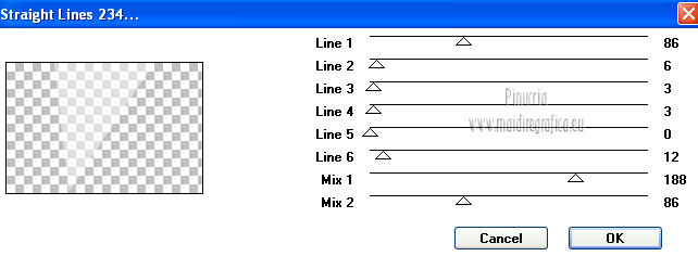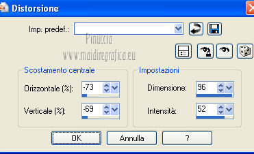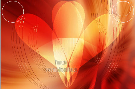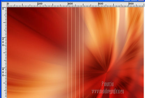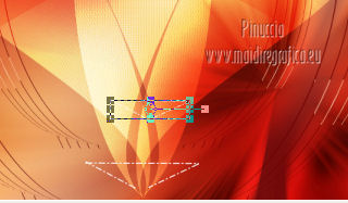 qui puoi trovare qualche risposta ai tuoi dubbi. Se l'argomento che ti interessa non è presente, ti prego di segnalarmelo. Questo tutorial è stato creato con PSP X3, ma può essere eseguito anche con le altre versioni di PSP. Per tradurlo, ho usato PSP X. Occorrente: Materiale qui Il tube della donna è di Mary. Grazie per il suo magnifico lavoro. Lascia intatto il nome del tube. Il © appartiene all'artista originale. Mantieni il credito di chi ha creato il tube. Filtri in caso di dubbi, ricorda di consultare la mia sezione filtri qui Mehdi - Sorting Tiles qui Nik Software - Color Efex Pro qui Andrew's Filter 51 - Straight Lines 234 qui ![]() Metti @qua20 nella cartella Linee di stile. Metti le selezioni nella cartella Selezioni. Colori che saranno usati nel corso del tutorial. ![]() 1. Imposta il colore di primo piano con il colore chiaro #fec79e, e il colore di sfondo con il colore scuro #6c0204. Passa il colore di primo piano a Gradiente, stile Radiale. ![]() 2. Apri una nuova immagine trasparente 900 x 600 pixels, e riempila con il gradiente.3. Regola>Sfocatura>Sfocatura gaussiana - raggio 60. ![]() 4. Apri il tube Mary 04012-6 e vai a Modifica>Copia. Torna al tuo lavoro e vai a Modifica>Incolla come nuovo livello. 5. Effetti>Effetti di riflesso>Motivi. ![]() 6. Regola>Sfocatura>Sfocatura radiale. ![]() 7. Effetti>Effetti di distorsione>Distorsione. ![]() 8. Cambia la modalità di miscelatura di questo livello in Sovrapponi. 9. Attiva lo strumento Penna , linea di stile Pieno.![]() Tenendo premuto il tasto della maiuscola per ottenere una linea perfettamente diritta, traccia cinque linee dall'alto in basso a 400, 425, 450, 475, 500 pixels. Nella barra inferiore puoi controllare la posizione (X), mentre tracci la linea. ![]() Dopo ogni linea clicca su Applica. ![]() Alla fine dovresti avere questo. ![]() 10. Livelli>Converti in livello raster. 11. Effetti>Effetti di distorsione>Distorsione, con i settaggi precedenti. 12. Effetti>Effetti geometrici>Sfera. ![]() 13. Livelli>Duplica. 14. Immagine>Rifletti. 15. Livelli>Unisci>Unisci giù. 16. Effetti>Plugins>Mehdi - Sorting Tiles. ![]() 17. Livelli>Duplica. 18. Immagine>Ridimensiona, al 70%, tutti i livelli non selezionato. 19. Livelli>Nuovo livello raster. 20. Selezione>Carica/Salva selezione>Carica selezione da disco. Cerca e carica la selezione @qua_fig444. ![]() 21. Passa il colore di primo piano da gradiente al colore chiaro, attiva lo strumento Riempimento ![]() e imposta l'opacità a 50. ![]() Riempi la selezione con il colore chiaro.22. Selezione>Deseleziona. 23. Effetti>Plugins>Andrew's Filter 51 - Straight Lines 234, con i settaggi standard. ![]() 24. Effetti>Effetti geometrici>Cerchio. ![]() 25. Cambia la modalità di miscelatura di questo livello in Sovrapponi. 26. Livelli>Duplica. Immagine>Rifletti. 27. Livelli>Duplica. Immagine>Ruota per gradi - 30 gradi a sinistra. ![]() 28. Livelli>Duplica. Immagine>Rifletti. 29. Posiziona le "foglie" come nell'esempio.![]() Livelli>Nuovo livello raster. 30. Selezione>Carica/Salva selezione>Carica selezione da disco. Cerca e carica la selezione @qua_fig442. ![]() 31. Imposta il colore di primo piano con il colore bianco, riporta l'opacità dello strumento Riempimento a 100,e riempi la selezione con il colore bianco.32. Selezione>Modifica>Contrai - 2 pixels. ![]() 33. Premi sulla tastiera il tasto CANC. Selezione>Deseleziona. 34. Livelli>Duplica. Immagine>Rifletti. 35. Livelli>Duplica. Immagine>Ridimensiona, al 70%, tutti i livelli non selezionato. Sposta il duplicato un po' più in basso.![]() 36. Livelli>Duplica. Immagine>Rifletti. Posiziona il cerchio come nell'esempio.![]() 37. Livelli>Duplica. Immagine>Ridimensiona, al 70%, tutti i livelli non selezionato. Sposta questo cerchio in basso.38. Livelli>Duplica. Immagine>Ridimensiona, al 70%, tutti i livelli non selezionato. Posiziona questo cerchio come nell'esempio.![]() 39. Attiva nuovamente lo strumento Penna ![]() e seleziona la linea di stile @ con i settaggi precedenti. Traccia un rettangolo rovesciato e senza vertice, come nell'esempio. ![]() 40. Livelli>Converti in livello raster. 41. Livelli>Duplica. Immagine>Ridimensiona, al 70%, tutti i livelli non selezionato. Spostalo un po' più in alto.![]() 42. Attiva il livello della prima copia di Raster 4. ![]() 43. Modifica>Incolla come nuovo livello (dovresti avere ancora in memoria il tube della donna; se così non fosse, attiva il tube e copialo nuovamente). 44. Effetti>Effetti 3D>Sfalsa ombra. ![]() 45. Porta il livello degli archi (raster 3), sopra il livello della donna (Raster 7). ![]() 46. Porta il livello Copia di raster 6 (il piccolo triangolo) sotto quello della donna. ![]() 47. La seconda e la terza copia di Raster 4 devono trovarsi sopra il livello Raster 3. Questa dovrebbe essere la tua paletta dei livelli. ![]() 48. Immagine>Aggiungi bordatura, 2 pixels, simmetriche, con il colore chiaro. Immagine>Aggiungi bordatura, 35 pixels, simmetriche, con il colore scuro. Seleziona questo bordo con la bacchetta magica ![]() 49. Selezione>Innalza selezione a livello. 50. Riporta il colore di primo piano al Gradiente iniziale. ![]() Riempi il bordo con il gradiente.51. Effetti>Plugins>Nik Software - Color Efex Pro. Burnt Sienna con i settaggi standard (o secondo i tuoi colori). ![]() 52. Selezione>Inverti. 53. Effetti>Effetti 3D>Sfalsa ombra. ![]() 54. Selezione>Deseleziona. 55. Immagine>Aggiungi bordatura, 2 pixels, simmetriche, con il colore chiaro. 56. Firma il tuo lavoro e salva in formato jpg. Per questi esempi ho usato tubes di Tocha. ![]() Thafs ![]() Tocha ![]() ![]() Se hai problemi o dubbi, o trovi un link non funzionante, o anche soltanto per un saluto, scrivimi. 6 Agosto 2012 |