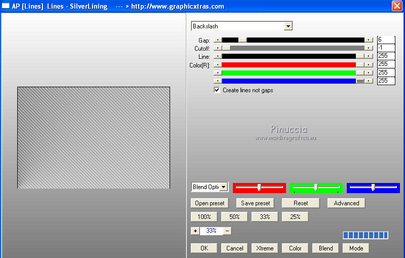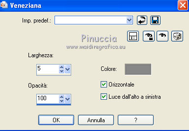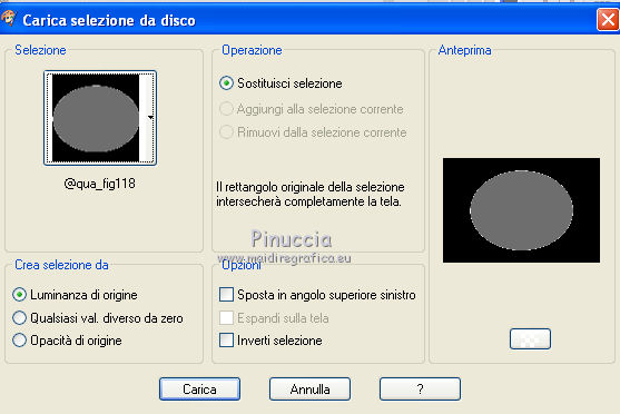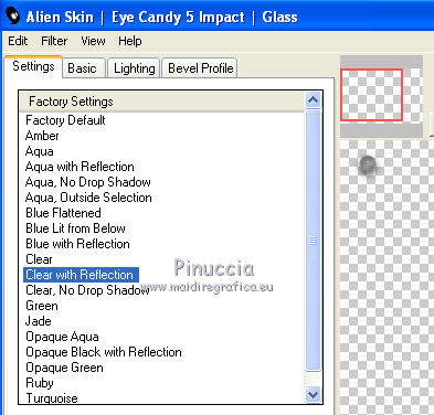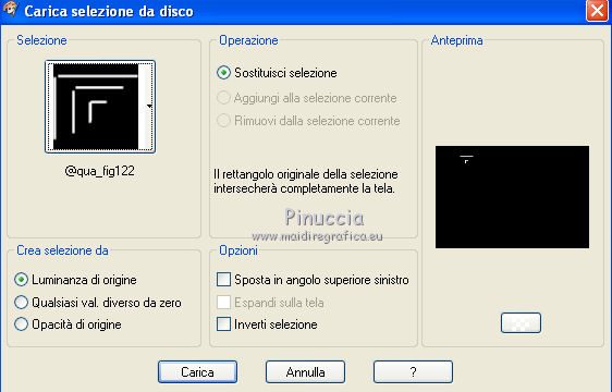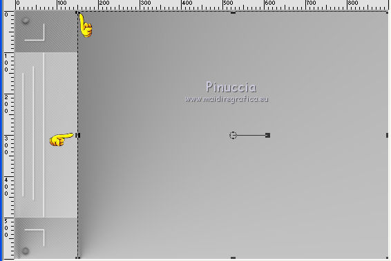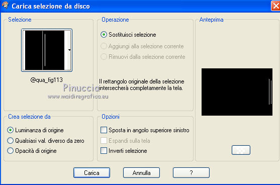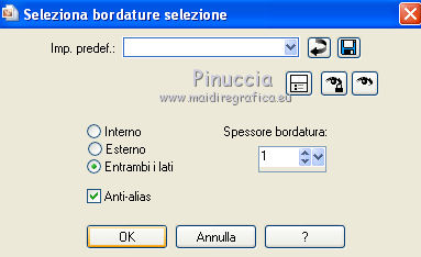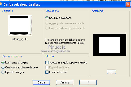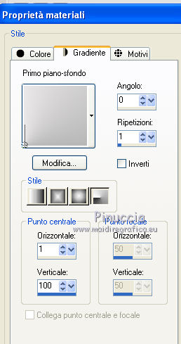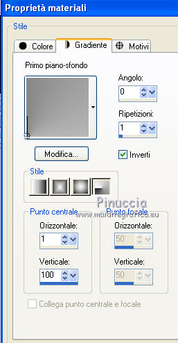 qui puoi trovare qualche risposta ai tuoi dubbi. Se l'argomento che ti interessa non è presente, ti prego di segnalarmelo. Questo tutorial è stato creato con PSP X3, ma può essere eseguito anche con le altre versioni di PSP. Per tradurlo, ho usato PSP X. Occorrente: Materiale qui Il tube dell'uomo è di Orange-Vaucluse, il tube della donna in nero è di Liza, e il tube della donna in bianco è di Mary. Grazie a tutti i creatori di tubes per le loro immagini. Lascia intatto il nome del tube. Il © appartiene all'artista originale. Mantieni il credito di chi ha creato il tube. Filtri in caso di dubbi, ricorda di consultare la mia sezione filtri qui AP Lines - SilverLining qui Alien Skin Eye Candy 5 Impact qui ![]() Metti le selezioni nella cartella Selezioni. Nel corso del tutorial sono stati usati questi colori. ![]() 1. Imposta il colore di primo piano con il colore chiaro #e9e7e8 , e il colore di sfondo con il colore scuro #878787 . Passa il colore di primo piano a Gradiente, stile Radiale, con i seguenti settaggi. ![]() 2. Apri una nuova immagine trasparente 900 x 600 pixels, e riempila con il gradiente.3. Livelli>Duplica. Effetti>Plugins>AP Lines - Lines SilverLining seleziona Backslash con i seguenti settaggi. ![]() Regola>Messa a fuoco>Accentua messa a fuoco. 4. Cambia la modalità di miscelatura di questo livello in Sovrapponi, e abbassa l'opacità al 35%. 5. Livelli>Nuovo livello raster. Attiva lo strumento Selezione ,clicca sull'icona Selezione personalizzata ![]() e imposta i seguenti settaggi: ![]() Cambia i settaggi del gradiente togliendo la selezione a Inverti, ![]() e riempi la selezione con il gradiente.Selezione>Deseleziona. Regola>Messa a fuoco>Accentua messa a fuoco. 6. Cambia la modalità di miscelatura di questo livello in Filtra, e abbassa l'opacità al 50%. 7. Livelli>Nuovo livello raster. Selezione>Carica/Salva selezione>Carica selezione da disco. Cerca e carica la selezione @qua_fig113. ![]() 8. Imposta il colore di primo piano con il colore bianco, e riempi la selezione con il colore bianco.Selezione>Deseleziona. Regola>Messa a fuoco>Metti a fuoco. 9. Livelli>Duplica. Immagine>Rifletti. Livelli>Unisci>Unisci giù. 10. Effetti>Effetti 3D>Sfalsa ombra. ![]() 11. Livelli>Nuovo livello raster. Selezione>Carica/Salva selezione>Carica selezione da disco. Cerca e carica la selezione @qua_fig126. ![]() Riempi la selezione con il colore bianco.Selezione>Deseleziona. 12. Livelli>Duplica. Immagine>Rifletti. Livelli>Unisci>Unisci giù. 13. Livelli>Duplica. Immagine>Capovolgi. Livelli>Unisci>Unisci giù. Regola>Messa a fuoco>Accentua messa a fuoco. 14. Effetti>Effetti 3D>Sfalsa ombra, con i settaggi precedenti. 15. Effetti>Plugins>Alien Skin Eye Candy 5 Impact - Glass. Seleziona Clear with Reflection e ok. ![]() 16. Regola>Tonalità e saturazione>Viraggio (secondo i valori del tuo colore scuro). ![]() 17. Livelli>Nuovo livello raster. Selezione>Carica/Salva selezione>Carica selezione da disco. Cerca e carica la selezione @qua_fig127. ![]() Riempi la selezione con il colore bianco.Selezione>Deseleziona. Regola>Messa a fuoco>Metti a fuoco. 18. Livelli>Duplica. Immagine>Capovolgi. Livelli>Unisci>Unisci giù. 19. Livelli>Duplica. Immagine>Rifletti. Livelli>Unisci>Unisci giù. 20. Effetti>Effetti 3D>Sfalsa ombra, con i settaggi precedenti. 21. Livelli>Nuovo livello raster. Imposta nuovamente il colore di primo piano con il Gradiente iniziale, inverti selezionato. ![]() Riempi il livello con il gradiente.Attiva lo strumento Puntatore (tasto K)deformazione se stai usando PSP 9, (tasto D, valido per tutte le versioni)e, usando il nodo centrale a sinistra, spingi l'immagine fino a 150 pixels. ![]() Usando il nodo centrale a destra, spingi l'immagine a 750 pixels. ![]() 22. Effetti>Plugins>AP Lines - Lines SilverLining, con i settaggi precedenti. 23. Cambia la modalità di miscelatura di questo livello in Moltiplica, e abbassa l'opacità al 50%. 24. Regola>Messa a fuoco>Accentua messa a fuoco. 25. Livelli>Nuovo livello raster. Selezione>Carica/Salva selezione>Carica selezione da disco. Cerca e carica la selezione @qua_fig111. ![]() 26. Imposta l'opacità dello strumento Riempimento a 50.![]() Gradiente inverti non selezionato. ![]() Riempi la selezione con il gradiente. Riporta l'opacità dello strumento Riempimento a 100. 27. Cambia la modalità di miscelatura di questo livello in Luce netta. Selezione>Deseleziona. Regola>Messa a fuoco>Accentua messa a fuoco. ![]() 28. Livelli>Nuovo livello raster. Selezione>Carica/Salva selezione>Carica selezione da disco. Cerca e carica la selezione @qua_fig122. ![]() Modalità dello strumento Riempimento impostata con Nessuno ![]() e basterà un solo clic per riempire la selezione con il colore bianco.Selezione>Deseleziona. Regola>Messa a fuoco>Accentua messa a fuoco. 29. Livelli>Duplica. Immagine>Rifletti. Livelli>Unisci>Unisci giù. 30. Livelli>Duplica. Immagine>Capovolgi. Livelli>Unisci>Unisci giù. 31. Effetti>Effetti 3D>Sfalsa ombra, con i settaggi precedenti. 32. Livelli>Nuovo livello raster. Selezione>Carica/Salva selezione>Carica selezione da disco. Cerca e carica la selezione @qua_fig116. ![]() Opacità Riempimento a 50,e riempi la selezione con il colore chiaro. 33. Cambia la modalità di miscelatura di questo livello in Filtra. Mantieni selezionato. 34. Selezione>Modifica>Seleziona bordature selezione. ![]() 35. Livelli>Nuovo livello raster. Opacita Riempimento a 100,e riempi la selezione con il colore scuro. Selezione>Deseleziona. 36. Livelli>Nuovo livello raster. Selezione>Carica/Salva selezione>Carica selezione da disco. Cerca e carica la selezione @qua_fig118. ![]() 37. Opacita Riempimento a 50,e riempi la selezione con il colore scuro. Abbassa l'opacità di questo livello al 50%. 38. Livelli>Nuovo livello raster. Selezione>Modifica>Seleziona bordature selezione, con i settaggi precedenti. 39. Opacita Riempimento a 100,e riempi la selezione con il colore scuro. Selezione>Deseleziona. 40. Apri il tube costume-homme-orange-vaucluse 
