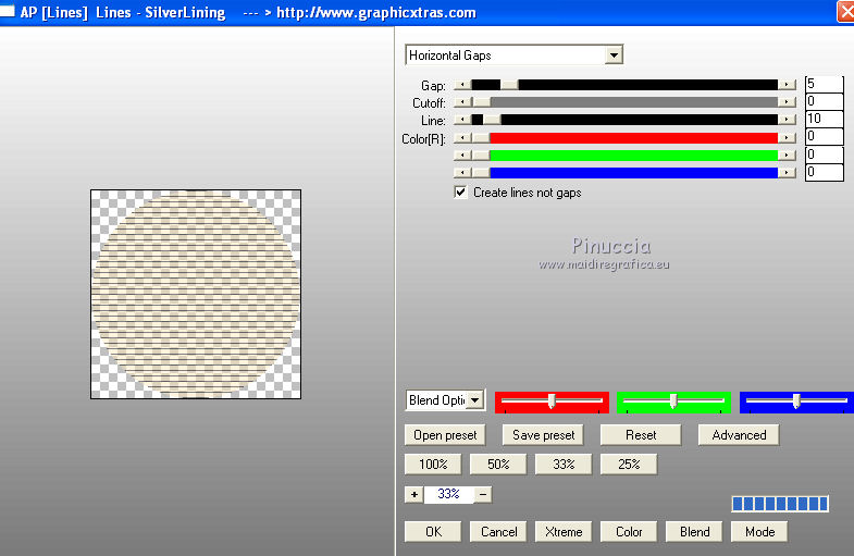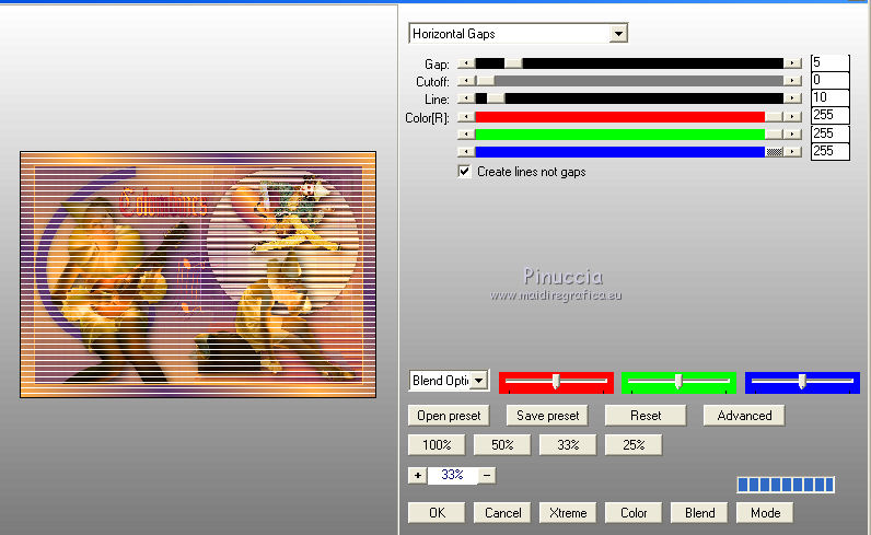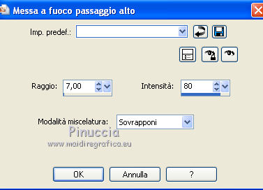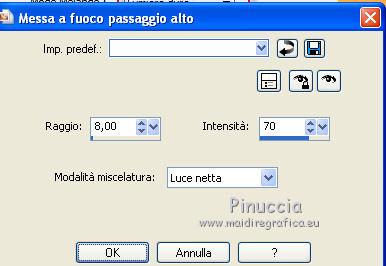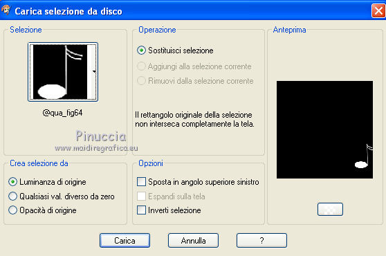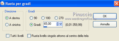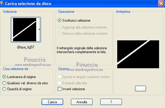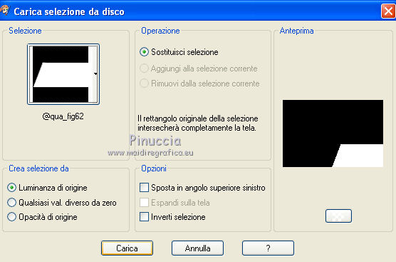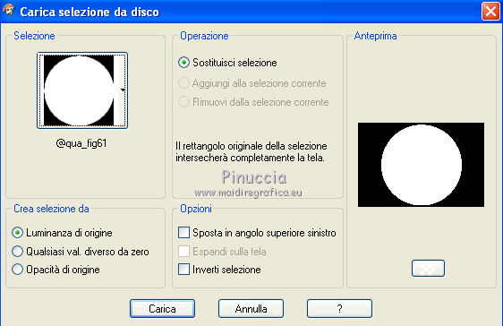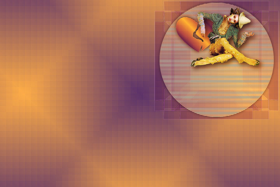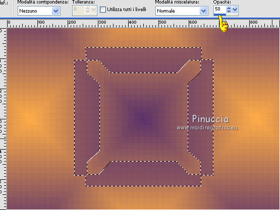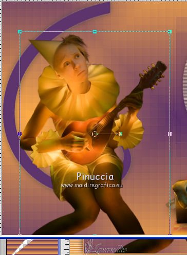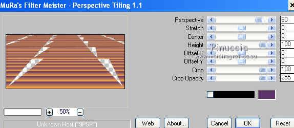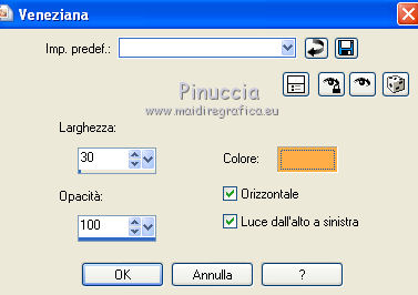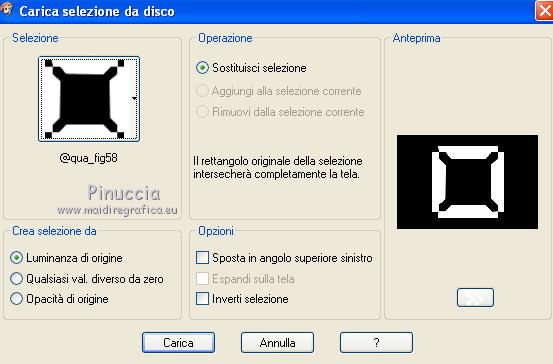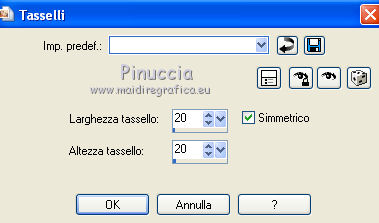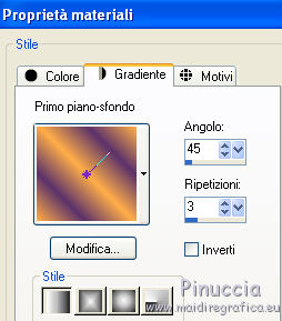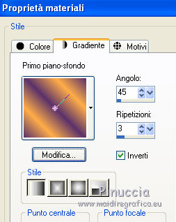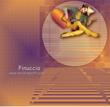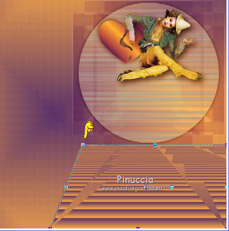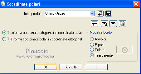 qui puoi trovare qualche risposta ai tuoi dubbi. Se l'argomento che ti interessa non è presente, ti prego di segnalarmelo. Questo tutorial è stato creato con PSP X3, ma può essere eseguito anche con le altre versioni di PSP. Per tradurlo, ho usato PSP X. Occorrente: Materiale qui I tubes utilizzati sono di Tocha e Ana Ridzi. Grazie a tutti i creatori di tubes per le loro immagini. Lascia intatto il nome del tube. Il © appartiene all'artista originale. Mantieni il credito di chi ha creato il tube. Filtri in caso di dubbi, ricorda di consultare la mia sezione filtri qui Toadies qui AP Lines - SilverLining qui Mura's Meister - Perspective Tiling qui ![]() Metti le selezioni nella cartella Selezioni. Nel corso del tutorial sono stati usati questi colori. ![]() 1. Imposta il colore di primo piano con il colore chiaro #ffad47, e il colore di sfondo con il colore scuro #5b326a. Passa il colore di primo piano a Gradiente. ![]() 2. Apri una nuova immagine trasparente 900 x 600 pixels, e riempila con il gradiente.3. Livelli>Duplica. Immagine>Rifletti. Abbassa l'opacità di questo livello al 50%. 4. Effetti>Effetti di distorsione>Tasselli. ![]() 5. Effetti>Effetti di bordo>Aumenta. 6. Livelli>Nuovo livello raster. Selezione>Carica/Salva selezione>Carica selezione da disco. Cerca e carica la selezione @qua_fig58. ![]() 7. Imposta l'opacità dello strumento Riempimento al 50%, e riempi la selezione con il colore scuro.![]() Selezione>Deseleziona. 8. Effetti>Plugins>Toadies - What are you. ![]() 9. Cambia la modalità di miscelatura di questo livello in Sovrapponi. per il mio esempio ho cambiato in Luce netta Effetti>Effetti di bordo>Aumenta di più. 10. Livelli>Nuovo livello raster. Selezione>Carica/Salva selezione>Carica selezione da disco. Cerca e carica la selezione @qua_fig61. ![]() 11. Imposta il colore di primo piano con il colore più chiaro #fde6b9 e riempi la selezione con questo colore,(opacità sempre a 50). 12. Effetti>Plugins>AP Lines - Lines SilverLining. ![]() Abbassa l'opacità di questo livello all'80%. ![]() Selezione>Deseleziona. 13. Regola>Messa a fuoco>Messa a fuoco passaggio alto. ![]() Immagine>Ridimensiona, all'85%, tutti i livelli non selezionato. Posiziona correttamente il cerchio al centro della forma.Livelli>Unisci>Unisci giù. 14. Apri il tube Tocha23760 e vai a Modifica>Copia. Torna al tuo lavoro e vai a Modifica>Incolla come nuovo livello. Immagine>Ridimensiona, al 50%, tutti i livelli non selezionato. ![]() 15. Effetti>Effetti 3D>Sfalsa ombra. ![]() 16. Sposta il tube nel cerchio in alto a sinistra.17. Livelli>Nuovo livello raster. Selezione>Carica/Salva selezione>Carica selezione da disco. Cerca e carica la selezione @qua_fig60. ![]() 17. Imposta nuovamente il colore di primo piano con il colore iniziale, e passa il colore di primo piano a Gradiente, questa volta Inverti non selezionato. ![]() 18. Riporta l'opacità dello strumento Riempimento a 100, e riempi la selezione con il gradiente.Selezione>Deseleziona. 19. Immagine>Ridimensiona, al 60%, tutti i livelli non selezionato. 20. Regola>Messa a fuoco>Messa a fuoco passaggio alto. ![]() 21. Posiziona il tube sul cuore, a sinistra,(vedi il mio esempio). Livelli>Disponi>Sposta giù. ![]() Attiva il livello del tube. Livelli>Unisci>Unisci giù. Immagine>Ridimensiona, all'85%, tutti i livelli non selezionato. Ancora Livelli>Unisci>Unisci giù. Ancora Immagine>Ridimensiona, al 75%, tutti i livelli non selezionato. Sposta l'immagine in alto a destra.![]() 22. Livelli>Nuovo livello raster. Selezione>Carica/Salva selezione>Carica selezione da disco. Cerca e carica la selezione @qua_fig62. ![]() Riempi la selezione con il colore scuro (opacità 100).23. Effetti>Effetti di trama>Veneziana. ![]() 24. Effetti>Plugins>Mura's Meister - Perspective Tiling. ![]() Selezione>Deseleziona. 25. Attiva lo strumento Puntatore (tasto K),se stai usando PSP 9 lo strumento Deformazione ![]() tasto D, valido per tutte le versioni. In modalità Scala spingi il nodo superiore al centro fino al bordo della forma. e in modalità Inclinazione allinea il nodo superiore sinistro al limite della forma. ![]() Dovresti avere questo. ![]() Cambia la modalità di miscelatura di questo livello in Sovrapponi, e abbassa l'opacità all'80%. 26. Apri il tube AR268 e vai a Modifica>Copia. Torna al tuo lavoro e vai a Modifica>Incolla come nuovo livello. Sposta il tube sulla "veneziana".27. Effetti>Effetti 3D>Sfalsa ombra, con i settaggi precedenti. ![]() 28. Livelli>Nuovo livello raster. Selezione>Carica/Salva selezione>Carica selezione da disco. Cerca e carica la selezione @qua_fig57. ![]() Riempi la selezione con il colore scuro.Selezione>Deseleziona. 29. Effetti>Effetti di distorsione>Coordinate polari. ![]() 30. Tasto K o D per attivare lo strumento Puntatore/Deformazione, e sposta la forma in alto, allungandola un po' verso il basso. ![]() 31. Regola>Messa a fuoco>Messa a fuoco passaggio alto. ![]() 32. Apri il tube AR284 e vai a Modifica>Copia. Torna al tuo lavoro e vai a Modifica>Incolla come nuovo livello. Spostalo sulla "luna".![]() 33. Effetti>Effetti 3D>Sfalsa ombra, con i settaggi precedenti. ![]() 34. Attiva lo strumento Testo , font AinsworthSSK,![]() Inverti i colori in modo che il gradiente passi a colore di sfondo. Scrivi la parola Colombines e posizionala in alto a sinistra, come nel mio esempio. Livelli>Converti in livello raster. Cambia la modalità di miscelatura di questo livello in Sovrapponi. 35. Livelli>Duplica. Effetti>Effetti 3D>Sfalsa ombra. ![]() 36. Livelli>Nuovo livello raster. Selezione>Carica/Salva selezione>Carica selezione da disco. Cerca e carica la selezione @qua_fig63. ![]() Riempi la selezione con l'ultimo gradiente (inverti non selezionato).![]() Selezione>Deseleziona. Cambia la modalità di miscelatura di questo livello in Luce netta. 37. Livelli>Nuovo livello raster. Selezione>Carica/Salva selezione>Carica selezione da disco. Cerca e carica la selezione @qua_fig64. ![]() Riempi la selezione con il colore chiaro.Selezi