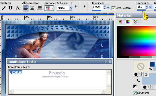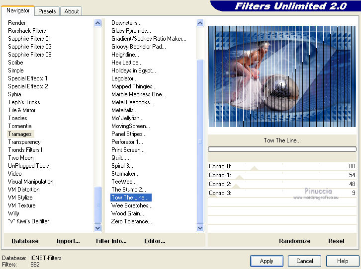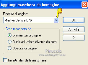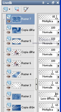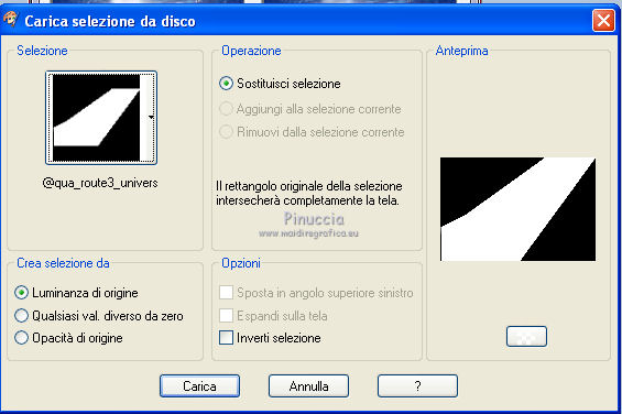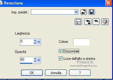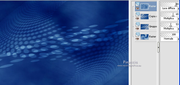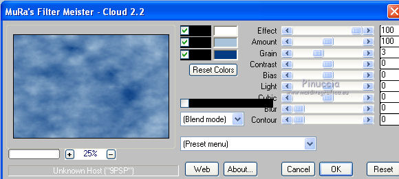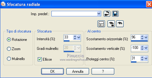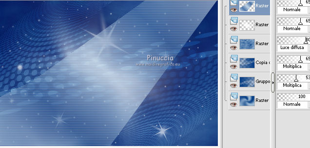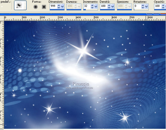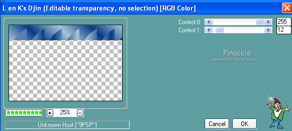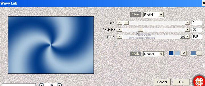 qui puoi trovare qualche risposta ai tuoi dubbi. Se l'argomento che ti interessa non è presente, ti prego di segnalarmelo. Questo tutorial è stato creato con PSP X3, ma può essere eseguito anche con le altre versioni di PSP. Per tradurlo, ho usato PSP X. Occorrente: Materiale qui Il tube è di Anna.br. La maschera è di Benice. Il pennello è di LadyVictoire. Grazie a tutti i creatori di tubes che con il loro meraviglioso lavoro, permettono di creare questi tutorials. Lascia intatto il nome del tube. Il © appartiene all'artista originale. Mantieni il credito di chi ha creato il tube. Filtri in caso di dubbi, ricorda di consultare la mia sezione filtri qui Mehdi - Wavy Lab qui L&K - L&K Djin qui Mura's Meister - Cloud qui FM Tile Tools qui ![]() Apri il font e minimizzalo. Lo troverai nella lista dei font disponibili quando ti servirà. Metti le selezioni nella cartella Selezioni. Apri la maschera in PSP e minimizzala con il resto del materiale. 1. Imposta il colore di primo piano con il colore #a8c3da, e il colore di sfondo con il colore #043c84. ![]() 2. Apri una nuova immagine trasparente 900 x 600 pixels. 3. Effetti>Plugins>Mehdi - Wavy lab. ![]() 4. Regola>Sfocatura>Sfocatura radiale. ![]() 5. Livelli>Nuovo livello raster. Riempi con il colore di sfondo.6. Livelli>Nuovo livello maschera>Da immagine. Apri il menu sotto la finestra di origine e vedrai la lista dei files aperti. Seleziona la maschera Masker Benice L76. ![]() Effetti>Effetti di bordo>Aumenta di più. Livelli>Unisci>Unisci gruppo. 7. Cambia la modalità di miscelatura di questo livello in Moltiplica, e abbassa l'opacità al 65%. 8. Livelli>Duplica. Immagine>Capovolgi. Immagine>Rifletti. Abbassa l'opacità de livello Gruppo Raster 2 al 53%. ![]() 9. Livelli>Nuovo livello raster. Effetti>Plugins>Mura's Meister - Cloud. ![]() Cambia la modalità di miscelatura di questo livello in Luce diffusa, e abbassa l'opacità all'80%. ![]() 10. Imposta il colore di primo piano con il colore bianco. 11. Apri il pennello ladyvictoire_star_4_1. File>Esporta>Pennello personalizzato - assegna un nome al pennello e ok. Attiva lo strumento Pennello ,cerca e seleziona il pennello che hai appena esportato e applicalo cliccando con il tasto sinistro del mouse, per usare il colore bianco di primo piano. ![]() se il tuo PSP non supporta pennelli superiori a 500 pixels, prima di esportarlo: Immagine>Ridimensiona, a 500 pixels di altezza (il lato più grande). Dopo aver applicato il pennello: Immagine>Ridimensiona, al 200%, tutti i livelli non selezionato. Abbassa l'opacità di questo livello al 65%. ![]() 12. Livelli>Nuovo livello raster. Selezione>Carica/Salva selezione>Carica selezione da disco. Cerca e carica la selezione @qua_route3_univers. ![]() Riporta il colore di primo piano al colore iniziale #a8c3da. Passa il colore di primo piano a Gradiente, stile Lineare. ![]() Riempi la selezione con il gradiente.Selezione>Deseleziona. 13. Effetti>Effetti di trama>Veneziana, con il colore bianco. ![]() 14. Effetti>Effetti di distorsione>Stringi. ![]() Abbassa l'opacità di questo livello al 65%. ![]() 15. Effetti>Effetti 3D>Sfalsa ombra. ![]() 16. Livelli>Nuovo livello raster. Selezione>Carica/Salva selezione>Carica selezione da disco. Cerca e carica la selezione @qua_ruban_univers. ![]() Riempi la selezione con il gradiente 45/3.Selezione>Deseleziona. 17. Effetti>Plugins>L&K - L&K Djin. ![]() 18. Effetti>Effetti geometrici>Sfera. ![]() 19. Livelli>Duplica. Immagine>Capovolgi. Livelli>Unisci>Unisci giù. 20. Effetti>Effetti 3D>Sfalsa ombra. ![]() Ripeti l'Effetto Sfalsa ombra, invertendo i segni verticale e orizzontale. ![]() 21. Attiva il livello Raster 4. ![]() 22. Apri il tube anna36528 e vai a Modifica>Copia. Torna al tuo lavoro e vai a Modifica>Incolla come nuovo livello. Immagine>Ridimensiona, al 75%, tutti i livelli non selezionato. 23. Livelli>Duplica, e attiva il livello sottostante dell'originale. 24. Effetti>Effetti di distorsione>Vento - da destra, intensità 100. ![]() 25. Attiva il livello inferiore Raster 1. Livelli>Duplica. Livelli>Disponi>Porta in alto. 26. Livelli>Nuovo livello raster. Effetti>Plugins>Mura's Meister - Cloud. Cambia la modalità di miscelatura di questo livello in Moltiplica, e abbassa l'opacità all'85%. ![]() 27. Livelli>Unisci>Unisci giù. Effetti>Effetti geometrici>Cerchio. ![]() 28. Immagine>Ridimensiona, 2 volte al 50%, tutti i livelli non selezionato. Sposta la sfera in alto, come nel mio esempio.29. Effetti>Effetti 3D>Sfalsa ombra. ![]() 30. Effetti>Plugins>FM Tile Tools - Blend Emboss, con i settaggi standard. ![]() 31. Immagine>Aggiungi bordatura, 2 pixels, simmetriche, con il colore chiaro. Immagine>Aggiungi bordatura, 35 pixels, simmetriche, con il colore scuro. Seleziona questo bordo con la bacchetta magica ![]() e riempilo con il gradiente 45/3.32. Effetti>Plugins>Filters Unlimited 2.0 - Tramages - Tow the line. ![]() 33. Effetti>Effetti 3D>Smusso a incasso. ![]() Selezione>Deseleziona. 34. Immagine>Aggiungi bordatura, 2 pixels, simmetriche, con il colore chiaro. 35. Attiva lo strumento Testo ,font World, dimensione 48, direzione verticale, colore di sfondo con il colore chiaro, ![]() Scrivi il tuo testo a destra. Se vuoi aumentare la distanza tra le lettere, seleziona il testo e prova i settaggi della crenatura, controllando sulla tag il risultato. ![]() Livelli>Converti in livello raster. 36. Livelli>Duplica. Effetti>Effetti distorsione>Vento, con i settaggi precedenti. Firma il tuo lavoro. Livelli>Unisci>Unisci tutto e salva in formato jpg. ![]() Se hai problemi o dubbi, o trovi un link non funzionante, o anche soltanto per un saluto, scrivimi. 26 Maggio 2012 |