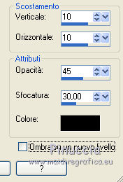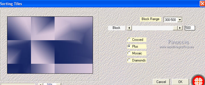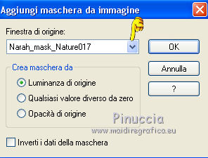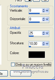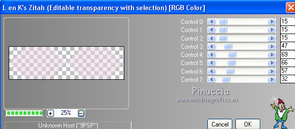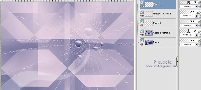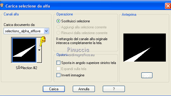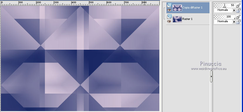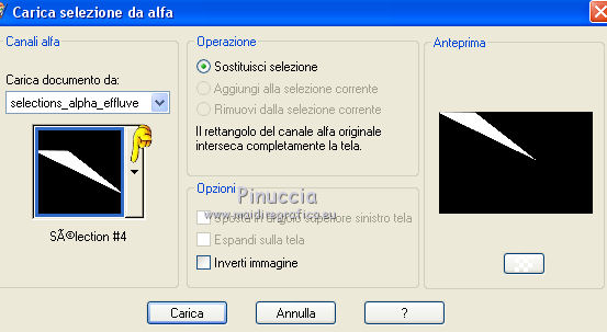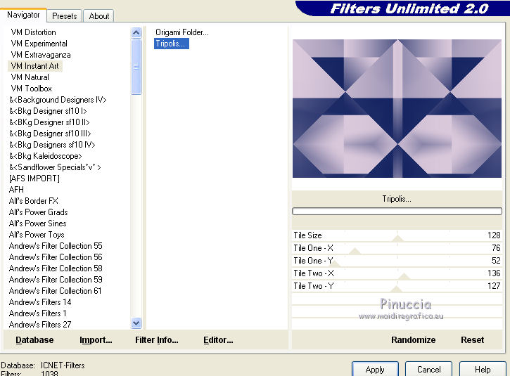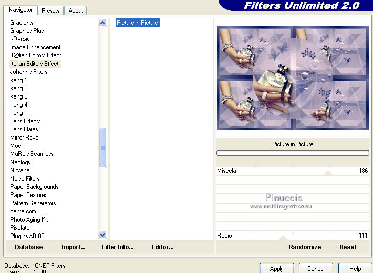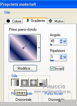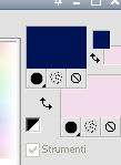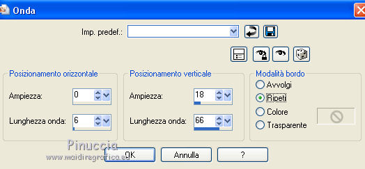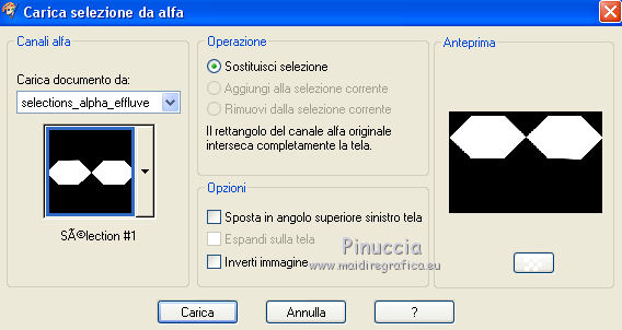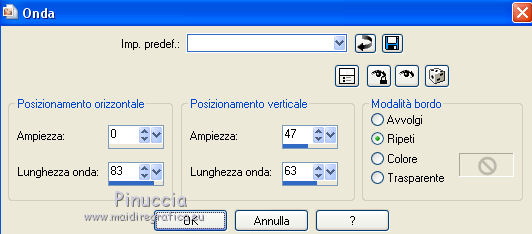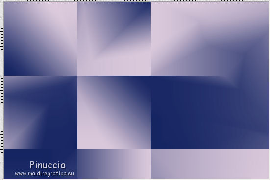 qui puoi trovare qualche risposta ai tuoi dubbi. Se l'argomento che ti interessa non è presente, ti prego di segnalarmelo. Questo tutorial è stato creato con CorelX6, ma può essere realizzato anche con le altre versioni di PSP. Dalla versione X4, il comando Immagine>Rifletti è stato sostituito con Immagine>Capovolgi in orizzontale, e il comando Immagine>Capovolgi con Immagine>Capovolgi in verticale. Nelle versioni X5 e X6, le funzioni sono state migliorate rendendo disponibile il menu Oggetti. Vedi la scheda sull'argomento qui Per tradurre questo tutorial ho usato PSP X. Occorrente: Materiale qui Il tube della donna è di Tocha. Filtri in caso di dubbi, ricorda di consultare la mia sezione filtri qui Filters Unlimited 2.0 qui L&K's - L&K's Zitah qui Mehdi - Sorting Tiles qui Italian Editors Effect - Picture in Picture qui VM Instant Art - Tripolis qui I filtri Italian Editors e VM Instant Art si possono usare da soli o importati in Filters Unlimited (come fare vedi qui) Se un filtro fornito appare con questa icona ![]() Se utilizzi altri tubes e/o altri colori, puoi sperimentare le modalità di miscelatura e opacità più adatte. Apri pinceau1041, deco_@qua_47 e deco_@qua_pap in PSP ed esportali come pennelli personalizzati. (File>Esporta>Pennello personalizzato, assegna un nome al pennello e ok) Vedi gli appunti sui pennelli qui Apri la maschera in PSP e minimizzala con il resto del materiale. 1. Imposta il colore di primo piano con #011455, e il colore di sfondo con #f3ddea. ![]() Passa il colore di primo piano a Gradiente di primo piano/sfondo, stile Lineare. ![]() 2. Apri selections_alpha_effluve. Duplica l'immagine usando la combinazione di tasti maiuscola+D. Chiudi l'originale e lavora sulla copia. L'immagine non è vuota, ma contiene le selezioni salvate sul canale alfa. Rinomina il livello Raster 1. 3. Riempi l'immagine trasparente con il gradiente.4. Regola>Sfocatura>Sfocatura gaussiana - raggio 40. ![]() 5. Effetti>Plugins>Mehdi - Sorting Tiles. ![]() Risultato. ![]() 6. Livelli>Duplica. Effetti>Plugins>Filters Unlimited 2.0 - VM Instant Art - Tripolis. ![]() Abbassa l'opacità di questo livello al 50%. ![]() 7. Livelli>Nuovo livello raster. Selezione>Carica/Salva selezione>Carica selezione da canale alfa. La selezione selection#1 è subito disponibile. Devi soltanto cliccare Carica. ![]() 8. Imposta l'opacità dello strumento Riempimento a 50 ![]() Riempi la selezione con il colore di sfondo #f3ddea (tasto destro del mouse).9. Effetti>Plugins>L&K's - L&K's Zitah. ![]() Effetti>Effetti di bordo>Aumenta di più. Selezione>Deseleziona. 10. Effetti>Effetti di immagine>Motivo unico. ![]() 11. Livelli>Nuovo livello raster. Riporta l'opacità dello strumento Riempimento a 100 ![]() Riempi il livello con il colore di sfondo #f3ddea.12. Livelli>Nuovo livello maschera>Da immagine. Apri il menu sotto la finestra di origine e vedrai la lista dei files aperti. Seleziona la maschera Narah_mask_Nature017, con i seguenti settaggi. ![]() Livelli>Unisci>Unisci gruppo. 13. Livelli>Nuovo livello raster. Selezione>Carica/Salva selezione>Carica selezione da canale alfa. Apri il menu delle selezioni e carica selection#2. ![]() Imposta il colore di primo piano con il colore bianco #ffffff. Imposta nuovamente l'opacità dello strumento Riempimento a 50 ![]() Riempi la selezione con il colore bianco.Selezione>Deseleziona. 14. Effetti>Effetti di distorsione>Onda. ![]() Abbassa l'opacità di questo livello al 50%. ![]() 15. Livelli>Nuovo livello raster. Selezione>Carica/Salva selezione>Carica selezione da canale alfa. Apri il menu delle selezioni e carica selection#3. ![]() Riempi la selezione con il colore bianco, opacità 50 Selezione>Deseleziona. 16. Effetti>Effetti di distorsione>Onda. ![]() 17. Livelli>Nuovo livello raster. Selezione>Carica/Salva selezione>Carica selezione da canale alfa. Apri il menu delle selezioni e carica selection#4. ![]() Riempi la selezione con il colore bianco, opacità 50 Selezione>Deseleziona. 18. Effetti>Effetti di distorsione>Onda. ![]() 19. Livelli>Unisci>Unisci giù - 2 volte. Effetti>Effetti 3D>Sfalsa ombra. ![]() 20. Livelli>Nuovo livello raster. Riporta il colore di primo piano al colore iniziale #011455. ![]() Attiva lo strumento Pennello ,cerca e seleziona il pennello 1041, dimensione 100. ![]() Applica il pennello al centro della tela di ragno, cliccando con il tasto sinistro del mouse, per usare il colore di primo piano (se necessario, clicca più volte per rinforzare il colore) ![]() 21. Cerca e seleziona il pennello deco_@qua_47 ![]() e applicalo in basso al centro della tela di ragno, come nell'esempio, sempre con il colore di primo piano. ![]() 22. Cambia la rotazione del pennello a 180 gradi ![]() Livelli>Nuovo livello raster. Applica il pennello, sempre con il colore di primo piano, come nell'esempio. ![]() 23. Cerca e seleziona il pennello deco_@qua_pap ![]() e applicalo in alto a sinistra, come nell'esempio, con il colore di primo piano. ![]() 24. Apri il tube Tocha23595 e vai a Modifica>Copia. Torna al tuo lavoro e vai a Modifica>Incolla come nuovo livello. Immagine>Ridimensiona, all'80%, tutti i livelli non selezionato. Spostalo nell'angolo in alto a sinistra.25. Effetti>Effetti 3D>Sfalsa ombra. ![]() 26. Immagine>Aggiungi bordatura, 2 pixels, simmetriche, colore bianco #ffffff. Immagine>Aggiungi bordatura, 35 pixels, simmetriche, con il colore di primo piano #011455. 27. Attiva lo strumento Bacchetta magica ![]() ![]() e clicca nel bordo da 35 pixels per selezionarlo. Passa il colore di primo piano al Gradiente iniziale. ![]() Riporta l'opacità dello strumento Riempimento a 100, e riempi la selezione con il gradiente.28. Effetti>Plugins>Filters Unlimited 2.0 - Italian Editors Effect - Picture in Picture. ![]() 29. Selezione>Inverti. Effetti>Effetti 3D>Sfalsa ombra, colore nero. ![]() Selezione>Deseleziona. 30. Immagine>Aggiungi bordatura, 2 pixels, simmetriche, con il colore bianco #ffffff. 21. Firma il tuo lavoro, ridimensiona se vuoi, e salva i