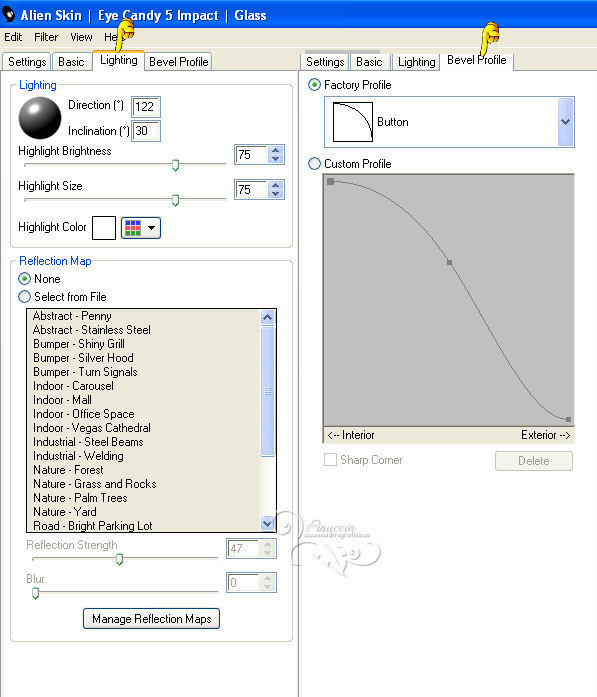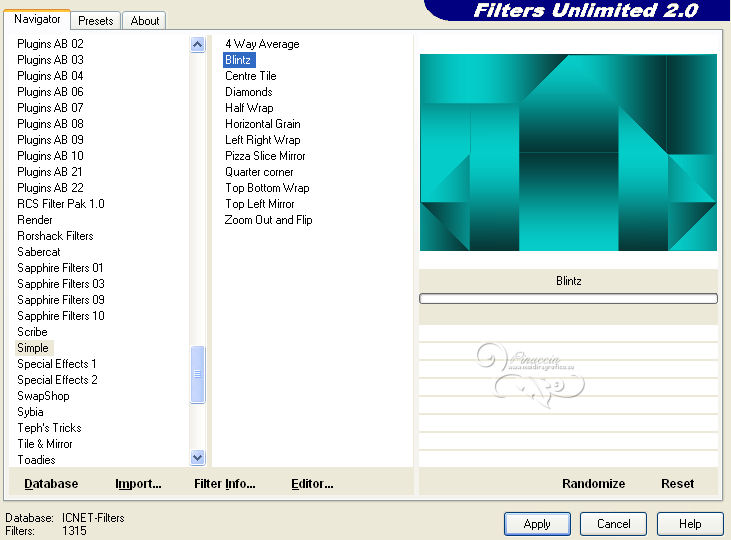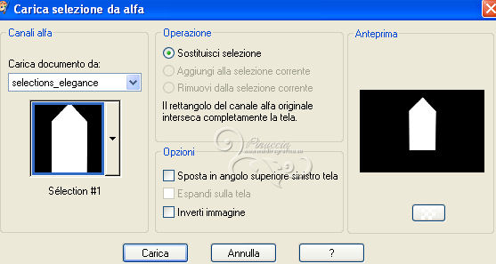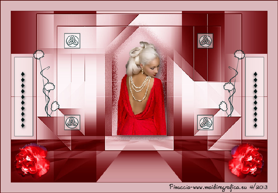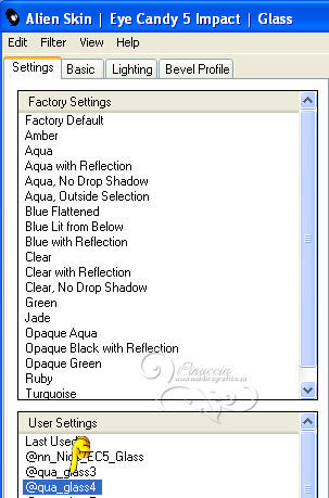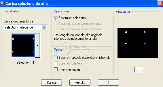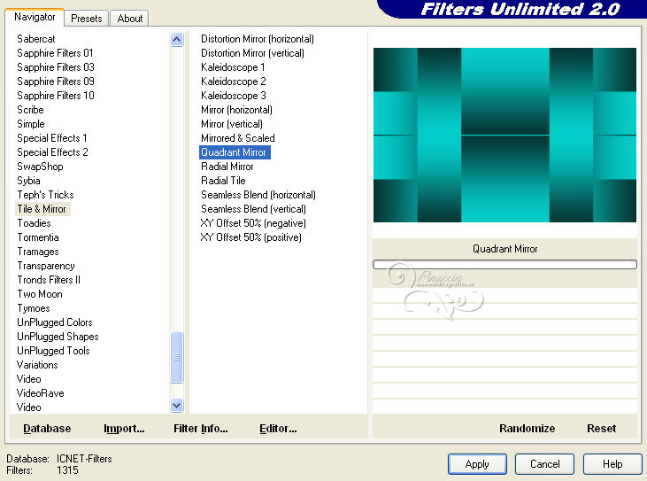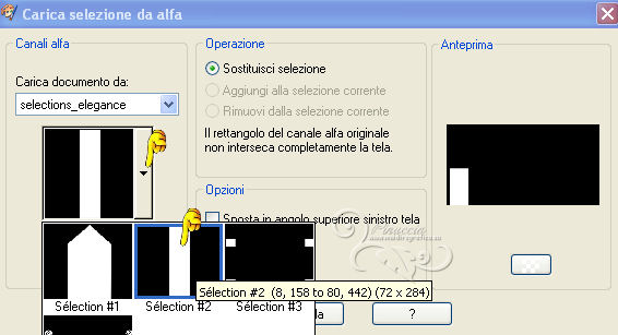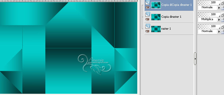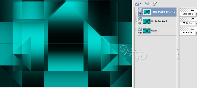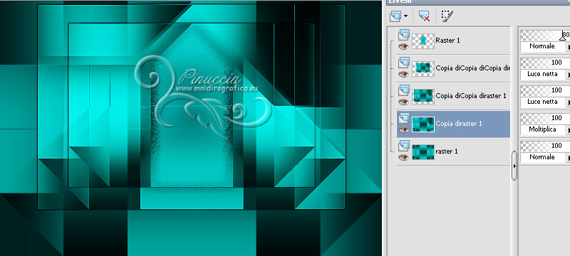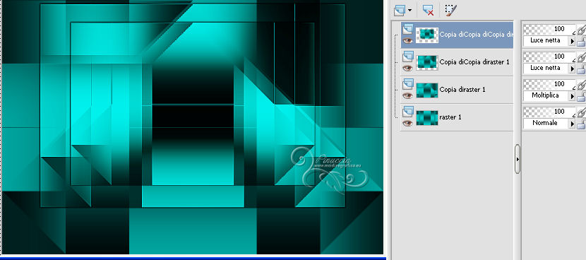 qui puoi trovare qualche risposta ai tuoi dubbi. Se l'argomento che ti interessa non è presente, ti prego di segnalarmelo. Questo tutorial è stato creato con CorelX3, ma può essere realizzato anche con le altre versioni di PSP. Per tradurlo ho usato PSP X. Occorrente: Materiale qui Per il tube della donna grazie Gabry. Per il tube del fiore grazie Saturnella. Il fiore stilizzato è di Aquarellice. Filtri in caso di dubbi, ricorda di consultare la mia sezione filtri qui Filters Unlimited 2.0 qui Simple - Blintz qui Toadies - Blur'em! qui Mura's Meister - Perspective Tiling qui Alien Skin Eye Candy 5 Impact - Glass qui I filtri Simple e Toadies si possono usare da soli o importati in Filters Unlimited ![]() Metti il preset Cliccando sul file una o due volte (a seconda delle tue impostazioni), automaticamente il preset si installerà nella cartella corretta. perchè uno o due clic vedi qui Metti @qua_losange nella cartella Linee di stile. Se utilizzi altri tubes e/o altri colori, puoi sperimentare le modalità di miscelatura e opacità più adatte. 1. Imposta il colore di primo piano con #04ccc8, e il colore di sfondo con #072928. ![]() 2. Apri selections_elegance. Duplica l'immagine usando la combinazione di tasti maiuscola+D. Chiudi l'originale e lavora sulla copia. L'immagine non è vuota, ma contiene le selezioni salvate sul canale alfa. Rinomina il livello Raster 1. 3. Effetti>Plugins>Mehdi - Wavy Lab - Linear: Il filtro lavora con i colori impostati nella paletta dei materiali, il primo colore è quello di sfondo, il secondo quello di primo piano, lascia il terzo colore che il filtro crea in base ai colori della paletta. ![]() 4. Effetti>Plugins>Mehdi - Sorting Tiles. ![]() 5. Effetti>Plugins>Filters Unlimited 2.0 - Tile & Mirror - Quadrant Mirror. ![]() 6. Livelli>Duplica. Effetti>Plugins>Filters Unlimited 2.0 - Simple - Blintz. ![]() Cambia la modalità di miscelatura di questo livello in Moltiplica. se la tua paletta si presenta con il riquadro a destra, non occorre attivare il livello per cambiare le proprietà. Altrimenti, attiva il livello per cambiare la modalità di miscelatura ![]() 7. Assicurati di essere posizionato sul livello superiore. Immagine>Ridimensiona, all'80%, tutti i livelli non selezionato. Effetti>Effetti di immagine>Scostamento. ![]() 8. Selezione>Seleziona tutto. Selezione>Mobile. Selezione>Modifica>Seleziona bordature selezione. ![]() Riempi la selezione con il colore scuro di sfondo #072928.(ingrandisci l'immagine per visualizzare meglio lo spazio da riempire, attivando lo strumento Zoom o usando la rotellina del mouse).Selezione>Deseleziona. 9. Cambia la modalità di miscelatura di questo livello in Luce netta. ![]() Regola>Messa a fuoco>Accentua messa a fuoco. 10. Livelli>Duplica. Immagine>Ridimensiona, all'80%, tutti i livelli non selezionato. 11. Effetti>Effetti d immagine>Scostamento. ![]() Dovresti avere questo. ![]() 12. Selezione>Carica/Salva selezione>Carica selezione da canale alfa. La selezione Selection#1 è subito disponibile. Devi soltanto cliccare Carica. ![]() 13. Livelli>Nuovo livello raster. Effetti>Plugins>Mehdi - Wavy Lab - Magnetic, con i settaggi standard. ![]() 14. Regola>Sfocatura>Sfocatura gaussiana - raggio 10. ![]() 15. Selezione>Modifica>Seleziona bordature selezione. ![]() Riempi con il colore scuro #072928.Selezione>Deseleziona. 16. Effetti>Plugins>Toadies - Blur'em, con i settaggi standard. ![]() Abbassa l'opacità di questo livello all'80%. 17. Attiva il livello copia di Raster 1. ![]() 18. Effetti>Plugins>Mura's Meister - Perspective Tiling 1.1. ![]() 19. Attiva nuovamente il livello superiore. Livelli>Nuovo livello raster. Selezione>Carica/Salva selezione>Carica selezione da canale alfa. Apri il menu delle selezioni e carica Selection#2. ![]() Riempi la selezione con il colore scuro #072928.20. Selezione>Modifica>Contrai - 2 pixels. ![]() Premi sulla tastiera il tasto CANC ![]() 21. Imposta il colore di primo piano con il colore bianco. ![]() Imposta l'opacità dello strumento riempimento a 50 ![]() Riempi la selezione con il colore bianco #ffffff.Selezione>Deseleziona. 22. Inverti i colori nella paletta, in modo che il colore scuro passi a colore di primo piano. ![]() 23. Attiva lo strumento Penna ![]() linea di stile @qua_losange ![]() larghezza 10 pixels ![]() 24. Traccia una linea verticale a 40 pixels di larghezza, iniziando a 200 pixels di altezza ricorda che puoi sempre controllare la posizione nella barra inferiore ![]() fino a 410 pixels. ![]() Eventualmente, se hai difficoltà, scendi anche oltre i 410 pixels, e cancella le parti eccedenti della linea. ![]() Livelli>Converti in livello raster. 25. Effetti>Plugins>Alien Skin Eye Candy 5 Impact - Glass. Seleziona il preset @qua_glass4 e, sotto Basic, imposta Glass Color con il colore bianco. ![]() in caso di problemi con il preset, puoi impostare manualmente i settaggi che vedi nelle schermate. ![]() 26. Livelli>Unisci>Unisci giù. Livelli>Duplica. Immagine>Rifletti. 27. Livelli>Nuovo livello raster. Selezione>Carica/Salva selezione>Carica selezione da canale alfa. Apri il menu delle selezioni e carica Selection#3. ![]() Riporta l'opacità dello strumento Riempimento a 100 e riempi la selezione con il colore scuro #072928.Selezione>Modifica>Contrai - 2 pixels. ![]() Premi sulla tastiera il tasto CANC. 28. Riporta l'opacità dello strumento Riempimento a 50 e riempi la selezione con il colore bianco #ffffff.Selezione>Deseleziona. 29. Livelli>Nuovo livello raster. Selezione>Carica/Salva selezione>Carica selezione da canale alfa. Apri il menu delle selezioni e carica Selection#4. ![]() Riporta l'opacità dello strumento Riempimento a 100 e riempi la selezione con il colore scuro #072928.Selezione>Modifica>Contrai - 2 pixels. ![]() Premi sulla tastiera il tasto CANC. Riporta l'opacità dello strumento Riempimento a 50 se imposti la modalità di corrispondenza in Nessuno ti basterà un solo clic per riempire ![]() Fiempi la selezione con il colore bianco #ffffff.Selez