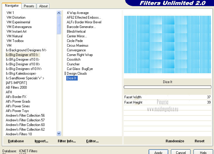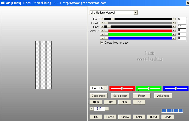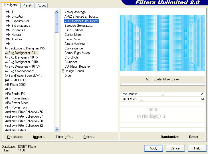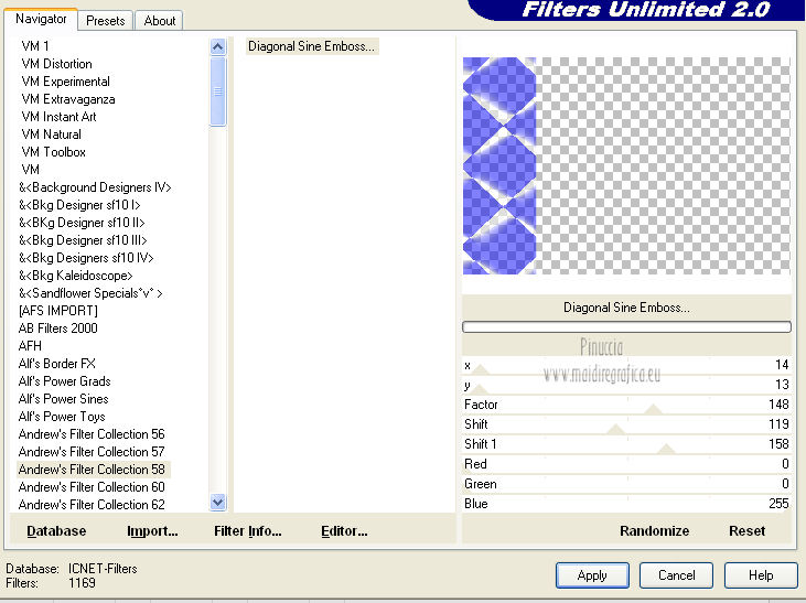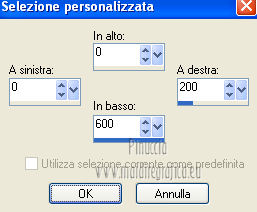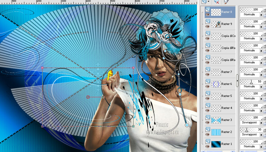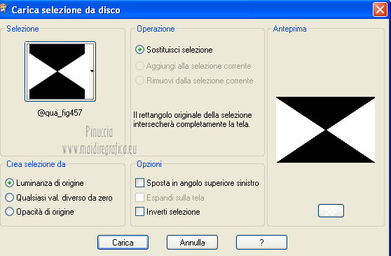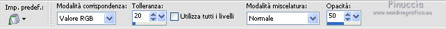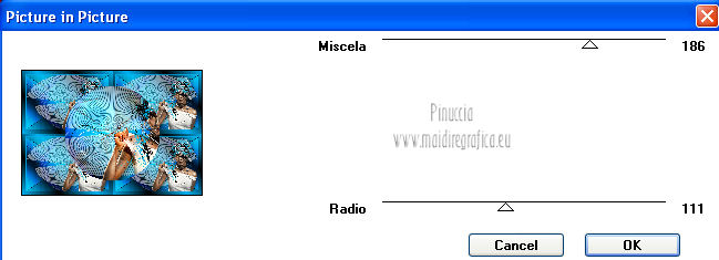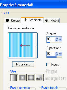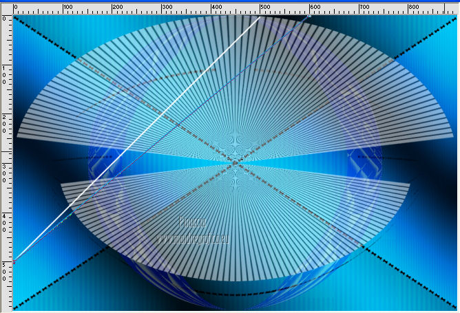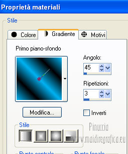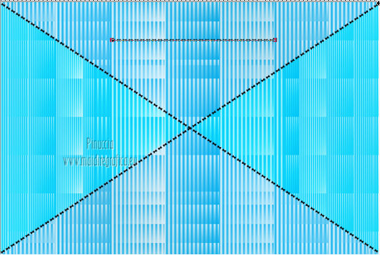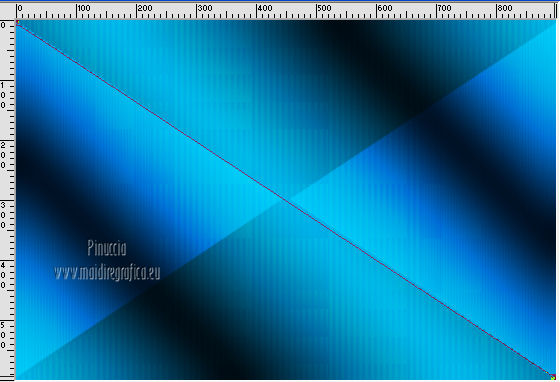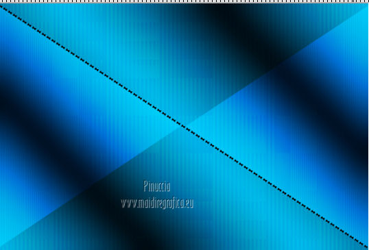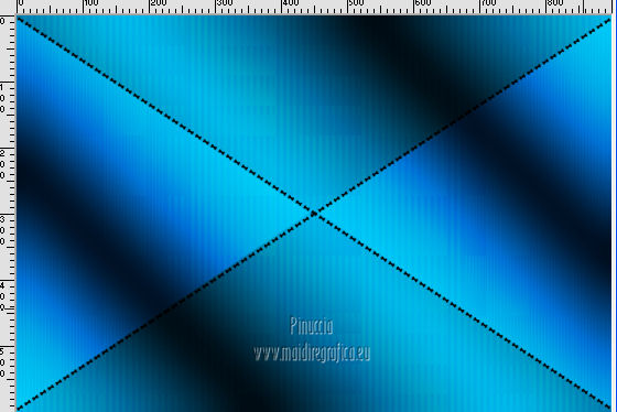 qui puoi trovare qualche risposta ai tuoi dubbi. Se l'argomento che ti interessa non è presente, ti prego di segnalarmelo. Questo tutorial è stato creato con PSP X3, ma può essere eseguito anche con le altre versioni di PSP. Per tradurlo, ho usato PSP X. Occorrente: Materiale qui Per il tube della donna grazie Nicole (Bambou) Lascia intatto il nome del tube. Il © appartiene all'artista originale. Mantieni il credito di chi ha creato il tube. Filtri in caso di dubbi, ricorda di consultare la mia sezione filtri qui Filters Unlimited 2.0 qui &<Bkg Designer sf10I> qui Andrew's Filter 58 qui Ap Lines - Lines SilverLining qui It@lian Editors Effects qui ![]() Metti @qua33 nella cartella Linee di stile. Metti la selezione nella cartella Selezioni. 1. Imposta il colore di primo piano con #00b1f1, e il colore di sfondo con il colore nero #000000. Passa il colore di primo piano a Gradiente, stile Lineare. ![]() 2. Apri una nuova immagine trasparente 900 x 600 pixels, e riempila con il gradiente.3. Regola>Sfocatura>Sfocatura gaussiana - raggio 30. ![]() 4. Livelli>Nuovo livello raster. Imposta il colore di sfondo con il colore bianco, e cambia i settaggi del Gradiente. ![]() Riempi il nuovo livello con il gradiente.5. Effetti>Plugins>Filters Unlimited 2.0 - &<Bkg Designer sf10I> - DiceIt. ![]() 6. Effetti>Plugins>Filters Unlimited 2.0 - &<Bkg Designer sf10I> - Alf's Border Mirror Bevel. ![]() 7. Cambia la modalità di miscelatura di questo livello in Sovrapponi, e abbassa l'opacità al 30%. 8. Livelli>Nuovo livello raster. Selezione>Carica/Salva selezione>Carica selezione da disco. Cerca e carica la selezione @fig457. ![]() Riporta il colore di primo piano al colore blu e imposta l'opacità dello strumento Riempimento a 50.![]() ![]() Con la modalità di corrispondenza impostata in Nessuno, basterà un solo clic per riempire le selezioni. Con la modalità di corrispondenza impostata in Valore RGB, dovrai cliccare su ogni selezione per riempirle. Riempi le selezioni con il colore di primo piano.Selezione>Deseleziona. Cambia la modalità di miscelatura di questo livello in Sovrapponi. 9. Attiva lo strumento Penna ![]() linea di stile @qua33 - larghezza 3. ![]() Imposta il colore di primo piano con il colore nero e traccia due linee diagonali come nel mio esempio. Per ottenere delle linee perfettamente diritte, in questo caso, trattandosi di linee diagonali non è possibile usare il tasto della maiuscola. Un buon sistema è di cliccare sul punto di partenza della linea ![]() dopo aver cliccato vedrai un piccolo quadretto. Poi clicca sul punto di arrivo ![]() e la linea si traccerà da sola ![]() Clicca sul segno di spunta nella barra superiore degli strumenti ![]() e avrai la linea ben visibile. ![]() Allo stesso modo - sullo stesso livello vettore - traccia la seconda diagonale. ![]() Livelli>Converti in livello raster. 10. Sempre con il colore nero, traccia una linea in alto, questa volta tenendo premuto il tasto della maiuscola per visualizzare meglio l'esempio, ho momentaneamente riportato a Normale il livello Raster 2. Se fai la stessa cosa, non dimenticare di riportare i settaggi a Sovrapponi, opacità 30 ![]() e una linea in basso ![]() Livelli>Converti in livello raster. 11. Effetti>Effetti di riflesso>Fuga di specchi. ![]() 12. Livelli>Duplica. Immagine>Rifletti. Livelli>Unisci>Unisci giù. 13. Effetti>Effetti geometrici>Sfera. ![]() 14. Effetti>Effetti geometrici>Cerchio. ![]() 15. Di nuovo Effetti>Effetti geometrici>Sfera, con i settaggi precedenti. ![]() 16. Livelli>Nuovo livello raster. Attiva lo strumento Selezione ![]() clicca sull'icona Selezione personalizzata ![]() e imposta i seguenti settaggi. ![]() Riempi la selezione con il colore blu, opacità 50.17. Effetti>Plugins>AP Lines - SilverLining. ![]() Selezione>Deseleziona. 18. Effetti>Plugins>Filters Unlimited 2.0 - Andrew's Filter Collection 58 - Diagonal Sine Emboss. ![]() 19. Livelli>Duplica. Immagine>Rifletti. Livelli>Unisci>Unisci giù. 34. Effetti>Effetti geometrici>Sfera, con i settaggi precedenti. Effetti>Effetti geometrici>Cerchio, con i settaggi precedenti. Abbassa l'opacità di questo livello al 50%. ![]() 35. Livelli>Nuovo livello raster. Selezione personalizzata ![]() con i settaggi precedenti. ![]() 36. Imposta il colore di primo piano con il colore bianco, e riempi la selezione con il colore bianco, opacità 50.37. Effetti>Plugins>AP Lines - Lines SilverLining, con i settaggi precedenti. Selezione>Deseleziona. 38. Livelli>Duplica. Immagine>Rifletti. Livelli>Unisci>Unisci giù. 39. Effetti>Effetti di distorsione>Coordinate polari. ![]() 40. Livelli>Duplica. Immagine>Capovolgi. 41. Immagine>Ridimensiona, all'80%, tutti i livelli non selezionato. 42. Attiva nuovamente lo strumento Penna ,linea di stile Pieno, larghezza 3 e traccia una linea bianca cominciando in basso a sinistra a 500 pixels, fino a 500 pixels di larghezza ![]() poi traccia un'altra linea con il colore blu, sempre partendo dal basso a 500 pixels fino a 600 pixels di larghezza ![]() e infine una terza linea di colore nero, sempre partendo dal basso a 500 pixels fino a 700 pixels di larghezza. ![]() Livelli>Converti in livello raster. 43. Effetti>Effetti di distorsione>Coordinate polari, con i settaggi precedenti. ![]() Modifica>Ripeti Coordinate polari. Risultato. ![]() 44. Livelli>Duplica. Immagine>Capovolgi. Immagine>Ridimensiona, al 50%, tutti i livelli non selezionato. Spostalo in alto a sinistra.![]() 45. Livelli>Duplica. Immagine>Capovolgi. Immagine>Rifletti. Spostalo sotto il precedente.![]() 46. Apri il tube Nicole-abstrait6-2012 e vai a Modifica>Copia. Torna al tuo lavoro e vai a Modifica>Incolla come nuovo livello. Immagine>Ridimensiona, all'80%, tutti i livelli non selezionato. Spostalo a destra.47. Effetti>Effetti 3D>Sfalsa ombra. ![]() 48. Per il mio esempio ho portato il livello Raster 8 in cima alla paletta, e ho spostato la forma un po' più a sinistra, nella mano della donna. ![]() 49. Immagine>Aggiungi bordatura, 2 pixels, simmetrich