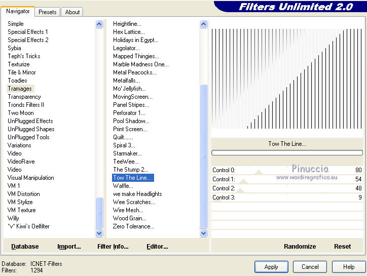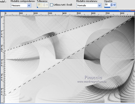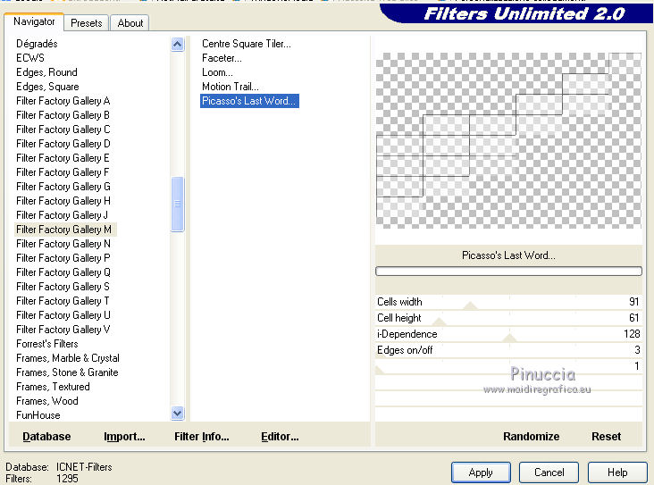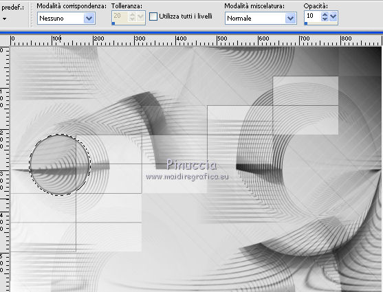 qui puoi trovare qualche risposta ai tuoi dubbi. Se l'argomento che ti interessa non è presente, ti prego di segnalarmelo. Questo tutorial è stato creato con CorelX7, ma può essere realizzato anche con le altre versioni di PSP. Dalla versione X4, il comando Immagine>Rifletti è stato sostituito con Immagine>Capovolgi in orizzontale, e il comando Immagine>Capovolgi con Immagine>Capovolgi in verticale. Nelle versioni X5 e X6, le funzioni sono state migliorate rendendo disponibile il menu Oggetti. Con la nuova versione X7, sono tornati Rifletti/Capovolgi, ma con nuove funzioni. Vedi la scheda sull'argomento qui Per tradurre questo tutorial ho usato PSP X. Occorrente: Materiale qui Per il tube della donna grazie Babette. Filtri in caso di dubbi, ricorda di consultare la mia sezione filtri qui Filters Unlimited 2.0 qui Mehdi - Sorting Tiles qui Flaming Pear - Flexify 2 qui Alien Skin Eye Candy 5 Impact - Glass qui Tramages - Tow the lines qui Filter Factory Gallery M - Picasso's last word qui L&K's - L&K's Paris qui I filtri Tramages e Factory Gallery si possono usare da soli o importati in Filters Unlimited (come fare vedi qui) Se un filtro fornito appare con questa icona ![]() Se utilizzi altri tubes e/o altri colori, puoi sperimentare le modalità di miscelatura e opacità più adatte. Metti il preset Cliccando sul file una o due volte (a seconda delle tue impostazioni), automaticamente il preset si installerà nella cartella corretta. perchè uno o due clic vedi qui Metti il pennello nella cartella Pennelli. Attenzione, il pennello è composto da due files che non devono essere separati. Vedi gli appunti sui pennelli qui 1. Imposta il colore di primo piano con #f6f6f6, e il colore di sfondo con il colore nero #000000. ![]() 2. Apri selections_alpha_forever. Duplica l'immagine usando la combinazione di tasti maiuscola+D, ![]() oppure Modifica>Copia/Modifica>Incolla come nuova immagine. Chiudi l'originale e lavora sulla copia. L'immagine non è vuota, ma contiene le selezioni salvate sul canale alfa. 3. Riempi l'immagine trasparente con il colore chiaro di primo piano #f6f6f6.4. Effetti>Plugins>Filters Unlimited 2.0 - Tramages - Tow the line, con i settaggi standard. ![]() 5. Effetti>Effetti di immagine>Motivo unico. ![]() 6. Dovresti avere questo: ![]() 7. Effetti>Plugins>Mehdi - Sorting Tiles. ![]() 8. Effetti>Plugins>Flaming Pear - Flexify 2. ![]() 9. Premi il tasto K per attivare lo strumento Puntatore ![]() se stai usando PSP 9 il tasto D per attivare lo strumento Deformazione ![]() in modalità Scala ,