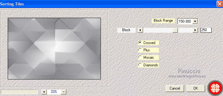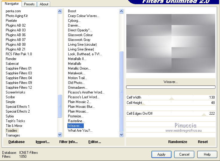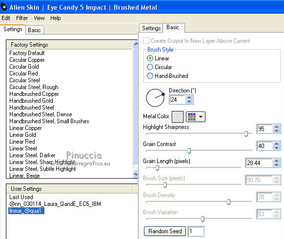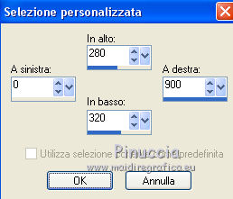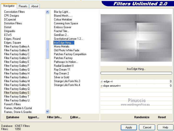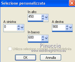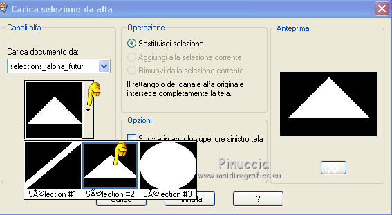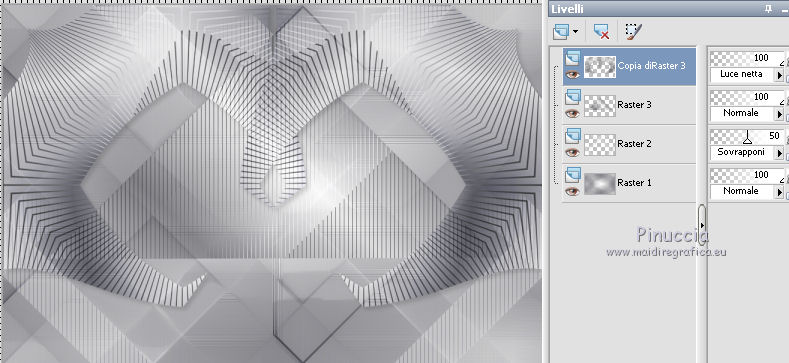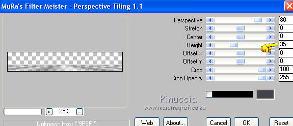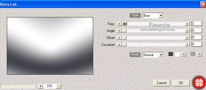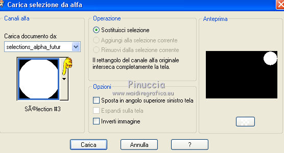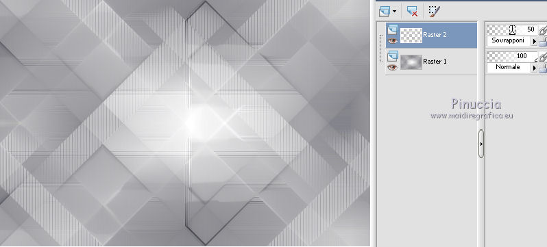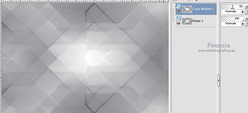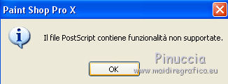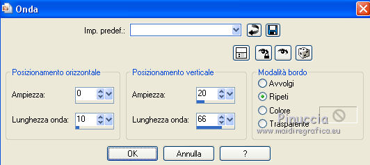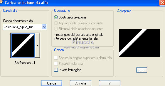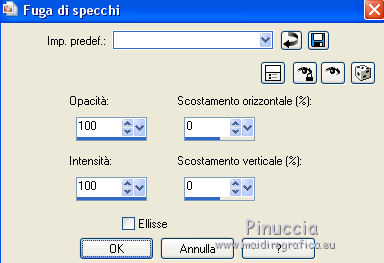 qui puoi trovare qualche risposta ai tuoi dubbi. Se l'argomento che ti interessa non è presente, ti prego di segnalarmelo. Questo tutorial è stato creato con CorelX6, ma può essere realizzato anche con le altre versioni di PSP. Dalla versione X4, il comando Immagine>Rifletti è stato sostituito con Immagine>Capovolgi in orizzontale, e il comando Immagine>Capovolgi con Immagine>Capovolgi in verticale. Nelle versioni X5 e X6, le funzioni sono state migliorate rendendo disponibile il menu Oggetti. Vedi la scheda sull'argomento qui Per tradurre questo tutorial ho usato PSP X. Occorrente: Materiale qui Il tube utilizzato è un tube esclusivo di Maelle. Filtri in caso di dubbi, ricorda di consultare la mia sezione filtri qui Filters Unlimited 2.0 qui Filter Factory Gallery S - Itsa Edge thing qui Tramages - Tow the line qui Mehdi - Wavy lab, Sorting Tiles qui Flaming Pear - Flexify 2 qui Alien Skin Eye Candy 5 Impact - Brushed Metal qui Mura's Meister - Perspective Tiling qui I filtri Filter Factory Gallery e Tramages si possono usare da soli o importati in Filters Unlimited (come fare vedi qui) Se un filtro fornito appare con questa icona ![]() Se utilizzi altri tubes e/o altri colori, puoi sperimentare le modalità di miscelatura e opacità più adatte. Metti il preset Cliccando sul file una o due volte (a seconda delle tue impostazioni), automaticamente il preset si installerà nella cartella corretta. perchè uno o due clic vedi qui 1. Imposta il colore di primo piano con #ffffff, e il colore di sfondo con #43434b. ![]() 2. Apri selections_alpha_futur. Aprendo il file, avrai questo messaggio. Non preoccuparti. Clicca ok e il file si aprirà regolarmente. ![]() Duplica l'immagine usando la combinazione di tasti maiuscola+D. Chiudi l'originale e lavora sulla copia. L'immagine non è vuota, ma contiene le selezioni salvate sul canale alfa. Rinomina il livello Raster 1. 3. Effetti>Plugins>Mehdi - Wavy Lab. Questo filtro lavora con i colori della paletta dei materiali. Il primo è il colore di sfondo, il secondo quello di primo piano. Mantieni il terzo colore creato dal filtro. ![]() 6. Livelli>Duplica. Immagine>Capovolgi. Abbassa l'opacità di questo livello al 50%. ![]() Livelli>Unisci>Unisci giù. 7. Effetti>Plugins>Filters Unlimited 2.0 - Toadies - Weaver. ![]() 8. Effetti>Plugins>Filter Factory Gallery S - Itsa edge thing, con i settaggi standard. ![]() Effetti>Effetti di bordo>Aumenta. 9. Effetti>Plugins>Mehdi - Sorting Tiles. ![]() 10. Livelli>Duplica. Immagine>Capovolgi. Abbassa l'opacità di questo livello al 50%. ![]() Livelli>Unisci>Unisci giù. 11. Livelli>Nuovo livello raster. Selezione>Carica/Salva selezione>Carica selezione da canale alfa. La selezione sélection#1 è subito disponibile. Devi soltanto cliccare Carica. ![]() 12. Imposta l'opacità dello strumento Riempimento a 50 ![]() Riempi la selezione con il colore bianco di primo piano #ffffff.13. Effetti>Plugins>Filters Unlimited 2.0 - Tramages - Tow the line. ![]() Selezione>Deseleziona. 14. Effetti>Effetti di immagine>Motivo unico, con i settaggi standard. ![]() 15. Livelli>Duplica. Immagine>Rifletti. Livelli>Unisci>Unisci giù. Cambia la modalità di miscelatura di questo livello in Sovrapponi, e abbassa l'opacità al 50%. ![]() 16. Livelli>Nuovo livello raster. Selezione>Carica/Salva selezione>Carica selezione da canale alfa. Apri il menu delle selezioni e carica Selection#2. ![]() 17. Passa il colore di primo piano a Gradiente di primo piano/sfondo, stile Lineare. ![]() Riempi la selezione con il gradiente, opacità sempre 50 18. Effetti>Plugins>Filters Unlimited 2.0 - Tramages - Tow the line. ![]() Selezione>Deseleziona. 19. Livelli>Duplica. Effetti>Plugins>Flaming Pear - Flexify 2. ![]() 20. Effetti>Effetti di Immagine>Scostamento. ![]() 21. Livelli>Duplica. Immagine>Rifletti. Livelli>Unisci>Unisci giù. 22. Effetti>Effetti 3D>Sfalsa ombra. ![]() 23. Cambia la modalità di miscelatura di questo livello in Luce netta. ![]() 24. Attiva il livello Raster 3. Livelli>Disponi>Sposta su. 25. Effetti>Plugins>Flaming Pear - Flexify 2. ![]() 26. Immagine>Capovolgi. Effetti>Effetti di immagine>Scostamento. ![]() 27. Effetti>Effetti 3D>Sfalsa ombra, con i settaggi precedenti. ![]() 28. Livelli>Nuovo livello raster. Attiva lo strumento Selezione ![]() (non importa il tipo di selezione impostato, perchè con la selezione personalizzata si ottiene sempre un rettangolo) clicca sull'icona Selezione personalizzata ![]() e imposta i seguenti settaggi. ![]() 29. Imposta nuovamente il colore di primo piano con il colore bianco, e riempi la selezione con il colore bianco #ffffff, opacità sempre a 50 Selezione>Deseleziona. 30. Effetti>Effetti di distorsione>Onda. ![]() 31. Effetti>Effetti di riflesso>Fuga di specchi. ![]() Risultato. ![]() 32. Effetti>Effetti 3D>Sfalsa ombra, con i settaggi precedenti. ![]() 33. Livelli>Nuovo livello raster. Selezione>Carica/Salva selezione>Carica selezione da canale alfa. Apri il menu delle selezioni e carica Selection#3. ![]() Riporta il colore di primo piano al Gradiente iniziale. ![]() Riempi la selezione con il gradiente lineare, opacità sempre 50 34. Effetti>Plugins>Alien Skin Eye Candy 5 Impact - Brushed Metal. Seleziona il preset linear_@qua e ok. In caso di problemi con il preset puoi impostare manualmente i settaggi che vedi nella schermata. ![]() Selezione>Deseleziona. 35. Effetti>Effetti 3D>Sfalsa ombra, con i settaggi precedenti. ![]() 36. Livelli>nuovo livello raster. Selezione personalizzata ![]() ![]() Riempi la selezione con il gradiente lineare, opacità sempre 50 37. Effetti>Plugins>Mura's Meister - Perspective Tiling 1.1. ![]() Selezione>Deseleziona. Cambia la modalità di miscelatura di questo livello in Sovrapponi. ![]() 38. Effetti>Effetti 3D>Sfalsa ombra. ![]() 39. Apri il tube 2014EXCLUSIF/ MaelleDreams150, e vai a Modifica>Copia. Torna al tuo lavoro e vai a Modifica>Incolla come nuovo livello. 40. Effetti>Effetti di immagine>Scostamento. ![]() 41. Effetti>Effetti 3D>Sfalsa omb