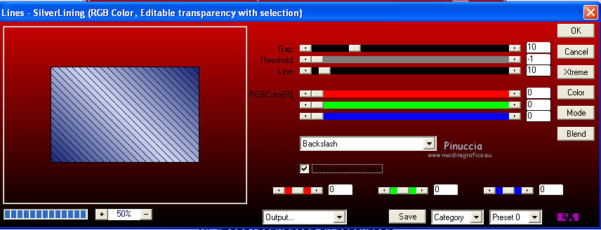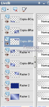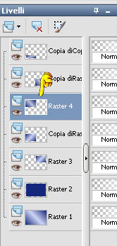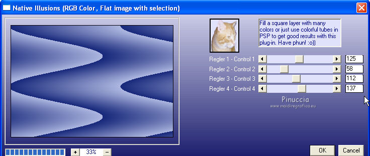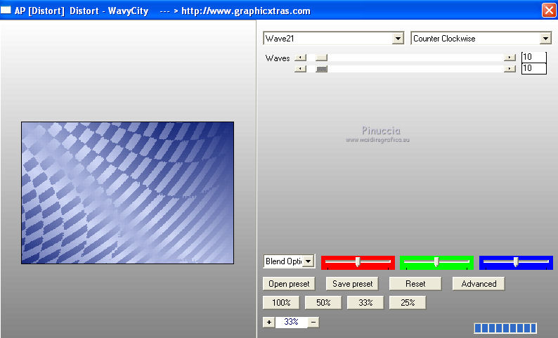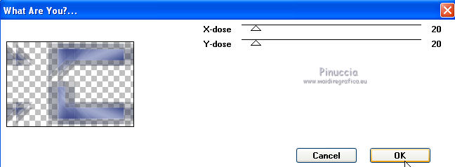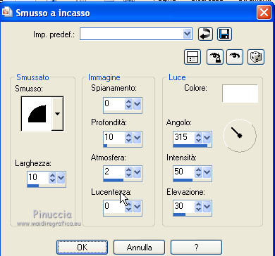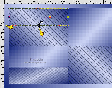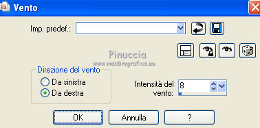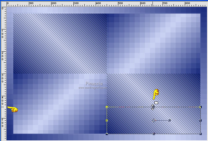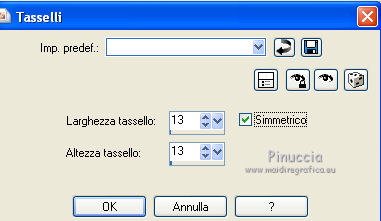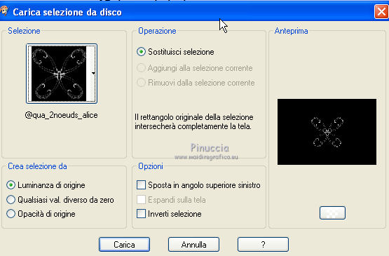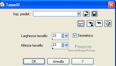 qui puoi trovare qualche risposta ai tuoi dubbi. Se l'argomento che ti interessa non è presente, ti prego di segnalarmelo. Questo tutorial è stato creato con PSP X3, ma può essere eseguito anche con le altre versioni di PSP. Per tradurlo, ho usato PSP X. Occorrente: Materiale qui I tubes sono di Kitty Kouleurs e CréationsAlios. Grazie a tutti i creatori di tubes che con il loro meraviglioso lavoro, permettono di creare questi tutorials. Lascia intatto il nome del tube. Il © appartiene all'artista originale. Mantieni il credito di chi ha creato il tube. Filtri in caso di dubbi, ricorda di consultare la mia sezione filtri qui Toadies - What are you qui AP 01 Innovations - Lines SilverLining/Ap Distort - Wavy City qui Simple qui Backgroundmaniac - Native Illusions qui ![]() Apri il font e minimizzalo. Lo troverai nella lista dei font disponibili quando ti servirà. Metti le selezioni nella cartella Selezioni. 1. Imposta il colore di primo piano con il colore #ced6f6, e il colore di sfondo con il colore #17287b. ![]() Passa il colore di primo piano a Gradiente. ![]() 2. Apri una nuova immagine trasparente 900 x 600 pixels, e riempila con il gradiente.3. Effetti>Effetti di distorsione>Tasselli. ![]() 4. Selezione>Seleziona tutto. Selezione>Modifica>Contrai - 30 pixels. ![]() 5. Livelli>Nuovo livello raster. Riempi con il colore scuro.6. Livelli>Nuovo livello raster. Attiva lo strumento Selezione ,clicca sull'icona Selezione personalizzata ![]() e imposta i seguenti settaggi (la selezione sostituirà quella precedente): ![]() Riempi la selezione con il gradiente.Selezione>Deseleziona. 7. Immagine>Rifletti. 8. Effetti>Effetti di distorsione>Tasselli, con i settaggi precedenti. 9. Livelli>Duplica. Immagine>Rifletti. Immagine>Capovolgi. 10 Selezione personalizzata con i settaggi precedenti:![]() Riempi ancora con il gradiente.11. Effetti>Plugins>AP Innovations - Lines SilverLining. ![]() Selezione>Deseleziona. 12. Livelli>Duplica. Immagine>Rifletti. Immagine>Capovolgi. 13. Livelli>Duplica. 14. Premi il tasto K per attivare lo strumento Puntatore ![]() se stai usando PSP 9 il tasto D (valido per tutte le versioni), per attivare lo strumento deformazione ,e - in modalità Scala - spingi in basso il nodo superiore al centro, fino al 450 pixels. ![]() Immagine>Rifletti. ![]() 15. Attiva il livello Raster 4. ![]() 16. Livelli>Duplica. Tasto K o D e spingi il nodo inferiore centrale fino a 150 pixels. ![]() Immagine>Rifletti. 17. Chiudi gli ultimi quattro livelli (raster 1,2,3 e copia di Raster 3). ![]() Livelli>Unisci>Unisci visibile. 18. Effetti>Plugins>Simple - Pizza Slice Mirror. 19. Effetti>Plugins>Toadies - What are you, con i settaggi standard. ![]() 20. Livelli>Visualizza>Tutto. Livelli>Unisci>Unisci tutto. 21. Immagine>Aggiungi bordatura, 2 pixels, simmetriche, con il colore scuro. Livelli>Innalza livello di sfondo. 22. Immagine>Ridimensiona, all'85%, tutti i livelli non selezionato. 23. Livelli>Nuovo livello raster. 24. Riempi con il gradiente 45/1.Livelli>Disponi>Sposta giù. 25. Effetti>Effetti di distorsione>Tasselli. ![]() 26. Effetti>Plugins>AP Distort - Distort-WavyCity. ![]() 27. Livelli>Duplica. Immagine>Rifletti. Abbassa l'opacità di questo livello al 50%. Livelli>Unisci>Unisci giù. 28. Attiva il livello superiore. Livelli>Nuovo livello raster. Selezione>Carica/Salva selezione>Carica selezione da disco. Cerca e carica la selezione @qua_2noeuds_@alice. ![]() Riempi la selezione con il colore chiaro,cliccando 5 volte per rafforzare il colore. Selezione>Deseleziona. 29. Effetti>Effetti di bordo>Aumenta. 30. Effetti>Effetti 3D>Sfalsa ombra, con il colore nero. ![]() 31. Apri il tube colo2a di Kitty Kouleurs e vai a Modifica>Copia. Torna al tuo lavoro e vai a Modifica>Incolla come nuovo livello. Immagine>Ridimensiona, al 46%, tutti i livelli non selezionato. Posiziona il tube contro i bordi interni.![]() Cambia la modalità di miscelatura di questo livello in Luminanza (Esistente). 32. Effetti>Effetti 3D>Sfalsa ombra. ![]() 33. Apri il tube della donna di CreationsAlios e vai a Modifica>Copia. Torna al tuo lavoro e vai a Modifica>Incolla come nuovo livello. Immagine>Ridimensiona, all'85%, tutti i livelli non selezionato. Sposta il tube a sinistra.34. Effetti>Effetti 3D>Sfalsa ombra. ![]() 35. Attiva lo strumento Testo ![]() font BradleyHand ITC, dimensione 36; colore di sfondo il colore chiaro. ![]() Scrivi il testo e posizionalo. Livelli>Converti in livello raster. Livelli>Duplica. 36. Effetti>Effetti di distorsione>Vento - da destra, intensità 8. ![]() 37. Immagine>Aggiungi bordatura, 2 pixels, simmetriche, con il colore chiaro. Immagine>Aggiungi bordatura, 30 pixels, simmetriche, con il colore scuro. Seleziona il bordo scuro con la bacchetta magica ![]() e riempilo con il gradiente.Effetti>Plugins>Background maniac - Native illusions. ![]() 38. Effetti>Effetti di bordo>Aumenta. 39. Effetti>Effetti 3D>Smusso a incasso. ![]() Selezione>Deseleziona. 40. Immagine>Aggiungi bordatura, 2 pixels, simmetriche, con il colore scuro. 41. Firma il tuo lavoro. Livelli>Unisci>Unisci tutto e salva in formato jpg. ![]() Se hai problemi o dubbi, o trovi un link non funzionante, o anche soltanto per un saluto, scrivimi. 26 Maggio 2012 |