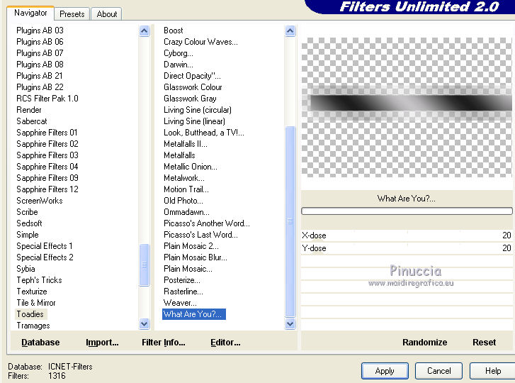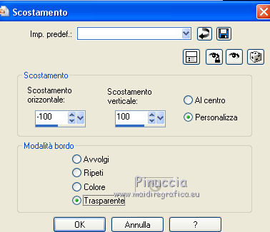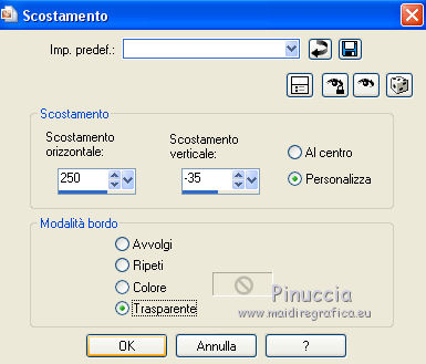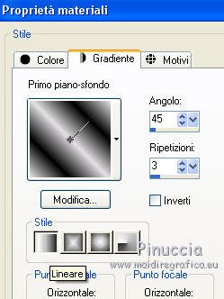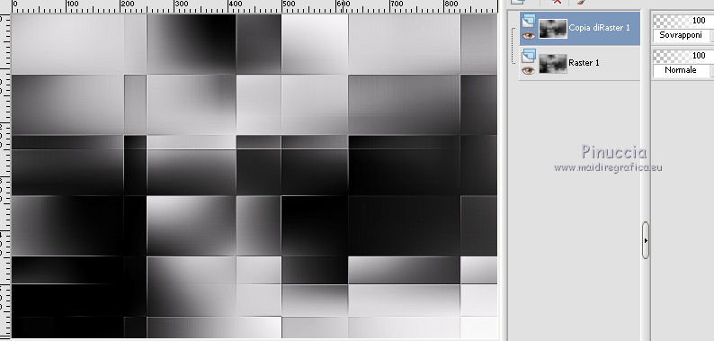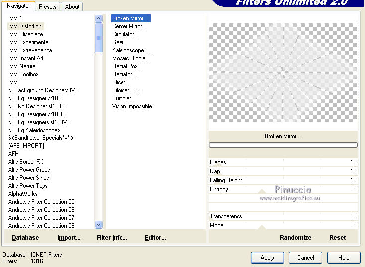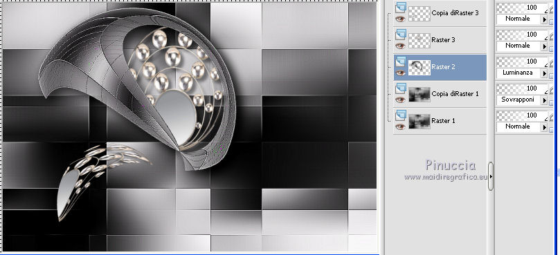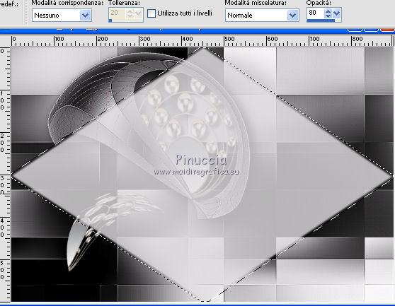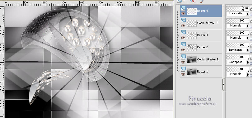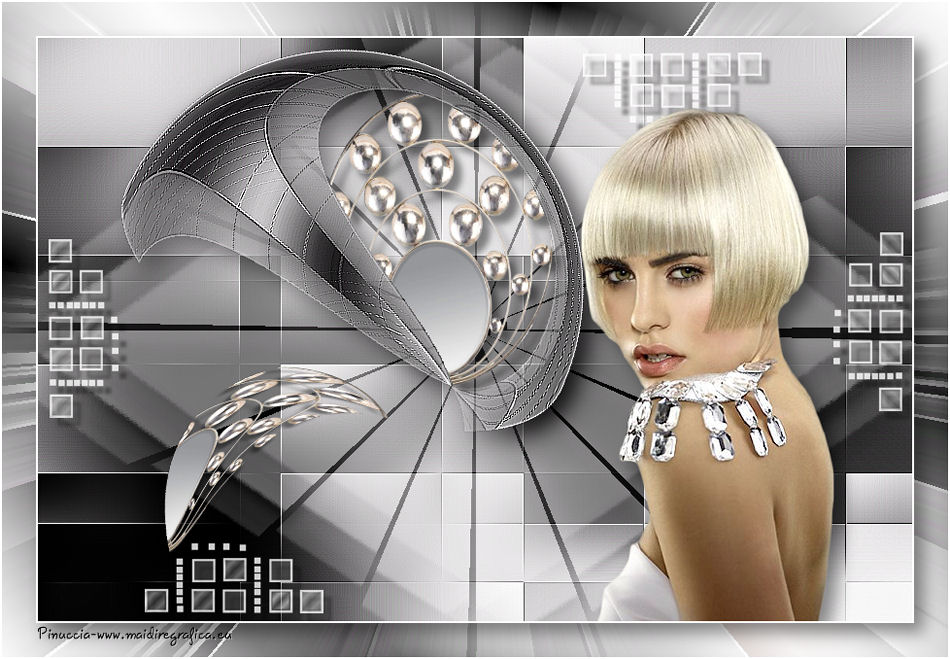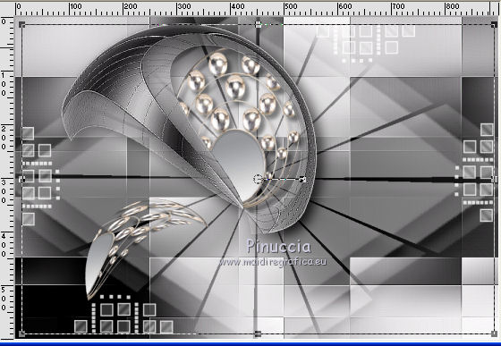 qui puoi trovare qualche risposta ai tuoi dubbi. Se l'argomento che ti interessa non è presente, ti prego di segnalarmelo. Questo tutorial è stato creato con CorelX7, ma può essere realizzato anche con le altre versioni di PSP. Dalla versione X4, il comando Immagine>Rifletti è stato sostituito con Immagine>Capovolgi in orizzontale, e il comando Immagine>Capovolgi con Immagine>Capovolgi in verticale. Nelle versioni X5 e X6, le funzioni sono state migliorate rendendo disponibile il menu Oggetti. Con la nuova versione X7, sono tornati Rifletti/Capovolgi, ma con nuove funzioni. Vedi la scheda sull'argomento qui Per tradurre questo tutorial ho usato PSP X. Occorrente: Materiale qui Per il tube della donna grazie Isabelle P. Filtri in caso di dubbi, ricorda di consultare la mia sezione filtri qui Filters Unlimited 2.0 qui Mehdi - Sorting Tiles qui Flaming Pear - Flexify 2 qui Alien Skin Eye Candy 5 Impact - Glass qui Tramages - Tow the lines qui Filter Factory Gallery M - Picasso's last word qui L&K's - L&K's Paris qui I filtri Tramages e Factory Gallery si possono usare da soli o importati in Filters Unlimited (come fare vedi qui) Se un filtro fornito appare con questa icona ![]() Se utilizzi altri tubes e/o altri colori, puoi sperimentare le modalità di miscelatura e opacità più adatte. Metti il pennello nella cartella Pennelli. Attenzione, il pennello è composto da due files che non devono essere separati. Vedi gli appunti sui pennelli qui 1. Imposta il colore di primo piano con #e3e1e3, e il colore di sfondo con il colore nero #000000. ![]() Passa il colore di primo piano a Gradiente di primo piano/sfondo, stile Lineare. ![]() 2. Apri selections_alpha_geode. Duplica l'immagine usando la combinazione di tasti maiuscola+D, ![]() oppure Modifica>Copia/Modifica>Incolla come nuova immagine. Chiudi l'originale e lavora sulla copia. L'immagine non è vuota, ma contiene le selezioni salvate sul canale alfa. 3. Riempi l'immagine trasparente con il gradiente.4. Effetti>Effetti di immagine>Motivo unico. ![]() 5. Effetti>Plugins>Mehdi - Sorting Tiles. ![]() 6. Effetti>Plugins>Filters Unlimited 2.0 - Toadies - Weaver, con i settaggi standard. ![]() 7. Effetti>Effetti di bordo>Aumenta di più. ![]() 8. Livelli>Duplica. Cambia la modalità di miscelatura di questo livello in Sovrapponi. ![]() 9. Livelli>Nuovo livello raster. Selezione>Carica/Salva selezione>Carica selezione da canale alfa. La selezione sélection#1 è subito disponibile. Devi soltanto cliccare Carica. ![]() Riempi la selezione con il gradiente.Selezione>Deseleziona. 10. Effetti>Plugins>Filters Unlimited 2.0 - Toadies - What are you, con i settaggi standard. ![]() 11. Effetti>Plugins>L&&k's - L&k's Paris, con i settaggi standard. ![]() 12. Effetti>Effetti di bordo>Aumenta di più. 13. Effetti>Plugins>Flaming Pear - Flexify 2. ![]() 14. Immagine>Ridimensiona, al 60%, tutti i livelli non selezionato. Immagine>Ruota per gradi - 25 gradi a destra. ![]() 15. Effetti>Effetti di immagine>Scostamento. ![]() 16. Effetti>Effetti di bordo>Aumenta di più. 17. Livelli>Nuovo livello raster. Selezione>Carica/Salva selezione>Carica selezione da canale alfa. Apri il menu delle selezioni e carica sélection#2. ![]() 18. Apri Décoration28_dhedey, e vai a Modifica>Copia. Torna al tuo lavoro e vai a Modifica>Incolla nella selezione. Selezione>Deseleziona. 19. Effetti>Effetti 3D>Sfalsa ombra. ![]() 20. Livelli>Duplica. Effetti>Plugins>Flaming Pear - Flexify 2, con i settaggi precedenti. ![]() Risultato. ![]() 21. Immagine>Ridimensiona, al 60%, tutti i livelli non selezionato. Effetti>Effetti di immagine>Scostamento. ![]() 22. Attiva il livello Raster 2. ![]() 23. Effetti>Plugins>Alien Skin Eye Candy 5 Impact - Perspective Shadow. Seleziona il preset Drop Shadow Blurry e ok. ![]() 24. Cambia la modalità di miscelatura di questo livello in Luminanza. ![]() 25. Attiva il livello superiore. ![]() 26. Livelli>Nuovo livello raster. Selezione>Carica/Salva selezione>Carica selezione da canale alfa. Apri il menu delle selezioni e carica sélection#3. ![]() Riporta il colore di primo piano a Colore. Abbassa l'opacità dello strumento Riempimento a 80, e riempi la selezione con il colore chiaro #e3e1e3.![]() Selezione>Deseleziona. 27. Effetti>Plugins>Filters Unlimited 2.0 - Toadies - What are you, con i settaggi standard. ![]() 28. Effetti>Plugins>Filters Unlimited 2.0 - VM Distortion - Broken Mirror. ![]() 29. Cambia la modalità di miscelatura di questo livello in Luce netta e abbassa l'opacità al 70%. ![]() 30. Effetti>Effetti 3D>Sfalsa ombra. ![]() 31. Porta questo livello tra il livello Copia di Raster 1 e Raster 2. ![]() 32. Attiva il livello superiore. Livelli>Nuovo livello raster. Imposta il colore di primo piano con il colore bianco #ffffff. 33. Attiva lo strumento Pennello ![]() cerca e seleziona il pennello pinceau_@qua_deco24 ![]() e applicalo al centro dell'immagine, cliccando con il tasto sinistro del mouse, per usare il colore bianco di primo piano. ![]() se il tuo PSP non supporta Pennelli superiori a 500 pixels, applica il pennello alla dimensione massima ![]() e, dopo averlo applicato, attiva lo strumento Puntatore ![]() se stai usando PSP 9 lo strumento Deformazione ![]() e, in modalità Scala ![]() usa i nodi centrali per allargare il pennello come nell'esempio. ![]() 34. Effetti>Effetti 3D>Sfalsa ombra. ![]() 35. Apri il tube e vai a Modifica>Copia. Torna al tuo lavoro e vai a Modifica>Incolla come nuovo l ivello. Immagine>Ridimensiona, all'80%, tutti i livelli non selezionato. 36. Effetti>Effetti di immagine>Scostamento. ![]() 37. Effetti>Effetti 3D>Sfalsa ombra. ![]() 38. Riporta il colore di primo piano al colore (#e3e1e3) e al gradiente iniziali. ![]() 38. Immagine>Aggiungi bordatura, 2 pixels, simmetriche, colore bianco #ffffff. Immagine>Aggiungi bordatura, 35 pixels, simmetriche, colore #e3e1e3. 39. Attiva lo strumento Bacchetta magica ![]() e clicca nel bordo da 35 pixels per selezionarlo. Riporta l'opacità dello strumento Riempim