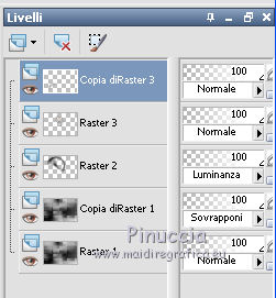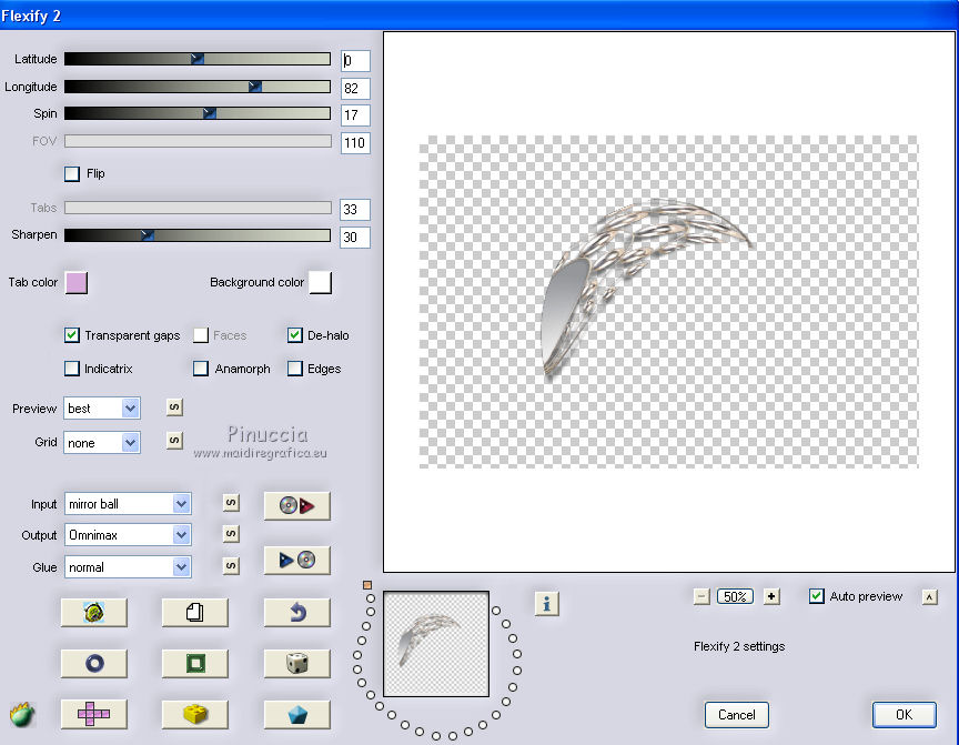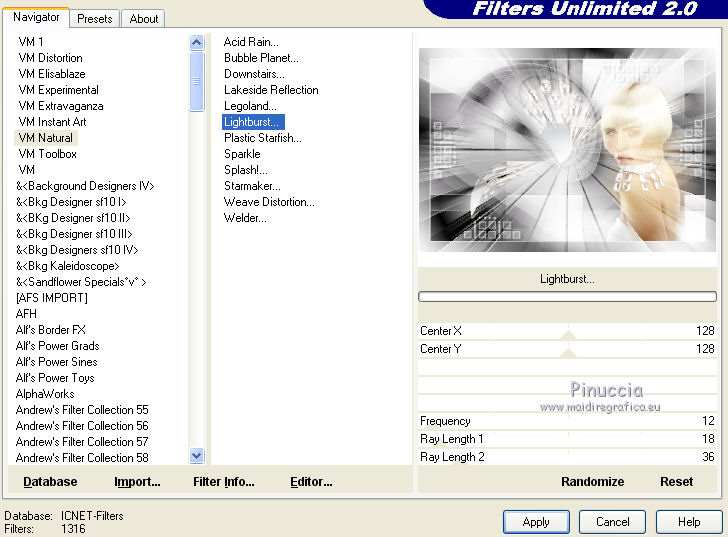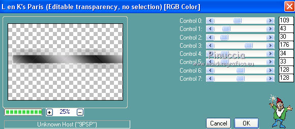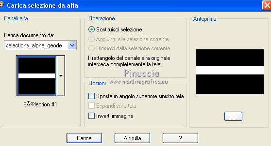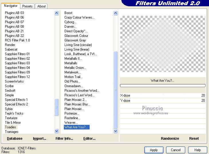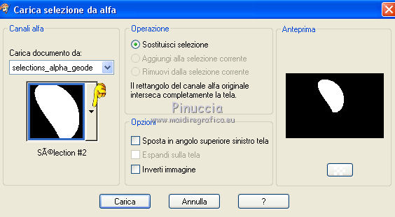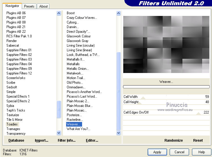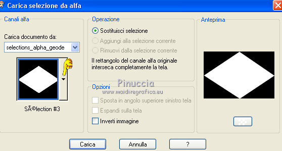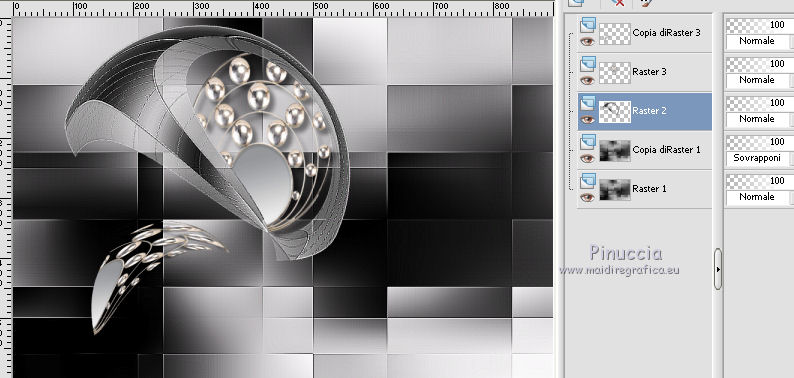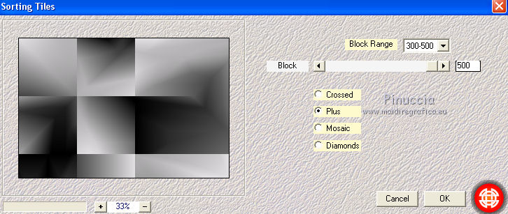 qui puoi trovare qualche risposta ai tuoi dubbi. Se l'argomento che ti interessa non è presente, ti prego di segnalarmelo. Questo tutorial è stato creato con CorelX7, ma può essere realizzato anche con le altre versioni di PSP. Dalla versione X4, il comando Immagine>Rifletti è stato sostituito con Immagine>Capovolgi in orizzontale, e il comando Immagine>Capovolgi con Immagine>Capovolgi in verticale. Nelle versioni X5 e X6, le funzioni sono state migliorate rendendo disponibile il menu Oggetti. Con la nuova versione X7, sono tornati Rifletti/Capovolgi, ma con nuove funzioni. Vedi la scheda sull'argomento qui Per tradurre questo tutorial ho usato PSP X. Occorrente: Materiale qui Per il tube della donna grazie Isabelle P. Filtri in caso di dubbi, ricorda di consultare la mia sezione filtri qui Filters Unlimited 2.0 qui Mehdi - Sorting Tiles qui Flaming Pear - Flexify 2 qui Alien Skin Eye Candy 5 Impact - Glass qui Tramages - Tow the lines qui Filter Factory Gallery M - Picasso's last word qui L&K's - L&K's Paris qui I filtri Tramages e Factory Gallery si possono usare da soli o importati in Filters Unlimited (come fare vedi qui) Se un filtro fornito appare con questa icona ![]() Se utilizzi altri tubes e/o altri colori, puoi sperimentare le modalità di miscelatura e opacità più adatte. Metti il pennello nella cartella Pennelli. Attenzione, il pennello è composto da due files che non devono essere separati. Vedi gli appunti sui pennelli qui 1. Imposta il colore di primo piano con #e3e1e3, e il colore di sfondo con il colore nero #000000. ![]() Passa il colore di primo piano a Gradiente di primo piano/sfondo, stile Lineare. ![]() 2. Apri selections_alpha_geode. Duplica l'immagine usando la combinazione di tasti maiuscola+D, ![]() oppure Modifica>Copia/Modifica>Incolla come nuova immagine. Chiudi l'originale e lavora sulla copia. L'immagine non è vuota, ma contiene le selezioni salvate sul canale alfa. 3. Riempi l'immagine trasparente con il gradiente.4. Effetti>Effetti di immagine>Motivo unico. ![]() 5. Effetti>Plugins>Mehdi - Sorting Tiles. ![]() 6. Effetti>Plugins>Filters Unlimited 2.0 - Toadies - Weaver, con i settaggi standard. ![]() 7. Effetti>Effetti di bordo>Aumenta di più. ![]() 8. Livelli>Duplica. Cambia la modalità di miscelatura di questo livello in Sovrapponi. ![]() 9. Livelli>Nuovo livello raster. Selezione>Carica/Salva selezione>Carica selezione da canale alfa. La selezione sélection#1 è subito disponibile. Devi soltanto cliccare Carica. ![]() Riempi la selezione con il gradiente.Selezione>Deseleziona. 10. Effetti>Plugins>Filters Unlimited 2.0 - Toadies - What are you, con i settaggi standard. ![]() 11. Effetti>Plugins>L&&k's - L&k's Paris, con i settaggi standard. ![]() 12. Effetti>Effetti di bordo>Aumenta di più. 13. Effetti>Plugins>Flaming Pear - Flexify 2. ![]() 14. Immagine>Ridimensiona, al 60%, tutti i livelli non selezionato. Immagine>Ruota per gradi - 25 gradi a destra. ![]() 15. Effetti>Effetti di immagine>Scostamento. ![]() 16. Effetti>Effetti di bordo>Aumenta di più. 17. Livelli>Nuovo livello raster. Selezione>Carica/Salva selezione>Carica selezione da canale alfa. Apri il menu delle selezioni e carica sélection#2. ![]() 18. Apri Décoration28_dhedey, e vai a Modifica>Copia. Torna al tuo lavoro e vai a Modifica>Incolla nella selezione. Selezione>Deseleziona. 19. Effetti>Effetti 3D>Sfalsa ombra. ![]() 20. Livelli>Duplica. Effetti>Plugins>Flaming Pear - Flexify 2, con i settaggi precedenti. ![]() Risultato. ![]() 21. Immagine>Ridimensiona, al 60%, tutti i livelli non selezionato. Effetti>Effetti di immagine>Scostamento. ![]() 22. Attiva il livello Raster 2. ![]() 23. Effetti>Plugins>Alien Skin Eye Candy 5 Impact - Perspective Shadow. Seleziona il preset Drop Shadow Blurry e ok. ![]() 24. Cambia la modalità di miscelatura di questo livello in Luminanza. ![]() 25. Attiva il livello superiore. ![]() 26. Livelli>Nuovo livello raster. Selezione>Carica/Salva selezione>Carica selezione da canale alfa. Apri il menu delle selezioni e carica sélection#3. ![]() Riporta il colore di primo piano a Colore. Abbassa l'opacità dello strumento Riempimento a 80, e riempi la selezione con il colore chiaro #e3e1e3.![]() Selezione>Deseleziona. 27. Effetti>Plugins>Filters Unlimited 2.0 - Toadies - What are you, con i settaggi standard. ![]() 28. Effetti>Plugins>Filters Unlimited 2.0 - VM Distortion - Broken Mirror. ![]() 29. Cambia la modalità di miscelatura di questo livello in Luce netta e abbassa l'opacità al 70%. ![]() 30. Effetti>Effetti 3D>Sfalsa ombra. ![]() 31. Porta questo livello tra il livello Copia di Raster 1 e Raster 2. ![]() 32. Attiva il livello superiore. Livelli>Nuovo livello raster. Imposta il colore di primo piano con il colore bianco #ffffff. 33. Attiva lo strumento Pennello ![]() cerca e seleziona il pennello pinceau_@qua_deco24 ![]() e applicalo al centro dell'immagine, cliccando con il tasto sinistro del mouse, per usare il colore bianco di primo piano. ![]() se il tuo PSP non supporta Pennelli superiori a 500 pixels, applica il pennello alla dimensione massima ![]() e, dopo averlo applicato, attiva lo strumento Puntatore ![]() se stai usando PSP 9 lo strumento Deformazione ![]() e, in modalità Scala ![]() usa i nodi centrali per allargare il pennello come nell'esempio. ![]() 34. Effetti>Effetti 3D>Sfalsa ombra. ![]() 35. Apri il tube e vai a Modifica>Copia. Torna al tuo lavoro e vai a Modifica>Incolla come nuovo l ivello. Immagine>Ridimensiona, all'80%, tutti i livelli non selezionato. 36. Effetti>Effetti di immagine>Scostamento. ![]() 37. Effetti>Effetti 3D>Sfalsa ombra. ![]() 38. Riporta il colore di primo piano al colore (#e3e1e3) e al gradiente iniziali. ![]() 38. Immagine>Aggiungi bordatura, 2 pixels, simmetriche, colore bianco #ffffff. Immagine>Aggiungi bordatura, 35 pixels, simmetriche, colore #e3e1e3. 39. Attiva lo strumento Bacchetta magica ![]() e clicca nel bordo da 35 pixels per selezionarlo. Riporta l'opacità dello strumento Riempim