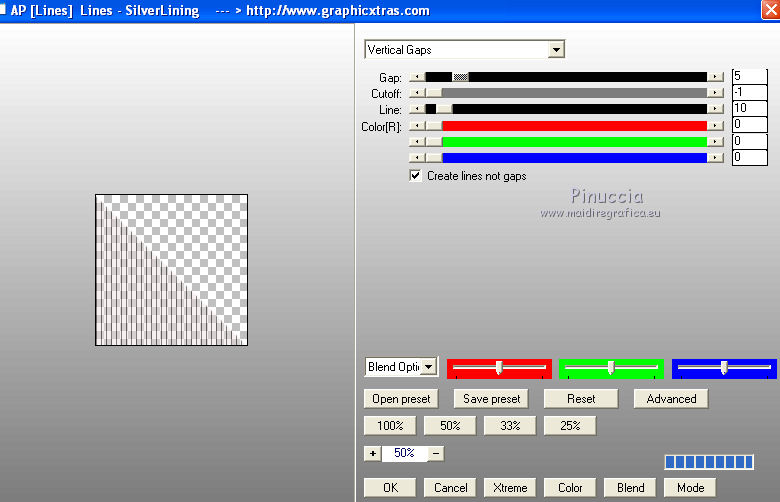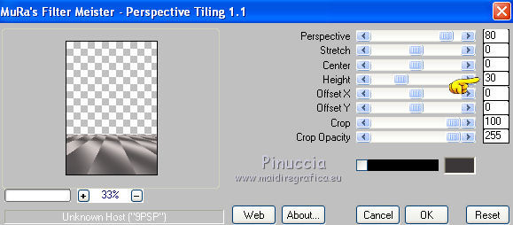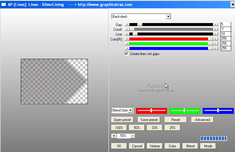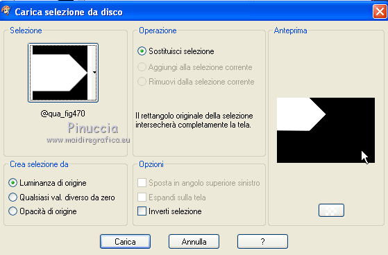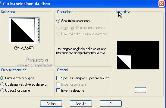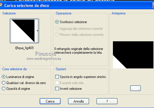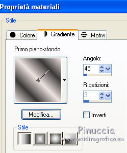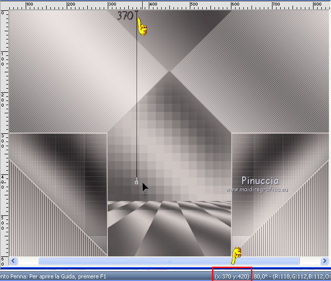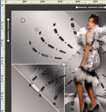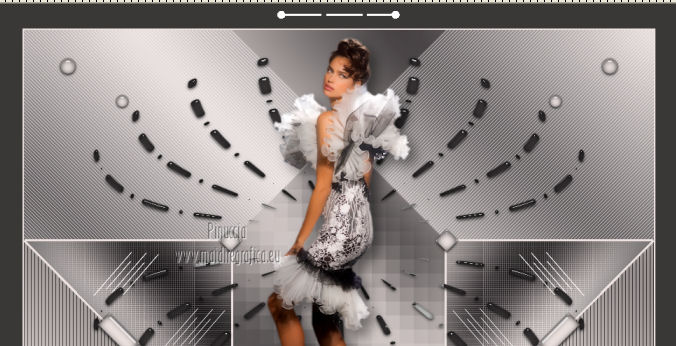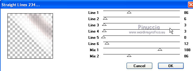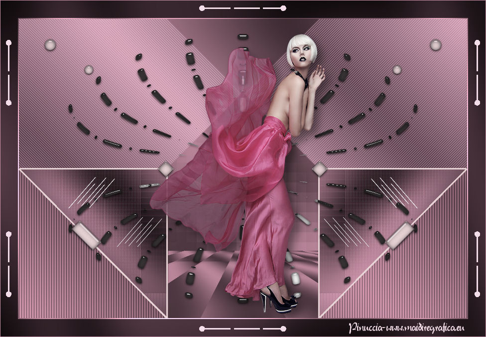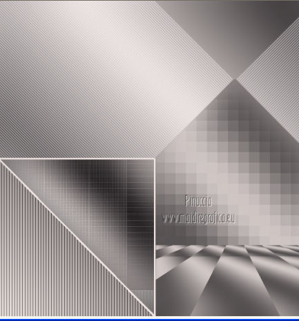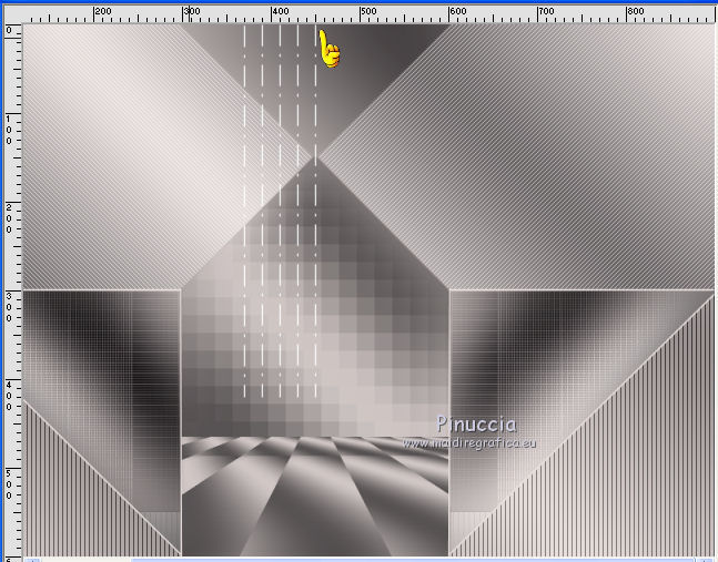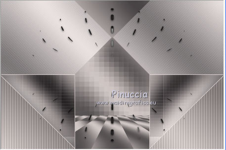 qui puoi trovare qualche risposta ai tuoi dubbi. Se l'argomento che ti interessa non è presente, ti prego di segnalarmelo. Questo tutorial è stato creato con PSP X3, ma può essere eseguito anche con le altre versioni di PSP. Per tradurlo, ho usato PSP X. Occorrente: Materiale qui Per il tube della donna grazie Linette. Lascia intatto il nome del tube. Il © appartiene all'artista originale. Mantieni il credito di chi ha creato il tube. Filtri in caso di dubbi, ricorda di consultare la mia sezione filtri qui AP Lines - Lines SilverLining qui Mura's Meister qui Mehdi qui Simple qui Alien Skin Eye Candy 5 Impact qui Andrew's Filter 51 qui ![]() Metti la linea di stile @qua9 nella cartella Linee di stile. Metti le selezioni nella cartella Selezioni. 1. Imposta il colore di primo piano con #ede3e1, e il colore di sfondo con #3b3738. Passa il colore di primo piano a Gradiente, stile Lineare. ![]() Apri una nuova immagine trasparente 900 x 600 pixels, e riempila con il gradiente.Regola>Sfocatura>Sfocatura gaussiana - raggio 30. ![]() 2. Livelli>Nuovo livello raster. Selezione>Carica/Salva selezione>Carica selezione da disco. Cerca e carica la selezione @fig470. ![]() Imposta l'opacità dello strumento Riempimento a 50.![]() Riempi la selezione con il colore scuro.Effetti>Plugins>AP Lines - Lines SilverLining. Seleziona Backslash con i seguenti settaggi. ![]() Selezione>Deseleziona. 3. Livelli>Duplica. Immagine>Rifletti. Livelli>Unisci>Unisci giù. Cambia la modalità di miscelatura di questo livello in Filtra. 4. Livelli>Nuovo livello raster. Selezione>Carica/Salva selezione>Carica selezione da disco. Cerca e carica la selezione @fig471. ![]() Opacità riempimento 100, e riempi la selezione con il gradiente.Regola>Sfocatura>Sfocatura gaussiana - raggio 30. ![]() 5. Livelli>Duplica. Attiva il livello sottostante dell'originale - Raster 3. Effetti>Effetti di distorsione>Tasselli. ![]() Vedrai tra poco il risultato dell'effetto. 6. Attiva nuovamente il livello superiore. Effetti>Plugins>Mura's Meister - Perspective Tiling Height 30 ![]() Selezione>Deseleziona. 7. Livelli>Nuovo livello raster. Selezione>Carica/Salva selezione>Carica selezione da disco. Cerca e carica la selezione @fig478. ![]() Riempi con il gradiente, opacità 100.Regola>Sfocatura>Sfocatura gaussiana, con i settaggi precedenti. ![]() 8. Effetti>Plugins>Andrew's Filters 51 - Straight Lines 234, con i settaggi standard. ![]() Selezione>Deseleziona. Livelli>Duplica. Immagine>Rifletti. Livelli>Unisci>Unisci giù. Abbassa l'opacità di questo livello all'80%. ![]() 9. Livelli>Nuovo livello raster. Selezione>Carica/Salva selezione>Carica selezione da disco. Cerca e carica la selezione @fig469. ![]() Riporta il colore di primo al colore chiaro, l'opacità dello strumento Riempimento a 50. Riempi la selezione con il colore chiaro.10. Effetti>Plugins>AP Lines - Lines SilverLining. Seleziona Vertical Gaps, con i seguenti settaggi. ![]() Selezione>Deseleziona. Livelli>Duplica. Immagine>Rifletti. Livelli>Unisci>Unisci giù. 11. Attiva lo strumento Penna ![]() linea di stile Pieno, larghezza 2 pixels, ![]() e traccia il perimetro di uno dei triangoli, con il colore chiaro di primo piano. ![]() Livelli>Converti in livello raster. Livelli>Duplica. Immagine>Rifletti. ![]() 12. Seleziona la linea di stile "Punto trattino" ![]() Tenendo premuto il tasto della maiuscola, traccia una linea partendo da 370 pixels fino 420, mentre tracci la linea puoi controllare la posizione nella barra inferiore dello strumento. Quando sei certo della posizione, prima rilascia il tasto del mouse e poi il tasto della maiuscola. ![]() Clicca sul segno di spunta per applicare la linea questo ti consente di continuare sullo stesso livello vettore. ![]() Traccia altre quattro linee a 390, 410, 430 e 450 pixels, cliccando ogni volta Applica, e facendo molta attenzione alla posizione soprattutto della linea a 450 pixels. ![]() Quanto hai terminato: Livelli>Converti in livello raster. 13. Livelli>Duplica. Immagine>Rifletti. Livelli>Unisci>Unisci giù. Effetti>Effetti geometrici>Sfera. ![]() Modifica>Ripeti Sfera. 14. Effetti>Effetti di distorsione>Coordinate polari. ![]() 15. Livelli>Duplica. Immagine>Capovolgi. Livelli>Unisci>Unisci giù. Effetti>Plugins>Mehdi - Sorting Tiles. ![]() il risultato con la versione X3 sarà differente. ![]() Effetti>Plugins>Alien Skin Eye Candy 5 Impact - Glass, seleziona il preset Clear e ok. ![]() Anche qui avrai un risultato differente a seconda della versione di PSP che stai usando. Questo il risultato con X3 ![]() Questo il risultato con Corel X. ![]() se il risultato con la tua versione non ti soddisfa, copia e incolla il mio livello che trovi qui 16. Livelli>Nuovo livello raster. Selezione>Carica/Salva selezione>Carica selezione da disco. Cerca e carica la selezione @fig480. ![]() Riempi la selezione con il colore scuro,opacità dello strumento Riempimento 100. Selezione>Modifica>Contrai - 1 pixel. ![]() Premi sulla tastiera il tasto CANC. Riempi la selezione con il colore chiaro.Effetti>Plugins>Alien Skin Eye Candy 5 Impact - Glass, con i settaggi precedenti. Selezione>Deseleziona. Sposta la losanga a sinistra, come nel mio esempio.17. Livelli>Duplica, e sposta il duplicato a destra.Se vuoi mantenere l'allineamento delle losanghe, dopo aver attivato lo strumento Spostamento, usa sulla tastiera la freccia destra. Sull'uso delle frecce abbinato allo strumento spostamento vedi qui 18. Livelli>Nuovo livello raster. Selezione>Carica/Salva selezione>Carica selezione da disco. Cerca e carica la selezione @fig481. ![]() Riempi la selezione con il colore scuro, opacità 100.Selezione>Modifica>Contrai - 1 pixel. Premi sulla tastiera il tasto CANC. Riempi la selezione con il colore chiaro, opacità 100.Effetti>Plugins>Alien Skin Eye Candy 5 Impact - Glass, con i settaggi precedenti. Selezione>Deseleziona. 19. Livelli>Duplica. Immagine>Ruota per gradi - 45 gradi a sinistra. ![]() Sposta la forma sul triangolo a destra.![]() Livelli>Duplica. Imma