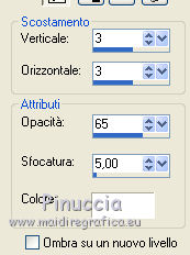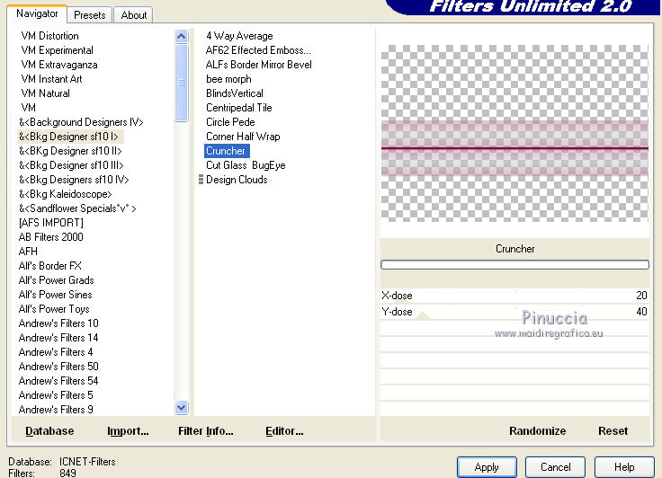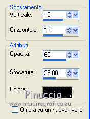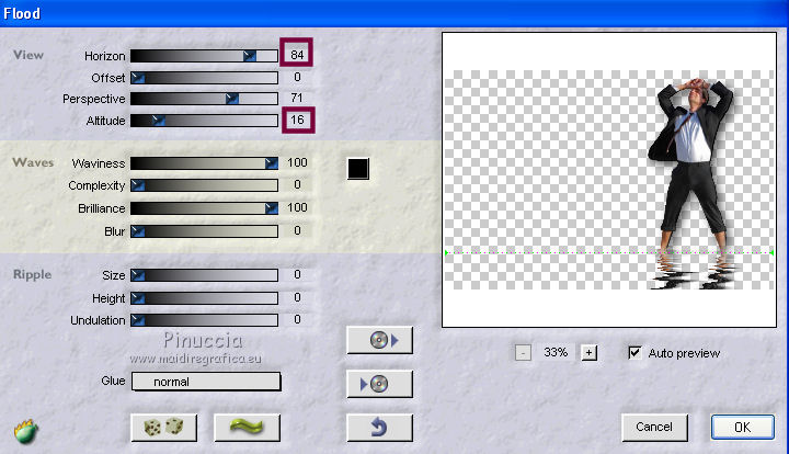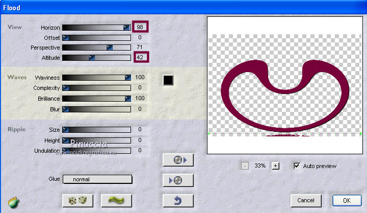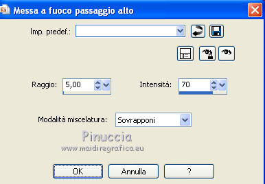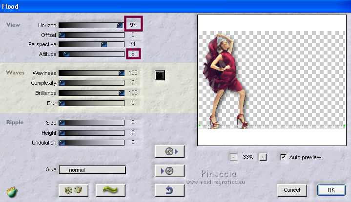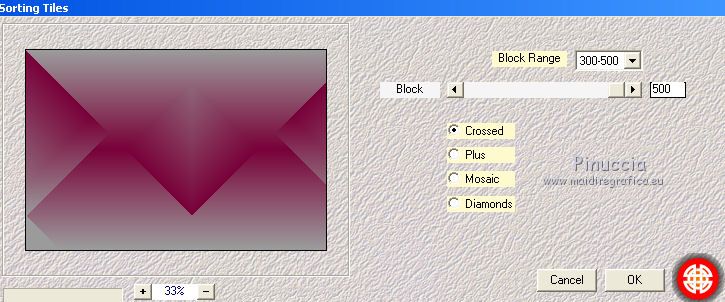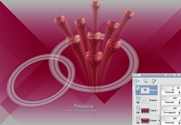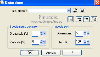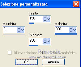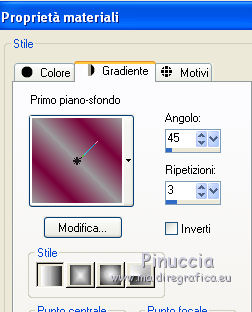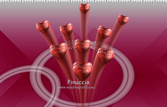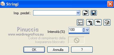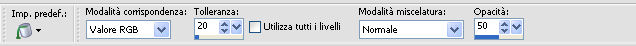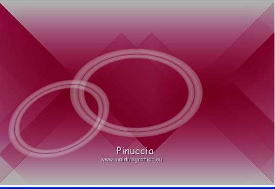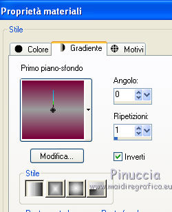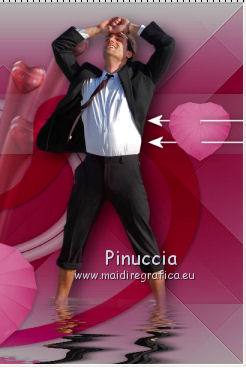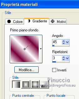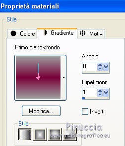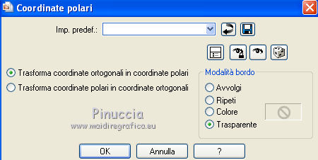 qui puoi trovare qualche risposta ai tuoi dubbi. Se l'argomento che ti interessa non è presente, ti prego di segnalarmelo. Questo tutorial è stato creato con PSP X3, ma può essere eseguito anche con le altre versioni di PSP. Per tradurlo, ho usato PSP X. Occorrente: Materiale qui Il tube dell'uomo è stato trovato sul Internet. Il tube della donna è di Tocha. Il tube dell'ombrello è di Grace. Grazie a tutti i creatori di tubes per le loro immagini. Lascia intatto il nome del tube. Il © appartiene all'artista originale. Mantieni il credito di chi ha creato il tube. Filtri in caso di dubbi, ricorda di consultare la mia sezione filtri qui Filters Unlimited 2.0 qui BKG Designersf10I - Cruncher qui Flaming Pear - Flood qui Simple - 4way average qui ![]() Apri il font e minimizzalo. Lo troverai nella lista dei font disponibili quando ti servirà. Metti la selezione nella cartella Selezioni. Nel corso del tutorial sono stati usati questi colori. ![]() 1. Imposta il colore di primo piano con il colore chiaro #9c9c9c, e il colore di sfondo con il colore scuro #780139. Passa il colore di primo piano a Gradiente. ![]() 2. Apri una nuova immagine trasparente 900 x 600 pixels, e riempila con il gradiente.3. Effetti>Plugins>Mehdi - Sorting Tiles. ![]() 4. Livelli>Duplica. 5. Effetti>Plugins>Simple - 4Way Average. 6. Effetti>Effetti di bordo>Aumenta di più. Cambia la modalità di miscelatura di questo livello in Sovrapponi. 7. Attiva lo strumento Selezione ,clicca sull'icona Selezione personalizzata ![]() e imposta i seguenti settaggi: ![]() 8. Cambia i settaggi del gradiente, selezionando Inverti. ![]() Livelli>Nuovo livello raster. Riempi la selezione con il gradiente.Selezione>Deseleziona. 9. Effetti>Plugins>Filters Unlimited 2.0 - BKG Designersf10I - Cruncher. ![]() 10. Effetti>Effetti di distorsione>Stringi - 2 volte con i seguenti settaggi: ![]() 11. Effetti>Effetti di distorsione>Coordinate polari: ![]() 12. Immagine>Ridimensiona, all'80%, tutti i livelli non selezionato. ![]() 13. Livelli>Duplica. Immagine>Ridimensiona, all'80%, tutti i livelli non selezionato. 14. Immagine>Ruota per gradi - 25 gradi a sinistra. ![]() 15. Sposta la piccola ellissein basso a sinistra, come nell'esempio. ![]() 16. Livelli>Unisci>Unisci giù. 17. Regola>Messa a fuoco>Messa a fuoco passaggio alto. ![]() 18. Apri il tube flying04@ e vai a Modifica>Copia. Torna al tuo lavoro e vai a Modifica>Incolla come nuovo livello. Immagine>Ridimensiona, al 50%, tutti i livelli non selezionato. 19. Attiva il livello sottostante. Usando lo strumento Gomma ![]() o - se preferisci - lo strumento Selezione a mano libera , da punto a punto,cancella i punti indicati nella schermata (se usi il lazo, premi sulla tastiera il tasto CANC). ![]() Selezione>Deseleziona. 20. Attiva nuovamente il livello superiore, e abbassa l'opacità di questo livello al 60%. ![]() 21. Regola>Messa a fuoco>Messa a fuoco passaggio alto, con i settaggi precedenti. 22. Cambia i settaggi del gradiente. ![]() 23. Livello>Nuovo livello raster. Selezione personalizzata ![]() ![]() 24. Imposta lo strumento Riempimento tolleranza 20, opacità 50.![]() Riempi la selezione con il gradiente.Selezione>Deseleziona. 25. Rimani su questo livello. Selezione personalizzata ![]() ![]() Riempi la selezione con il gradiente, mantenendo l'opacità a 50.Riporta l'opacità dello strumento a 100 e la tolleranza a 0. Selezione>Deseleziona. 26. Abbassa l'opacità di questo livello al 50%. 27. Regola>Messa a fuoco>Messa a fuoco passaggio alto, con i settaggi precedenti. 28. Apri il tube dell'uomo 375c5319 e vai a Modifica>Copia. Torna al tuo lavoro e vai a Modifica>Incolla come nuovo livello. Immagine>Ridimensiona, al 65%, tutti i livelli non selezionato. Posiziona il tube a destra, come nel mio esempio.29. Effetti>Effetti 3D>Sfalsa ombra. ![]() 30. Apri il tube della donna Tocha236201 e vai a Modifica>Copia. Torna al tuo lavoro e vai a Modifica>Incolla come nuovo livello. Immagine>Ridimensiona, al 50%, tutti i livelli non selezionato. Sposta il tube a sinistra, come nel mio esempio.31. Effetti>Effetti 3D>Sfalsa ombra, con i settaggi precedenti. 32. Attiva il livello delle due strisce parallele - Raster 4. 33. Livelli>Nuovo livello raster. Selezione personalizzata ![]() ![]() 34. Riempi la selezione con il colore scuro.Selezione>Deseleziona. 35. Effetti>Effetti di distorsione>Coordinate polari - 2 volte con i settaggi precedenti. ![]() Cambia la modalità di miscelatura di questo livello in Sovrapponi. 36. Effetti>Effetti 3D>Sfalsa ombra. ![]() 37. Attiva il livello superiore (il tube della donna). Effetti>Plugins>Flaming Pear - Flood: gioca sui settaggi di "horizon" e "altitude", a seconda del tube che stai usando. ![]() 38. Attiva il livello del tube dell'uomo, e ripeti, sempre sperimentando i settaggi di horizon e altitude adatti al tube. ![]() 39. Attiva il livello della figura geometrica e ripeti ancora una volta. ![]() 40. Attiva nuovamente il livello superiore. 41. Apri il tube di Grace hart3 e vai a Modifica>Copia. Torna al tuo lavoro e vai a Modifica>Incolla come nuovo livello. Immagine>Ridimensiona, al 50%, tutti i livelli non selezionato. Effetti>Effetti 3D>Sfalsa ombra, con i settaggi precedenti. 42. Livelli>Duplica. Immagine>Ridimensiona, al 50%, tutti i livelli non selezionato. Sposta il duplicato a destra, come nel mio esempio.43. Livelli>Nuovo livello raster. Selezione>Carica/Salva selezione>Carica selezione da disco. Cerca e carica la selezione @qua_fig40. ![]() 44. Imposta il colore di primo piano con il colore bianco, e riempi la selezione con il colore bianco.Selezione>Deseleziona. 45. Posiziona correttamente il cuore sotto le frecce.46. Attiva nuovamente il livello delle frecce, e cancella la parte centrale,in modo che le frecce sembrino infilate nell'ombrello. ![]() 47. Regola>Messa a fuoco>Messa a fuoco passaggio alto, con i settaggi precedenti. 48. Attiva lo strumento Testo ![]() dovrai regolare la dimensione in base al testo e alla versione di PSP che sta