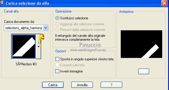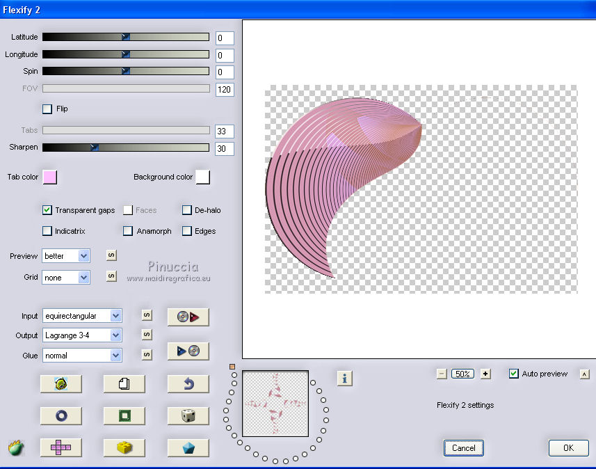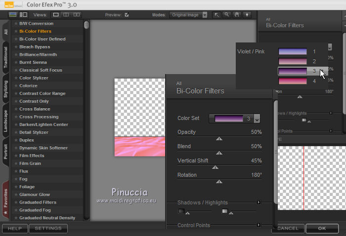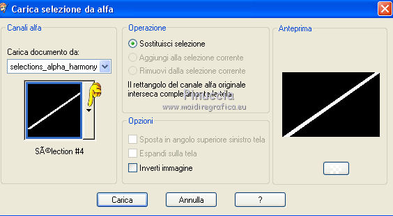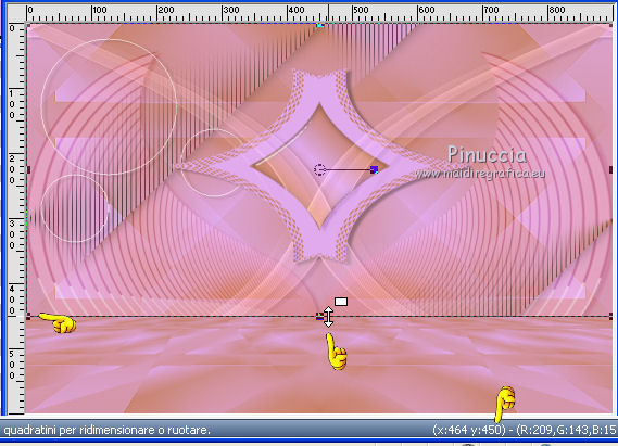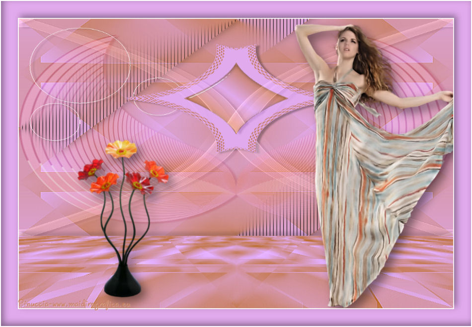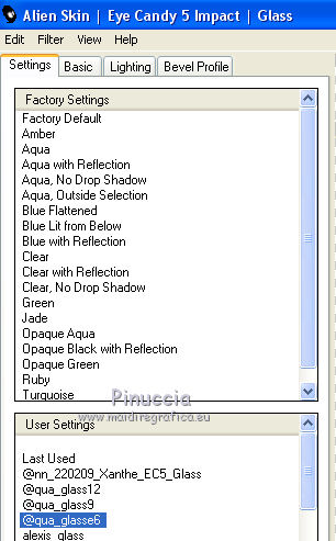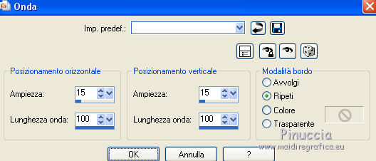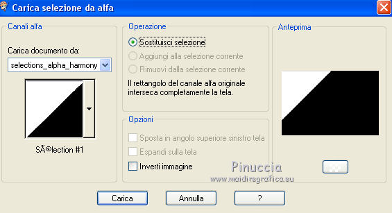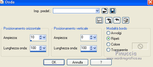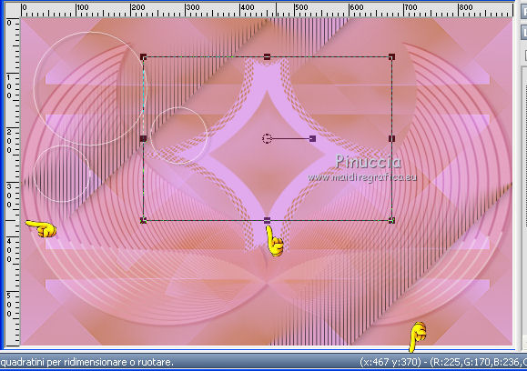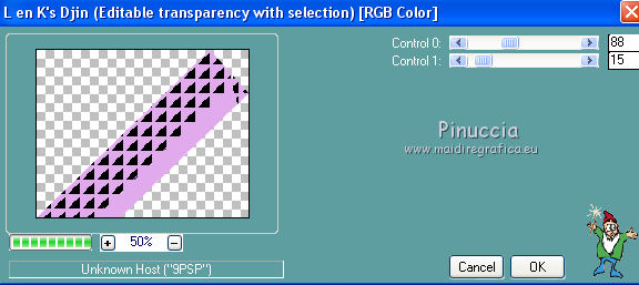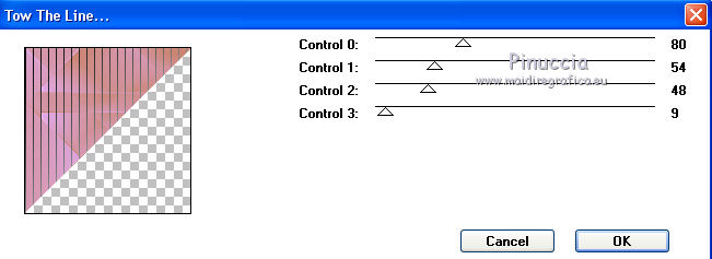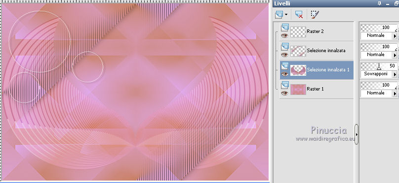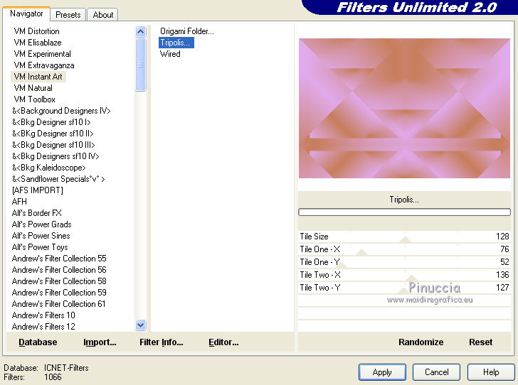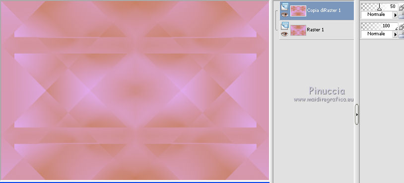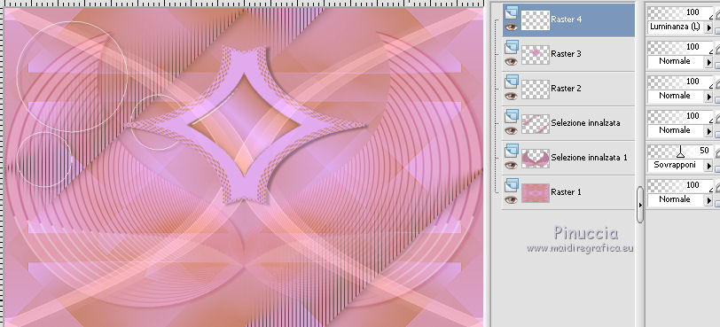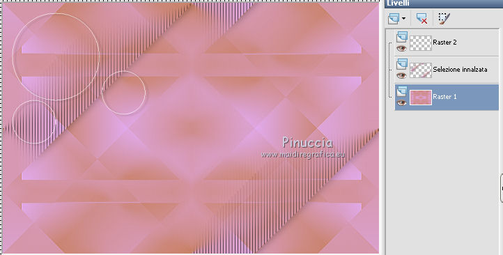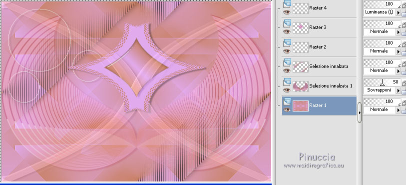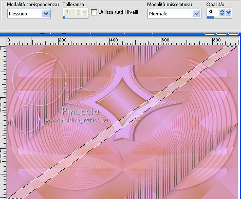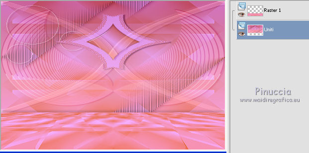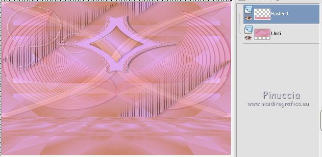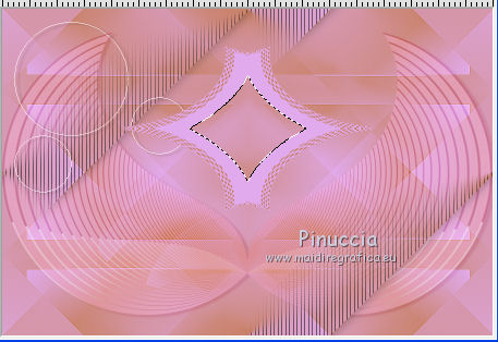 qui puoi trovare qualche risposta ai tuoi dubbi. Se l'argomento che ti interessa non è presente, ti prego di segnalarmelo. Questo tutorial è stato creato con CorelX6, ma può essere realizzato anche con le altre versioni di PSP. Dalla versione X4, il comando Immagine>Rifletti è stato sostituito con Immagine>Capovolgi in orizzontale, e il comando Immagine>Capovolgi con Immagine>Capovolgi in verticale. Nelle versioni X5 e X6, le funzioni sono state migliorate rendendo disponibile il menu Oggetti. Vedi la scheda sull'argomento qui Per tradurre questo tutorial ho usato PSP X. Occorrente: Materiale qui Il tube utilizzato è di Aquarellice. Filtri in caso di dubbi, ricorda di consultare la mia sezione filtri qui Filters Unlimited 2.0 qui VM Instant Art - Tripolis qui Tramages - Tow the line qui &<Bkg Designer sf10III> - VMT Instant Tile (da importare in Unlimited) qui &<Bkg Designer sf10I> - AF62 Effected Emboss (da importare in Unlimited) qui Alien Skin Eye Candy 5 Impact - Glass qui Flaming Pear - Flexify 2 qui Nik Software - Color Efex Pro qui AP Lines - Lines silverLining qui L&K's - L&K's Djin qui Mura's Meister - Perspective Tiling qui I filtri VM Instant Art e Tramages si possono usare da soli o importati in Filters Unlimited (come fare vedi qui) Se un filtro fornito appare con questa icona ![]() Se utilizzi altri tubes e/o altri colori, puoi sperimentare le modalità di miscelatura e opacità più adatte. 1. Imposta il colore di primo piano con #e1aaec, e il colore di sfondo con #c77e5b. ![]() Passa il colore di primo piano a Gradiente di primo piano/sfondo, stile Lineare. ![]() 2. Apri selections_alpha_harmony. Duplica l'immagine usando la combinazione di tasti maiuscola+D. Chiudi l'originale e lavora sulla copia. L'immagine non è vuota, ma contiene le selezioni salvate sul canale alfa. Rinomina il livello Raster 1. una piccola curiosità, se rinomini il livello con la lettera minuscola - raster 1 - il programma assegnerà nuovamente il numero 1 al successivo livello. Se invece rinomini il livello con la lettera maiuscola - Raster 1 - il programma assegnerà al livello successivo il numero 2 3. Riempi l'immagine trasparente con il gradiente.4. Effetti>Effetti di immagine>Motivo unico, con i settaggi standard. ![]() 5. Livelli>Duplica. Immagine>Ridimensiona, al 50%, tutti i livelli non selezionato. ![]() Livelli>Unisci>Unisci giù. 6. Effetti>Plugins>Filters Unlimited 2.0 - VM Instant Art - Tripolis, con i settaggi standard. ![]() 7. Livelli>Duplica. Immagine>Capovolgi. Abbassa l'opacità di questo livello al 50%. ![]() Livelli>Unisci>Unisci giù. Effetti>Effetti di bordo>Aumenta. 8. Selezione>Carica/Salva selezione>Carica selezione da canale alfa. La selezione sélection#1 è subito disponibile. Devi soltanto cliccare Carica. ![]() Selezione>Innalza selezione a livello. 9. Effetti>Plugins>Tramages - Tow the line, con i settaggi standard. attenzione, questo effetto si trova anche nei filtri Andrew's 8. Se non lo trovi nella lista di Tramages, molto probabilmente hai anche Andrew's nella lista dei files. E questo impedisce l'utilizzo dell'effetto di Tramages ![]() 10. Effetti>Effetti 3D>Sfalsa ombra. ![]() Selezione>Deseleziona. 11. Effetti>Effetti di immagine>Motivo unico, con i settaggi standard. ![]() 12. Livelli>Nuovo livello raster. Selezione>Carica/Salva selezione>Carica selezione da canale alfa. Apri il menu delle selezioni e carica Selection#2. ![]() Imposta il colore di primo piano con il colore bianco #ffffff, e riempi la selezione con questo colore.13. Selezione>Modifica>Contrai - 1 pixel. ![]() Premi sulla tastiera il tasto CANC ![]() Selezione>Deseleziona. 14. Liveli>Duplica. Livelli>Unisci>Unisci giù. 15. Effetti>Effetti 3D>Sfalsa ombra. ![]() 16. Attiva il livello Raster 1. ![]() Selezione>Carica/Salva selezione>Carica selezione da canale alfa. Clicca Carica per caricare nuovamente Selection#1. ![]() Selezione>Innalza selezione a livello. 17. Effetti>Plugins>Tramages - Tow the line con i settaggi standard. ![]() Selezione>Deseleziona. 18. Effetti>Plugins>Flaming Pear - Flexify 2. ![]() 19. Immagine>Capovolgi. Livelli>Duplica. Immagine>Rifletti. Livelli>Unisci>Unisci giù. Cambia la modalità di miscelatura di questo livello in Sovrapponi (o secondo i tuoi colori) e abbassa l'opacità al 50%. ![]() 20. Effetti>Effetti 3D>Sfalsa ombra. ![]() 21. Livelli>Nuovo livello raster. Selezione>Carica/Salva selezione>Carica selezione da canale alfa. Apri il menu delle selezioni e carica Selection#3. ![]() Riporta il colore di primo piano al colore iniziale #e1aaec, e riempi la selezione con questo colore.22. Effetti>Plugins>L&K's - L&K's Djin. ![]() Selezione>Deseleziona. 23. Effetti>Effetti di distorsione>Onda. ![]() 24. Effetti>Plugins>Filters Unlimited 2.0 - &<BKG Designer sf10III> - VMT Instant Tile. ![]() 25. Premi il tasto K per attivare lo strumento Puntatore ![]() se stai usando PSP 9 il tasto D (valido per tutte le versioni) per attivare lo strumento Deformazione ![]() in modalità Scala, spingi il nodo centrale superiore verso l'alto fino a 70 pixels (nella barra inferiore puoi controllare la posizione) ![]() quindi spingi verso l'alto il nodo centrale inferiore fino a 370 pixels. ![]() Premi il tasto M per deselezionare lo strumento. 26. Livelli>Disponi>Porta in alto. 27. Attiva lo strumento Bacchetta magica ![]() e clicca al centro della losanga per selezionarla. ![]() 28. Passa nuovamente il colore di primo piano a Gradiente, con i settaggi iniziali. ![]() Riempi la selezione con il gradiente.29. Effetti>Plugins>Alien Skin Eye Candy 5 Impact - Glass. Seleziona il preset @qua_glasse6 e ok. ![]() Questi i settaggi che puoi copiare, in caso di problemi con il preset. Se stai usando altri colori, sotto Basic cambia Glass Color con il tuo colore. ![]() 30. Dovresti avere questo. ![]() Selezione>Deseleziona. 31. Effetti>Effetti 3D>Sfalsa ombra, con i settaggi precedenti. ![]() 32. Livelli>Nuovo livello raster. Selezione>Carica/Salva selezione>Carica selezione da canale al