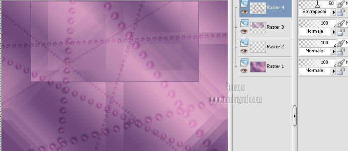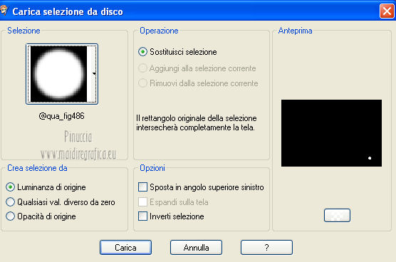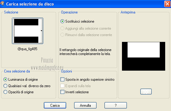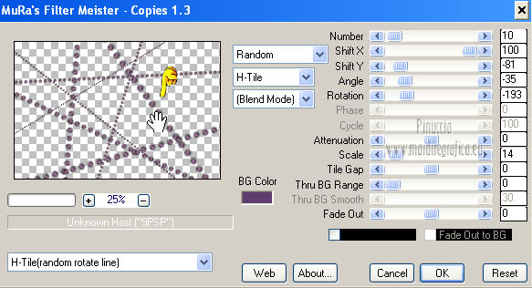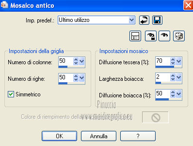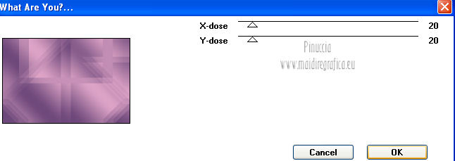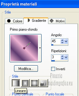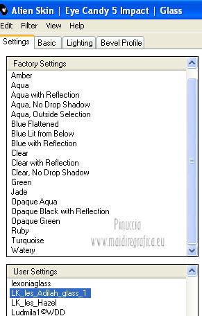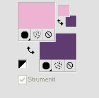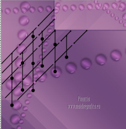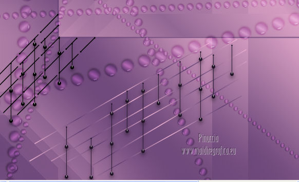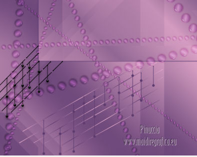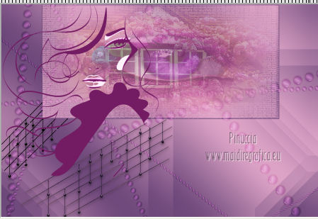 qui puoi trovare qualche risposta ai tuoi dubbi. Se l'argomento che ti interessa non è presente, ti prego di segnalarmelo. Questo tutorial è stato creato con PSP X3, ma può essere eseguito anche con le altre versioni di PSP. Per tradurlo, ho usato PSP X. Occorrente: Materiale qui I tubes utilizzati sono di Schiwa (la donna), Luna (la finestra), Mary (gli occhi) e CibiBijoux (vettore). Grazie a tutti per il loro magnifico lavoro. Lascia intatto il nome del tube. Il © appartiene all'artista originale. Mantieni il credito di chi ha creato il tube. Filtri in caso di dubbi, ricorda di consultare la mia sezione filtri qui Alien Skin Eye Candy 5 Impact qui Simple qui Mura's Meister - Copies qui ![]() Metti il preset LK_les_Adilah_glass_1 nella cartella del filtro Alien Skin Eye Candy 5 Impact>Settings>Glass. Cliccando sul file una o due volte (a seconda delle tue impostazioni) automaticamente il preset si installerà nella cartella corretta. Metti @qua10 e @qua22 nella cartella Linee di stile. Metti le selezioni nella cartella Selezioni. 1. Imposta il colore di primo piano con il colore #eeb2d2, e il colore di sfondo con il colore blu #5e3c70. ![]() Passa il colore di primo piano a Gradiente, stile Lineare. ![]() 2. Apri una nuova immagine trasparente 900 x 600 pixels, e riempila con il gradiente.3. Regola>Sfocatura>Sfocatura gaussiana - raggio 30. ![]() 4. Effetti>Plugins>Simple - Half Wrap. 5. Effetti>Plugins>Simple - Blintz. 6. Effetti>Plugins>Toadies - What are you con i settaggi standard. ![]() 7. Livelli>Nuovo livello raster. Selezione>Carica/Salva selezione>Carica selezione da disco. Cerca e carica la selezione @qua_fig485. ![]() 8. Riempi la selezione con il colore scuro.9. Selezione>Modifica>Contrai - 2 pixels. ![]() Premi sulla tastiera il tasto CANC. 10. Livelli>Nuovo livello raster. Imposta l'opacità dello strumento Riempimento a 50. ![]() Riempi la selezione con il gradiente.Selezione>Deseleziona. 11. Livelli>Nuovo livello raster. Selezione>Carica/Salva selezione>Carica selezione da disco. Cerca e carica la selezione @qua_fig486. ![]() 12. Riporta l'opacità a 100 e riempi la selezione con il gradiente.13. Effetti>Plugins>Alien Skin Eye Candy 5 Impact - Glass. Seleziona il preset LK_les_Adilah_glass_1 e ok. ![]() Selezione>Deseleziona. 14. Effetti>Plugins>Mura's Meister - Copies. il risultato di questo effetto è casuale (random) e non sarà pertanto uguale al mio esempio. clicca nella finestra di anteprima per cambiare il disegno, finchè non vedrai il risultato più simile al mio. Non è necessario che sia identico, ma cerca di lasciare delle linee a sinistra. ![]() Se non sei riuscito a trovare un risultato soddisfacente, nel materiale trovi un file con il mio risultato. Copia e incolla questo file come nuovo livello. 15. Cambia la modalità di miscelatura di questo livello in Sovrapponi, e abbassa l'opacità a 50. ![]() 16. Attiva lo strumento Penna ![]() Linea di stile @qua10, larghezza 2 ![]() Inverti i colori nella paletta in modo che il colore scuro passi a colore di primo piano. Traccia 5 linee in basso a sinistra. Inizia con la prima linea a 470 pixels di altezza. Per tracciare correttamente una linea obliqua: clicca sul punto di partenza e apparirà un piccolo quadretto, ![]() quindi clicca sul punto di arrivo ![]() e la linea si traccerà da sola. Aggiungi le altre quattro linee. ![]() Livelli>Converti in livello raster. 17. Cambia la Linea di stile con @qua22 e traccia sei linee verticali. Per avere i pallini in basso, traccia le linee dal basso verso l'alto. ![]() Livelli>Converti in livello raster. 18. Effetti>Plugins>Alien Skin Eye Candy 5 Impact - Glass, con i settaggi precedenti. 19. Cambia la linea di stile con Pieno. Inverti nuovamente i colori della paletta in modo che il gradiente passi a colore di primo piano. Traccia sei linee come nell'esempio. ![]() Imposta nuovamente la linea di stile @qua22 e inverti i colori per avere il colore scuro come colore di primo piano, e traccia dieci linee verticali come nell'esempio. ![]() Livelli>Converti in livello raster. 20. Effetti>Plugins>Alien Skin Eye Candy 5 Impact - Glass, con i settaggi precedenti. ![]() 21. Livelli>Nuovo livello raster. Selezione>Carica/Salva selezione>Carica selezione da disco. Carica nuovamente la selezione @qua_fig485. ![]() Selezione>Modifica>Contrai - 2 pixels. Riempi con il colore chiaro, opacità 50.22. Effetti>Effetti di trama>Mosaico antico. ![]() 23. Livelli>Nuovo livello raster. Apri il tube lunapaisagem1952 e vai a Modifica>Copia. Torna al tuo lavoro e vai a Modifica>Incolla nella selezione. Cambia la modalità di miscelatura di questo livello in Sovrapponi, e abbassa l'opacità al 50% (o secondo il tuo tube). Mantieni selezionato. 24. Livelli>Nuovo livello raster. Apri il tube Mary 0612-10 e vai a Modifica>Copia. Torna al tuo lavoro e vai a Modifica>Incolla nella selezione. Abbassa l'opacità di questo livello al 30%. Selezione>Deseleziona. 25. Apri il tube Vector_pretty_girl_CibiBijoux e vai a Modifica>Copia. Torna al tuo lavoro e vai a Modifica>Incolla come nuovo livello. se stai usando altri colori: Regola>Tonalità e Saturazione>Viraggio, con i valori corrispondenti a questi). Sposta il tube a sinistra.![]() Abbassa l'opacità di questo livello all'80% (o secondo i tuoi colori). 26. Apri il tube 1031 di Schiwa e e vai a Modifica>Copia. Torna al tuo lavoro e vai a Modifica>Incolla come nuovo livello. Immagine>Rifletti. Sposta il tube a destra.27. Effetti>Effetti 3D>Sfalsa ombra. ![]() 28. Immagine>Aggiungi bordatura, 2 pixels, simmetriche, con il colore scuro. Immagine>Aggiungi bordatura, 35 pixels, simmetriche, con il colore chiaro. Seleziona questo bordo con la bacchetta magica ![]() e riempilo con il gradiente.Effetti>Plugins>Alien Skin Eye Candy 5 Impact - Glass, con i settaggi precedenti. Selezione>Deseleziona. 29. Immagine>Aggiungi bordatura, 2 pixels, simmetriche, con il colore scuro. 30. Firma il tuo lavoro e salva in formato jpg. Per questi esempi ho usato tubes Tocha