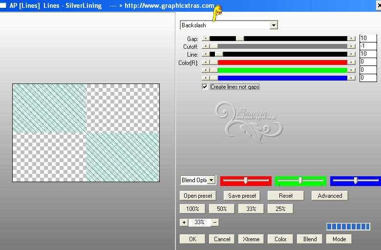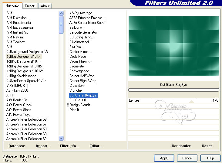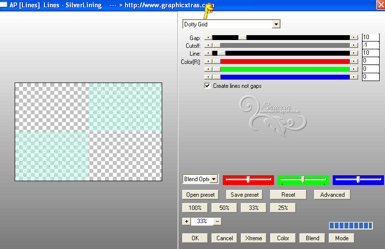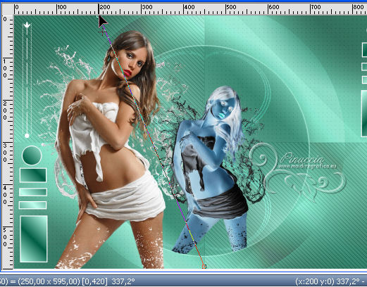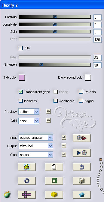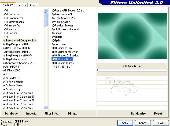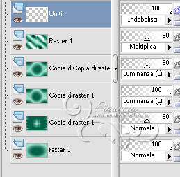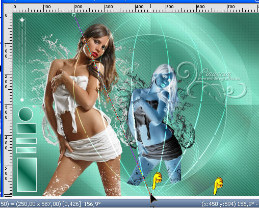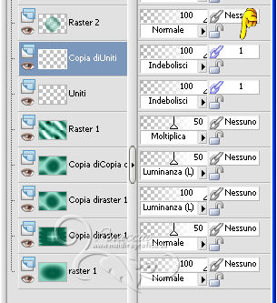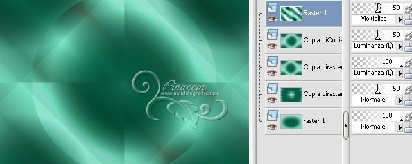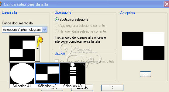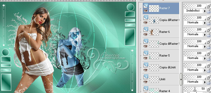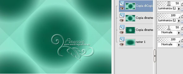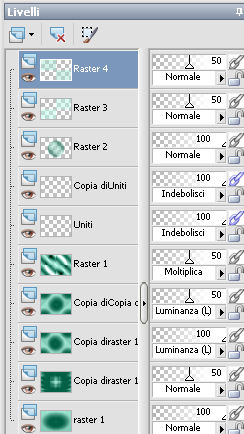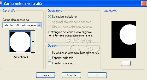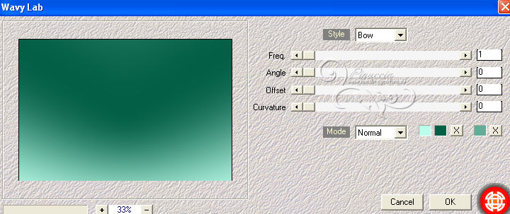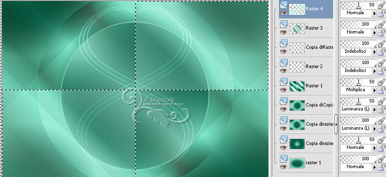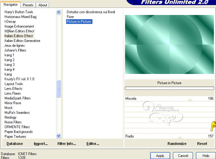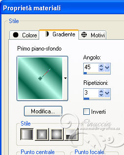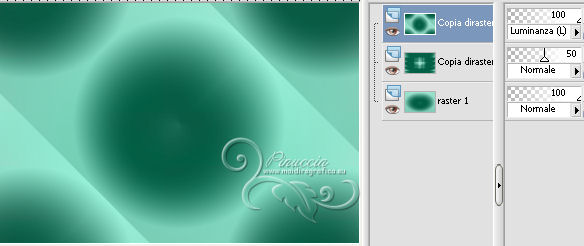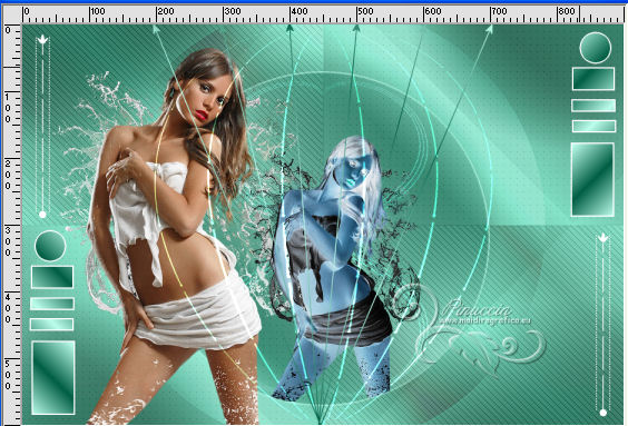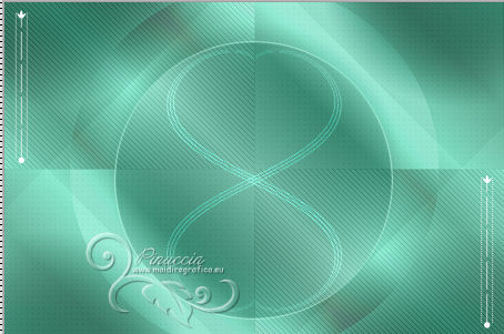qui puoi trovare qualche risposta ai tuoi dubbi. Se l'argomento che ti interessa non è presente, ti prego di segnalarmelo. Questo tutorial è stato creato con CorelX3, ma può essere realizzato anche con le altre versioni di PSP. Potresti riscontrare delle differenze nell'uso delle varie versioni. Per tradurlo ho usato PSP X. Occorrente: Materiale qui Per il tube della donna grazie AnaRidzi. Filtri in caso di dubbi, ricorda di consultare la mia sezione filtri qui Filters Unlimited 2.0 qui &<Bkg Designer sf10I> - Cut Glass BugEye (da importare in Unlimited) qui &<Background DesignerIV> - sf10 Slice N Dice (da importare in Unlimited) qui Italian Editors - Picture in Picture qui Flaming Pear - Flexify 2 qui Ap Lines - Lines SilverLining qui Mehdi - Wavy lab qui I filtri Italian Editor si possono usare da soli o importati in Filters Unlimited. (come fare vedi qui). Se un filtro fornito appare con questa icona ![]() Se utilizzi altri tubes e/o altri colori, puoi sperimentare le modalità di miscelatura e opacità più adatte. Metti le linee di stile nella cartella Linee di stile. 1. Imposta il colore di primo piano con #035f45, e il colore di sfondo con #bcfeec. ![]() 2. Apri selections_Alpha_hologramme. Duplica l'immagine usando la combinazione di tasti maiuscola+D. Chiudi l'originale e lavora sulla copia. L'immagine non è vuota, ma contiene le selezioni salvate sul canale alfa. Rinomina il livello Raster 1. 3. Effetti>Plugins>Mehdi - Wavy Lab - Bow: Il filtro lavora con i colori impostati nella paletta dei materiali, il primo colore è quello di sfondo, il secondo quello di primo piano, lascia il terzo colore che il filtro crea in base ai colori della paletta. ![]() 4. Effetti>Effetti di distorsione>Coordinate polari. ![]() 5. Livelli>Duplica. Effetti>Plugins>Filters Unlimited 2.0 - &<Bkg Designer sf10I> - Cut Glass BugEye, con i settaggi standard. ![]() 6. Abbassa l'opacità di questo livello al 50%. ![]() 7. Attiva nuovamente il livello Raster 1. Livelli>Duplica. Effetti>Plugins>Filters Unlimited 2.0 - &<Background Designer IV> - sf10 Slice N Dice. ![]() 8. Livelli>Disponi>Sposta su. Cambia la modalità di miscelatura di questo livello in Luminanza (esistente). ![]() 9. Livelli>Duplica. Immagine>Rifletti. Lascia la modalità di miscelatura di questo livello in Luminanza (esistente), e abbassa l'opacità al 50%. ![]() 10. Crea un gradiente stile Lineare con il colore chiaro #bcfeec e il colore scuro #035f45. ![]() Livelli>Nuovo livello raster. Riempi con il gradiente.11. Effetti>Plugins>Filters Unlimited 2.0 - Italian Editors Effect - Picture in picture. ![]() 12. Cambia la modalità di miscelatura di questo livello in Moltiplica, e abbassa l'opacità al 50% (o secondo i tuoi colori). ![]() 13. Regola>Messa a fuoco>Accentua messa a fuoco. 14. Attiva lo strumento Penna ![]() linea di stile @qua_boules ![]() larghezza 3 pixels ![]() Riporta il colore di primo piano al colore chiaro #bcfeec e traccia una prima diagonale al centro, come nell'esempio. ![]() Quindi traccia due diagonali a lato di quella centrale. ![]() 15. Livelli>Converti in livello raster. Effetti>Plugins>Flaming Pear - Flexify 2. ![]() Dovresti avere questo ![]() 16. Livelli>Duplica. Livelli>Unisci>Unisci giù. Cambia la modalità di miscelatura di questo livello in Indebolisci. ![]() 17. Livelli>Duplica. Immagine>Rifletti. 18. Livelli>Nuovo livello raster. Selezione>Carica/Salva selezione>Carica selezione da canale alfa. La selezione Selection#1 è subito disponibile. Devi soltanto cliccare Carica. ![]() 19. Riempi la selezione con il colore chiaro #bcfeec, opacità 100.![]() Selezione>Modifica>Contrai - 2 pixels. ![]() Premi sulla tastiera il tasto CANC ![]() 20. Imposta l'opacità dello strumento a 50 ![]() Riporta il colore di primo piano a Gradiente. nel corso del tutorial, cambierà spesso il colore o il gradiente da usare. Assicurati che nella paletta dei materiali sia impostato il colore o il gradiente richiesti. Non lo scriverò più Riempi la selezione con il gradiente.Selezione>Deseleziona. anche una piccola differenza nella creazione delle diagonali, può determinare un risultato diverso dal mio esempio. E di conseguenza anche il risultato dopo l'applicazione del filtro Flexify. A questo punto, se le linee create dal filtro si trovano al di fuori del cerchio, come in questo caso, ![]() collega i due livelli con lo stesso numero e attiva il livello superiore dei due ![]() e sposta le linee all'interno del cerchio (collegare i due livelli consentirà uno spostamento simultaneo). ![]() 21. Livelli>Nuovo livello raster. Selezione>Carica/Salva selezione>carica selezione da canale alfa. Apri il menu delle selezioni e carica Selection#2. ![]() Riempi le selezioni con il colore chiaro #bcfeec,opacità 50 ![]() 22. Effetti>Plugins>AP Lines - Lines SilverLining. ![]() 23. Abbassa l'opacità di questo livello al 50%. ![]() 24. Selezione>Inverti. Livelli>Nuovo livello raster. Riempi con il colore chiaro #bcfeec opacità 50 ![]() 25. Effetti>Plugins>AP Lines - Lines SilverLining - Backslash. ![]() 26. Abbassa l'opacità di questo livello al 50%. ![]() Selezione>Deseleziona. 27. Imposta il colore di primo piano con il colore bianco #ffffff. Attiva nuovamente lo strumento Penna ![]() linea di stile @qua_boules - larghezza 2 pixels. Traccia 2 linee orizzontali in alto a sinistra, come nell'esempio. ![]() 28. Cambia la linea di stile con la linea qua_15 ![]() e traccia una linea tra le precedenti, dall'alto verso il basso (in questo modo la pallina si troverà in basso e la freccia in alto). ![]() 29. Converti in livello raster. Livelli>Duplica. Immagine>Rifletti. Sposta le linee in basso a destra.![]() 30. Livelli>Nuovo livello raster. Selezione>Carica/Salva selezione>Carica selezione da disco. Apri il menu delle selezioni e carica Selection#3. ![]() 31. Riempi la selezione con il colore chiaro #bcfeec.32. Selezione>Modifica>Contrai - 2 pixels. ![]() Premi sulla tastiera il tasto CANC ![]() Riempi la selezione con il gradiente.