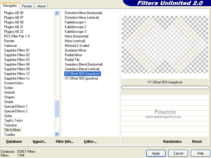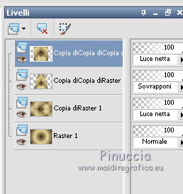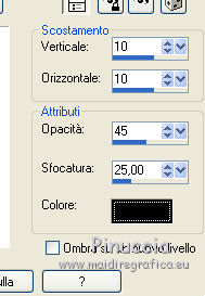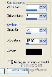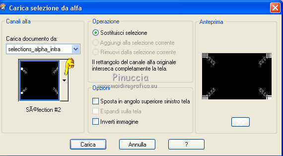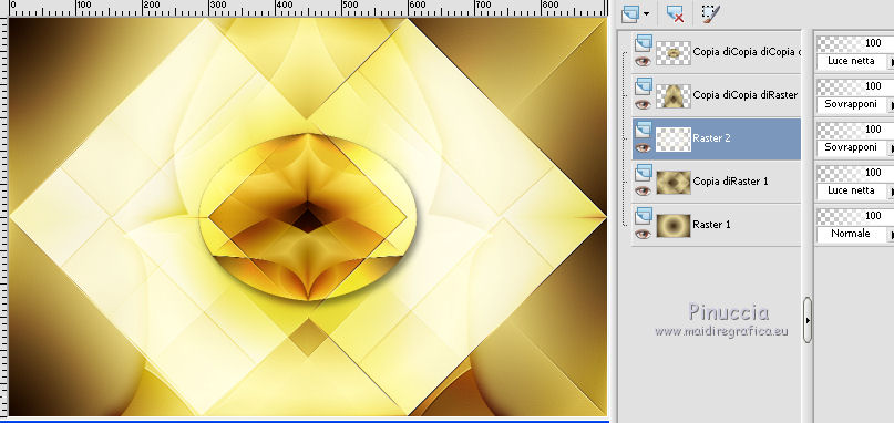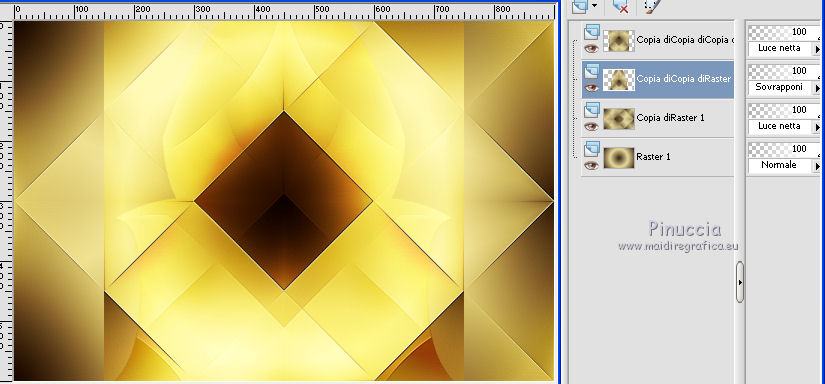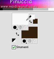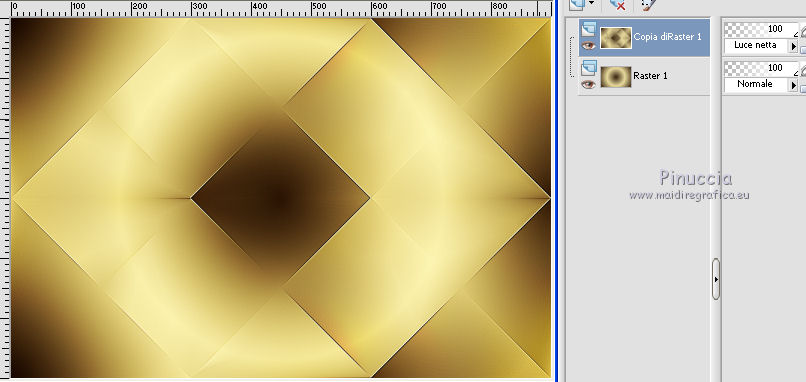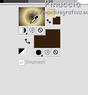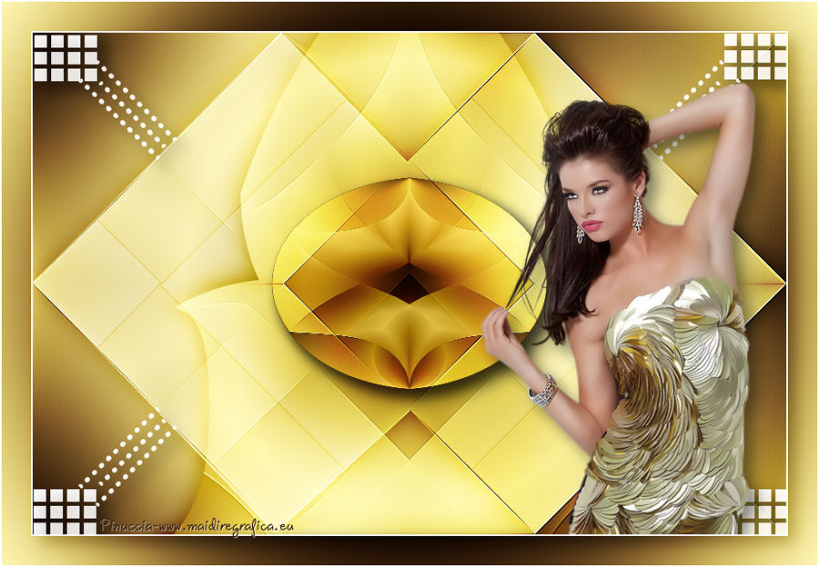 qui puoi trovare qualche risposta ai tuoi dubbi. Se l'argomento che ti interessa non è presente, ti prego di segnalarmelo. Questo tutorial è stato creato con CorelX7, ma può essere realizzato anche con le altre versioni di PSP. Dalla versione X4, il comando Immagine>Rifletti è stato sostituito con Immagine>Capovolgi in orizzontale, e il comando Immagine>Capovolgi con Immagine>Capovolgi in verticale. Nelle versioni X5 e X6, le funzioni sono state migliorate rendendo disponibile il menu Oggetti. Con la nuova versione X7, sono tornati Rifletti/Capovolgi, ma con nuove funzioni. Vedi la scheda sull'argomento qui Per tradurre questo tutorial ho usato PSP X. Occorrente: Materiale qui Per il tube della donna grazie Beatriz Filtri in caso di dubbi, ricorda di consultare la mia sezione filtri qui Filters Unlimited 2.0 qui Mehdi - Sorting Tiles qui Flaming Pear - Flexify 2 qui Alien Skin Eye Candy 5 Impact - Perspective Shadow qui ![]() Se utilizzi altri tubes e/o altri colori, puoi sperimentare le modalità di miscelatura e opacità più adatte. Nelle ultime versioni di PSP non c'è il gradiente di primo piano/sfondo (Corel_06_029) Trovi i gradienti delle versioni precedenti qui Metti il preset Cliccando sul file una o due volte (a seconda delle tue impostazioni), automaticamente il preset si installerà nella cartella corretta. perchè uno o due clic vedi qui 1. Imposta il colore di primo piano con #e9da9d, e il colore di sfondo con il colore #36210e. ![]() Passa il colore di primo piano a Gradiente di primo piano/sfondo, stile Rettangolare. ![]() 2. Apri selections_alpha_intra. Duplica l'immagine usando la combinazione di tasti maiuscola+D, ![]() oppure Modifica>Copia/Modifica>Incolla come nuova immagine. Chiudi l'originale e lavora sulla copia. L'immagine non è vuota, ma contiene le selezioni salvate sul canale alfa. 3. Riempi l'immagine trasparente con il gradiente.4. Livelli>Duplica. Effetti>Effetti di immagine>Motivo unico. ![]() 5. Effetti>Plugins>Mehdi - Sorting Tiles. ![]() 6. Effetti>Effetti di bordo>Aumenta di più. Cambia la modalità di miscelatura di questo livello in Luce netta (o secondo i tuoi colori). ![]() 7. Livelli>Duplica. Immagine>Ruota per gradi - 90 gradi a destra. ![]() 8. Livelli>Duplica. Ritorna sul livello sottostante della seconda copia di Raster 1. ![]() 9. Effetti>Plugins>Flaming Pear - Flexify 2. ![]() 10. Cambia la modalità di miscelatura di questo livello in Sovrapponi. ![]() 11. Effetti>Plugins>Alien Skin Eye Candy 5 Impact - Perspective Shadow. Seleziona il preset @qua_intra e ok. In caso di problemi con il preset, copia i settaggi nella schermata. ![]() 12. Attiva il livello superiore della terza copia di Raster 1. ![]() 13. Effetti>Plugins>Flaming Pear - Flexify 2. ![]() 14. Effetti>Effetti 3D>Sfalsa ombra. ![]() 15. Attiva nuovamente il livello della prima copia di Raster 1. ![]() 16. Livelli>Nuovo livello raster. Selezione>Carica/Salva selezione>Carica selezione da canale alfa. La selezione sélection#1 è subito disponibile. Devi soltanto cliccare Carica. ![]() 17. Imposta il colore di primo piano con il colore bianco: clicca con il tasto sinistro del mouse sulla paletta del colore e avrai la tabella dei colori recenti: gli ultimi due colori della tabella sono sempre il nero e il bianco. Clicca sulla palettina per impostare il colore. ![]() Riempi la selezione con questo colore.18. Selezione>Modifica>Contrai - 2 pixels. ![]() Premi sulla tastiera il tasto CANC ![]() 19. Abbassa l'opacità dello strumento Riempimento a 50 Riporta il colore di primo piano al colore chiaro #e9da9d: come prima: tasto destro del mouse e troverai il colore di primo piano in cima alla tabella. ![]() Riempi la selezione con il colore di primo piano #e9da9d.![]() 20. Effetti>Plugins>Filters Unlimited 2.0 - Tile & Mirror - XY Offset50% (negative). ![]() 21. Effetti>Effetti di bordo>Aumenta di più. Ripeti Effetti>Plugins>Filters Unlimited 2.0 - Tile & Mirror - XY Offset50% (negative). ![]() Selezione>Deseleziona. Cambia la modalità di miscelatura di questo livello in Sovrapponi o secondo i tuoi colori. ![]() 22. Effetti>Plugins>Alien Skin Eye Candy 5 Impact - Perspective Shadow, con i settaggi precedenti. ![]() 23. Attiva nuovamente il livello superiore. Livelli>Nuovo livello raster. Selezione>Carica/Salva selezione>Carica selezione da canale alfa. Apri il menu delle selezioni e carica sélection#2. ![]() 24. Abbassa l'opacità dello strumento Riempimento a 80, e riporta il colore bianco in primo piano e riempi la selezione con il colore bianco.![]() Selezione>Deseleziona. 25. Effetti>Effetti 3D>Sfalsa ombra. ![]() 26. Apri il tube 2148-woman-LB Tubes, e vai a Modifica>Copia. Torna al tuo lavoro e vai a Modifica>Incolla come nuovo livello. 27. Effetti>Effetti di immagine>Scostamento. ![]() 28. Effetti>Effetti 3D>Sfalsa ombra, con i settaggi precedenti. ![]() 29. Immagine>Aggiungi bordatura, 2 pixels, simmetriche, colore bianco #ffffff. Immagine>Aggiungi bordatura, 35 pixels, simmetriche, con il colore scuro #36210e. 30. Attiva lo strumento Bacchetta magica ![]() e clicca nel bordo da 35 pixels per selezionarlo. Riporta il colore di primo piano a Colore. ![]() Passa il colore di primo piano a Gradiente di primo piano/sfondo, stile Sprazzo di luce, Inverti non selezionato. ![]() Riporta l'opacità dello strumento Riempimento a 100 ![]() e riempi la selezione con il gradiente.31. Selezione>Innalza selezione a livello. Cambia la modalità di miscelatura di questo livello in Sovrapponi. 32. Selezione>Inverti. Effetti>Effetti 3D>Sfalsa ombra, con i settaggi precedenti. ![]() Selezione>Deseleziona. 33. Firma il tuo lavoro su un nuovo livello. 34. Livelli>Unisci>Unisci tutto. Immagine>Aggiungi bordatura, 2 pixels, simmetriche, colore bianco #ffffff. Salva in formato jpg. Il tube di questo esempio è di Kitty ![]() ![]() Le vostre versioni. Grazie ![]() Olimpia ![]() Maria ![]() Gigi ![]() Seval ![]() Luisa ![]() Se hai problemi o dubbi, o trovi un link non funzionante, o anche soltan