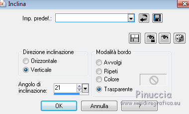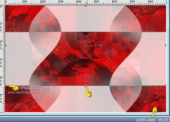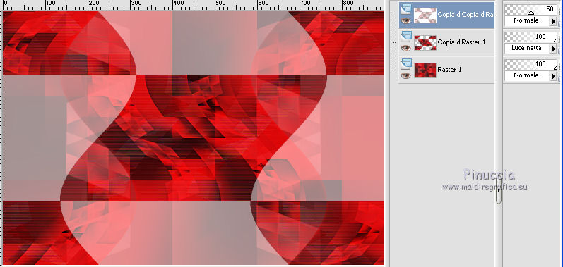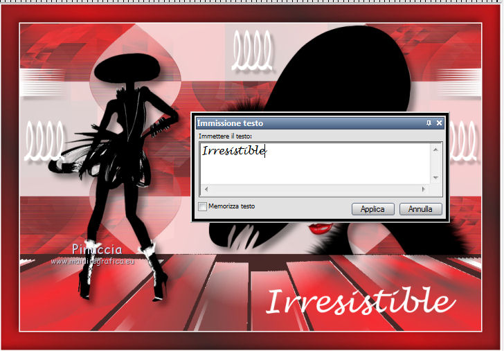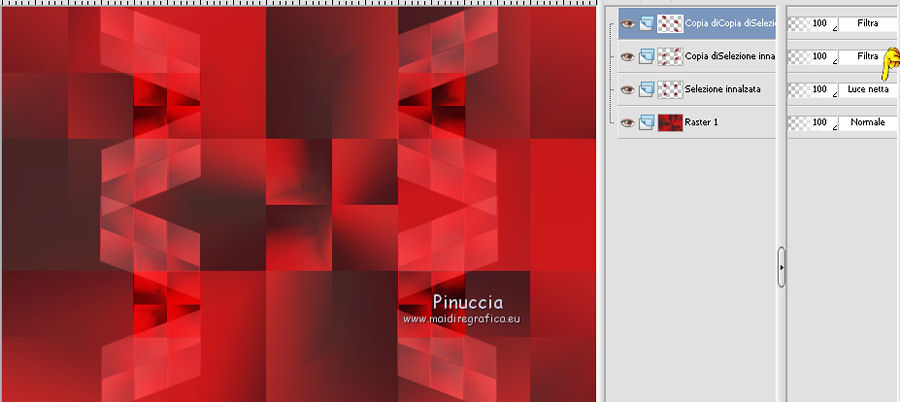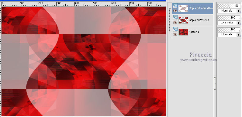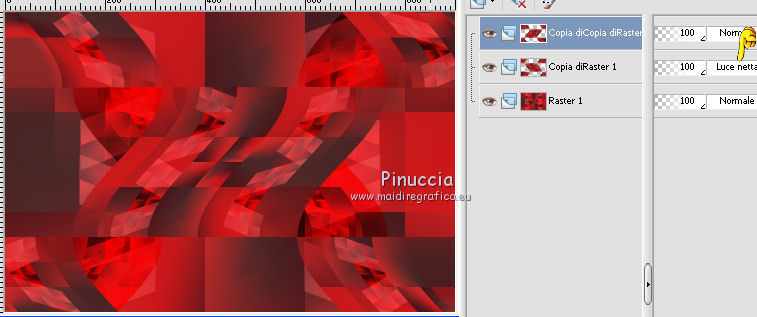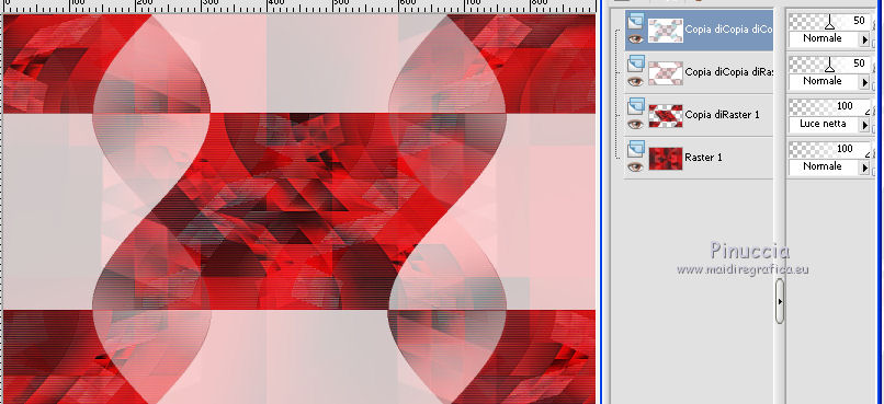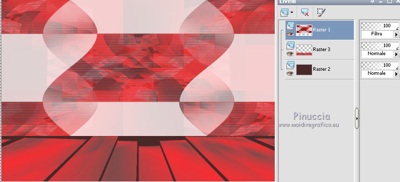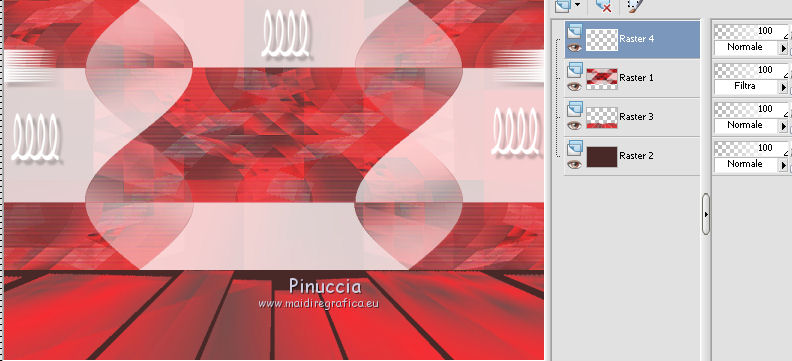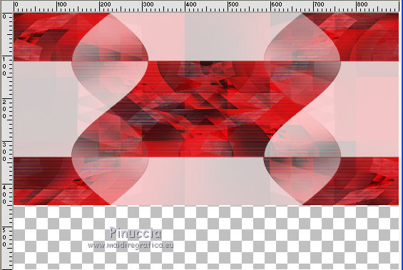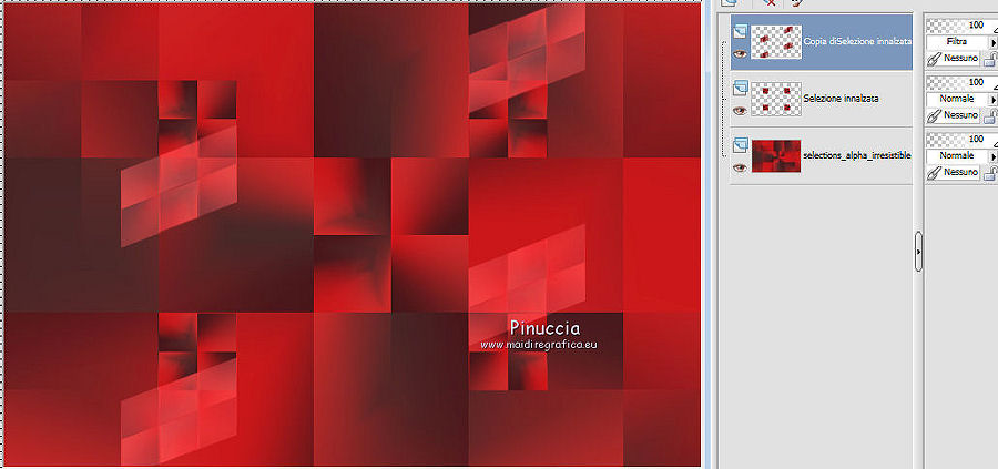 qui puoi trovare qualche risposta ai tuoi dubbi. Se l'argomento che ti interessa non è presente, ti prego di segnalarmelo. Questo tutorial è stato creato con CorelX6, ma può essere realizzato anche con le altre versioni di PSP. Dalla versione X4, il comando Immagine>Rifletti è stato sostituito con Immagine>Capovolgi in orizzontale, e il comando Immagine>Capovolgi con Immagine>Capovolgi in verticale. Nelle versioni X5 e X6, le funzioni sono state migliorate rendendo disponibile il menu Oggetti. Vedi la scheda sull'argomento qui Per tradurre questo tutorial ho usato PSP X. Occorrente: Materiale qui Per i tubes utilizzati grazie Macha e Grace. Filtri in caso di dubbi, ricorda di consultare la mia sezione filtri qui Filters Unlimited 2.0 qui Simple - Horizontal Grain qui VM Distortion - Broken Mirror qui &<Bkg Designer sf10III> - VMT Instant Tile (da importare in Unlimited) qui &<Bkg Designer sf10IV> - Lightburst (da importare in Unlimited) qui Mehdi - Wavy Lab, Sorting Tiles qui Mura's Meister - Perspective Tiling qui I filtri Simple e VM Distortion si possono usare da soli o importati in Filters Unlimited (come fare vedi qui) Se un filtro fornito appare con questa icona ![]() Se utilizzi altri tubes e/o altri colori, puoi sperimentare le modalità di miscelatura e opacità più adatte. Metti i pennelli nella cartella Pennelli. Attenzione, ogni pennello è composto da due files che non devono essere separati. Vedi gli appunti sui pennelli qui Se non vuoi appesantire la cartella dei Pennelli di PSP, puoi aggiungere nei Percorsi Files la cartella in cui hai salvato i pennelli. In questo modo, quando ti serviranno, non avrai nemmeno bisogno di cercarli, e quando non ti serviranno più, potrai rimuovere la cartella dai Percorsi. ![]() 1. Imposta il colore di primo piano con #cc181b, e il colore di sfondo con #492929. ![]() 2. Apri selections_alpha_irresistible. Non preoccuparti se ti appare questo messaggio. Clicca ok e il file si aprirà regolarmente. ![]() Duplica l'immagine usando la combinazione di tasti maiuscola+D. Chiudi l'originale e lavora sulla copia. L'immagine non è vuota, ma contiene le selezioni salvate sul canale alfa. Rinomina il livello Raster 1. una piccola curiosità, se rinomini il livello con la lettera minuscola - raster 1 - il programma assegnerà nuovamente il numero 1 al successivo livello. Se invece rinomini il livello con la lettera maiuscola - Raster 1 - il programma assegnerà al livello successivo il numero 2 3. Effetti>Plugins>Mehdi - Wavy Lab. questo filtro lavora con i colori della paletta; il primo è il colore di sfondo, il secondo quello di primo piano. Mantieni il terzo colore creato dal filtro. ![]() 4. Effetti>Plugins>Mehdi - Sorting Tiles. ![]() 5. Selezione>Carica/Salva selezione>Carica selezione da canale alfa. La selezione sélection#1 è subito disponibile. Devi soltanto cliccare Carica. ![]() 6. Selezione>Innalza selezione a livello. Selezione>Deseleziona. 7. Effetti>Plugins>Filters Unlimited 2.0 - &<Bkg Designer sf10III> - VMT Instant Tile. ![]() 8. Livelli>Duplica. Effetti>Effetti di immagine>Motivo unico, con i settaggi standard. ![]() 9. Effetti>Effetti geometrici>Inclina. ![]() 10. Cambia la modalità di miscelatura di questo livello in Filtra. ![]() 11. Livelli>Duplica. Immagine>Rifletti. Cambia la modalità di miscelatura del livello Selezione innalzata in Luce netta. (per cambiare proprietà dei livelli non occorre attivarli, quando la paletta si presenta come nella schermata sotto. Se vuoi visualizzare il menu dei livelli come nell'esempio, vedi qui). ![]() 12. Livelli>Unisci>Unisci tutto. Rinomina questo livello Raster 1. 13. Livelli>Duplica. Immagine>Ridimensiona, al 50%, tutti i livelli non selezionato. ![]() 14. Effetti>Effetti di immagine>Motivo unico, con i settaggi standard. ![]() 15. Effetti>Effetti di distorsione>Onda. ![]() 16. Livelli>Duplica. Immagine>Rifletti. Cambia la modalità di miscelatura del livello copia di Raster 1 in Luce netta ![]() 17. Assicurati di essere posizionato sul livello superiore. Imposta il colore di sfondo con il colore bianco (necessario per il risultato del prossimo filtro). Effetti>Plugins>Filters Unlimited 2.0 - Simple - Horizontal Grain. ![]() Se non avessi cambiato il colore di sfondo con il bianco, avresti avuto questo ![]() 18. Abbassa l'opacità di questo livello al 50% (o secondo i tuoi colori). ![]() Effetti>Effetti di bordo>Aumenta. 19. Attiva il livello sottostante - Copia di Raster 1. Regola>Messa a fuoco>Maschera di contrasto. ![]() 20. Attiva nuovamente il livello superiore. ![]() 21. Livelli>Duplica. Effetti>Effetti di immagine>Motivo unico, con i settaggi standard. ![]() Effetti>Effetti di bordo>Aumenta. Dovresti avere questo. ![]() 22. Livelli>Unisci>Unisci tutto. 23. Premi il tasto K per attivare lo strumento Puntatore ![]() se stai usando PSP 9 il tasto D per attivare lo strumento Deformazione ![]() in modalità Scala ![]() spingi il nodo inferiore centrale verso l'alto, fino a 450 pixels. (nella barra inferiore puoi controllare la posizione). ![]() Premi il tasto M per deselezionare lo strumento. ![]() 24. Livelli>Nuovo livello raster. Livelli>Disponi>Sposta giù. 25. Riporta il colore di sfondo al colore iniziale #492929, e riempi il livello con il colore di sfondo.26. Livelli>Nuovo livello raster. Passa il colore di primo piano a Gradiente di primo piano/sfondo, stile Lineare. ![]() Riempi il livello con il gradiente.27. Effetti>Plugins>Mura's Meister - Perspective Tiling. ![]() 28. Effetti>Plugins>Filters Unlimited 2.0 - VM Distortion - Broken Mirror, con i settaggi standard. ![]() 29. Effetti>Plugins>Filters Unlimited 2.0 - &<Bkg Designer sf10IV> - Lightburst, con i settaggi standard. ![]() 30. Attiva nuovamente il livello superiore. Cambia la modalità di miscelatura di questo livello in Filtra. ![]() 31. Imposta il colore di primo piano con il colore bianco #ffffff (o nero, secondo i tuoi colori). ![]() 32. Attiva lo strumento Pennello ![]() cerca e seleziona il pennello @