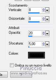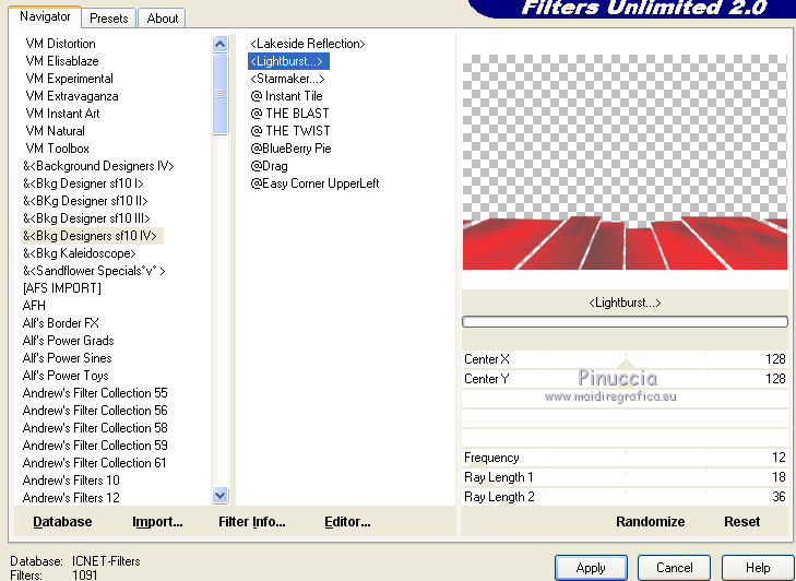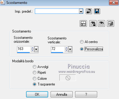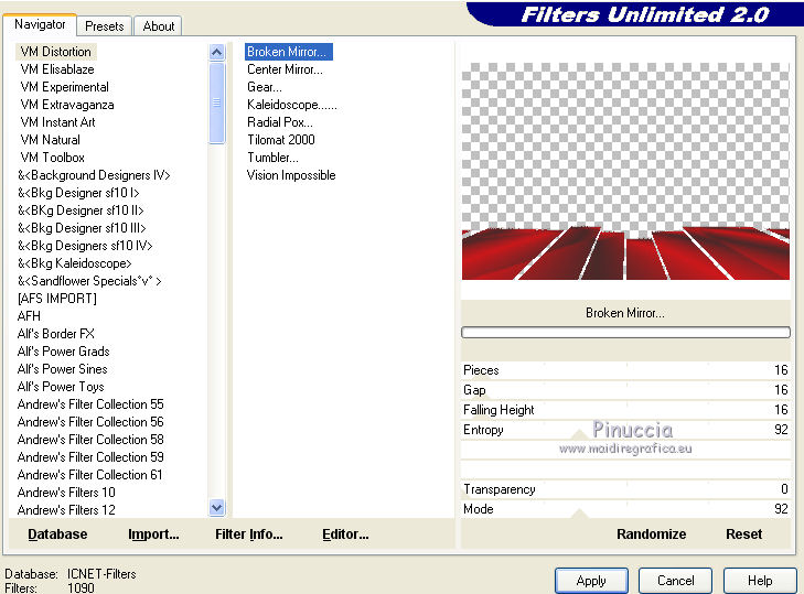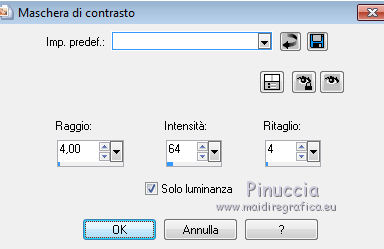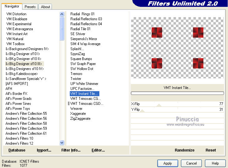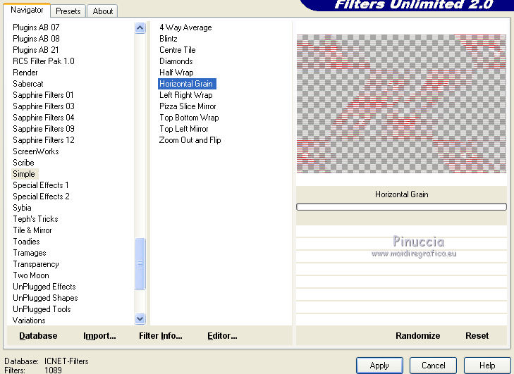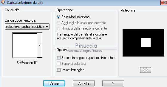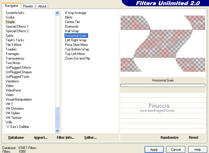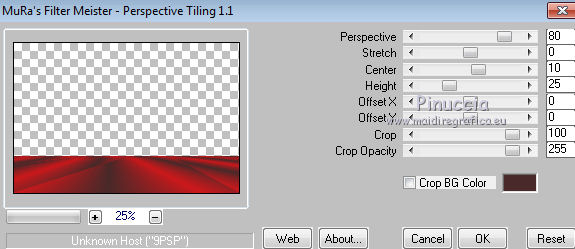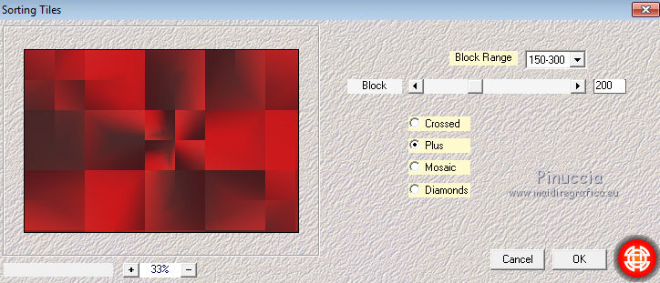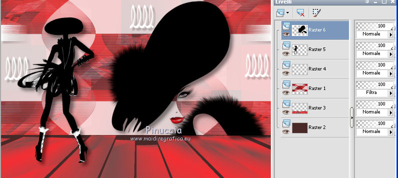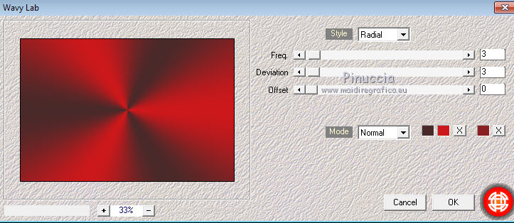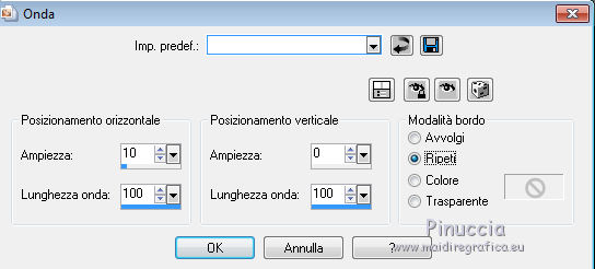 qui puoi trovare qualche risposta ai tuoi dubbi. Se l'argomento che ti interessa non è presente, ti prego di segnalarmelo. Questo tutorial è stato creato con CorelX6, ma può essere realizzato anche con le altre versioni di PSP. Dalla versione X4, il comando Immagine>Rifletti è stato sostituito con Immagine>Capovolgi in orizzontale, e il comando Immagine>Capovolgi con Immagine>Capovolgi in verticale. Nelle versioni X5 e X6, le funzioni sono state migliorate rendendo disponibile il menu Oggetti. Vedi la scheda sull'argomento qui Per tradurre questo tutorial ho usato PSP X. Occorrente: Materiale qui Per i tubes utilizzati grazie Macha e Grace. Filtri in caso di dubbi, ricorda di consultare la mia sezione filtri qui Filters Unlimited 2.0 qui Simple - Horizontal Grain qui VM Distortion - Broken Mirror qui &<Bkg Designer sf10III> - VMT Instant Tile (da importare in Unlimited) qui &<Bkg Designer sf10IV> - Lightburst (da importare in Unlimited) qui Mehdi - Wavy Lab, Sorting Tiles qui Mura's Meister - Perspective Tiling qui I filtri Simple e VM Distortion si possono usare da soli o importati in Filters Unlimited (come fare vedi qui) Se un filtro fornito appare con questa icona ![]() Se utilizzi altri tubes e/o altri colori, puoi sperimentare le modalità di miscelatura e opacità più adatte. Metti i pennelli nella cartella Pennelli. Attenzione, ogni pennello è composto da due files che non devono essere separati. Vedi gli appunti sui pennelli qui Se non vuoi appesantire la cartella dei Pennelli di PSP, puoi aggiungere nei Percorsi Files la cartella in cui hai salvato i pennelli. In questo modo, quando ti serviranno, non avrai nemmeno bisogno di cercarli, e quando non ti serviranno più, potrai rimuovere la cartella dai Percorsi. ![]() 1. Imposta il colore di primo piano con #cc181b, e il colore di sfondo con #492929. ![]() 2. Apri selections_alpha_irresistible. Non preoccuparti se ti appare questo messaggio. Clicca ok e il file si aprirà regolarmente. ![]() Duplica l'immagine usando la combinazione di tasti maiuscola+D. Chiudi l'originale e lavora sulla copia. L'immagine non è vuota, ma contiene le selezioni salvate sul canale alfa. Rinomina il livello Raster 1. una piccola curiosità, se rinomini il livello con la lettera minuscola - raster 1 - il programma assegnerà nuovamente il numero 1 al successivo livello. Se invece rinomini il livello con la lettera maiuscola - Raster 1 - il programma assegnerà al livello successivo il numero 2 3. Effetti>Plugins>Mehdi - Wavy Lab. questo filtro lavora con i colori della paletta; il primo è il colore di sfondo, il secondo quello di primo piano. Mantieni il terzo colore creato dal filtro. ![]() 4. Effetti>Plugins>Mehdi - Sorting Tiles. ![]() 5. Selezione>Carica/Salva selezione>Carica selezione da canale alfa. La selezione sélection#1 è subito disponibile. Devi soltanto cliccare Carica. ![]() 6. Selezione>Innalza selezione a livello. Selezione>Deseleziona. 7. Effetti>Plugins>Filters Unlimited 2.0 - &<Bkg Designer sf10III> - VMT Instant Tile. ![]() 8. Livelli>Duplica. Effetti>Effetti di immagine>Motivo unico, con i settaggi standard. ![]() 9. Effetti>Effetti geometrici>Inclina. ![]() 10. Cambia la modalità di miscelatura di questo livello in Filtra. ![]() 11. Livelli>Duplica. Immagine>Rifletti. Cambia la modalità di miscelatura del livello Selezione innalzata in Luce netta. (per cambiare proprietà dei livelli non occorre attivarli, quando la paletta si presenta come nella schermata sotto. Se vuoi visualizzare il menu dei livelli come nell'esempio, vedi qui). ![]() 12. Livelli>Unisci>Unisci tutto. Rinomina questo livello Raster 1. 13. Livelli>Duplica. Immagine>Ridimensiona, al 50%, tutti i livelli non selezionato. ![]() 14. Effetti>Effetti di immagine>Motivo unico, con i settaggi standard. ![]() 15. Effetti>Effetti di distorsione>Onda. ![]() 16. Livelli>Duplica. Immagine>Rifletti. Cambia la modalità di miscelatura del livello copia di Raster 1 in Luce netta ![]() 17. Assicurati di essere posizionato sul livello superiore. Imposta il colore di sfondo con il colore bianco (necessario per il risultato del prossimo filtro). Effetti>Plugins>Filters Unlimited 2.0 - Simple - Horizontal Grain. ![]() Se non avessi cambiato il colore di sfondo con il bianco, avresti avuto questo ![]() 18. Abbassa l'opacità di questo livello al 50% (o secondo i tuoi colori). ![]() Effetti>Effetti di bordo>Aumenta. 19. Attiva il livello sottostante - Copia di Raster 1. Regola>Messa a fuoco>Maschera di contrasto. ![]() 20. Attiva nuovamente il livello superiore. ![]() 21. Livelli>Duplica. Effetti>Effetti di immagine>Motivo unico, con i settaggi standard. ![]() Effetti>Effetti di bordo>Aumenta. Dovresti avere questo. ![]() 22. Livelli>Unisci>Unisci tutto. 23. Premi il tasto K per attivare lo strumento Puntatore ![]() se stai usando PSP 9 il tasto D per attivare lo strumento Deformazione ![]() in modalità Scala ![]() spingi il nodo inferiore centrale verso l'alto, fino a 450 pixels. (nella barra inferiore puoi controllare la posizione). ![]() Premi il tasto M per deselezionare lo strumento. ![]() 24. Livelli>Nuovo livello raster. Livelli>Disponi>Sposta giù. 25. Riporta il colore di sfondo al colore iniziale #492929, e riempi il livello con il colore di sfondo.26. Livelli>Nuovo livello raster. Passa il colore di primo piano a Gradiente di primo piano/sfondo, stile Lineare. ![]() Riempi il livello con il gradiente.27. Effetti>Plugins>Mura's Meister - Perspective Tiling. ![]() 28. Effetti>Plugins>Filters Unlimited 2.0 - VM Distortion - Broken Mirror, con i settaggi standard. ![]() 29. Effetti>Plugins>Filters Unlimited 2.0 - &<Bkg Designer sf10IV> - Lightburst, con i settaggi standard. ![]() 30. Attiva nuovamente il livello superiore. Cambia la modalità di miscelatura di questo livello in Filtra. ![]() 31. Imposta il colore di primo piano con il colore bianco #ffffff (o nero, secondo i tuoi colori). ![]() 32. Attiva lo strumento Pennello ![]() cerca e seleziona il pennello @