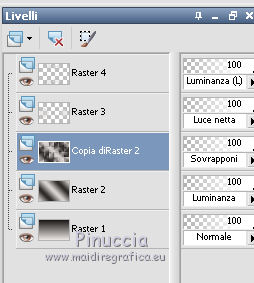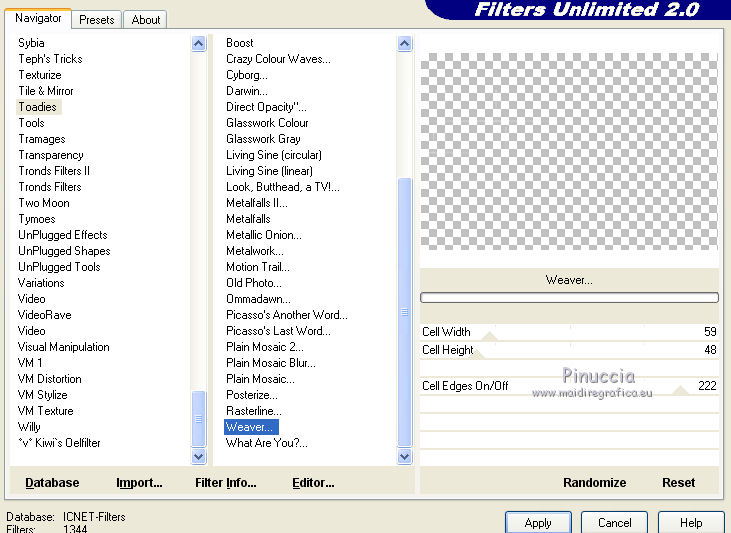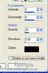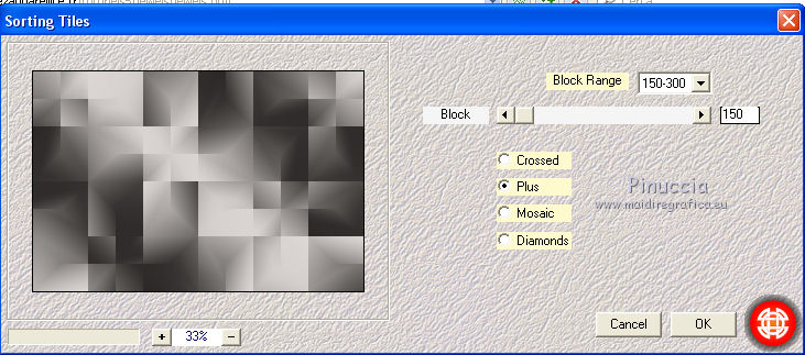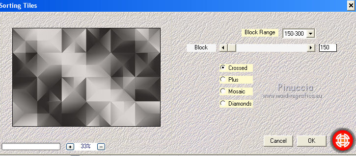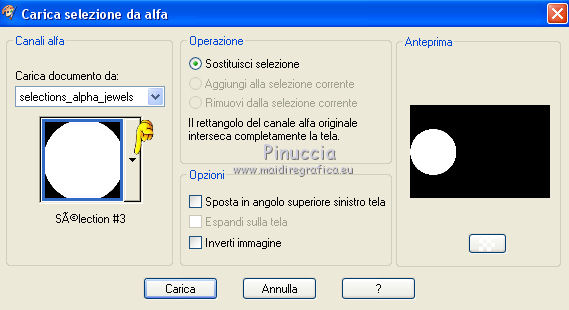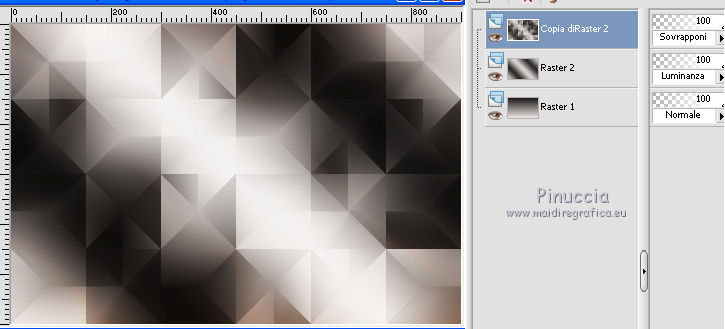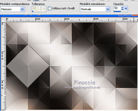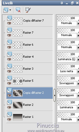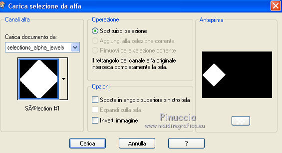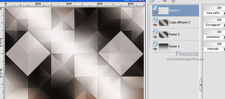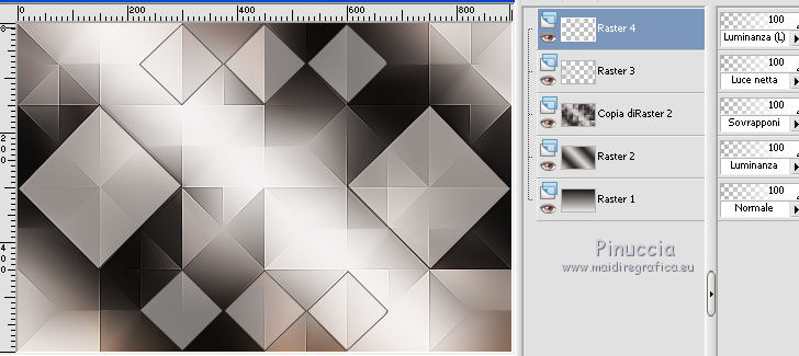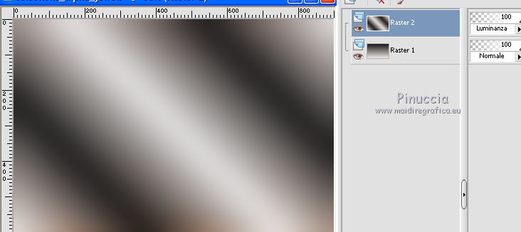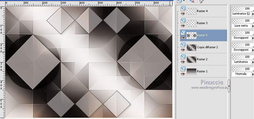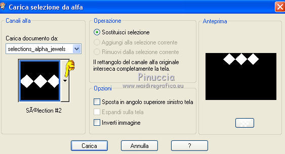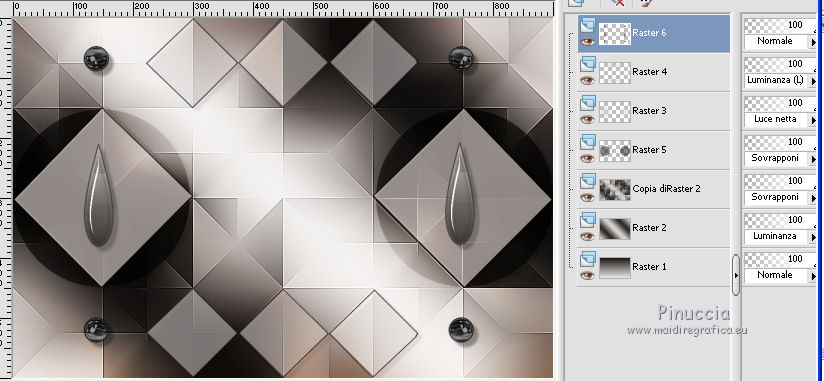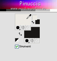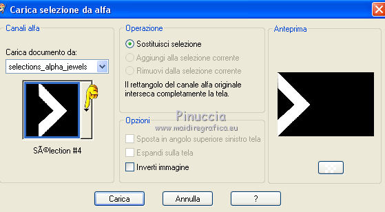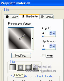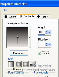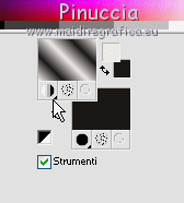 qui puoi trovare qualche risposta ai tuoi dubbi. Se l'argomento che ti interessa non è presente, ti prego di segnalarmelo. Questo tutorial è stato creato con CorelX7, ma può essere realizzato anche con le altre versioni di PSP. Dalla versione X4, il comando Immagine>Rifletti è stato sostituito con Immagine>Capovolgi in orizzontale, e il comando Immagine>Capovolgi con Immagine>Capovolgi in verticale. Nelle versioni X5 e X6, le funzioni sono state migliorate rendendo disponibile il menu Oggetti. Con la nuova versione X7, sono tornati Rifletti/Capovolgi, ma con nuove funzioni. Vedi la scheda sull'argomento qui Per tradurre questo tutorial ho usato PSP X. Occorrente: Materiale qui Per il tube della donna grazie Babette. Filtri in caso di dubbi, ricorda di consultare la mia sezione filtri qui Filters Unlimited 2.0 qui Mehdi - Sorting Tiles qui Flaming Pear - Flexify 2 qui Toadies - Weaver qui I filtri Toadies si possono usare da soli o importati in Filters Unlimited (come fare vedi qui) Se un filtro fornito appare con questa icona ![]() Se utilizzi altri tubes e/o altri colori, puoi sperimentare le modalità di miscelatura e opacità più adatte. Nelle ultime versioni di PSP non c'è il gradiente di primo piano/sfondo (Corel_06_029) Trovi i gradienti delle versioni precedenti qui 1. Imposta il colore di primo piano con #ede8e5, e il colore di sfondo con il colore #1b1817. ![]() Passa il colore di primo piano a Gradiente di primo piano/sfondo, stile Lineare. ![]() 2. Apri selections_alpha_jewels. Duplica l'immagine usando la combinazione di tasti maiuscola+D, ![]() oppure Modifica>Copia/Modifica>Incolla come nuova immagine. Chiudi l'originale e lavora sulla copia. L'immagine non è vuota, ma contiene le selezioni salvate sul canale alfa. 3. Riempi l'immagine trasparente con il gradiente.4. Livelli>Nuovo livello raster. Cambia i settaggi del gradiente. ![]() Riempi il livello con il gradiente.5. Regola>Sfocatura>Sfocatura gaussiana - raggio 35. ![]() Cambia la modalità di miscelatura di questo livello in Luminanza. ![]() 6. Livelli>Duplica. Effetti>Plugins>Mehdi - Sorting Tiles. ![]() 7. Ripeti Effetti>Plugins>Mehdi - Sorting Tiles, Crossed selezionato. ![]() 8. Cambia la modalità di miscelatura di questo livello in Sovrapponi. ![]() Effetti>Effetti di bordo>Aumenta di più. 9. Livelli>Nuovo livello raster. Selezione>Carica/Salva selezione>Carica selezione da canale alfa. La selezione sélection#1 è subito disponibile. Devi soltanto cliccare Carica. ![]() 10. Riempi la selezione con il colore scuro di sfondo #1b1817.11. Selezione>Modifica>Contrai - 2 pixels. ![]() Premi sulla tastiera il tasto CANC ![]() 12. Riporta il colore di primo piano a Colore: apri il menu della paletta e seleziona Colore. ![]() Abbassa l'opacità dello strumento Riempimento a 50 e riempi la selezione con il colore chiaro #ede8e5.![]() Selezione>Deseleziona. 13. Livelli>Duplica. Immagine>Rifletti. Livelli>Unisci>Unisci giù. Cambia la modalità di miscelatura di questo livello in Luce netta o secondo i tuoi colori. ![]() 14. Effetti>Effetti 3D>Sfalsa ombra. ![]() 15. Livelli>Nuovo livello raster. Selezione>Carica/Salva selezione>Carica selezione da canale alfa. Apri il menu delle selezioni e carica sélection#2. ![]() Riporta l'opacità dello strumento Riempimento a 100, ![]() e riempi la selezione con il colore scuro di sfondo #1b1817.16. Selezione>Modifica>Contrai - 2 pixels. ![]() Premi sulla tastiera il tasto CANC ![]() 17. Riporta l'opacità dello strumento Riempimento a 50 e riempi la selezione con il colore di primo piano #ede8e5.Selezione>Deseleziona. 18. Livelli>Duplica. Immagine>Capovolgi. Livelli>Unisci>Unisci giù. 19. Cambia la modalità di miscelatura di questo livello in Luminanza (esistente) o secondo i tuoi colori. ![]() 20. Effetti>Effetti 3D>Sfalsa ombra. ![]() 21. Attiva nuovamente il livello copia di Raster 2. ![]() Livelli>Nuovo livello raster. Selezione>Carica/Salva selezione>Carica selezione da canale alfa. Apri il menu delle selezioni e carica sélection#3. ![]() Riempi la selezione con il colore scuro, opacità sempre a 50 Selezione>Deseleziona. 22. Livelli>Duplica. Immagine>Rifletti. Livelli>Unisci>Unisci giù. 23. Effetti>Effetti 3D>Sfalsa ombra, con i settaggi precedenti. ![]() Cambia la modalità di miscelatura di questo livello in Sovrapponi. ![]() 24. Attiva nuovamente il livello superiore. Apri il tube 6_hewels e vai a Modifica>Copia. Torna al tuo lavoro e vai a Modifica>Incolla come nuovo livello. Lascialo come sta. E' al suo posto. ![]() 25. Livelli>Nuovo livello raster. Selezione>Carica/Salva selezione>Carica selezione da canale alfa. Carica nuovamente la selezione sélection#1. ![]() 26. Imposta il colore di primo piano con il colore bianco: clicca con il tasto destro del mouse sulla paletta del colore e avrai la tabella dei colori recenti: il nero e il bianco sono sempre gli ultimi due colori della tabella. Clicca sulla palettina del colore per impostarlo. ![]() Riporta l'opacità dello strumento Riempimento a 100 e riempi la selezione con il colore bianco.Selezione>Modifica>Contrai - 2 pixels. ![]() Premi sulla tastiera il tasto CANC ![]() Selezione>Deseleziona. 27. Effetti>Plugins>Toadies - Weaver. ![]() 28. Livelli>Duplica. Effetti>Effetti 3D>Sfalsa ombra. ![]() 29. Attiva nuovamente il livello copia di Raster 2. ![]() Selezione>Carica/Salva selezione>Carica selezione da canale alfa. Apri il menu delle selezioni e carica sélection#4. ![]() 30. Livelli>Nuovo livello raster. Imposta nuovamente il colore di primo piano con il colore chiaro #ede8e5. Riempi la selezione con il colore chiaro, opacità 100 Selezione>Deseleziona. 31. Effetti>Plugins>Flaming Pear - Flexify 2. ![]() 32. Livelli>Duplica. Immagine>Rifletti. Immagine>Capovolgi. Livelli>Unisci>Unisci giù. 33. Effetti>Effetti 3D>Sfalsa ombra. ![]() 34. Attiva il livello superiore. Apri il tube babette-306-14 e vai a Modifica>Copia. Torna al tuo lavoro e vai a Modifica>Incolla come nuovo livello. 35. Effetti>Effetti 3D>S