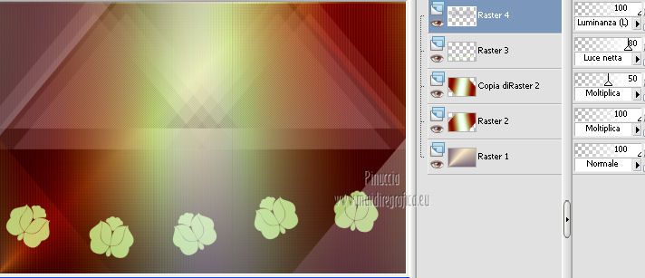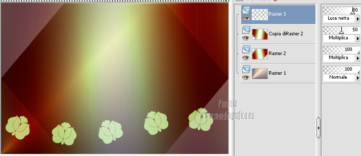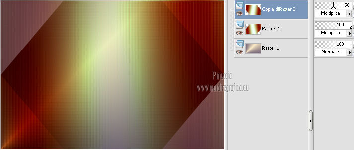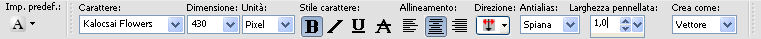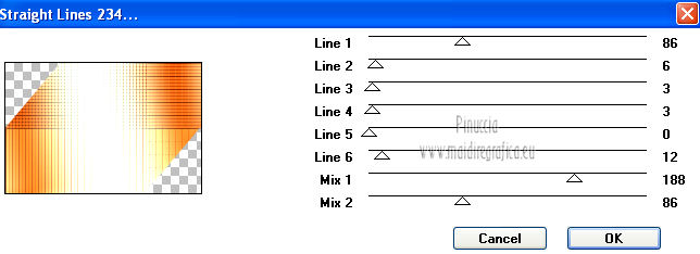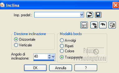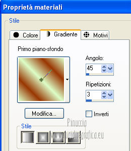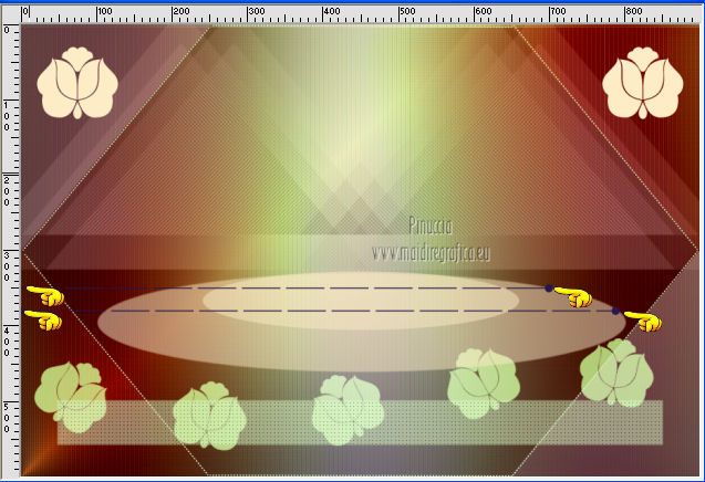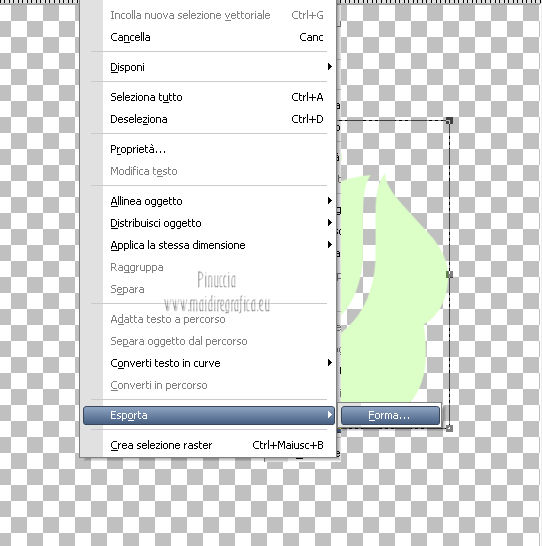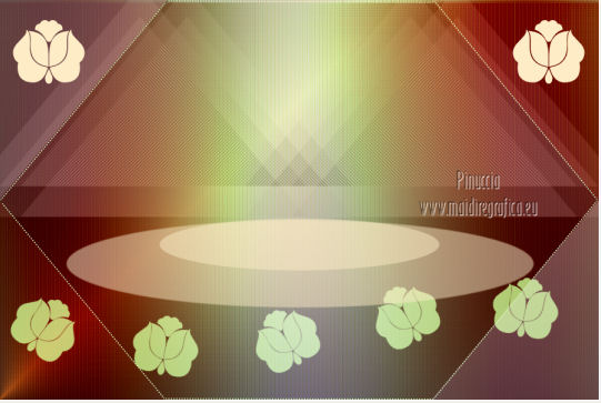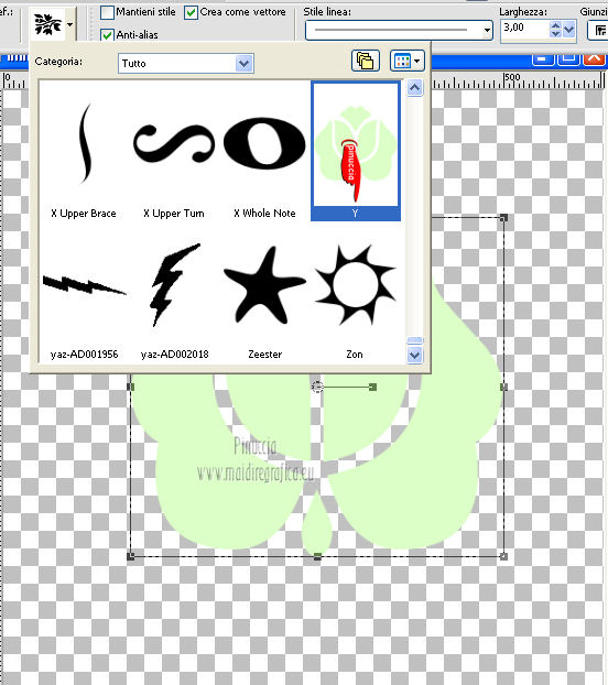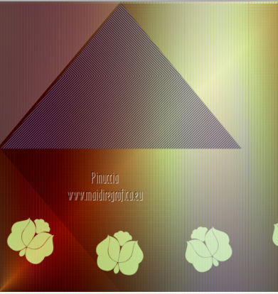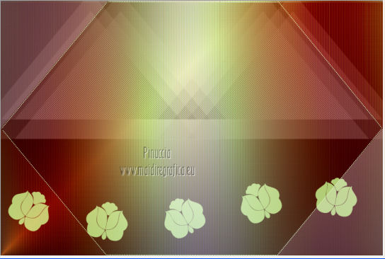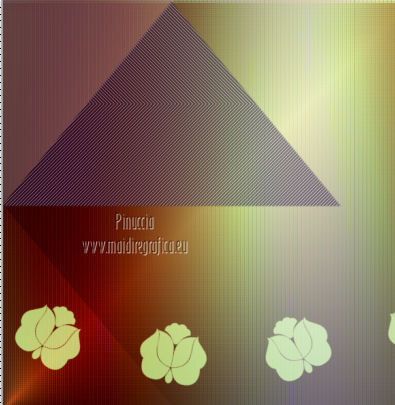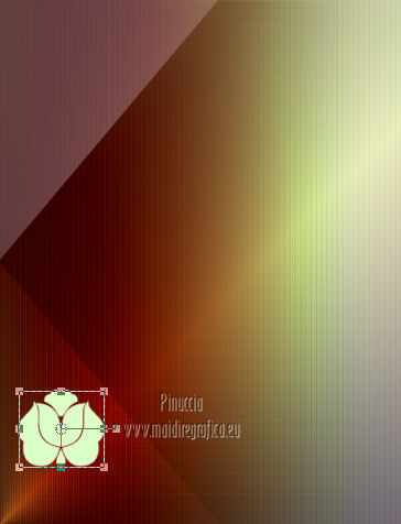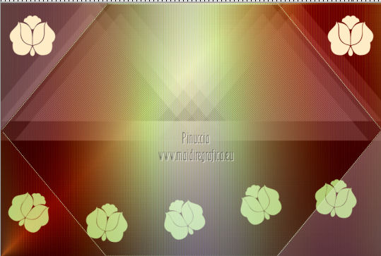 qui puoi trovare qualche risposta ai tuoi dubbi. Se l'argomento che ti interessa non è presente, ti prego di segnalarmelo. Questo tutorial è stato creato con PSP X3, ma può essere eseguito anche con le altre versioni di PSP. Per tradurlo, ho usato PSP X. Occorrente: Materiale qui Per il tube grazie Athenais. Lascia intatto il nome del tube. Il © appartiene all'artista originale. Mantieni il credito di chi ha creato il tube. Filtri in caso di dubbi, ricorda di consultare la mia sezione filtri qui Filters Unlimited 2.0 qui Andrew's Filters 51 qui Ap Lines - SilverLining qui Toadies qui Mehdi qui Mura's Meister - Copies qui I filtri Andrew's per essere usati devono prima essere convertiti. Come fare vedi qui Si possono usare da soli o importati in Filters Unlimited (come fare vedi qui) Anche i filtri Toadies si possono usare da soli o importati in Unlimited ![]() Metti @qua9 e @qua100 nella cartella Linee di stile. Metti le selezioni nella cartella Selezioni. ***** Prima di iniziare, andiamo a creare una forma predefinita. (naturalmente, se vorrai, potrai usare un'altra forma a tua scelta). Apri una nuova immagine trasparente 600 x 600 pixels. Apri il font Kalocsai Flowers e avrai anche un'anteprima delle forme offerte dal font. Clicca sul segno - per minimizzarlo. ![]() Imposta il colore di sfondo con #dcfdc7 .Attiva lo strumento Testo ![]() e lo troverai nella lista dei font disponibili. Seleziona il font con i seguenti settaggi. ![]() Quando hai scelto il fiore (per l'esempio è la lettera "Y"), clicca Applica per chiudere la finestra del testo. Usa la griglia dello strumento per posizionare la lettera al centro della tela. ![]() Non convertire il testo. Clicca con il tasto destro del mouse sulla tela, e nel menu che si aprirà seleziona Converti in percorso ![]() Clicca nuovamente con il tasto destro del mouse per riaprire il menu, e questa volta clicca su Esporta>Forma ![]() Assegna un nome alla forma ![]() non preoccuparti della scelta, perchè alla fine il programma assegnerà alla forma la lettera usata per crearla). Infatti attivando lo strumento Forme predefinite ![]() troverai il tuo fiore verde sotto la denominazione "y". ![]() Adesso puoi chiudere, senza salvare, l'immagine 600x600 che ti è servita per creare la forma. ***** 1. Imposta il colore di primo piano con #fdecc7 ,e il colore di sfondo con #28184a .![]() Passa il colore di primo piano a Gradiente, stile Radiale. ![]() 2. Apri una nuova immagine trasparente 900 x 600 pixels, e riempila con il gradiente.3. Livelli>Nuovo livello raster. Imposta il colore di primo piano con #dcfdc7, ![]() e il colore di sfondo con #993703. ![]() ![]() Passa il colore di primo piano a Gradiente, stile Lineare. ![]() Riempi il livello con il gradiente.4. Regola>Sfocatura>Sfocatura gaussiana - raggio 30. ![]() 5. Effetti>Effetti geometrici>Inclina. ![]() 6. Effetti>Plugins>Andrew's Filters - Straight Lines 234, con i settaggi standard. ![]() Cambia la modalità di miscelatura di questo livello livello in Moltiplica. 7. Livelli>Duplica. Immagine>Rifletti. Lascia la modalità di miscelatura di questo livello in Moltiplica, e abbassa l'opacità al 50%. ![]() 8. Imposta il colore di primo piano e il colore di sfondo con #dcfdc7. ![]() 9. Attiva lo strumento Forme predefinite ![]() cerca e seleziona la forma creata prima di iniziare, e applicala nell'angolo in basso a sinistra. ![]() Livelli>Converti in livello raster. 10. Effetti>Plugins>Mura's Meister - Copies. ![]() Cambia la modalità di miscelatura di questo livello in Luce netta, e abbassa l'opacità all'80%. ![]() 11. Livelli>Nuovo livello raster. Selezione>Carica/Salva selezione>Carica selezione da disco. Cerca e carica la selezione @qua_fig493. ![]() Imposta il colore di primo piano con #28184a .Imposta l'opacità dello strumento riempimento con 50 ![]() Riempi la selezione con il colore di primo piano.12. Effetti>Plugins>AP Lines - Lines SilverLining. Arrow. ![]() Selezione>Deseleziona. Se il triangolo è leggermente sfalsato, come in questo caso ![]() Spostalo leggermente.![]() 13. Livelli>Duplica. Immagine>Rifletti. Livelli>Unisci>Unisci giù. 14. Effetti>Plugins>Toadies - What are you, con i settaggi standard. ![]() Cambia la modalità di miscelatura di questo livello in Luminanza, o Filtra, secondo i tuoi colori. Per il mio esempio ho usato Luminanza (esistente). ![]() 15. Attiva lo strumento Penna ![]() seleziona la linea di stile @qua100, larghezza 2. ![]() Imposta il colore di primo piano con #dcfdc7, ![]() e traccia un'esagono come nell'esempio. ![]() Livelli>Converti in livello raster. 16. Importa colore di primo piano e colore di sfondo con #fdecc7 .![]() Attiva nuovamente lo strumento Forme predefinite ![]() e traccia la forma in alto a sinistra, come nell'esempio. ![]() 17. Livelli>Duplica. Immagine>Rifletti. ![]() 18. Livelli>Nuovo livello raster. Selezione>Carica/Salva selezione>Carica selezione da disco. Cerca e carica la selezione @qua_fig494. ![]() Riempi la selezione con il colore #fdecc7 ,sempre con l'opacità a 50. Selezione>Deseleziona. 19. Livelli>Duplica. Immagine>Ridimensiona, al 60%, tutti i livelli non selezionato. 20. Sposta leggermente in basso l'ellisse,per farne combaciare il bordo con quella più grande. Eventualmente, dopo aver attivato lo strumento Spostamento, usa le frecce della tastiera Sull'uso delle frecce abbinato allo strumento Spostamento vedi qui ![]() 21. Livelli>Nuovo livello raster. Selezione>Carica/Salva selezione>Carica selezione da disco. Cerca e carica la selezione @qua_fig496. ![]() Riempi la selezione con #dcfdc7 ![]() opacità 50. 22. Effetti>Plugins>AP Lines - Lines SilverLining. Dotty Grid. ![]() Selezione>Deseleziona. 23. Attiva nuovamente lo strumento Penna ![]() linea di stile @qua9, larghezza 2 ![]() Imposta il colore di primo piano con #28184a ,e traccia due linee: una a 350 pixels, e una a 380 pixels, come nell'esempio. ![]() Livelli>Converti in livello raster. 24. Effetti>Effetti di distorsione>Coordinate polari. ![]() 25.