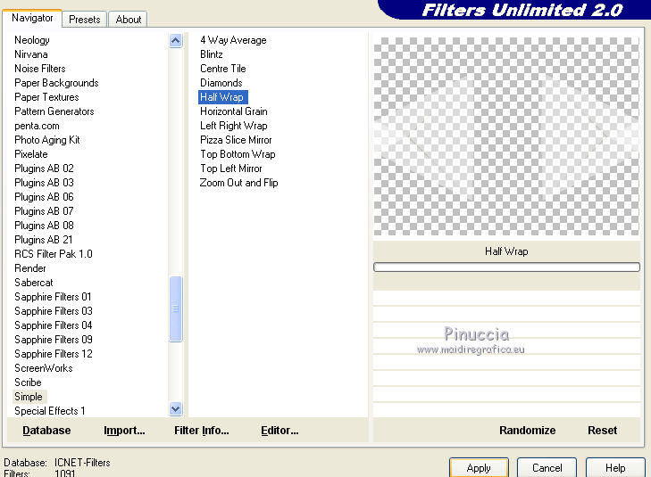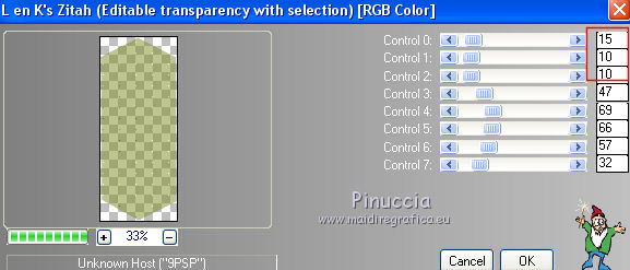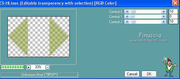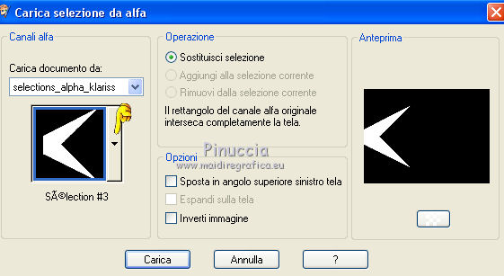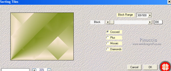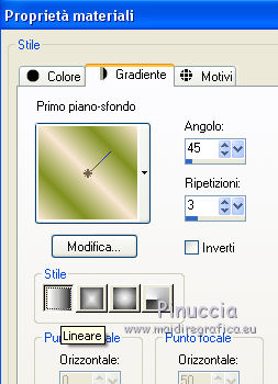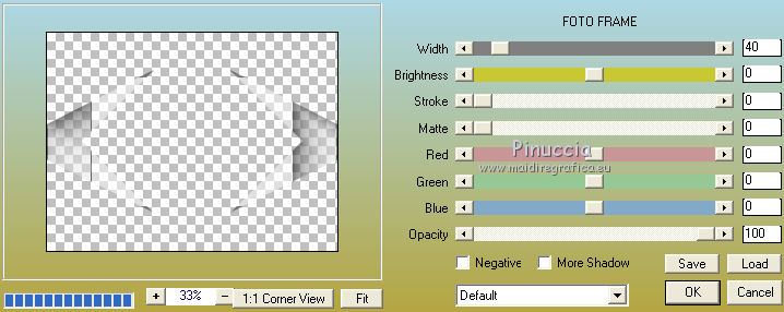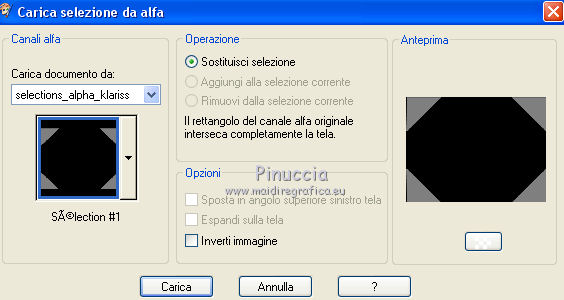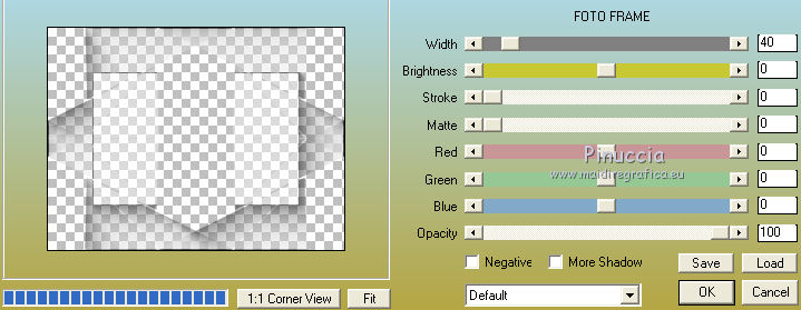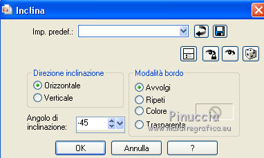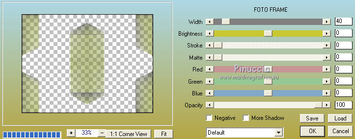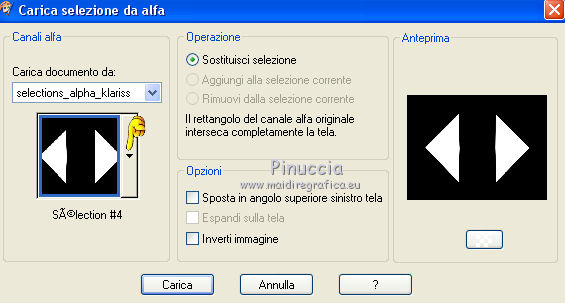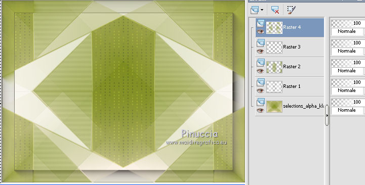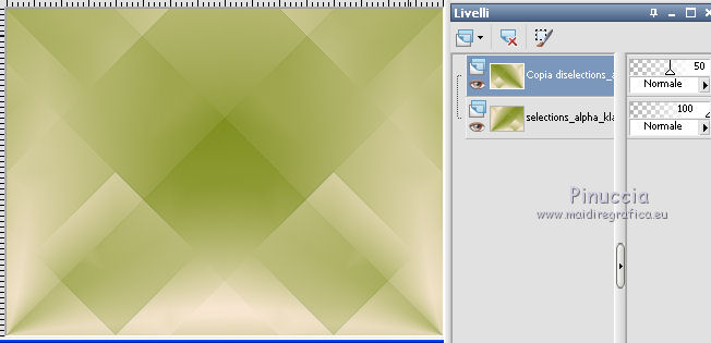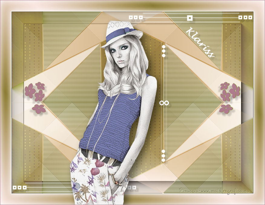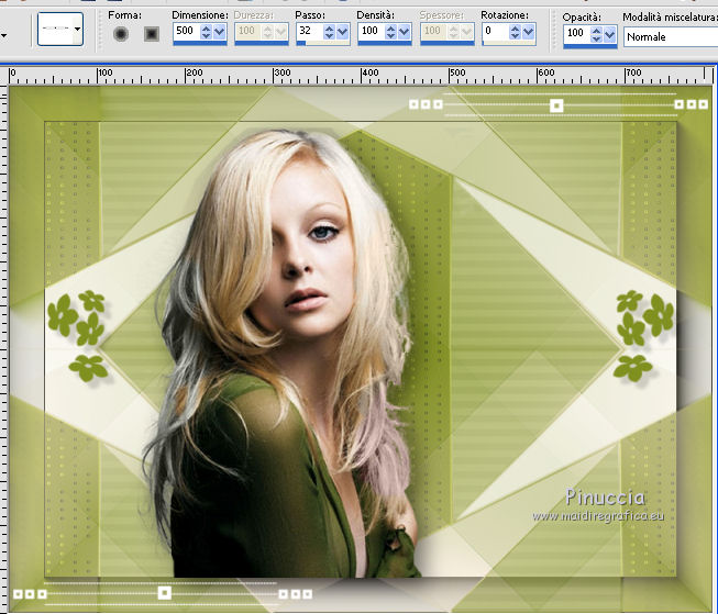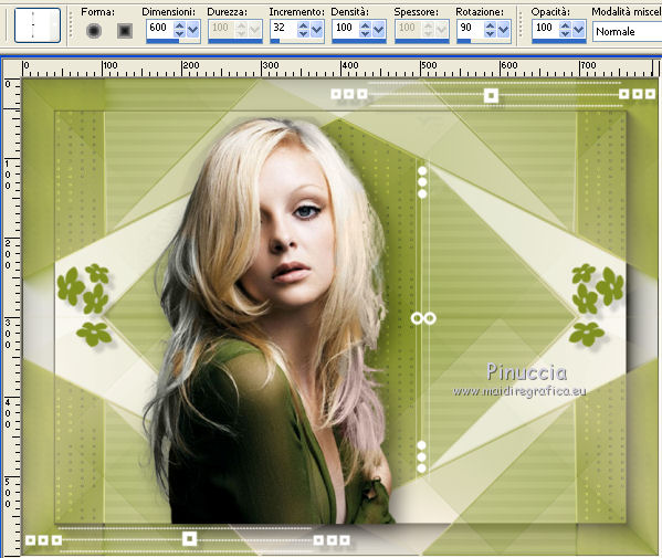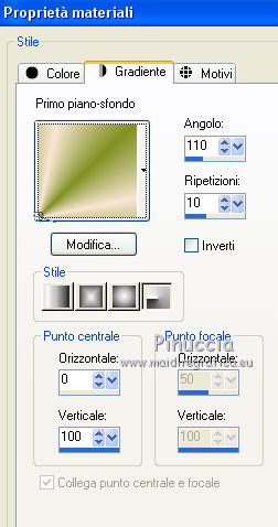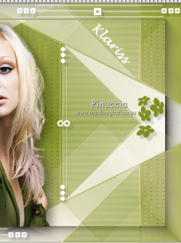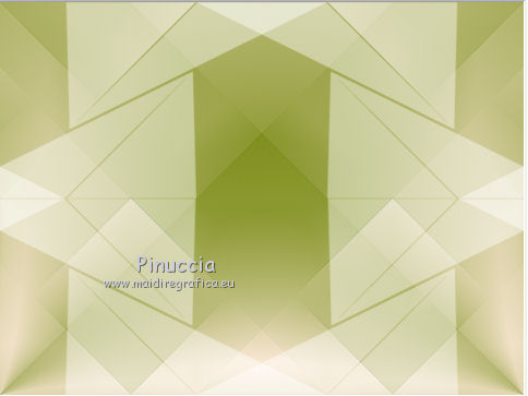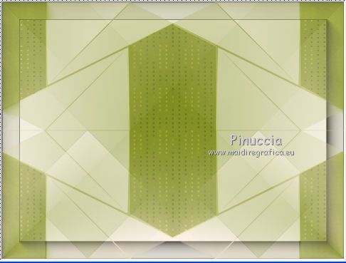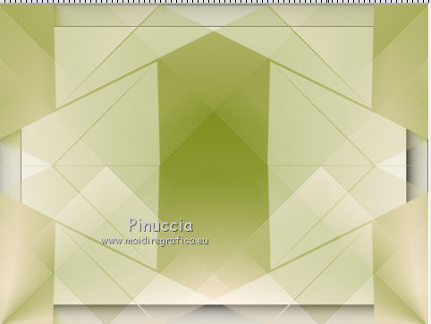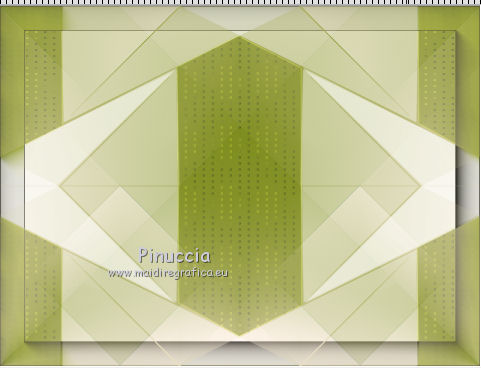 qui puoi trovare qualche risposta ai tuoi dubbi. Se l'argomento che ti interessa non è presente, ti prego di segnalarmelo. Questo tutorial è stato creato con CorelX6, ma può essere realizzato anche con le altre versioni di PSP. Dalla versione X4, il comando Immagine>Rifletti è stato sostituito con Immagine>Capovolgi in orizzontale, e il comando Immagine>Capovolgi con Immagine>Capovolgi in verticale. Nelle versioni X5 e X6, le funzioni sono state migliorate rendendo disponibile il menu Oggetti. Vedi la scheda sull'argomento qui Per tradurre questo tutorial ho usato PSP X. Occorrente: Materiale qui Il tube è di Aquarellice. Filtri in caso di dubbi, ricorda di consultare la mia sezione filtri qui Filters Unlimited 2.0 qui AAA Frames - Foto Frame qui Simple - Half Wrap qui L&K's - L&K's Zitah qui Carolaine and Sensibility - CS-Hlines qui Mehdi - Sorting Tiles qui I filtri Simple si possono usare da soli o importati in Filters Unlimited (come fare vedi qui) Se un filtro fornito appare con questa icona ![]() Se utilizzi altri tubes e/o altri colori, puoi sperimentare le modalità di miscelatura e opacità più adatte. Metti i pennelli nella cartella Pennelli. Attenzione, ogni pennello è composto da due files che non devono essere separati. Vedi gli appunti sui pennelli qui 1. Imposta il colore di primo piano con #f8e7d3, e il colore di sfondo con #809020. ![]() Passa il colore di primo piano a Gradiente di primo piano/sfondo, stile Radiale. ![]() 2. Apri selections_alpha_klariss. Duplica l'immagine usando la combinazione di tasti maiuscola+D. Chiudi l'originale e lavora sulla copia. L'immagine non è vuota, ma contiene le selezioni salvate sul canale alfa. Rinomina questo livello Raster 1 (facoltativo). una piccola curiosità, se rinomini il livello con la lettera minuscola - raster 1 - il programma assegnerà nuovamente il numero 1 al successivo livello. Se invece rinomini il livello con la lettera maiuscola - Raster 1 - il programma assegnerà al livello successivo il numero 2 3. Riempi l'immagine trasparente con il gradiente.4. Effetti>Plugins>Mehdi - Sorting Tiles. ![]() 5. Effetti>Effetti di bordo>Aumenta. 6. Livelli>Duplica. Immagine>Rifletti. Abbassa l'opacità di questo livello al 50%. ![]() 7. Livelli>Unisci>Unisci giù. 8. Selezione>Carica/Salva selezione>Carica selezione da canale alfa. La selezione sélection#1 è subito disponibile. Devi soltanto cliccare Carica. ![]() 9. Imposta il colore di primo piano con il colore bianco #ffffff, e riempi (cliccando due volte) la selezione con questo colore.Selezione>Deseleziona. 10. Effetti>Effetti geometrici>Inclina. ![]() Risultato. ![]() 11. Livelli>Duplica. Immagine>Rifletti. Livelli>Unisci>Unisci giù. ![]() 12. Livelli>Duplica. Effetti>Plugins>Filters Unlimited 2.0 - Simple - Half Wrap. ![]() 13. Livelli>Unisci>Unisci giù. Risultato. ![]() 14. Effetti>Plugins>AAA Frames - Foto frame. ![]() Risultato ![]() 15. Livelli>Nuovo livello raster. Selezione>Carica/Salva selezione>Carica selezione da canale alfa. Apri il menu delle selezioni e carica sélection#2. ![]() 16. Abbassa l'opacità dello strumento Riempimento a 50 ![]() Riempi la selezione con il colore scuro di sfondo #809020.17. Effetti>Plugins>L&K's - L&K's Zitah. ![]() 18. Effetti>Effetti di bordo>Aumenta di più. Selezione>Deseleziona. 19. Effetti>Effetti di immagine>Motivo unico. ![]() 20. Effetti>Plugins>AAA Frames - Foto Frame, con i settaggi precedenti. ![]() Risultato. ![]() 21. Livelli>Nuovo livello raster. Selezione>Carica/Salva selezione>Carica selezione da canale alfa. Apri il menu delle selezioni e carica sélection#3. ![]() Riempi la selezione con il colore bianco #ffffff,opacità sempre a 50 Selezione>Deseleziona. 22. Livelli>Duplica. Immagine>Rifletti. Livelli>Unisci>Unisci giù. 23. Effetti>Plugins>AAA Frames - Foto frame, con i settaggi precedenti. ![]() Risultato. ![]() 24. Livelli>Nuovo livello raster. Selezione>Carica/Salva selezione>Carica selezione da canale alfa. Apri il menu delle selezioni e carica sélection#4. ![]() Riempi con il colore scuro di sfondo #809020,opacità sempre a 50 25. Effetti>Plugins>Carolaine and Sensibility - CS-HLines. ![]() Selezione>Deseleziona. 26. Effetti>Effetti di immagine>Motivo unico, con i settaggi precedenti. ![]() Risultato. ![]() 27. Apri il tube della donna Aqua_femme5, e vai a Modifica>Copia. Torna al tuo lavoro e vai a Modifica>Incolla come nuovo livello. Immagine>Ridimensiona, 2 volte all'80%, tutti i livelli non selezionato. ![]() 28. Effetti>Effetti di immagine>Scostamento. ![]() 29. Effetti>Effetti 3D>Sfalsa ombra. ![]() 30. Livelli>Nuovo livello raster. Attiva lo strumento Pennello ![]() cerca e seleziona il pennello @M&M_Floral-066, e applicalo a sinistra, come nell'esempio sotto, cliccando con il tasto destro del mouse per usare il colore di sfondo #809020. ![]() 31. Livelli>Duplica. Immagine>Rifletti. Livelli>Unisci>Unisci giù. 32. Effetti>Effetti 3D>Sfalsa ombra. ![]() 33. Livelli>Nuovo livello raster. Seleziona il pennello @qua-trace_carres 2, e applicalo in alto a destra, come nell'esempio, cliccando con il tasto sinistro del mouse per usare il colore bianco di primo piano. ![]() Se il tuo PSP non supporta pennelli superiori a 500 pixels, imposta la dimensione massima e, dopo averlo applicato: ![]() Immagine>Ridimensiona, al 120%, tutti i livelli non selezionato. Posiziona correttamente il pennello come nell'esempio.34. Livelli>Duplica. Immagine>Capovolgi. Immagine>Rifletti. Livelli>Unisci>Unisci giù. 35. Effetti>Effetti 3D>Sfalsa ombra, con i settaggi precedenti. ![]() 36. Seleziona il pennello @qua_trace_ronds2, rotazione 90, e applicalo sulla linea, come nell'esempio, cliccando con il tasto sinistro del mouse, per usare il colore bianco di primo piano. ![]() se il tuo PSP non supporta pennelli superiori a 500 pixels, imposta la dimensione massima e, dopo aver applicato il pennello, attiva lo strumento Puntatore ![]() e allarga il pennello usando i nodi centrali come nell'esempio. ![]() 37. Effetti>E