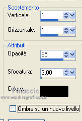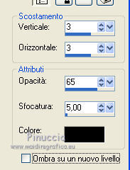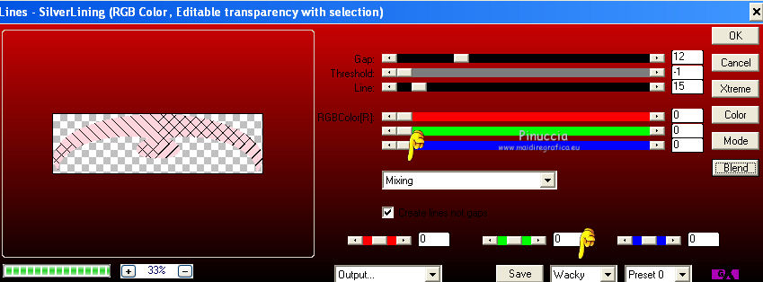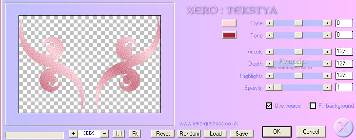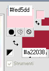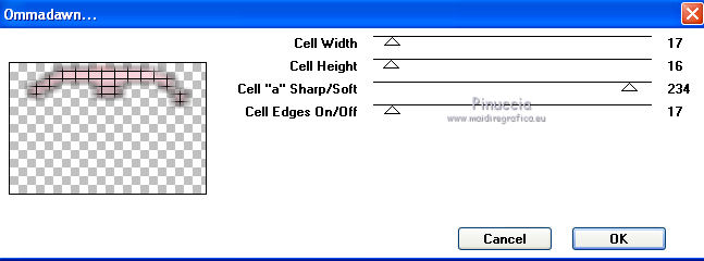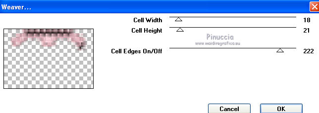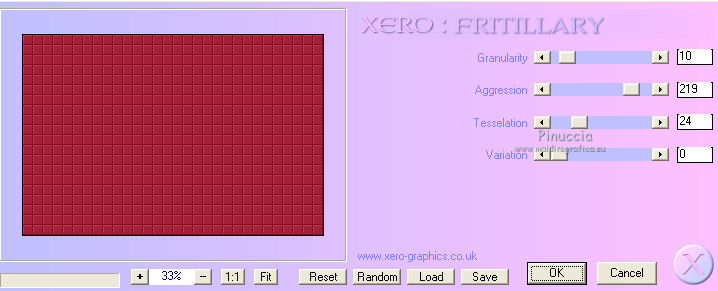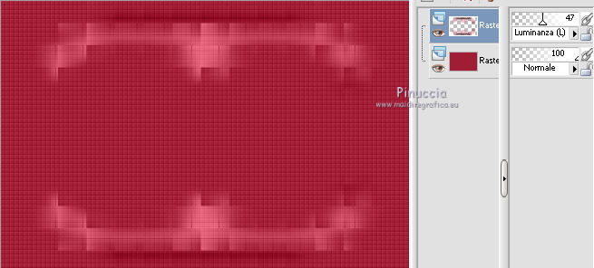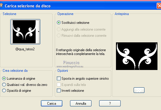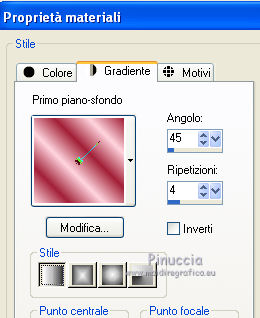 qui puoi trovare qualche risposta ai tuoi dubbi. Se l'argomento che ti interessa non è presente, ti prego di segnalarmelo. Questo tutorial è stato creato con PSP X3, ma può essere eseguito anche con le altre versioni di PSP. Per tradurlo, ho usato PSP X. Occorrente: Materiale qui Per il tube della donna grazie Nikita. Grazie a tutti i creatori di tubes che con il loro meraviglioso lavoro, permettono di creare questi tutorials. Lascia intatto il nome del tube. Il © appartiene all'artista originale. Mantieni il credito di chi ha creato il tube. Filtri in caso di dubbi, ricorda di consultare la mia sezione filtri qui Xero - Fritillary qui Xero - Tekstya qui Toadies - Ommadawn, Weaver qui Alien Skin Eye Candy 5 Impact qui AP Innovations - Lines Silverlining qui Graphics Plus - Cross Shadow qui ![]() Metti le selezioni nella cartella Selezioni. 1. Imposta il colore di primo piano con il colore #chiaro #fed5dd, e il colore di sfondo con il colore scuro #a22038. ![]() 2. Apri una nuova immagine trasparente 900 x 600 pixels, e riempila con il colore scuro.3. Effetti>Plugins>Xero - Fritillary. ![]() 4. Livelli>Nuovo livello raster. Selezione>Carica/Salva selezione>Carica selezione da disco. Cerca e carica la selezione @qua_sat. ![]() Riempi la selezione con il colore chiaro.5. Effetti>Plugins>AP Innovations - SilverLining. Seleziona Mixing e Wacky con i seguenti settaggi. ![]() Selezione>Deseleziona. 6. Effetti>Plugins>Toadies - Ommadawn, con i settaggi standard. ![]() 7. Effetti>Plugins>Toadies - Weaver. ![]() 8. Livelli>Duplica. Immagine>Capovolgi. Livelli>Unisci>Unisci giù. Cambia la modalità di miscelatura di questo livello in Luminanza (esistente), e abbassa l'opacità al 47%. ![]() 9. Effetti>Effetti 3D>Sfalsa ombra. ![]() 10. Livelli>Nuovo livello raster. Selezione>Carica/Salva selezione>Carica selezione da disco. Carica nuovamente la selezione @qua_tatoo2. ![]() 11. Passa il colore di primo piano a Gradiente, stile Lineare. ![]() Riempi la selezione con il gradiente.12. Effetti>Plugins>Xero - Tekstya, con i settaggi standard. ![]() 13. Effetti>Effetti 3D>Sfalsa ombra. ![]() Selezione>Deseleziona. 14. Livelli>Nuovo livello raster. Selezione>Carica/Salva selezione>Carica selezione da disco. Cerca e carica la selezione @scales. ![]() Riempi la selezione con il gradiente.15. Effetti>Effetti 3D>Sfalsa ombra, con i settaggi precedenti. ![]() Selezione>Deseleziona. 16. Livelli>Nuovo livello raster. Selezione>Carica/Salva selezione>Carica selezione da disco. Cerca e carica la selezione @qua_cible. ![]() Riporta il colore di primo piano al colore iniziale, ingrandisci l'immagine per visualizzare meglio lo spazio da riempire, e riempi la selezione con il colore chiaro di primo piano.17. Effetti>Effetti 3D>Sfalsa ombra. ![]() Selezione>Deseleziona. 18. Apri il tube 12479954834_femmes e vai a Modifica>Copia. Torna al tuo lavoro e vai a Modifica>Incolla come nuovo livello. Immagine>Ridimensiona, all'80%, tutti i livelli non selezionato. Non spostarlo. E' già correttamente posizionato. 19. Effetti>Effetti 3D>Sfalsa ombra, con i settaggi standard. ![]() 20. Immagine>Aggiungi bordatura, 2 pixels, simmetriche, con il colore chiaro. Immagine>Aggiungi bordatura, 25 pixels, simmetriche, con il colore scuro. Seleziona il bordo scuro con la bacchetta magica .Selezione>Innalza selezione a livello. 21. Passa nuovamente il colore di primo piano a Gradiente, stile Sprazzo di luce. ![]() Riempi la selezione con il gradiente.22. Effetti>Plugins>Graphics Plus - Cross Shadow, con i settaggi standard. ![]() 23. Selezione>Inverti. Effetti>Plugins>Alien Skin Eye Candy 5 Impact - Perspective Shadow. Seleziona il preset Drop Shadow, Blurry e ok. ![]() Selezione>Deseleziona. 24. Immagine>Aggiungi bordatura, 2 pixels, simmetriche, con il colore chiaro. Firma il tuo lavoro. Ridimensiona, se vuoi. 25. Regola>Messa a fuoco>Maschera di contrasto. ![]() Per questi esempi ho usato tubes di Guismo. ![]() ![]() ![]() Se hai problemi o dubbi, o trovi un link non funzionante, o anche soltanto per un saluto, scrivimi. 30 Maggio 2012 |