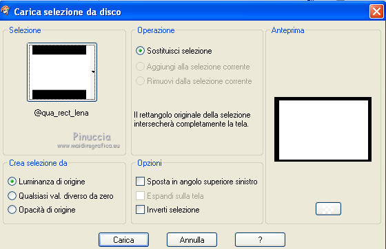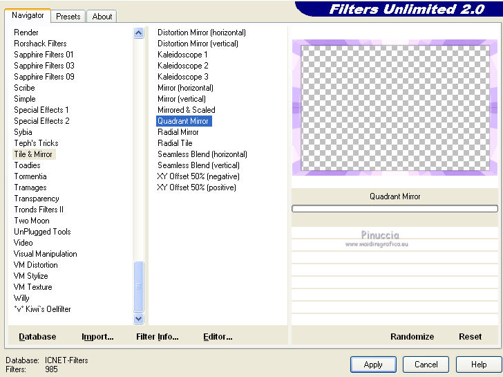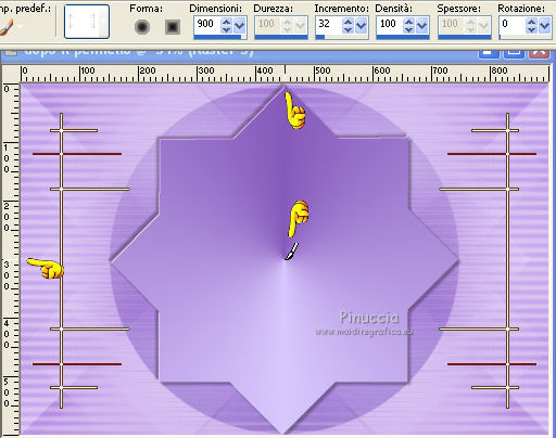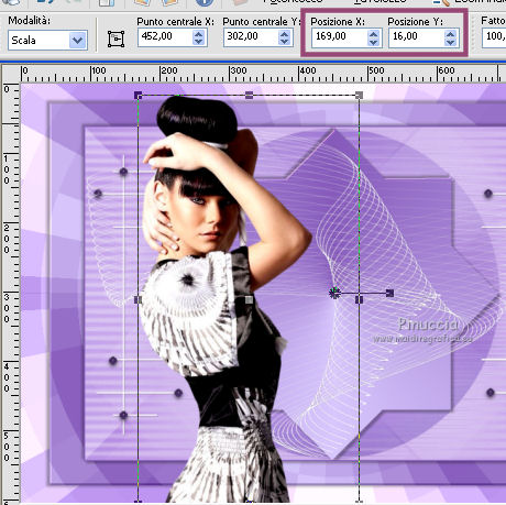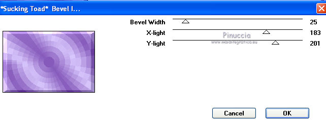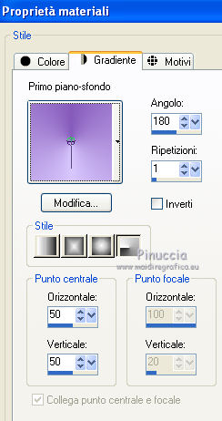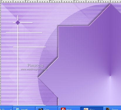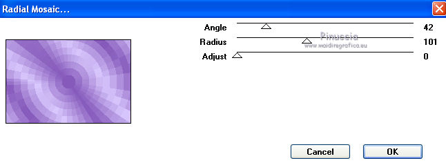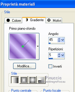 qui puoi trovare qualche risposta ai tuoi dubbi. Se l'argomento che ti interessa non è presente, ti prego di segnalarmelo. Questo tutorial è stato creato con PSP X3, ma può essere eseguito anche con le altre versioni di PSP. Per tradurlo, ho usato PSP X. Occorrente: Materiale qui Per i tubes grazie ClaudiaViza. Grazie a tutti i creatori di tubes che con il loro meraviglioso lavoro, permettono di creare questi tutorials. Lascia intatto il nome del tube. Il © appartiene all'artista originale. Mantieni il credito di chi ha creato il tube. Filtri in caso di dubbi, ricorda di consultare la mia sezione filtri qui VM Toolbox qui Simple qui VM Instant Art qui Graphics Plus qui Alien Skin Eye Candy 5 Impact qui Dragonfly - Sinedots II qui Toadies qui Filters Unlimited 2.0 qui ![]() Metti le selezioni nella cartella Selezioni. 1. Imposta il colore di primo piano con il colore chiaro #d8c7fd, e il colore di sfondo con il colore scuro #865abb. ![]() Passa il colore di primo piano a Gradiente, stile Lineare. ![]() 2. Apri una nuova immagine trasparente 900 x 600 pixels, e riempila con il gradiente.3. Regola>Sfocatura>Sfocatura gaussiana - raggio 45. ![]() 4. Effetti>Plugins>VM Toolbox - Brightness Noise. ![]() 5. Effetti>Plugins>Simple - Blintz. 6. Livelli>Duplica. Immagine>Capovolgi. Abbassa l'opacità di questo livello al 50%. Livelli>Unisci>Unisci giù. 7. Effetti>Plugins>VM Instant Art - Tripolis, con i settaggi standard. ![]() 8. Livelli>Duplica. Immagine>Capovolgi. Abbassa l'opacità di questo livello al 50%. Livelli>Unisci>Unisci giù. 9. Livelli>Duplica. Effetti>Plugins>VM Toolbox - Crystal Ball. ![]() 10. Effetti>Plugins>VM Toolbox - Motion Trail. ![]() 11. Livelli>Duplica. Immagine>Capovolgi. Abbassa l'opacità di questo livello al 50%. Livelli>Unisci>Unisci giù. 12. Cambia la modalità di miscelatura di questo livello in Filtra, e abbassa l'opacità all'80%. 13. Selezione>Carica/Salva selezione>Carica selezione da disco. Cerca e carica la selezione @qua_star1_wanda. ![]() 14. Cambia i settaggi del Gradiente a stile Radiale, con i seguenti settaggi: ![]() Livelli>Nuovo livello raster. Riempi la selezione con il gradiente.Selezione>Deseleziona. 15. Effetti>Effetti 3D>Sfalsa ombra. ![]() Ripeti l'Effetto Sfalsa ombra, cambiando verticale e orizzontale con -5. 16. Effetti>Plugins>Graphics Plus - Emboss, con i settaggi standard. 17. Imposta il colore di primo piano con il colore bianco #ffffff. 18. Livelli>Nuovo livello raster. Apri il pennello @qua_pinceau_wanda. File>Esporta>Pennello personalizzato, assegna un nome al pennello e ok. Attiva lo strumento Pennello ![]() cerca e seleziona il pennello che hai appena esportato e applicalo cliccando con il tasto sinistro del mouse per usare il colore di primo piano. Per applicare il pennello punta il mouse al centro della tela: a 300 pixels di altezza e 450 pixels di larghezza. ![]() Se il tuo PSP non supporta pennelli superiori a 500 pixels, prima di esportarlo dovrai ridimensionare a 500 pixels di larghezza. Dopo aver applicato il pennello: Immagine>Ridimensiona, al 180%, tutti i livelli non selezionato 19. Effetti>Effetti 3D>Sfalsa ombra. ![]() 20. Livelli>Nuovo livello raster. Selezione>Carica/Salva selezione>Carica selezione da disco. Carica nuovamente la selezione @qua_cube3_wanda. ![]() Riempi la selezione con il colore scuro di sfondo.Selezione>Deseleziona. 21. Immagine>Ridimensiona, 5 volte al 50%, tutti i livelli non selezionato. Sposta il piccolo rombo in alto a sinistra.![]() 22. Effetti>Plugins>Alien Skin Eye Candy 5 Impact - Glass. Seleziona il preset Clear e ok. ![]() 23. Livelli>Duplica, 11 volte, e posiziona i piccoli rombi come nel mio esempio.![]() 24. Livelli>Unisci>Unisci tutto. 25. Livelli>Nuovo livello raster. Effetti>Plugins>Dragonfly - Sinedots II. ![]() 26. Regola>Messa a fuoco>Accentua messa a fuoco. 27. Immagine>Aggiungi bordatura, 2 pixels, simmetriche, con il colore scuro. Livelli>Innalza livello di sfondo. 28. Immagine>Ridimensiona, all'80%, tutti i livelli non selezionato. Effetti>Effetti 3D>Sfalsa ombra. ![]() Ripeti l'Effetto Sfalsa ombra, cambiando verticale e orizzontale con -3. 29. Livelli>Nuovo livello raster. Riporta il gradiente a stile Lineare. ![]() Riempi il livello con il gradiente.Livelli>Disponi>Porta sotto. 30. Effetti>Plugins>VM Toolbox - Radial Mosaic. ![]() 31. Effetti>Plugins>Toadies - Sucking Toad BevelI. ![]() 32. Selezione>Carica/Salva selezione>Carica selezione da disco. Cerca e carica la selezione @qua_rect_lena. ![]() 33. Effetti>Effetti 3D>Sfalsa ombra, con il colore nero. ![]() Ripeti l'Effetto Sfalsa ombra, cambiando verticale e orizzontale con -5. 34. Selezione>Inverti. Selezione>Innalza selezione a livello. 35. Effetti>Plugins>Filters Unlimited 2.0 - Tile and Mirror - Quadrant Mirror. ![]() 36. Apri il tube K@rine_Dreams_Pretty_Woman_1814_Juillet_2011-08-04 e vai a Modifica>Copia. Torna al tuo lavoro e vai a Modifica>Incolla come nuovo livello. Immagine>Ridimensiona, all'80%, tutti i livelli non selezionato. Premi sulla tastiera il tasto K per attivare lo strumento Puntatore ![]() se stai usando PSP 9 il tasto D (valido per tutte le versioni), per attivare lo strumento deformazione ,e imposta manualmente i settaggi della posizione: 169 in posizione orizzontale e 16 in posizione verticale. ![]() Per liberarti della griglia dello strumento clicca sulla manina ![]() oppure attiva uno strumento che non lasci traccia sul mouse (come per esempio il pennello), solitamente si usa lo strumento Spostamento cliccando il tasto M. 37. Livelli>Duplica, e cambia la modalità di miscelatura di questo livello in Luce diffusa. 38. Effetti>Effetti 3D>Sfalsa ombra, con i settaggi standard. ![]() 39. Immagine>Aggiungi bordatura, 3 pixels, simmetriche, con il colore scuro. Firma il tuo lavoro e salva in formato jpg. Per questo esempio ho usato un tube di Logane. ![]() ![]() Se hai problemi o dubbi, o trovi un link non funzionante, o anche soltanto per un saluto, scrivimi. 30 Maggio 2012 |