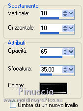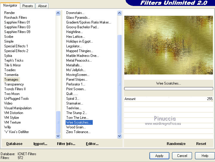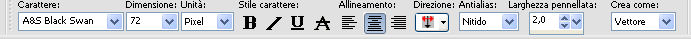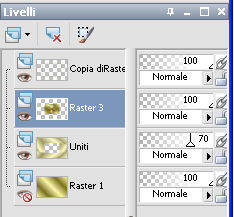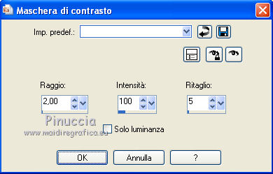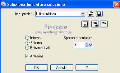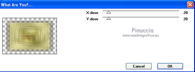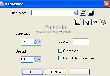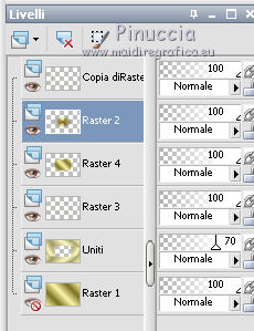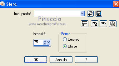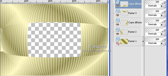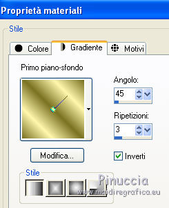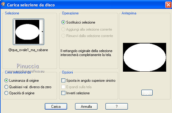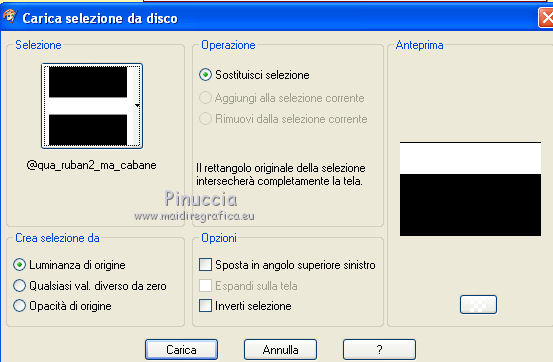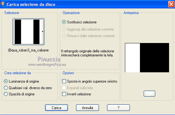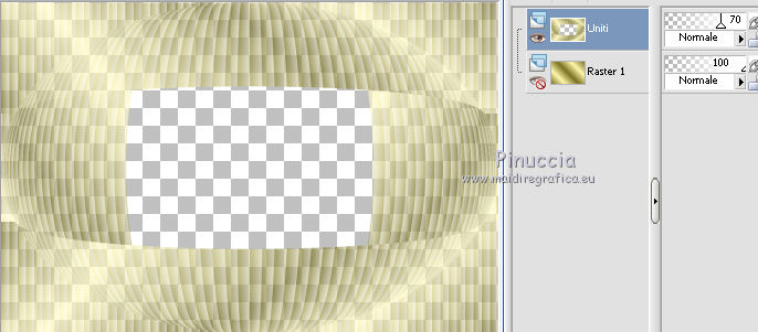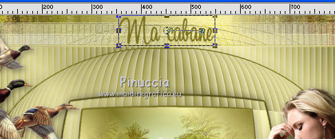 qui puoi trovare qualche risposta ai tuoi dubbi. Se l'argomento che ti interessa non è presente, ti prego di segnalarmelo. Questo tutorial è stato creato con PSP X3, ma può essere eseguito anche con le altre versioni di PSP. Per tradurlo, ho usato PSP X. Occorrente: Materiale qui Il tube della donna è di LB. Il tube del paesaggio è di Luna. Grazie a tutti i creatori di tubes che con il loro meraviglioso lavoro, permettono di creare questi tutorials. Lascia intatto il nome del tube. Il © appartiene all'artista originale. Mantieni il credito di chi ha creato il tube. Filtri in caso di dubbi, ricorda di consultare la mia sezione filtri qui Filters Unlimited 2.0 qui Tramages qui Toadies qui I filtri Tramages e Toadies si possono usare sia da soli che importati in Filters Unlimited. A volte possono esserci differenze nei risultati dei diversi usi, ma queste si possono riscontrare soltanto "sul campo" ![]() Apri il font e minimizzalo. Lo troverai nella lista dei font disponibili quando ti servirà. Metti le selezioni nella cartella Selezioni. 1. Imposta il colore di primo piano con il colore chiaro #fef7ac, e il colore di sfondo con #7a7222. ![]() Passa il colore di primo piano a Gradiente, stile Lineare. ![]() 2. Apri una nuova immagine trasparente 900 x 600 pixels, e riempila con il gradiente.3. Livelli>Nuovo livello raster. Selezione>Carica/Salva selezione>Carica selezione da disco. Cerca e carica la selezione @qua_ruban3_ma_cabane. ![]() Riempi la selezione ancora con il gradiente.Selezione>Deseleziona. 4. Effetti>Effetti di trama>Veneziana. ![]() 5. Effetti>Effetti geometrici>Sfera. ![]() 6. Livelli>Duplica. Immagine>Rifletti. 7. Livelli>Nuovo livello raster. Selezione>Carica/Salva selezione>Carica selezione da disco. Cerca e carica la selezione @qua_ruban2_ma_cabane. ![]() 8. Riempi la selezione con il gradiente.Selezione>Deseleziona. 9. Effetti>Effetti di trama>Veneziana, con i settaggi precedenti. 10. Effetti>Effetti geometrici>Sfera, con i settaggi precedenti. 11. Livelli>Duplica. 12. Immagine>Capovolgi. Chiudi il livello Raster 1. ![]() Livelli>Unisci>Unisci visibile, e abbassa l'opacità di questo livello al 70%. ![]() 13. Effetti>Effetti di bordo>Aumenta. 14. Attiva lo strumento Bacchetta magica ![]() e clicca al centro della parte trasparente per selezionarla. 15. Livelli>Nuovo livello raster. Apri il tube del paesaggio lunapaisagem084 e vai a Modifica>Copia. non chiuderlo perchè ti servirà ancora Torna al tuo lavoro e vai a Modifica>Incolla nella selezione. 16. Regola>Messa a fuoco>Maschera di contrasto. ![]() Selezione>Modifica>Seleziona bordature selezione. ![]() 16. Livelli>Nuovo livello raster. Riempi la selezione con il colore scuro.Selezione>Deseleziona. 17. Livelli>Duplica. Effetti>Effetti geometrici>Sfera. ![]() 18. Attiva nuovamente il livello originale Raster 3. Attiva lo strumento Bacchetta magica ![]() e clicca al centro della parte trasparente per selezionarla. 19. Nuovo livello raster. Riempi la selezione con il gradiente.Selezione>Deseleziona. 20. Attiva il livello Raster 2. Livelli>Disponi>Sposta su - 2 volte. Questa dovrebbe essere la tua paletta dei livelli. ![]() 21. Livelli>Unisci>Unisci giù - 2 volte. La nuova paletta. ![]() 22. Attiva il livello superiore - copia di Raster 3. Seleziona la parte centrale con la bacchetta magica ![]() 23. Effetti>Effetti 3D>Sfalsa ombra. ![]() Ripeti l'Effetto Sfalsa ombra, cambiando verticale e orizzontale con -5. Selezione>Deseleziona. 24. Livelli>Nuovo livello raster. Selezione>Carica/Salva selezione>Carica selezione da disco. Cerca e carica la selezione @qua_ovale1_ma_cabane. ![]() 25. Selezione>Modifica>Seleziona bordature selezione, con i settaggi precedenti. 26. Riempi la selezione con il colore scuro.Selezione>Deseleziona. 27. Effetti>Effetti 3D>Sfalsa ombra, con i settaggi precedenti. 28. Apri il livello Raster 1. Livelli>Unisci>Unisci tutto. 29. Immagine>Aggiungi bordatura, 2 pixels, simmetriche, con il colore chiaro. Livelli>Innalza livello di sfondo. 30. Immagine>Ridimensiona, all'80%, tutti i livelli non selezionato. 31. Livelli>Nuovo livello raster. Riempi con il gradiente.Livelli>Disponi>Sposta giù. 32. Apri il tube del paesaggio e vai a Modifica>Copia. Torna al tuo lavoro e vai a Modifica>Incolla come nuovo livello. 33. Effetti>Effetti di immagine>Motivo unico, con i settaggi standard. ![]() Livelli>Unisci>Unisci giù. 34. Effetti>Plugins>Filters Unlimited 2.0 - Tramages - Wee Scratches... ![]() 35. Attiva il livello superiore. Apri il tube 557-LB TUBES e vai a Modifica>Copia. Torna al tuo lavoro e vai a Modifica>Incolla come nuovo livello. Spostalo in basso a destra, come nel mio esempio.36. Effetti>Effetti 3D>Sfalsa ombra. ![]() 37. Apri il tube OISEAU B6 e vai a Modifica>Copia. Torna al tuo lavoro e vai a Modifica>Incolla come nuovo livello. Immagine>Ridimensiona, al 50%, tutti i livelli non selezionato. Spostalo in alto a sinistra, come nel mio esempio.38. Effetti>Effetti 3D>Sfalsa ombra. ![]() 39. Attiva nuovamente il livello Raster 1. Livelli>Duplica, e attiva il livello sottostante dell'originale - Raster 1. 30. Effetti>Plugins>Toadies - What are you. ![]() 31. Livelli>Duplica. Effetti>Effetti di bordo>Aumenta di più. Livelli>Duplica. 32. Effetti>Plugins>Toadies - What are you, con i settaggi precedenti. 33. Livelli>Duplica. Effetti>Effetti di bordo>Aumenta di più. 34. Livelli>Unisci>Unisci giù - 2 volte. Cambia la modalità di miscelatura di questo livello in Luminanza. 35. Attiva il livello superiore. Attiva lo strumento Testo , font A&S Black Swann,dimensione 72 (che dovrai regolare in base al testo e alla versione di PSP che stai usando) ![]() 36. Scrivi "Ma cabane" o quello che preferisci, e approfitta della griglia dello strumento per posizionare il testo in alto. ![]() se vuoi centrare il testo vai a Oggetti>Allinea>Centra orizz.nella tela Livelli>Converti in livello raster. Effetti>Effetti 3D>Sfalsa ombra. ![]() Firma il tuo lavoro. 37. Immagine>Aggiungi bordatura, 2 pixels, simmetri