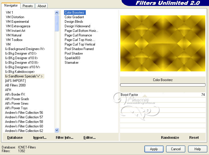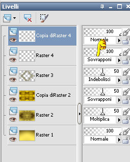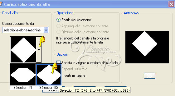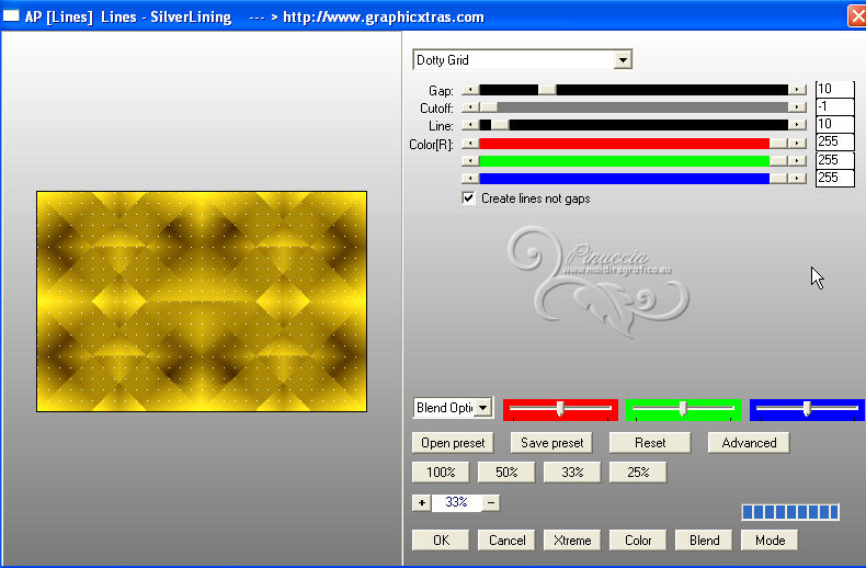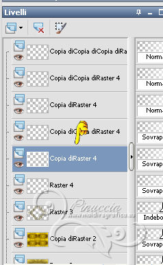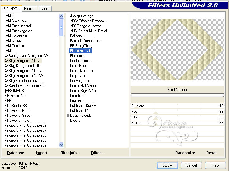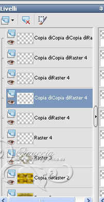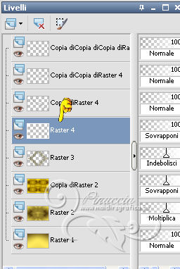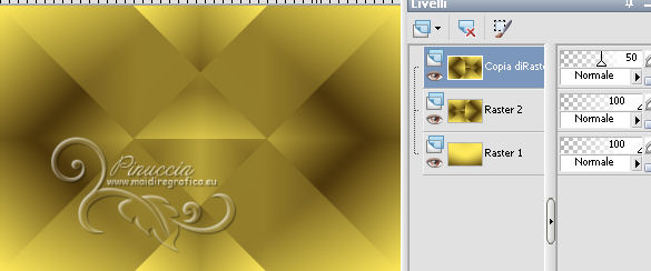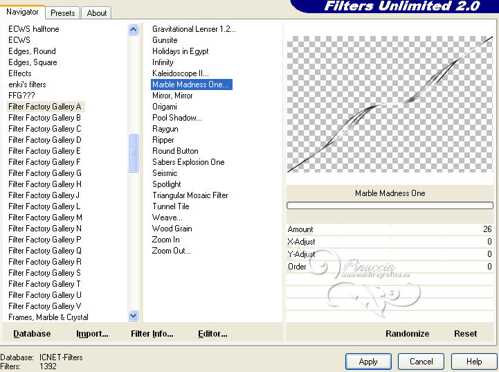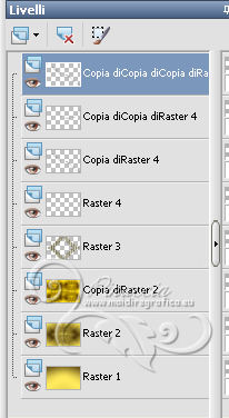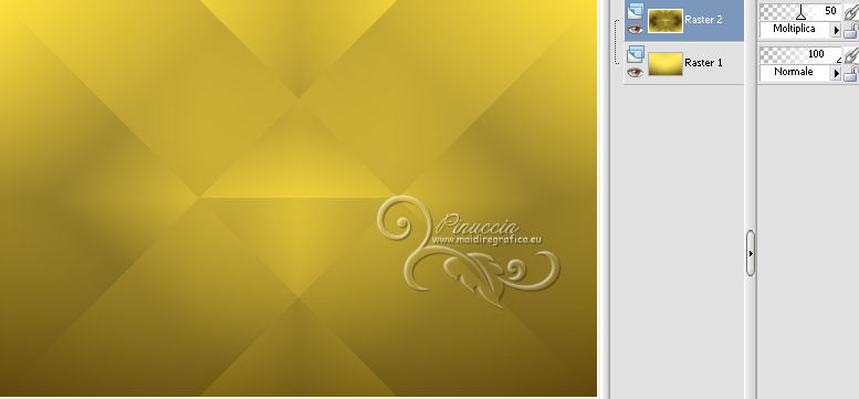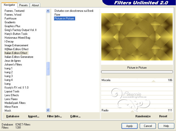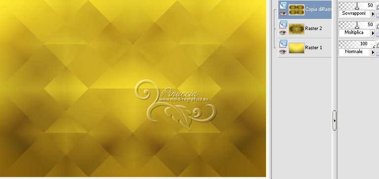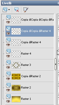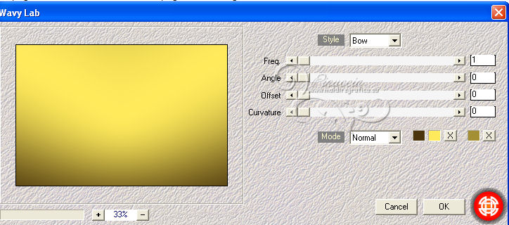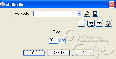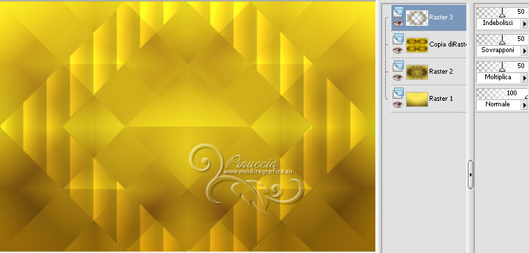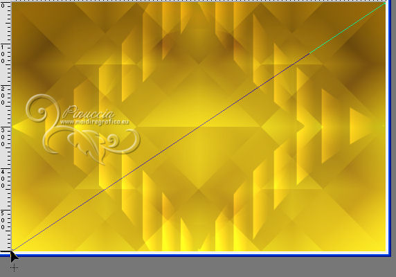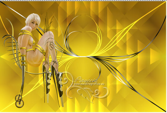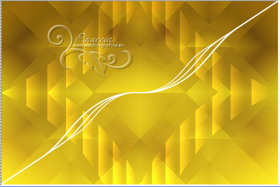 qui puoi trovare qualche risposta ai tuoi dubbi. Se l'argomento che ti interessa non è presente, ti prego di segnalarmelo. Questo tutorial è stato creato con CorelX3, ma può essere realizzato anche con le altre versioni di PSP. Per tradurlo ho usato PSP X. Occorrente: Materiale qui Per il tube della donna grazie Didier. Filtri in caso di dubbi, ricorda di consultare la mia sezione filtri qui Filters Unlimited 2.0 qui &<Bkg Designer sf10I (da importare in Unlimited) qui Simple qui Flaming Pear - Flexify2 qui Mehdi - Wavy Lab qui Ap Lines - Lines SilverLining qui Italian Editors Effects qui Filter Factory Gallery A qui &<Sandflowers special> qui I filtri Factory Gallery, Simple e Italian Editors si possono usare da soli o importati in Filters Unlimited. (come fare vedi qui). Se un filtro fornito appare con questa icona ![]() Se utilizzi altri tubes e/o altri colori, puoi sperimentare le modalità di miscelatura e opacità più adatte. 1. Imposta il colore di primo piano con #ffea5c, e il colore di sfondo con #4a350d. ![]() 2. Apri selections_Alpha_machine. Duplica l'immagine usando la combinazione di tasti maiuscola+D. Chiudi l'originale e lavora sulla copia. L'immagine non è vuota, ma contiene le selezioni salvate sul canale alfa. Rinomina questo livello Raster 1. 3. Effetti>Plugins>Mehdi - Wavy Lab. Il filtro lavora con i colori impostati nella paletta dei materiali: il primo è il colore di sfondo, il secondo quello di primo piano. Lascia il terzo colore creato dal filtro in base a questi colori. ![]() 4. Immagine>Capovolgi, e avrai questo ![]() 5. Passa il colore di primo piano a Gradiente, stile Lineare. ![]() Livelli>Nuovo livello raster. Riempi il livello con il gradiente.6. Regola>Sfocatura>Sfocatura gaussiana - raggio 10. ![]() 7. Effetti>Plugins>Filters Unlimited 2.0 - Simple - Pizza Slice Mirror. ![]() 8. Livelli>Duplica. Immagine>Rifletti. Abbassa l'opacità di questo livello al 50%. ![]() 9. Livelli>Unisci>Unisci giù. Cambia la modalità di miscelatura di questo livello in Moltiplica, e abbassa l'opacità al 50%. ![]() 10. Livelli>Duplica. Effetti>Plugins>Filters Unlimited 2.0 - Italian Editors Effect - Picture in Picture, con i settaggi standard. ![]() Cambia la modalità di miscelatura di questo livello in Sovrapponi, e mantieni l'opacità al 50% (o secondo i tuoi colori). ![]() 11. Effetti>Plugins>Filters Unlimited 2.0 - &0;<Sandflower Specials*v*> - Color Boorsterz, con i settaggi standard. ![]() 12. Livelli>Nuovo livello raster. Selezione>Carica/Salva selezione>Carica selezione da canale alfa. La selezione selection#1 è subito disponibile. Devi soltanto cliccare Carica. ![]() 13. Passa il colore di primo piano al colore iniziale #ffea5c. Abbassa l'opacità dello strumento Riempimento a 50 ![]() Riempi la selezione con il colore di primo piano.14. Mantieni selezionato. Selezione>Carica/Salva selezione>Carica selezione da canale alfa. Apri il menu delle selezioni e carica Selection#2. ![]() Premi sulla tastiera il tasto CANC ![]() Selezione>Deseleziona. 15. Effetti>Plugins>Filters Unlimited 2.0 - &<Bkg Designer sf10I> - Blinds Vertical, con i settaggi standard. ![]() Cambia la modalità di miscelatura di questo livello in Indebolisci, e abbassa l'opacità al 50%. ![]() 16. Effetti>Effetti di deformazione>Stringi (nelle versioni più recenti ha assunto la denominazione Compressione). ![]() Risultato. ![]() 17. Imposta il colore di primo piano con il colore bianco #ffffff. ![]() Attiva lo strumento Penna ![]() linea di stile Pieno, larghezza 5 ![]() Traccia una linea diagonale come nell'esempio. non serve premere il tasto della maiuscola; punta il mouse su un angolo e poi raggiungi l'angolo opposto e la linea si traccerà da sola ![]() Livelli>Converti in livello raster. 18. Effetti>Effetti di distorsione>Mulinello. ![]() Risultato. ![]() 19. Livelli>Duplica. Immagine>Ridimensiona, all'80%, tutti i livelli non selezionato. Di nuovo: Livelli>Duplica. Immagine>Ridimensiona, all'80%, tutti i livelli non selezionato. Livelli>Unisci>Unisci giù - 2 volte. ![]() 20. Livelli>Duplica. Cambia la modalità di miscelatura del livello originale in Sovrapponi, e rimani posizionato sul livello superiore della copia. ![]() 21. Effetti>Plugins>Filters Unlimited 2.0 - Filter Factory Gallery A - Marble Madness One, con i settaggi standard. ![]() Immagine>Rifletti. Risultato. ![]() 22. Livelli>Duplica - 2 volte, e attiva il livello della prima copia. ![]() 23. Effetti>Plugins>Flaming Pear - Flexify 2. ![]() 24. Attiva il livello della seconda copia. ![]() Effetti>Plugins>Flaming Pear - Flexify 2, cambia soltanto halfpolar con goggles. ![]() 25. Attiva il livello originale Raster 4. ![]() Livelli>Duplica - 2 volte, e rimani posizionato sul livello della seconda copia. ![]() 26. Effetti>Plugins>Flaming Pear - Flexify 2 e conferma i settaggi precedenti. ![]() 27. Attiva il livello della prima copia. ![]() Effetti>Plugins>Flaming Pear - Flexify 2 e cambia goggles con half polar. ![]() Dovresti avere questo. Piccole differenze nella forma sono possibili, a causa di lievi scostamenti della linea diagonale, rispetto al mio esempio. ![]() 28. Attiva il livello superiore. Apri il tube didier.fantastique-10-mai-2103 e vai a Modifica>Copia. Torna al tuo lavoro e vai a Modifica>Incolla come nuovo livello. Immagine>Rifletti. Immagine>Ridimensiona, all'80%, tutti i livelli non selezionato. Sposta il tube a sinistra.![]() 29. Effetti>Effetti 3D>Sfalsa ombra. ![]() 30. Attiva il livello copia di Raster 2. Effetti>Plugins>AP Lines - Lines SilverLining. ![]() 31. Immagine>Aggiungi bordatura, 2 pixels, simmetriche, con il colore scuro #4a350d. Immagine>Aggiungi bordatura, 35 pixels, simmetriche, con il colore chiaro #ffea5c. Seleziona questo bordo con la bacchetta magica ![]() Riporta il colore di primo piano a Gradiente. ![]() Riempi la selezione con il gradiente,opacità 100 32. Selezione>Innalza selezione a livello. Cambia la modalità di miscelatura di questo livello in Luce netta, e abbassa l'opacità 