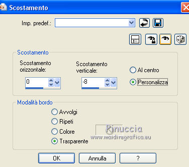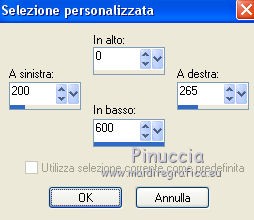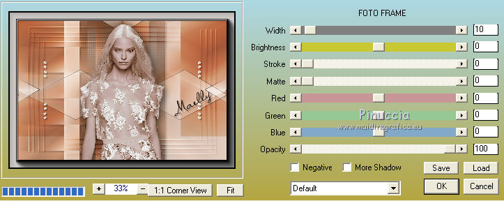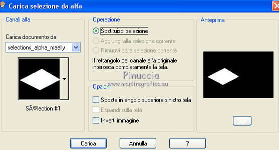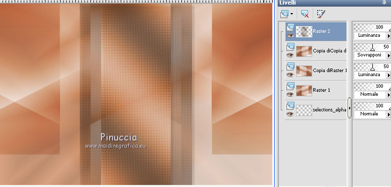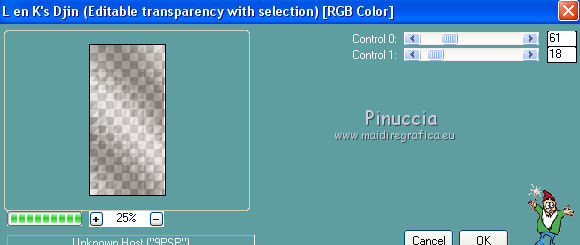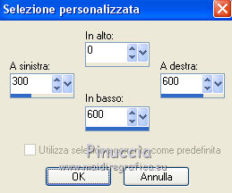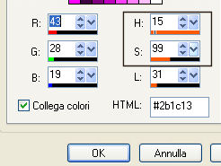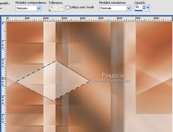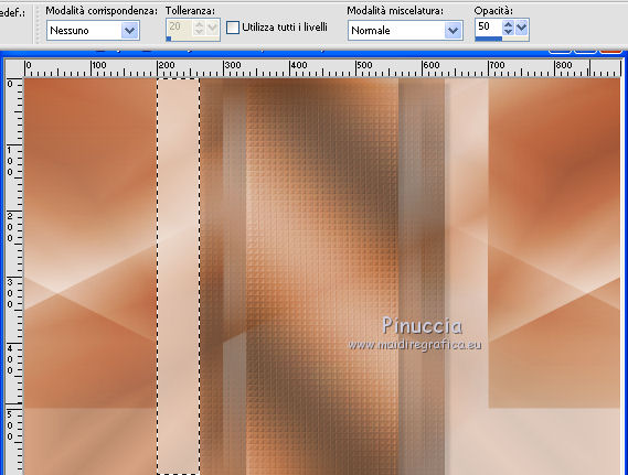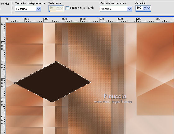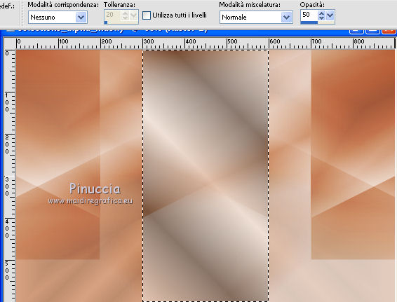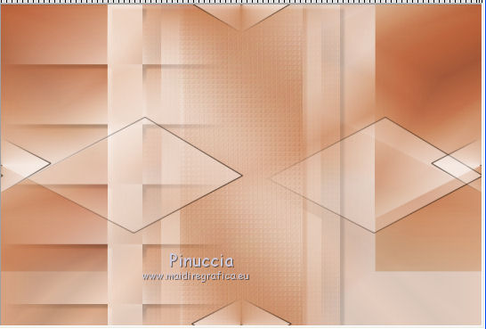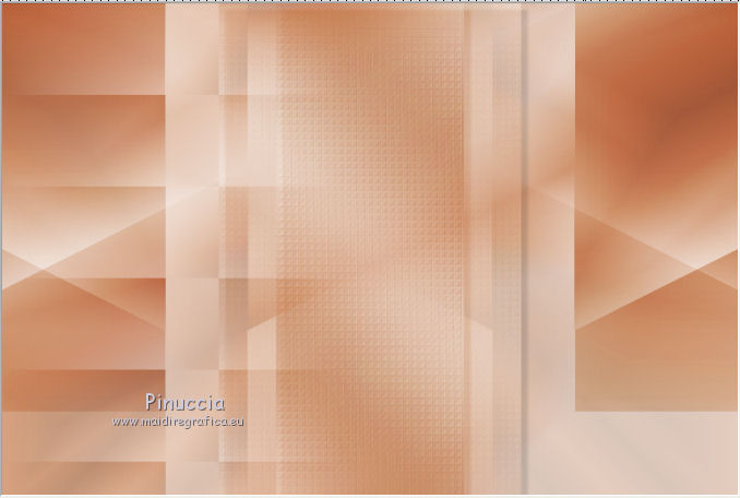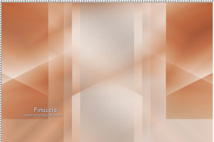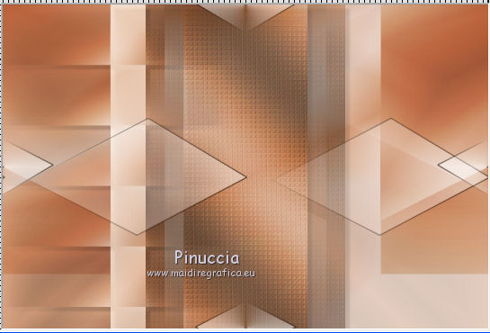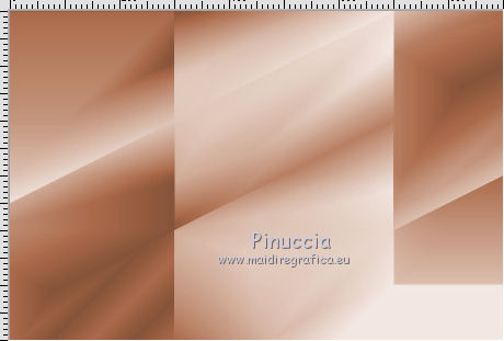 qui puoi trovare qualche risposta ai tuoi dubbi. Se l'argomento che ti interessa non è presente, ti prego di segnalarmelo. Questo tutorial è stato creato con CorelX6, ma può essere realizzato anche con le altre versioni di PSP. Dalla versione X4, il comando Immagine>Rifletti è stato sostituito con Immagine>Capovolgi in orizzontale, e il comando Immagine>Capovolgi con Immagine>Capovolgi in verticale. Nelle versioni X5 e X6, le funzioni sono state migliorate rendendo disponibile il menu Oggetti. Con la nuova versione X7, sono tornati Rifletti/Capovolgi, ma con nuove funzioni. Vedi la scheda aggiornata sull'argomento qui Per tradurre questo tutorial ho usato PSP X. Occorrente: Materiale qui Il tube utilizzato è di Aquarellice. Filtri in caso di dubbi, ricorda di consultare la mia sezione filtri qui Filters Unlimited 2.0 qui Toadies - What are you, Weaver qui L&K's - L&K's Djin qui AAA Frames - Foto Frame qui I filtri Toadies si possono usare da soli o importati in Filters Unlimited (come fare vedi qui) Se un filtro fornito appare con questa icona ![]() Se utilizzi altri tubes e/o altri colori, puoi sperimentare le modalità di miscelatura e opacità più adatte. 1. Imposta il colore di primo piano con #f4ede8, e il colore di sfondo con #2b1c13. ![]() Passa il colore di primo piano a Gradiente di primo piano/sfondo, stile Lineare. ![]() 2. Apri selections_alpha_maelly. Duplica l'immagine usando la combinazione di tasti maiuscola+D. Chiudi l'originale e lavora sulla copia. L'immagine non è vuota, ma contiene le selezioni salvate sul canale alfa. Rinomina il livello Raster 1. una piccola curiosità, se rinomini il livello con la lettera minuscola - raster 1 - il programma assegnerà nuovamente il numero 1 al successivo livello. Se invece rinomini il livello con la lettera maiuscola - Raster 1 - il programma assegnerà al livello successivo il numero 2 3. Apri fond_maelly e vai a Modifica>Copia. Torna al tuo lavoro e vai a Modifica>Incolla come nuovo livello. Prendi nota dei valori di tonalità (H) e saturazione (S) del colore scuro. ![]() Regola>Tonalità e Saturazione>Viraggio e trascrivi i valori annotati nelle rispettive caselle. ![]() 4. Risultato. ![]() 5. Livelli>Duplica. Immagine>Rifletti. Cambia la modalità di miscelatura di questo livello in Luminanza, e abbassa l'opacità al 50%. ![]() 6. Livelli>Duplica. Immagine>Rifletti. Cambia la modalità di miscelatura di questo livello in Sovrapponi, e abbassa l'opacità al 50%. ![]() 7. Livelli>Nuovo livello raster. Attiva lo strumento Selezione ![]() (non importa il tipo di selezione impostato, perchè con la selezione personalizzata si ottiene sempre un rettangolo) clicca sull'icona Selezione personalizzata ![]() e imposta i seguenti settaggi. ![]() 8. Abbassa l'opacità dello strumento Riempimento a 50e riempi la selezione con il gradiente.![]() 9. Regola>Sfocatura>Sfocatura gaussiana - raggio 25. ![]() 10. Effetti>Plugins>L&K's - L&K's Djin. ![]() 10. Effetti>Effetti di bordo>Aumenta di più. Selezione>Deseleziona. 11. Effetti>Plugins>Filters Unlimited 2.0 - Toadies - What are you, con i settaggi standard. Circola in rete una versione di Unlimited che non si installa ed è composta da files in formato .8bf. A volte, causa vari fattori, alcuni filtri danno risultati differenti, ma queste differenze non sono codificabili e si possono riscontrare soltanto confrontando i risultati con quelli del tutorial che si sta eseguendo. Questo è uno di questi casi. Con il filtro Unlimited che si installa avrai questo risultato. ![]() Per ottenere il risultato simile a quello del tutorial originale, ho utilizzato il filtro con files in formato .8bf. Pertanto, per ottenere il risultato dell'esempio, devi sostituire nei Percorsi files il filtro che si installa, con il filtro in formato .8bf che puoi scaricare qui Potrai fare l'operazione inversa, per utilizzare nuovamente il filtro Unlimited che installato come software. ![]() 12. Effetti>Effetti 3D>Sfalsa ombra. ![]() 13. Cambia la modalità di miscelatura di questo livello in Luminanza. qui la versione con il filtro Unlimited che si installa (il risultato finale in fondo al tutorial. ![]() il risultato, a questo punto, utilizzando Unlimited in files formato 8bf. ![]() 14. Livelli>Nuovo livello raster. Selezione personalizzata ![]() ![]() 15. Riporta il colore di primo piano al colore chiaro #f4ede8, opacità dello strumento sempre a 50 e riempi la selezione con il colore di primo piano,![]() Selezione>Deseleziona. 16. Effetti>Plugins>Filters Unlimited 2.0 - Toadies - Weaver, con i settaggi standard. Anche con questo effetto il risultato è differente. Con il filtro che si installa: ![]() Con il filtro in versione files 8bf. ![]() 17. Effetti>Effetti 3D>Sfalsa ombra, con i settaggi precedenti. ![]() 18. Cambia la modalità di miscelatura di questo livello in Luce netta. Con la versione Unlimited che si installa: ![]() Con la versione Unlimited in files 8bf. ![]() 19. Livelli>Nuovo livello raster. Selezione>Carica/Salva selezione>Carica selezione da canale alpha. La selezione selection#1 è subito disponibile. Devi soltanto cliccare Carica. ![]() 20. Riporta l'opacità dello strumento Riempimento a 100,e riempi la selezione con il colore scuro.![]() 21. Selezione>Modifica>Contrai - 2 pixels. ![]() Premi sulla tastiera il tasto CANC ![]() 22. Opacità dello strumento Riempimento a 50,e riempi la selezione con il colore chiaro.![]() Selezione>Deseleziona. 23. Effetti>Effetti di immagine>Motivo unico. ![]() 24. Livelli>Nuovo livello raster. Selezione>Carica/Salva selezione>Carica selezione da canale alpha. Apri il menu delle selezioni e carica Selection#2. ![]() 25. Opacità dello strumento Riempimento a 100 e riempi la selezione con il colore scuro.26. Selezione>Modifica>Contrai - 2 pixels. ![]() Premi sulla tastiera il tasto CANC. 27. Imposta il colore di primo piano con il colore bianco. Opacità dello strumento Riempimento a 50 e riempi la selezione con il colore bianco.Selezione>Deseleziona. 29. 