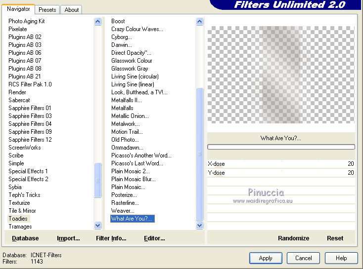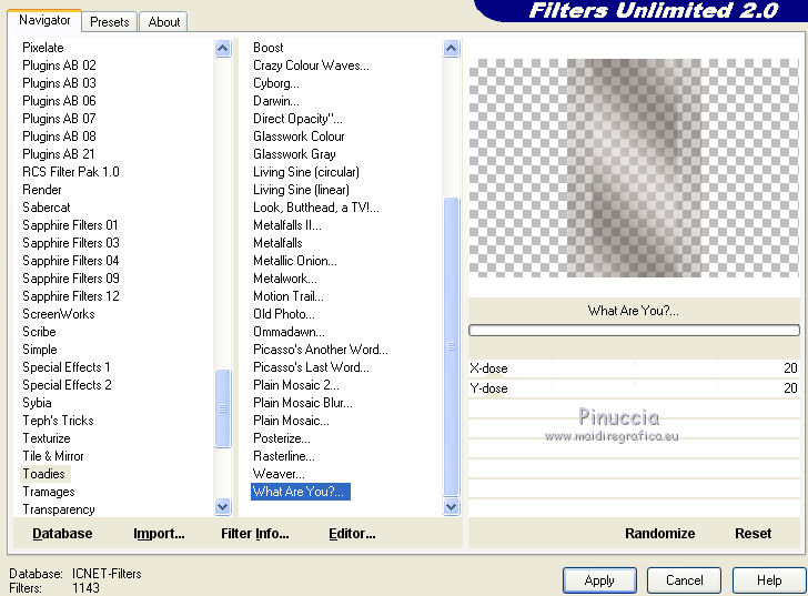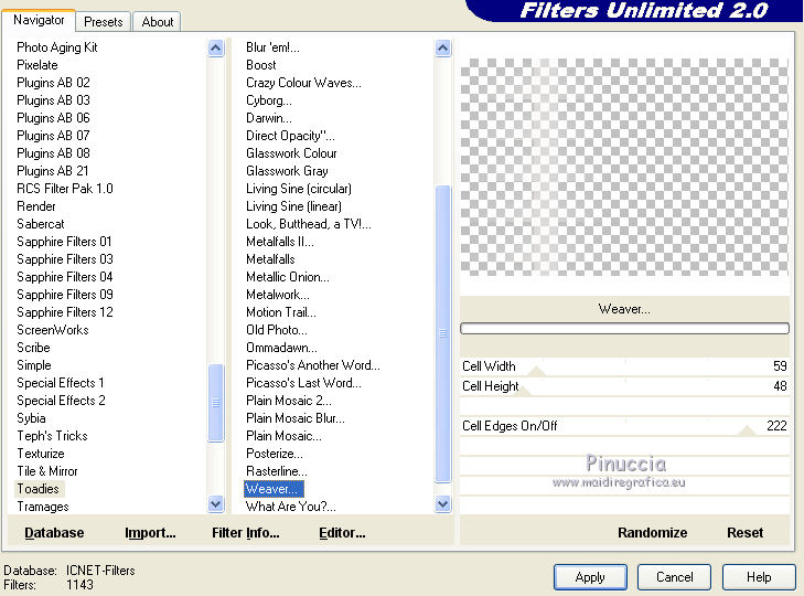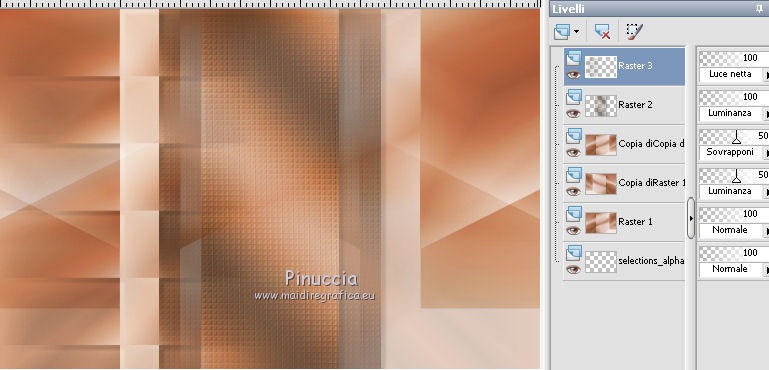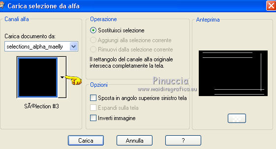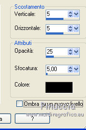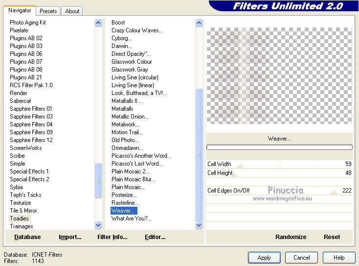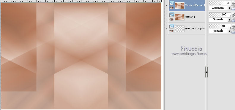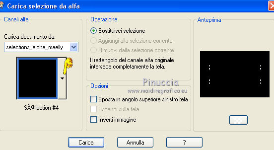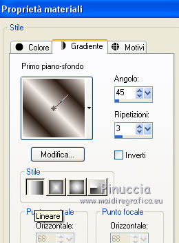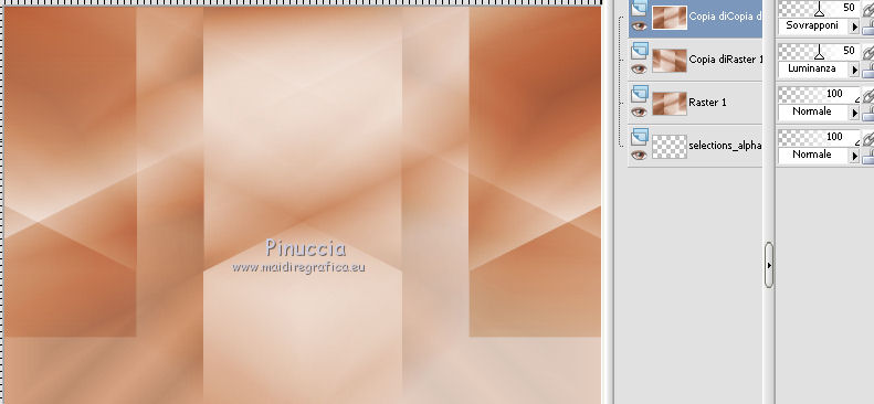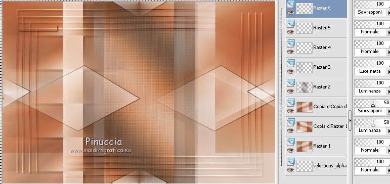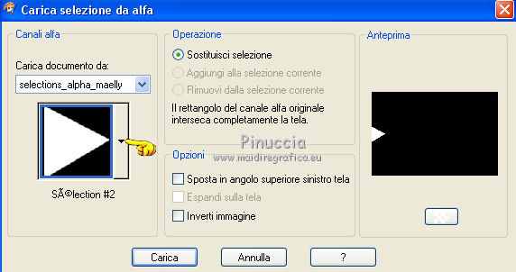 qui puoi trovare qualche risposta ai tuoi dubbi. Se l'argomento che ti interessa non è presente, ti prego di segnalarmelo. Questo tutorial è stato creato con CorelX6, ma può essere realizzato anche con le altre versioni di PSP. Dalla versione X4, il comando Immagine>Rifletti è stato sostituito con Immagine>Capovolgi in orizzontale, e il comando Immagine>Capovolgi con Immagine>Capovolgi in verticale. Nelle versioni X5 e X6, le funzioni sono state migliorate rendendo disponibile il menu Oggetti. Con la nuova versione X7, sono tornati Rifletti/Capovolgi, ma con nuove funzioni. Vedi la scheda aggiornata sull'argomento qui Per tradurre questo tutorial ho usato PSP X. Occorrente: Materiale qui Il tube utilizzato è di Aquarellice. Filtri in caso di dubbi, ricorda di consultare la mia sezione filtri qui Filters Unlimited 2.0 qui Toadies - What are you, Weaver qui L&K's - L&K's Djin qui AAA Frames - Foto Frame qui I filtri Toadies si possono usare da soli o importati in Filters Unlimited (come fare vedi qui) Se un filtro fornito appare con questa icona ![]() Se utilizzi altri tubes e/o altri colori, puoi sperimentare le modalità di miscelatura e opacità più adatte. 1. Imposta il colore di primo piano con #f4ede8, e il colore di sfondo con #2b1c13. ![]() Passa il colore di primo piano a Gradiente di primo piano/sfondo, stile Lineare. ![]() 2. Apri selections_alpha_maelly. Duplica l'immagine usando la combinazione di tasti maiuscola+D. Chiudi l'originale e lavora sulla copia. L'immagine non è vuota, ma contiene le selezioni salvate sul canale alfa. Rinomina il livello Raster 1. una piccola curiosità, se rinomini il livello con la lettera minuscola - raster 1 - il programma assegnerà nuovamente il numero 1 al successivo livello. Se invece rinomini il livello con la lettera maiuscola - Raster 1 - il programma assegnerà al livello successivo il numero 2 3. Apri fond_maelly e vai a Modifica>Copia. Torna al tuo lavoro e vai a Modifica>Incolla come nuovo livello. Prendi nota dei valori di tonalità (H) e saturazione (S) del colore scuro. ![]() Regola>Tonalità e Saturazione>Viraggio e trascrivi i valori annotati nelle rispettive caselle. ![]() 4. Risultato. ![]() 5. Livelli>Duplica. Immagine>Rifletti. Cambia la modalità di miscelatura di questo livello in Luminanza, e abbassa l'opacità al 50%. ![]() 6. Livelli>Duplica. Immagine>Rifletti. Cambia la modalità di miscelatura di questo livello in Sovrapponi, e abbassa l'opacità al 50%. ![]() 7. Livelli>Nuovo livello raster. Attiva lo strumento Selezione ![]() (non importa il tipo di selezione impostato, perchè con la selezione personalizzata si ottiene sempre un rettangolo) clicca sull'icona Selezione personalizzata ![]() e imposta i seguenti settaggi. ![]() 8. Abbassa l'opacità dello strumento Riempimento a 50e riempi la selezione con il gradiente.![]() 9. Regola>Sfocatura>Sfocatura gaussiana - raggio 25. ![]() 10. Effetti>Plugins>L&K's - L&K's Djin. ![]() 10. Effetti>Effetti di bordo>Aumenta di più. Selezione>Deseleziona. 11. Effetti>Plugins>Filters Unlimited 2.0 - Toadies - What are you, con i settaggi standard. Circola in rete una versione di Unlimited che non si installa ed è composta da files in formato .8bf. A volte, causa vari fattori, alcuni filtri danno risultati differenti, ma queste differenze non sono codificabili e si possono riscontrare soltanto confrontando i risultati con quelli del tutorial che si sta eseguendo. Questo è uno di questi casi. Con il filtro Unlimited che si installa avrai questo risultato. ![]() Per ottenere il risultato simile a quello del tutorial originale, ho utilizzato il filtro con files in formato .8bf. Pertanto, per ottenere il risultato dell'esempio, devi sostituire nei Percorsi files il filtro che si installa, con il filtro in formato .8bf che puoi scaricare qui Potrai fare l'operazione inversa, per utilizzare nuovamente il filtro Unlimited che installato come software. ![]() 12. Effetti>Effetti 3D>Sfalsa ombra. ![]() 13. Cambia la modalità di miscelatura di questo livello in Luminanza. qui la versione con il filtro Unlimited che si installa (il risultato finale in fondo al tutorial. ![]() il risultato, a questo punto, utilizzando Unlimited in files formato 8bf. ![]() 14. Livelli>Nuovo livello raster. Selezione personalizzata ![]() ![]() 15. Riporta il colore di primo piano al colore chiaro #f4ede8, opacità dello strumento sempre a 50 e riempi la selezione con il colore di primo piano,![]() Selezione>Deseleziona. 16. Effetti>Plugins>Filters Unlimited 2.0 - Toadies - Weaver, con i settaggi standard. Anche con questo effetto il risultato è differente. Con il filtro che si installa: ![]() Con il filtro in versione files 8bf. ![]() 17. Effetti>Effetti 3D>Sfalsa ombra, con i settaggi precedenti. ![]() 18. Cambia la modalità di miscelatura di questo livello in Luce netta. Con la versione Unlimited che si installa: ![]() Con la versione Unlimited in files 8bf. ![]() 19. Livelli>Nuovo livello raster. Selezione>Carica/Salva selezione>Carica selezione da canale alpha. La selezione selection#1 è subito disponibile. Devi soltanto cliccare Carica. ![]() 20. Riporta l'opacità dello strumento Riempimento a 100,e riempi la selezione con il colore scuro.![]() 21. Selezione>Modifica>Contrai - 2 pixels. ![]() Premi sulla tastiera il tasto CANC ![]() 22. Opacità dello strumento Riempimento a 50,e riempi la selezione con il colore chiaro.![]() Selezione>Deseleziona. 23. Effetti>Effetti di immagine>Motivo unico. ![]() 24. Livelli>Nuovo livello raster. Selezione>Carica/Salva selezione>Carica selezione da canale alpha. Apri il menu delle selezioni e carica Selection#2. ![]() 25. Opacità dello strumento Riempimento a 100 e riempi la selezione con il colore scuro.26. Selezione>Modifica>Contrai - 2 pixels. ![]() Premi sulla tastiera il tasto CANC. 27. Imposta il colore di primo piano con il colore bianco. Opacità dello strumento Riempimento a 50 e riempi la selezione con il colore bianco.Selezione>Deseleziona. 29. 