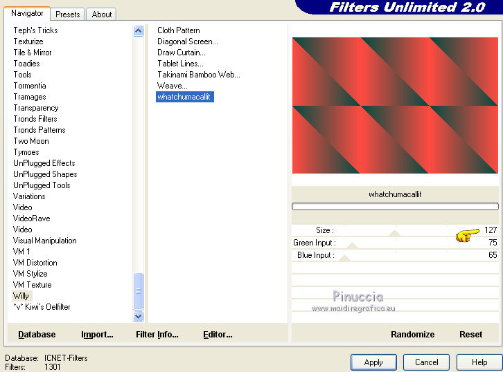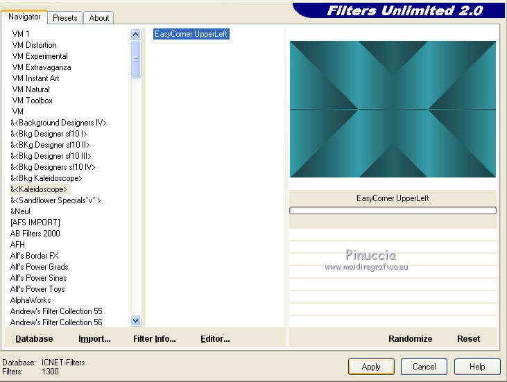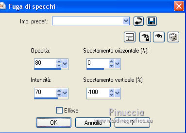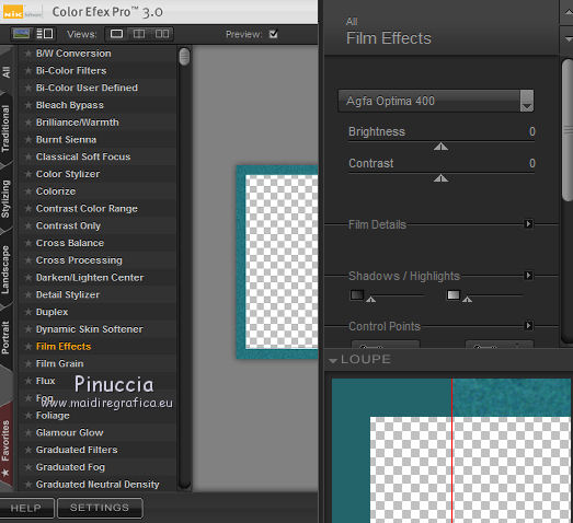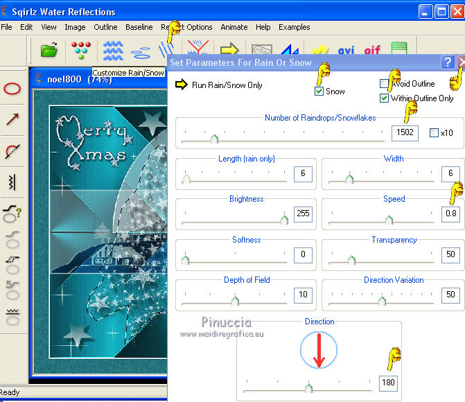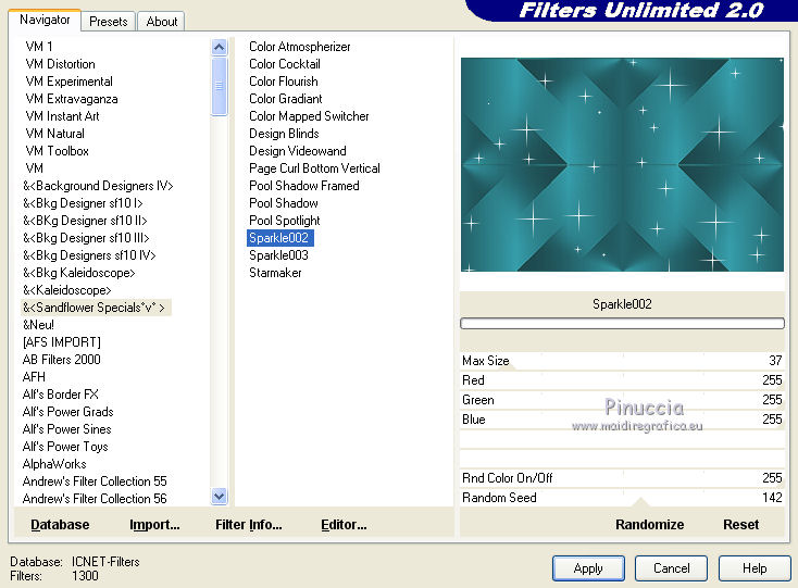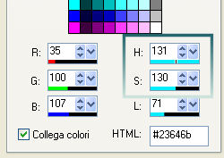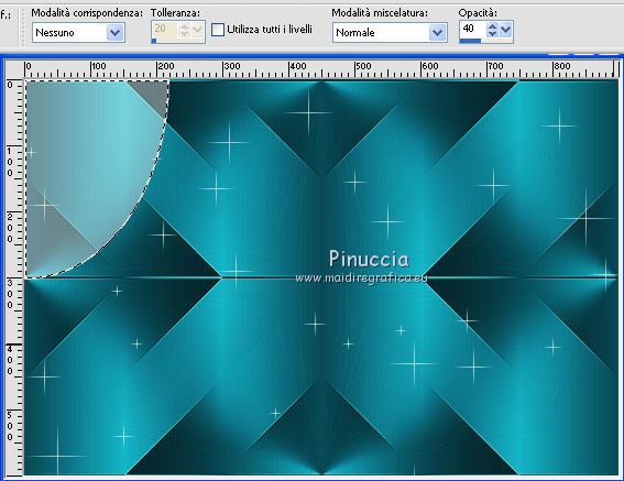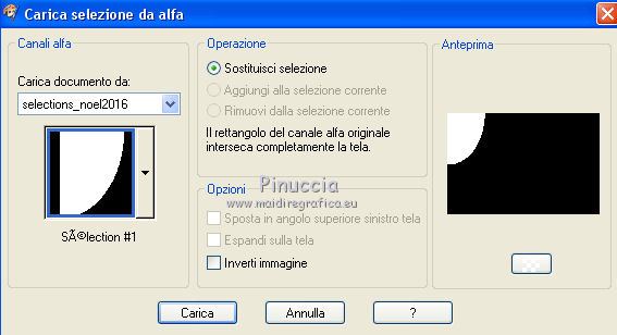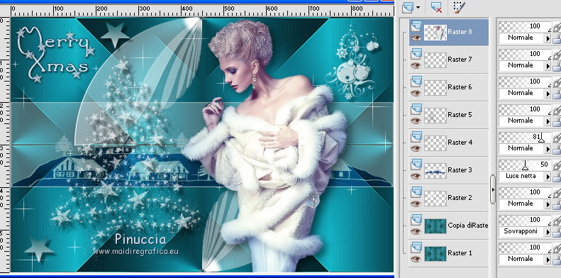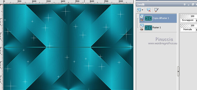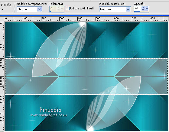 qui puoi trovare qualche risposta ai tuoi dubbi. Se l'argomento che ti interessa non è presente, ti prego di segnalarmelo. Questo tutorial è stato creato con CorelX9 e tradotto con CorelX, ma può essere realizzato anche con le altre versioni di PSP. Dalla versione X4, il comando Immagine>Rifletti è stato sostituito con Immagine>Capovolgi in orizzontale, e il comando Immagine>Capovolgi con Immagine>Capovolgi in verticale. Nelle versioni X5 e X6, le funzioni sono state migliorate rendendo disponibile il menu Oggetti. Con la nuova versione X7, sono tornati Rifletti/Capovolgi, ma con nuove funzioni. Vedi la scheda sull'argomento qui ![]() Le vostre versioni qui Occorrente: Materiale qui Per il tube della donna grazie Babette. Filtri in caso di dubbi, ricorda di consultare la mia sezione filtri qui Filters Unlimited 2.0 qui &<Kaleidoscope> - EasyCorner UpperLeft (da importare in Unlimited) qui Willy Whatcumnacallit qui &<Sandflower Special °v°> - Sparkle 002 (da importare in Unlimited) qui Flaming Pear - Flexify 2 qui Nik Sofware - Color Efex Pro qui I filtri Willy si possono usare da soli o importati in Filters Unlimited (come fare vedi qui) Se un filtro fornito appare con questa icona Per l'animazione: Sqirlz Water Reflections qui (vedi le note sul programma qui) ![]() non esitare a cambiare modalità di miscelatura e opacità secondo i colori utilizzati. Nelle ultime versioni di PSP non c'è il gradiente di primo piano/sfondo (Corel_06_029) Puoi usare i gradienti delle versioni precedenti. Trovi qui i gradienti Corel X. Metti i pennelli nella cartella Pennelli. Attenzione, ogni pennello è composto da due files che non devono essere separati. Vedi gli appunti sui pennelli qui Colori utilizzati ![]() 1. Imposta il colore di primo piano con #d0e5de, e il colore di sfondo con #23646b. ![]() Passa il colore di primo piano a Gradiente di primo piano/sfondo, stile Lineare. ![]() 2. Apri selections_alpha_noel2016. Duplica l'immagine usando la combinazione di tasti maiuscola+D, ![]() oppure Modifica>Copia/Modifica>Incolla come nuova immagine. Chiudi l'originale e lavora sulla copia. L'immagine non è vuota, ma contiene una selezione salvata sul canale alfa. Riempi l'immagine trasparente con il gradiente.3. Effetti>Plugins>Filters Unlimited 2.0 - Willy - Whatcumnacallit. ![]() 4. Prendi nota dei valori di Tonalità (H) e Saturazione (S) del tuo colore di sfondo. ![]() Regola>Tonalità e saturazione>Viraggio e trascrivi i valori annotati nelle rispettive caselle. ![]() per ottenere la giusta colorazione ![]() 5. Effetti>Plugins>Filters Unlimited 2.0 - &<Kaleidoscope> - EasyCorner UpperLeft. ![]() 6. Effetti>Effetti di immagine>Motivo unico, con i settaggi standard. ![]() 7. Effetti>Effetti di bordo>Aumenta di più. 8. Effetti>Plugins>Filters Unlimited 2.0 - &<Sandflower Special °v° - Sparkle 002, con i settaggi standard. ![]() 9. Livelli>Duplica. Cambia la modalità di miscelatura di questo livello in Sovrapponi, o secondo i tuoi colori. ![]() 10. Livelli>Nuovo livello raster. Selezione>Carica/Salva selezione>Carica selezione da canale alfa. La selezione selection#1 è subito disponibile. Devi soltanto cliccare Carica. ![]() 11. Imposta il colore di primo piano con il colore bianco #ffffff. Riempi la selezione con il colore bianco, opacità 100.![]() 12. Selezione>Modifica>Contrai - 2 pixels. ![]() Premi sulla tastiera il tasto CANC ![]() 13. Abbassa l'opacità dello strumento Riempimento a 40 e riempi la selezione ancora con il colore bianco.![]() Selezione>Deseleziona. 14. Effetti>Effetti di riflesso>Fuga di specchi. ![]() 15. Effetti>Plugins>Flaming Pear - Flexify 2. ![]() 16. Livelli>Duplica. Immagine>Rifletti (con le ultime versioni di PSP: Immagine>Rifletti>Rifletti orizzontalmente). Immagine>Capovolgi (con le ultime versioni di PSP: Immagine>Rifletti>Rifletti verticalmente). 17. Livelli>Unisci>Unisci giù. 18. Livelli>Nuovo livello raster. Attiva lo strumento Selezione ![]() (non importa il tipo di selezione impostato, perchè con la selezione personalizzata si ottiene sempre un rettangolo) clicca sull'icona Selezione personalizzata ![]() e imposta i seguenti settaggi. ![]() 19. Riporta l'opacità dello strumento Riempimento a 100 ![]() e riempi la selezione con il colore bianco.20. Selezione>Modifica>Contrai - 2 pixels. ![]() Premi sulla tastiera il tasto CANC. 21. Di nuovo opacità a 40 e riempi di nuovo con il colore bianco.![]() 22. Apri il tube calquivillagehiver10122014 e vai a Modifica>Copia. Torna al tuo lavoro e vai a Modifica>Incolla nella selezione. Selezione>Deseleziona. 23. Cambia la modalità di miscelatura di questo livello in Luce netta, e abbassa l'opacità al 50%. ![]() 24. Apri il tube ASDwebs_TextMeryXmass e vai a Modifica>Copia. Torna al tuo lavoro e vai a Modifica>Incolla come nuovo livello. Spostalo in alto a sinistra.![]() 25. Livelli>Nuovo livello raster. Attiva lo strumento Pennello ![]() cerca e seleziona il pennello @qua30, dimensione 500 pixels ![]() 26. Applica il pennello in basso a sinistra, cliccando con il tasto sinistro del mouse per usare il colore di primo piano. ![]() 27. Effetti>Effetti 3D>Sfalsa ombra. ![]() 28. Livelli>Nuovo livello raster. Attiva lo strumento Pennello ![]() cerca e seleziona il pennello @qua28, dimensione 200 pixels ![]() 29. Applica il pennello in alto a destra, sempre con il colore bianco. ![]() 30. Effetti>Effetti 3D>Sfalsa ombra. ![]() 31. Apri il tube @qua_etoiles_noel2016 e vai a Modifica>Copia. Torna al tuo lavoro e vai a Modifica>Incolla come nuovo livello. Spostalo a sinistra.![]() 32. Se necessario, colorizza con i valori corrispondenti al tuo colore di sfondo (vedi il punto 4). 33. Effetti>Effetti 3D>Sfalsa ombra, con i settaggi precedenti. ![]() 34. Apri il tube della donna babette-897-14 e vai a Modifica>Copia. Torna al tuo lavoro e vai a Modifica>Incolla come nuovo livello. Immagine>Ridimensiona, al 64%, tutti i livelli non selezionato. ![]() Immagine>Rifletti. Spostalo un po' più a destra.35. Effetti>Effetti 3D