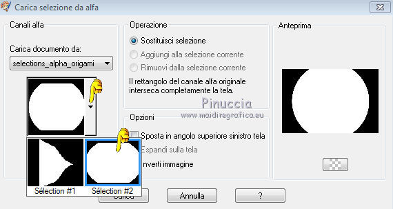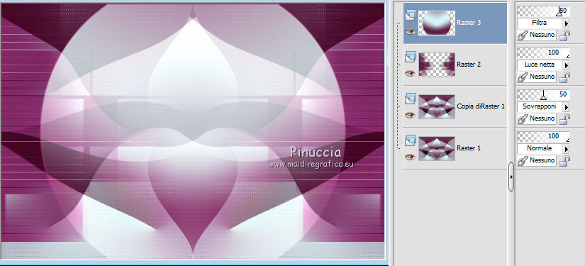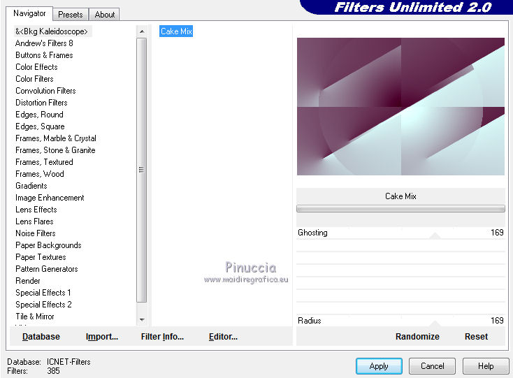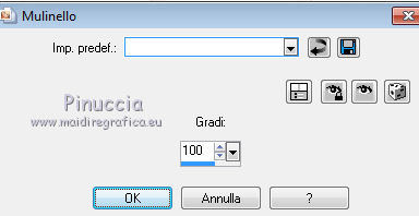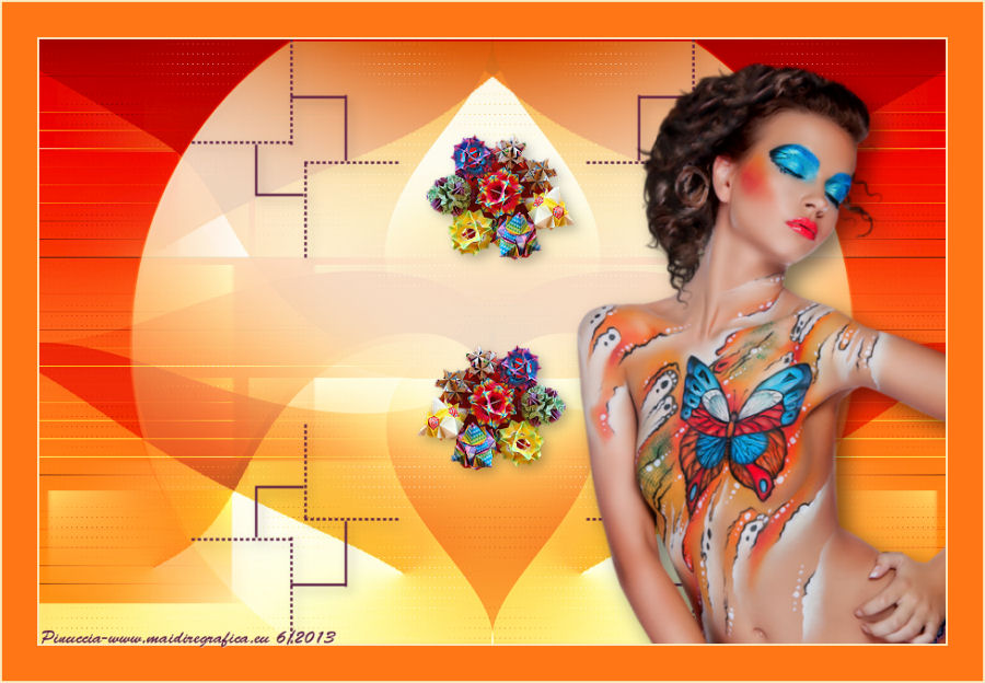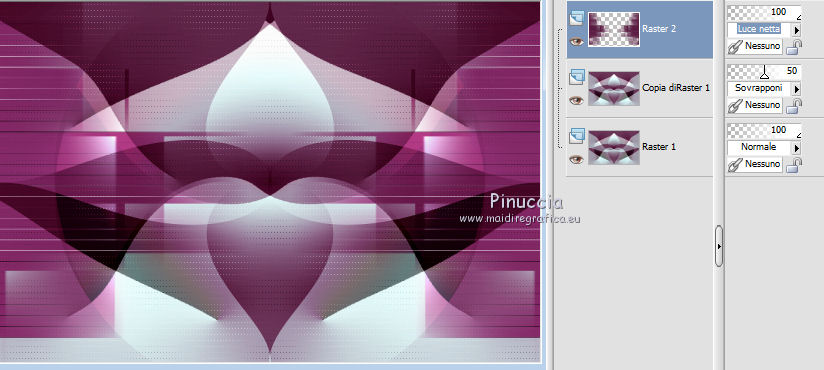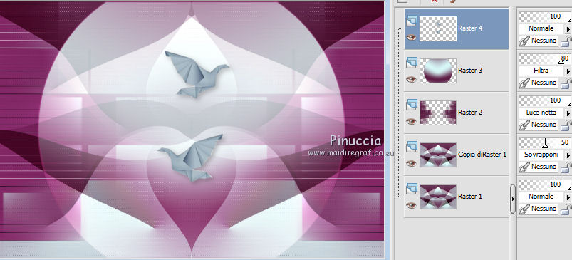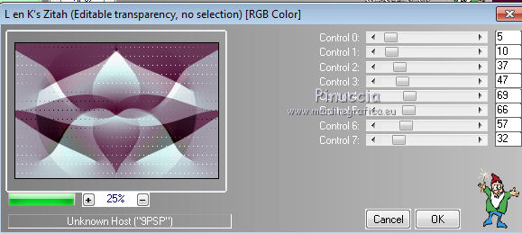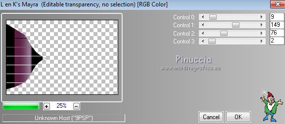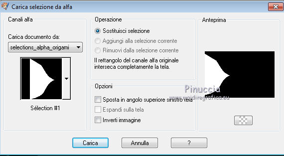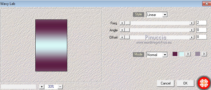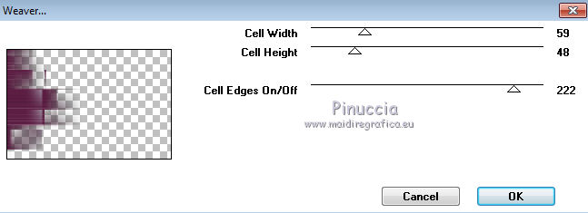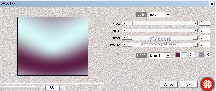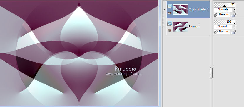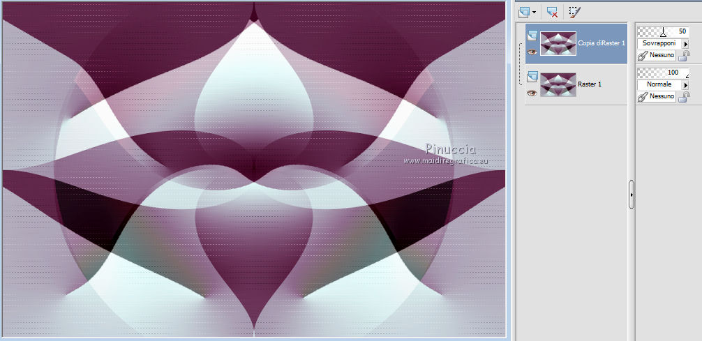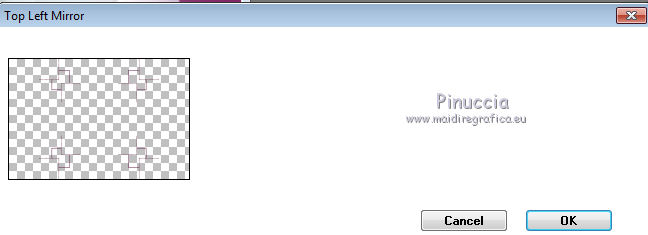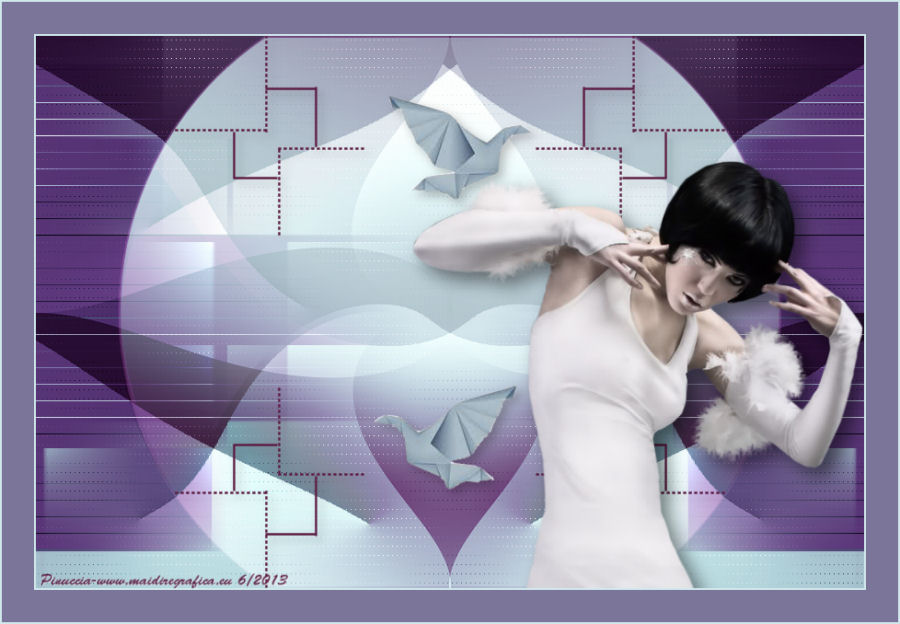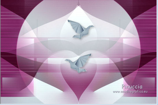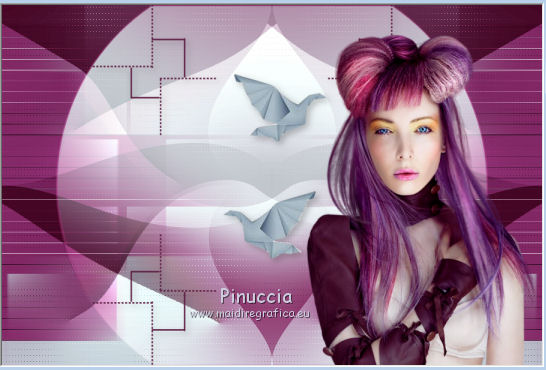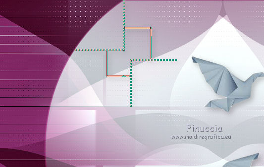qui puoi trovare qualche risposta ai tuoi dubbi. Se l'argomento che ti interessa non è presente, ti prego di segnalarmelo. Questo tutorial è stato creato con CorelX5, ma può essere realizzato anche con le altre versioni di PSP. Nelle versioni X4 e X5 il comando Immagine>Rifletti è stato sostituito con Immagine>Capovolgi in orizzontale, e il comando Immagine>Capovolgi con Immagine>Capovolgi in verticale. Nella versione X5, le funzioni sono state migliorate rendendo disponibili il menu Oggetti. Vedi la scheda sull'argomento qui Per tradurlo ho usato PSP X. Occorrente: Un tube a scelta Il resto del materiale qui Per il tube della donna grazie Alies. Il tube non è compreso nel materiale perchè è un tube esclusivo riservato ai suoi gruppi. Filtri in caso di dubbi, ricorda di consultare la mia sezione filtri qui Filters Unlimited 2.0 qui &<Bkg Kaleidoscope (da importare in Unlimited) qui Mehdi - Wavy Lab qui Toadies - Weaver qui L&K - Zitah qui L&K - Mayra qui Simple - Top Left Mirror qui ![]() Se utilizzi altri tubes e/o altri colori, puoi sperimentare le modalità di miscelatura e opacità più adatte. Metti il pennello nella cartella Pennelli. Attenzione, il pennello è composto da due files che non devono essere separati. Vedi gli appunti sui pennelli qui 1. Imposta il colore di primo piano con #d7f7f7, e il colore di sfondo con #5d1e44. ![]() Passa il colore di primo piano a Gradiente, stile Radiale. ![]() 2. Apri selections_Alpha_origami. Duplica l'immagine usando la combinazione di tasti maiuscola+D. Chiudi l'originale e lavora sulla copia. L'immagine non è vuota, ma contiene le selezioni salvate sul canale alfa. Rinomina il livello Raster 1. Riempi l'immagine trasparente con il gradiente.3. Effetti>Plugins>Filters Unlimited 2.0 - &<Bkg Kaleidoscope> - Cake Mix, con i settaggi standard. ![]() 4. Effetti>Effetti di distorsione>Mulinello. ![]() Dovresti avere questo. ![]() 5. Livelli>Duplica. Immagine>Rifletti. Abbassa l'opacità di questo livello al 50%. ![]() Livelli>Unisci>Unisci giù. 6. Livelli>Duplica, e attiva nuovamente il livello Raster 1. 7. Effetti>Plugins>L&K's - L&K's - Zitah. ![]() non vedrai il risultato perchè il livello è coperto dal livello superiore 8. Attiva nuovamente il livello superiore Copia di Raster 1. Cambia la modalità di miscelatura di questo livello in Sovrapponi, e abbassa l'opacità al 50%. ![]() 9. Livelli>Nuovo livello raster. Selezione>Carica/Salva selezione>Carica selezione da canale alfa. La selezione Selection#1 è subito disponibile. Devi soltanto cliccare Carica. ![]() 10. Effetti>Plugins>Mehdi - Wavy Lab Il filtro lavora con i colori impostati nella paletta dei materiali: il primo è il colore di sfondo, il secondo quello di primo piano. Lascia il terzo colore creato dal filtro in base a questi colori. ![]() Selezione>Deseleziona. 11. Effetti>Plugins>L&K's - L&K's Mayra. ![]() 12. Effetti>Plugins>Toadies - Weaver, con i settaggi standard. ![]() 13. Livelli>Duplica. Immagine>Rifletti. Livelli>Unisci>Unisci giù. 14. Cambia la modalità di miscelatura di questo livello in Luce netta. ![]() 15. Livelli>Nuovo livello raster. Selezione>Carica/Salva selezione>Carica selezione da canale alfa. Apri il menu delle selezioni e carica la selezione #2_alpha_origami. ![]() Riempi la selezione con il colore scuro di sfondo #5d1e44.16. Selezione>Modifica>Contrai - 2 pixels. ![]() Premi sulla tastiera il tasto CANC ![]() Mantieni selezionato. 17. Effetti>Plugins>Mehdi - Wavy Lab. ![]() Selezione>Deseleziona. 18. Cambia la modalità di miscelatura di questo livello in Filtra, e abbassa l'opacità all'80%. ![]() 19. Apri il tube origami_@qua e vai a Modifica>Copia. Torna al tuo lavoro e vai a Modifica>Incolla come nuovo livello. Spostalo in alto al centro come nel mio esempio.20. Livelli>Duplica. Immagine>Rifletti. Posiziona il duplicato sotto l'originale.![]() Livelli>Unisci>Unisci giù. 21. Effetti>Effetti 3D>Sfalsa ombra. ![]() 22. Dovresti avere questo. ![]() 23. Inverti i colori nella paletta dei materiali, in modo che il colore scuro #5d1e44 passi a colore di primo piano. ![]() 24. Attiva lo strumento Pennello ![]() cerca e seleziona il pennello @qua_carres4 ![]() 25. Livelli>Nuovo livello raster. Applica il pennello in alto a sinistra, cliccando con il tasto sinistro del mouse, per usare il colore scuro #5d1e44. ![]() 26. Effetti>Plugins>Simple - Top Left Mirror. ![]() 27. Effetti>Effetti 3D>Sfalsa ombra, con i settaggi precedenti. 28. Apri il tube Alies 1VR488-woman-18052013 e vai a Modifica>Copia. Torna al tuo lavoro e vai a Modifica>Incolla come nuovo livello. Immagine>Ridimensiona, al 90%, tutti i livelli non selezionato. Spostalo in basso a destra.![]() 29. Effetti>Effetti 3D>Sfalsa ombra. ![]() 30. Immagine>Aggiungi bordatura, 2 pixels, simmetriche, con il colore chiaro #d7f7f7. Immagine>Aggiungi bordatura, 35 pixels, simmetriche, con il colore scuro #5d1e44. Immagine>Aggiungi bordatura, 2 pixels, simmetriche, con il colore chiaro #d7f7f7. 31. Firma il tuo lavoro e salva in formato jpg. Per questi esempi ho usato tubes di Gabry ![]() AnaRidzi ![]() ![]() Se hai problemi o dubbi, o trovi un link non funzionante, o anche soltanto per un saluto, scrivimi. 27 Giugno 2013 |