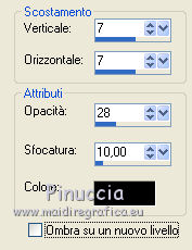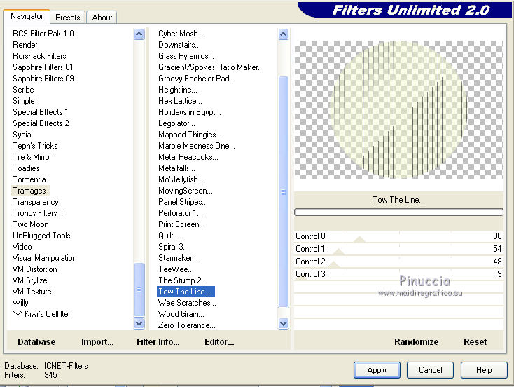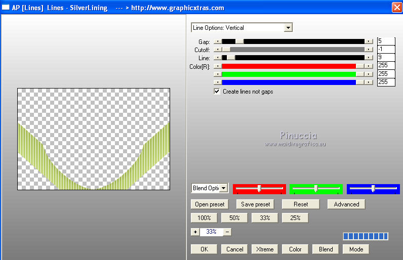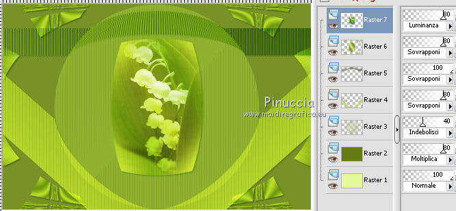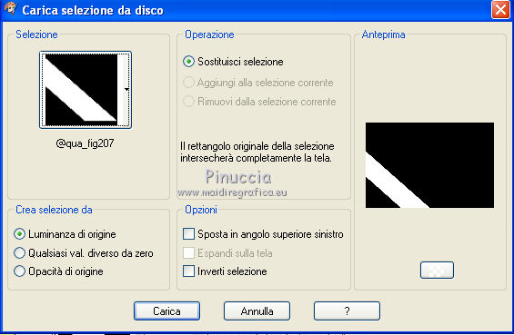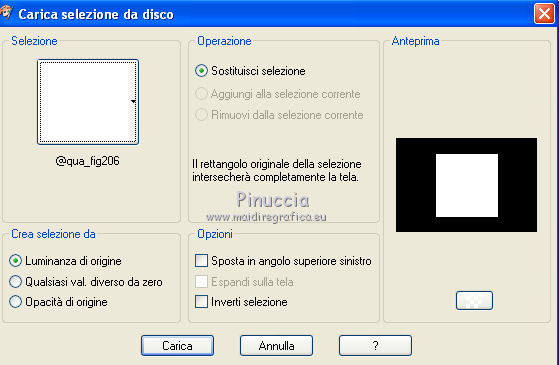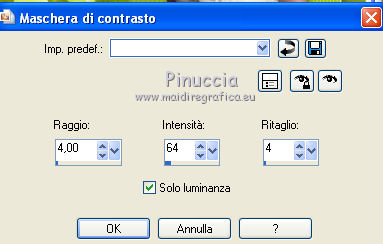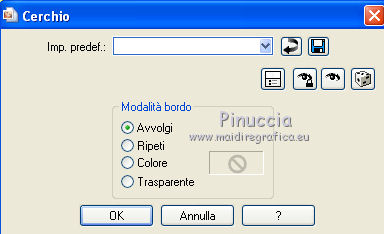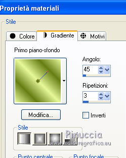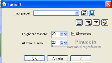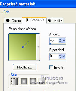 qui puoi trovare qualche risposta ai tuoi dubbi. Se l'argomento che ti interessa non è presente, ti prego di segnalarmelo. Questo tutorial è stato creato con PSP X3, ma può essere eseguito anche con le altre versioni di PSP. Per tradurlo, ho usato PSP X. Occorrente: Materiale qui Il tube della donna è di Aquarellice. Il tube del mughetto è di DragonBlue che ringrazio per il suo lavoro. Grazie a tutti i creatori di tubes per le loro immagini. Lascia intatto il nome del tube. Il © appartiene all'artista originale. Mantieni il credito di chi ha creato il tube. Filtri in caso di dubbi, ricorda di consultare la mia sezione filtri qui Filters Unlimited 2.0 qui Tramages - Tow the line qui AP Lines - Lines SilverLining qui I filtri Tramages si possono usare importandoli in Filters Unlimited, ma possono funzionare anche da soli ![]() Metti le selezioni nella cartella Selezioni. Nel corso del tutorial sono stati usati questi colori. ![]() 1. Imposta il colore di primo piano con il colore chiaro #e6f799, e il colore di sfondo con il colore scuro #667d15. 2. Apri una nuova immagine trasparente 900 x 600 pixels, e riempila con il colore chiaro di primo piano.3. Livelli>Nuovo livello raster. Riempi con il colore scuro.Cambia la modalità di miscelatura di questo livello in Moltiplica, e abbassa l'opacità all'80%. 4. Livelli>Nuovo livello raster. Imposta l'opacità dello strumento Riempimento a 50,e riempi il livello con il colore chiaro. Riporta l'opacità a 100. 5. Effetti>Effetti geometrici>Cerchio. ![]() 6. Effetti>Plugins>Filters Unlimited 2.0 - Tramages - Tow the line, con i settaggi standard. ![]() Cambia la modalità di miscelatura di questo livello in Indebolisci, e abbassa l'opacità al 40%. 7. Effetti>Effetti 3D>Sfalsa ombra. ![]() 8. Livelli>Nuovo livello raster. Selezione>Carica/Salva selezione>Carica selezione da disco. Cerca e carica la selezione @qua_fig207. ![]() Passa il colore di primo piano a Gradiente. ![]() Riempi la selezione con il gradiente.Selezione>Deseleziona. 9. Effetti>Effetti geometrici>Sfera. ![]() 10. Livelli>Duplica. Immagine>Rifletti. Livelli>Unisci>Unisci giù. 11. Effetti>Plugins>AP Lines - Lines SilverLining. ![]() 12. Cambia la modalità di miscelatura di questo livello in Sovrapponi, e abbassa l'opacità all'80%. 13. Effetti>Effetti 3D>Sfalsa ombra. ![]() 14. Attiva lo strumento Selezione ![]() clicca sull'icona Selezione personalizzata ![]() e imposta i seguenti settaggi. ![]() Riempi la selezione con il gradiente precedente,opacità Riempimento a 50. Riporta l'opacità a 100. Selezione>Deseleziona. 15. Effetti>Effetti di trama>Veneziana - colore nero. ![]() 16. Effetti>Effetti geometrici>Sfera. ![]() Cambia la modalità di miscelatura di questo livello in Sovrapponi. 17. Effetti>Effetti 3D>Sfalsa ombra, con i settaggi precedenti. ![]() 18. Livelli>Nuovo livello raster. Selezione>Carica/Salva selezione>Carica selezione da disco. Cerca e carica la selezione @qua_fig206. ![]() 19. Cambia i settaggi del gradiente. ![]() Riempi la selezione con questo gradiente.20. Regola>Sfocatura>Sfocatura gaussiana - raggio 15. ![]() Selezione>Deseleziona. 21. Effetti>Effetti di deformazione>Tasselli. ![]() 22. Effetti>Effetti geometrici>Cerchio. ![]() 23. Effetti>Effetti 3D>Sfalsa ombra, con i settaggi precedenti. 24. Apri il tube del mughetto DragonBluMistedTube_0509_LilyofTheValley04 e vai a Modifica>Copia. Torna al tuo lavoro e vai a Modifica>Incolla come nuovo livello. Immagine>Ridimensiona, all'80%, tutti i livelli non selezionato. 25. Attiva il livello sottostante - Raster 6. Selezione>Seleziona tutto. Selezione>Mobile. Selezione>Immobilizza. Selezione>Inverti. 26. Attiva ancora il livello soprastante del mughetto, e premi sulla tastiera il tasto CANC. Selezione>Deseleziona. 27. Attiva nuovamente il livello Raster 6. Cambia la modalità di miscelatura di questo livello in Luminanza, e abbassa l'opacità all'80%. ![]() 28. Livelli>Nuovo livello raster. Selezione>Carica/Salva selezione>Carica selezione da disco. Cerca e carica la selezione @qua_fig210. ![]() 29. Imposta il colore di primo piano con il colore bianco, e riempi le selezioni con questo colore.Selezione>Deseleziona. 30. Effetti>Effetti 3D>Sfalsa ombra, con i settaggi precedenti. ![]() 31. Apri il tube della donna @qua_femme3 e vai a Modifica>Copia. Torna al tuo lavoro e vai a Modifica>Incolla come nuovo livello. Immagine>Ridimensiona, 2 volte all'80%, tutti i livelli non selezionato. Posiziona il tube come nel mio esempio.32. Effetti>Effetti 3D>Sfalsa ombra. ![]() 33. Apri il testo "Premier Mai" e vai a Modifica>Copia. Torna al tuo lavoro e vai a Modifica>Incolla come nuovo livello. Immagine>Rifletti. Sposta il testo in alto, come nel mio esempio.34. Immagine>Aggiungi bordatura, 2 pixels, simmetriche, con il colore chiaro. Immagine>Aggiungi bordatura, 35 pixels, simmetriche, con il colore scuro. Seleziona questo bordo con la bacchetta magica ![]() e riempi la selezione con il gradiente del punto 19 (45/3).Selezione>Inverti. 35. Effetti>Effetti 3D>Sfalsa ombra, con i settaggi precedenti. ![]() Selezione>Deseleziona. 36. Immagine>Aggiungi bordatura, 2 pixels, simmetriche, con il colore chiaro. 37. Regola>Messa a fuoco>Maschera di contrasto. ![]() Firma il tuo lavoro e salva in formato jpg. Per questo esempio ho usato tubes di Tocha e Guismo. ![]() ![]() Se hai problemi o dubbi, o trovi un link non funzionante, o anche soltanto per un saluto, scrivimi. 23 Aprile 2012 |
