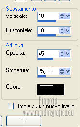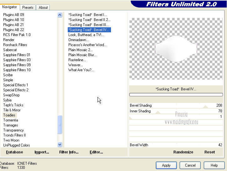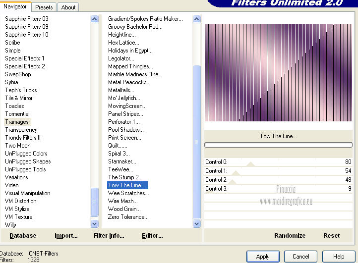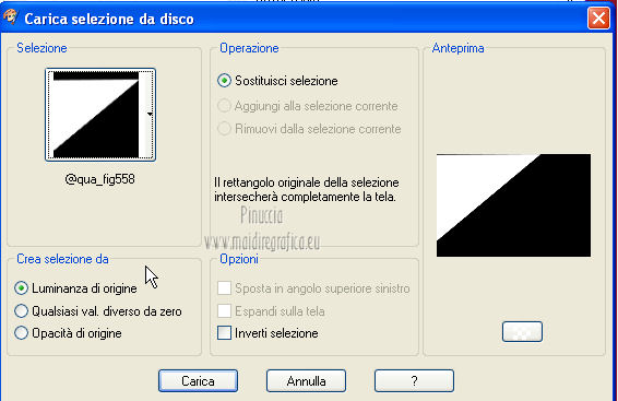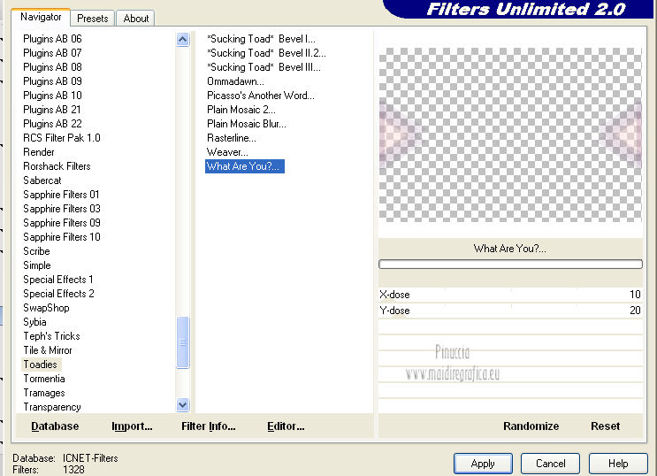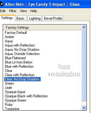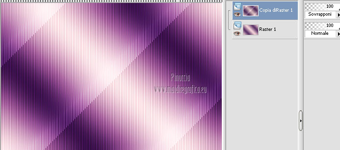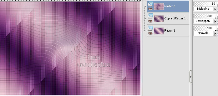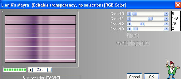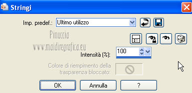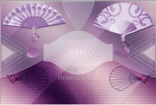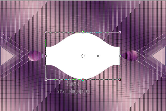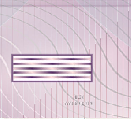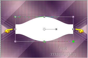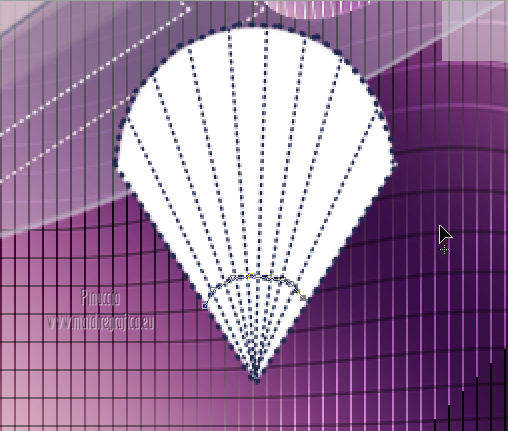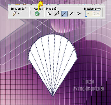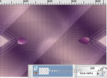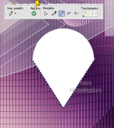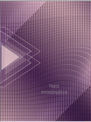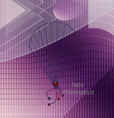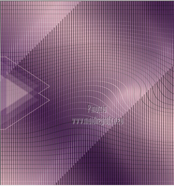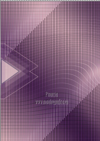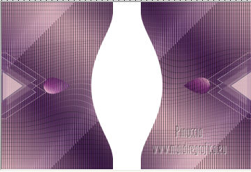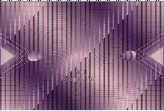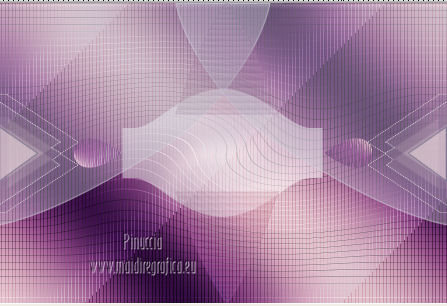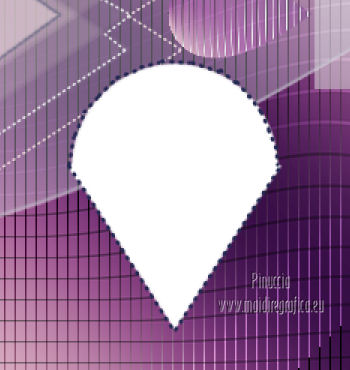 qui puoi trovare qualche risposta ai tuoi dubbi. Se l'argomento che ti interessa non è presente, ti prego di segnalarmelo. Questo tutorial è stato creato con PSP X3, ma può essere eseguito anche con le altre versioni di PSP. Per tradurlo, ho usato PSP X. Occorrente: Materiale qui Per il tube della donna grazie Gigi. Filtri in caso di dubbi, ricorda di consultare la mia sezione filtri qui Filters Unlimited 2.0 qui Tramages - Tow the lines qui L&K Mayra qui Toadies - What are you qui Alien Skin Eye Candy 5 Impact - Glass qui I filtri Tramages e Toadies si possono usare da soli o importandoli in Filters Unlimited (come fare vedi qui ![]() Metti le linee di stile @qua22 e @boules nella cartella Linee di stile. Metti le selezioni nella cartella Selezioni. 1. Imposta il colore di primo piano con #ffe0df, e il colore di sfondo con #512761. ![]() Passa il colore di primo piano a Gradiente, stile Lineare, con i seguenti settaggi. ![]() 2. Apri una nuova immagine trasparente 900 x 600 pixels, e riempila con il gradiente.3. Regola>Sfocatura>Sfocatura gaussiana - raggio 30. ![]() 4. Livelli>Duplica. Effetti>Plugins>Filters Unlimited 2.0 - Tramages - Tow the line, con i settaggi standard. ![]() Cambia la modalità di miscelatura di questo livello in Sovrapponi. ![]() 5. Livelli>Nuovo livello raster. Cambia i settaggi del gradiente in stile Radiale. ![]() Riempi il livello con il gradiente.6. Regola>Sfocatura>Sfocatura gaussiana - raggio 30. ![]() 7. Effetti>Plugins>L & K's - L & K Mayra, con i settaggi standard. ![]() 8. Effetti>Effetti di distorsione>Mulinello. ![]() Cambia la modalità di miscelatura di questo livello in Moltiplica, e abbassa l'opacità al 50%. ![]() 9. Livelli>Nuovo livello raster. Selezione>Carica/Salva selezione>Carica selezione da disco. Cerca e carica la selezione @qua_fig555. ![]() 10. Riempi la selezione con il colore scuro di sfondo ![]() Selezione>Modifica>Contrai - 2 pixels. ![]() Premi sulla tastiera il tasto CANC. 11. Riporta il colore di primo piano al Colore chiaro ![]() Imposta l'opacità dello strumento Riempimento a 50 ![]() e riempi la selezione con il colore chiaro ![]() Selezione>Deseleziona. 12. Effetti>Plugins>Filters Unlimited 2.0 - Toadies - What are you. ![]() 13. Attiva lo strumento Penna ,seleziona la linea di stile @qua_boules ![]() larghezza 2 pixels ![]() e, con il colore chiaro di primo piano ![]() traccia il contorno dell'immagine, come nell'esempio. Non esitare a ingrandire l'immagine usando lo zoom per visualizzare meglio il lavoro. Eventualmente chiudi i livelli che ti impediscono una completa visualizzazione. ![]() Livelli>Converti in livello raster. 14. Livelli>Nuovo livello raster. Selezione>Carica/Salva selezione>Carica selezione da disco. Cerca e carica la selezione @qua_fig565. ![]() 15. Imposta il colore di sfondo con #232851 ![]() riporta l'opacità dello strumento riempimento a 100 e riempi la selezione con il colore scuro di sfondo.dovrai cambiare più volte colore nella paletta dei materiali. Non lo scriverò più: assicurati, di volta in volta, che siano impostati i colori richiesti Selezione>Modifica>Contrai - 2 pixels. ![]() Premi sulla tastiera il tasto CANC. Riporta l'opacità dello strumento Riempimento a 50 e riempi la selezione con il colore chiaro ![]() Selezione>Deseleziona. Dovresti avere questo. ![]() Livelli>Duplica. Immagine>Rifletti. ![]() 17. Imposta il colore di primo piano con il colore bianco .Attiva nuovamente lo strumento Penna ,linea di stile @qua_boules, con i settaggi precedenti. e traccia il secondo perimetro della forma. ![]() Ripeti anche a destra. ![]() Livelli>Converti in livello raster. 18. Livelli>Nuovo livello raster. Selezione>Carica/Salva selezione>Carica selezione da disco. Carica nuovamente la selezione @qua_fig555. ![]() 19. Imposta i colori iniziali (primo piano #ffe0df, sfondo #512761) e passa il colore di primo piano al Gradiente lineare. Riempi la selezione con il gradiente, opacità 100 20. Effetti>Plugins>Filters Unlimited 2.0 - Tramages - Tow the line, con i settaggi precedenti. Selezione>Deseleziona. 21. Effetti>Effetti geometrici>Cerchio. ![]() Dovresti avere questo. ![]() 22. Cambia la modalità di miscelatura di questo livello in Luce netta. Risultato. ![]() 23. Livelli>Nuovo livello raster. Selezione>Carica/Salva selezione>Carica selezione da disco. Cerca e carica la selezione @qua_fig566. ![]() 24. Riempi la selezione con il colore bianco, opacità 100 Selezione>Deseleziona. 25. Effetti>Effetti di distorsione>Distorsione. ![]() Dovresti avere questo. ![]() Immagine>Ruota per gradi - 90 gradi a destra. ![]() Risultato ![]() Premi il tasto K per attivare lo strumento Puntatore ![]() se stai usando PSP 9 il tasto D (valido per tutte le versioni) per attivare lo strumento Deformazione ![]() in modalità Scala, usa i nodi centrali a destra e a sinistra ![]() per stringere l'immagine fino alla punta delle gocce. ![]() Clicca sulla manina per disattivare lo strumento.26. Effetti>Plugins>Filters Unlimited 2.0. - Toadies - *Sucking Toad* Bevel IV, con i settaggi standard. ![]() Abbassa l'opacità di questo livello al 50%. ![]() 27. Livelli>Nuovo livello raster. Selezione>Carica/Salva selezione>Carica selezione da disco. Cerca e carica la selezione @qua_fig558. ![]() Riempi la selezione con il colore bianco,opacità 50 Selezione>Deseleziona. 28. Effetti>Effetti di distorsione>Stringi (nelle versioni più recenti di PSP Compressione). ![]() Risultato. ![]() 29. Selezione>Seleziona tutto. Selezione>Mobile. Riempi la selezione con il colore scuro #232851 ![]() opacità 100 Selezione>Modifica>Contrai - 2 pixels. ![]() Premi sulla tastiera il tasto CANC. Selezione>Deseleziona. 30. Livelli>Duplica. Immagine>Rifletti. 31. Livelli>Nuovo livello raster. Selezione>Carica/Salva selezione>Carica selezione da disco. Cerca e carica la selezione @qua_fig560. ![]() Riempi la selezione con il colore #92649f ![]() opacità 100 Selezione>Modifica>Contrai - 2 pixels. ![]() Premi sulla tastiera il tasto CANC. 32. E