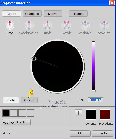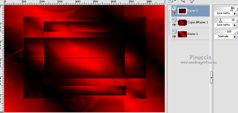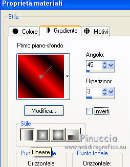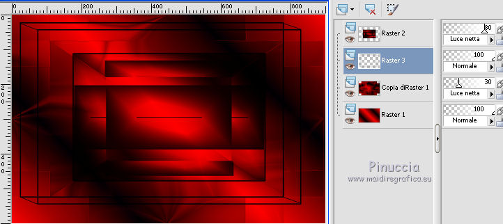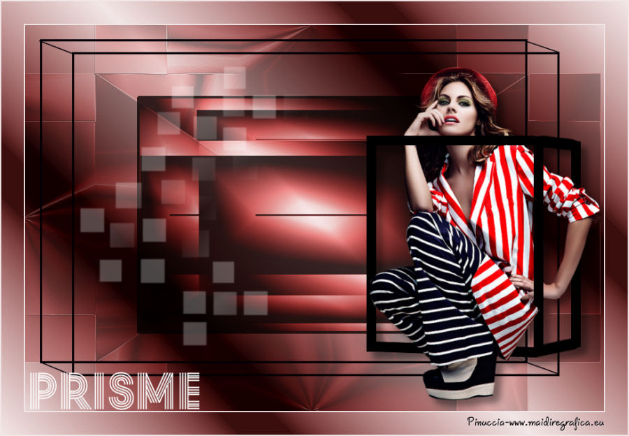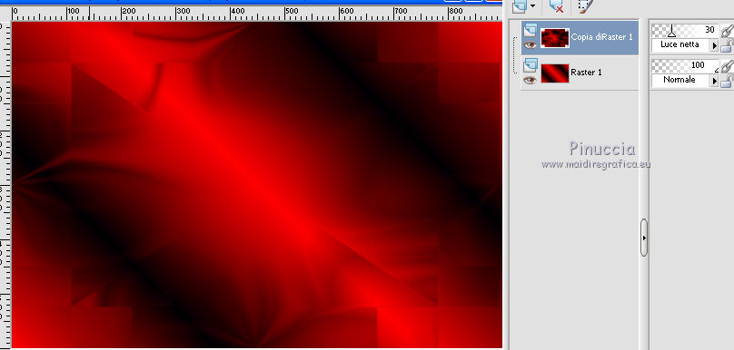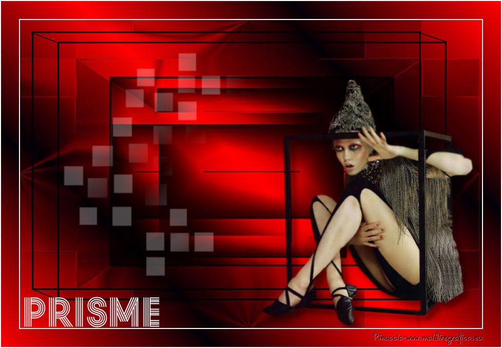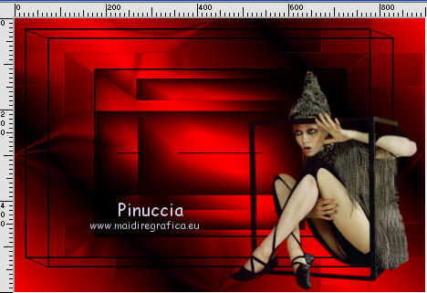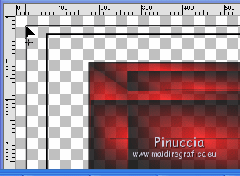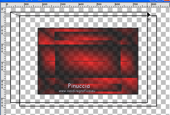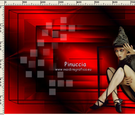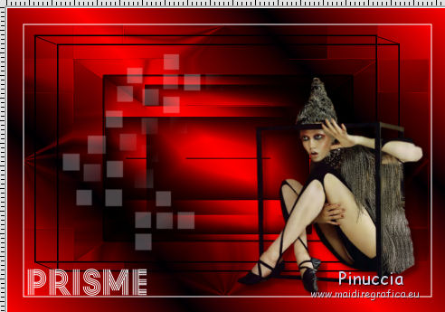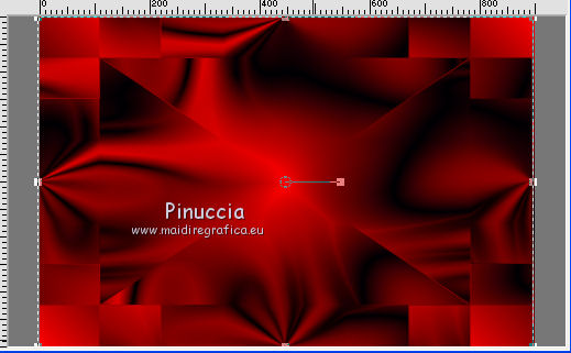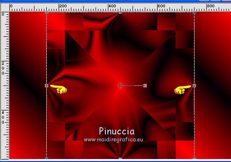 qui puoi trovare qualche risposta ai tuoi dubbi. Se l'argomento che ti interessa non è presente, ti prego di segnalarmelo. Questo tutorial è stato creato con CorelX8, ma può essere realizzato anche con le altre versioni di PSP. Dalla versione X4, il comando Immagine>Rifletti è stato sostituito con Immagine>Capovolgi in orizzontale, e il comando Immagine>Capovolgi con Immagine>Capovolgi in verticale. Nelle versioni X5 e X6, le funzioni sono state migliorate rendendo disponibile il menu Oggetti. Con la nuova versione X7, sono tornati Rifletti/Capovolgi, ma con nuove funzioni. Vedi la scheda sull'argomento qui Per tradurre questo tutorial ho usato PSP X. Occorrente: Un tube a scelta. Il resto del materiale qui Per il tube utilizzato grazie LuzCristina. Filtri in caso di dubbi, ricorda di consultare la mia sezione filtri qui Filters Unlimited 2.0 qui &<Bkg Designers sf10I> - Mirror Bevel (da importare in Unlimited) qui VM Toolbox - MirrororriM qui VM Distortion - Radiator II qui VM Natural - Downstairs qui Flaming Pear - Flexify 2 qui I filtri della serie VM si possono usare da soli o importati in Filters Unlimited (come fare vedi qui) Se un filtro fornito appare con questa icona ![]() Se utilizzi altri tubes e/o altri colori, puoi sperimentare le modalità di miscelatura e opacità più adatte. Nelle ultime versioni di PSP non c'è il gradiente di primo piano/sfondo (Corel_06_029) Trovi i gradienti delle versioni precedenti qui Metti il pennello nella cartella Pennelli. Attenzione, il pennello è composto da due files che non devono essere separati. Vedi gli appunti sui pennelli qui 1. Imposta il colore di primo piano con #fe0100, e il colore di sfondo con il colore #030005. ![]() Passa il colore di primo piano a Gradiente di primo piano/sfondo, stile Lineare. ![]() 2. Apri selections_alpha_prisme. Duplica l'immagine usando la combinazione di tasti maiuscola+D, ![]() oppure Modifica>Copia/Modifica>Incolla come nuova immagine. Chiudi l'originale e lavora sulla copia. L'immagine non è vuota, ma contiene le selezioni salvate sul canale alfa. 3. Riempi l'immagine trasparente con il gradiente.4. Livelli>Duplica. Effetti>Effetti di immagine>Motivo unico. ![]() 5. Effetti>Plugins>Filters Unlimited 2.0 - VM Toolbox - MirrororriM, con i settaggi standard. ![]() 6. Effetti>Plugins>Filters Unlimited 2.0 - VM Distortion - Radiator II, con i settaggi standard. ![]() 7. Effetti>Plugins>Flaming Pear - Flexify 2. ![]() 8. Selezione>Carica/Salva selezione>Carica selezione da canale alfa. La selezione sélection#1 è subito disponibile. Devi soltanto cliccare Carica. ![]() 9. Premi sulla tastiera il tasto CANC ![]() Selezione>Deseleziona. 10. Selezione>Carica/Salva selezione>Carica selezione da canale alfa. Apri il menu delle selezioni e carica sélection#2. ![]() Premi sulla tastiera il tasto CANC. Selezione>Deseleziona. 11. Selezione>Carica/Salva selezione>Carica selezione da canale alfa. Apri il menu delle selezioni e carica sélection#3. ![]() Premi sulla tastiera il tasto CANC. Selezione>Deseleziona. 12. Selezione>Carica/Salva selezione>Carica selezione da canale alfa. Apri il menu delle selezioni e carica sélection#4. ![]() Premi sulla tastiera il tasto CANC. Selezione>Deseleziona. 13. Attiva lo strumento Puntatore ![]() Se stai usando PSP 9 lo strumento Deformazione ,in modalità Scala ![]() spingi i nodi centrali a destra e a sinistra ![]() fino ai bordi ![]() Clicca sulla manina per deselezionare lo strumento.14. Cambia la modalità di miscelatura di questo livello in Luce netta, e abbassa l'opacità al 30%. ![]() 15. Effetti>Effetti di bordo>Aumenta di più. 16. Livelli>Nuovo livello raster. Selezione>Carica/Salva selezione>Carica selezione da canale alfa. Apri il menu delle selezioni e carica sélection#5. ![]() 17. Riempi la selezione con il gradiente.18. Effetti>Plugins>Filters Unlimited 2.0 - VM Natural - Downstairs, con i settaggi standard. ![]() 19. Se stai usando altri colori avrai una schermata molto differente. Prendendo per esempio il colore blu applica questi settaggi. ![]() Poi prendi nota dei valori di Tonalità (H) e Saturazione (S) del tuo colore di sfondo. Regola>Tonalità e Saturazione>Viraggio e trascrivi i valori annotati. ![]() Se stai usando Corel 17/18: apri la paletta del colore e clicca su Cursore ![]() Apri il menu dei cursori e seleziona cursori HSL ![]() E, per applicare il Viraggio, prendi nota dei valori di Tonalità e Saturazione. ![]() 20. Selezione>Deseleziona. 21. Effetti>Plugins>Filters Unlimited 2.0 - &<Bkg Designers sf10I> - Alf's Border Mirror Bevel, con i settaggi standard. ![]() 22. Cambia la modalità di miscelatura di questo livello in Luce netta, e abbassa l'opacità all'80%. ![]() 23. Immagine>Ridimensiona, all'80%, tutti i livelli non selezionato. ![]() 24. Selezione>Seleziona tutto. Selezione>Mobile. Selezione>Immobilizza. 25. Selezione>Modifica>Seleziona bordature selezione. ![]() 26. Riempi con il colore di sfondo.Selezione>Deseleziona. 27. Livelli>Nuovo livello raster. Selezione>Carica/Salva selezione>Carica selezione da canale alfa. Apri il menu delle selezioni e carica nuovamente sélection#5. ![]() 28. Riempi la selezione con il colore di sfondo #030005.Selezione>Modifica>Contrai - 3 pixels. ![]() Premi sulla tastiera il tasto CANC. Selezione>Deseleziona. 29. Immagine>Ridimensiona, al 110%, tutti i livelli non selezionato. 30. Livelli>Duplica. Effetti>Effetti di immagine>Scostamento. ![]() 31. Attiva lo strumento Penna ![]() Linea di stile Pieno, larghezza 2 pixels ![]() 32. Inverti i colori della paletta in modo che il colore scuro passi a colore di primo piano. ![]() 33. Traccia le linee con questo procedimento: (eventualmente chiudi i livelli che ti impediscono di vedere bene quello che stai facendo). clicca sul punto di partenza e vedrai un piccolo quadrato, poi clicca sul punto di arrivo e la linea si traccerà da sola ![]() 34. Ripeti nei quattro angoli ![]() Risultato ![]() 35. Livelli>Converti in livello raster. Livelli>Unisci>Unisci 
