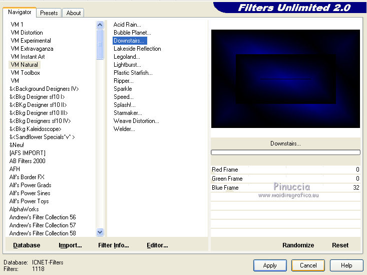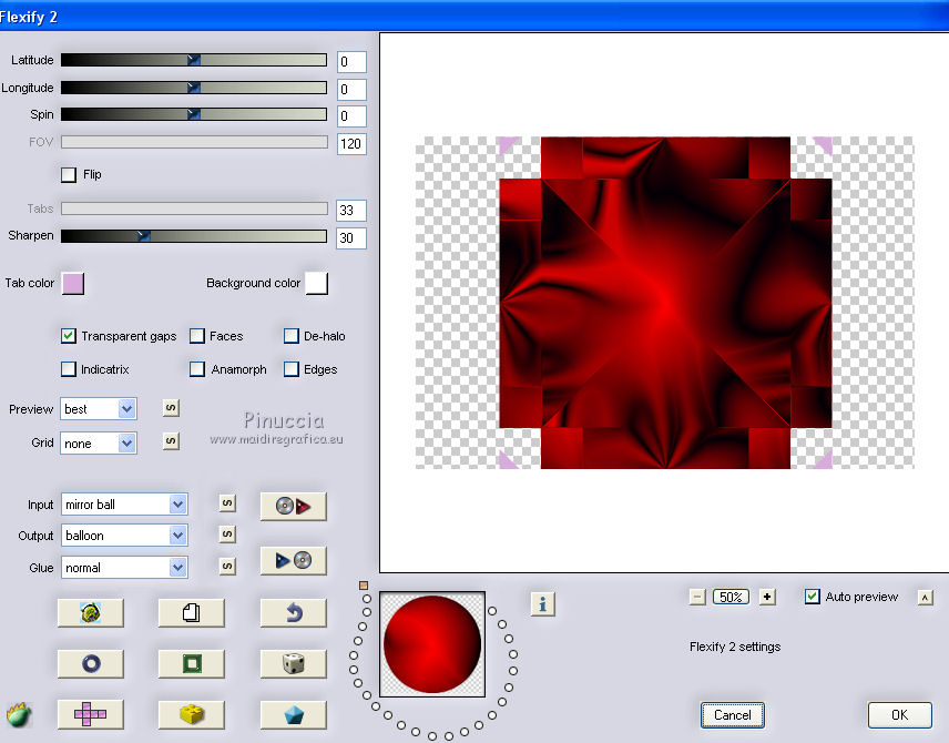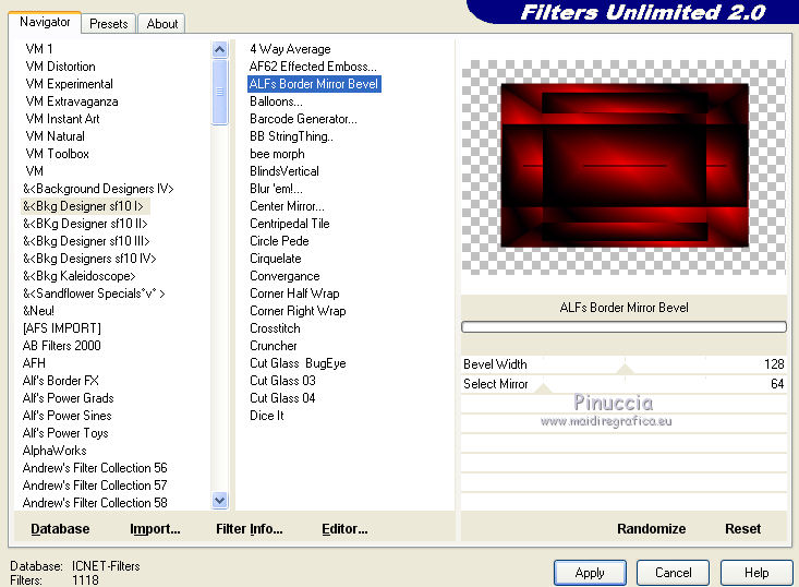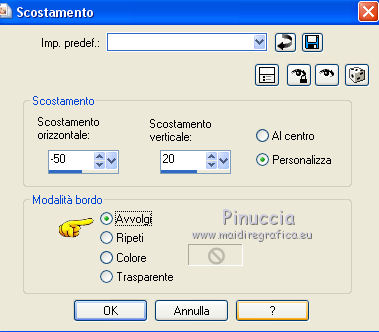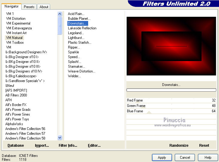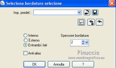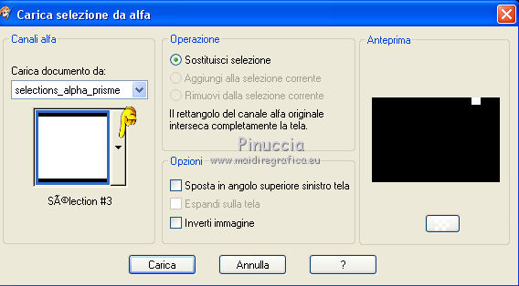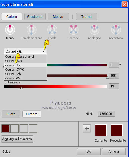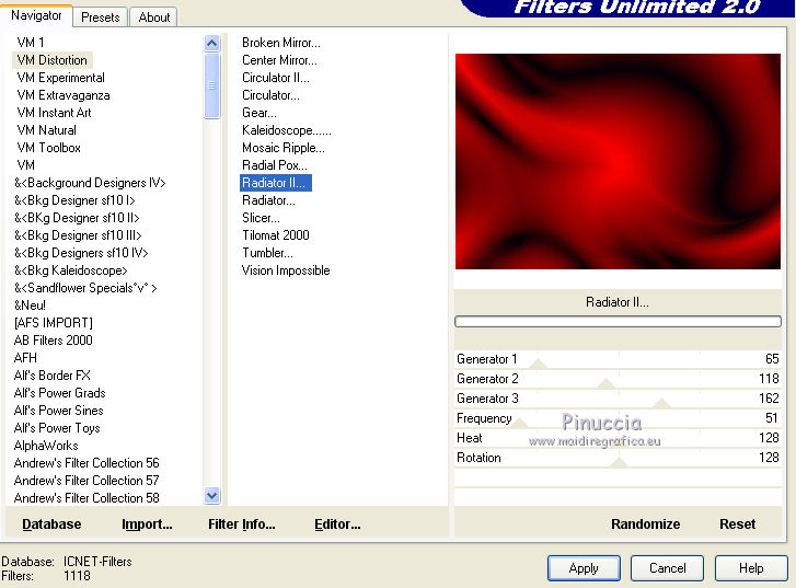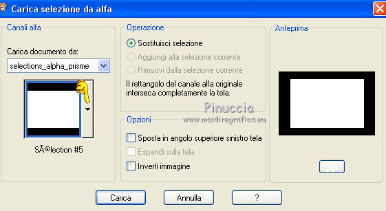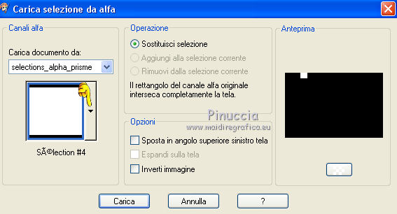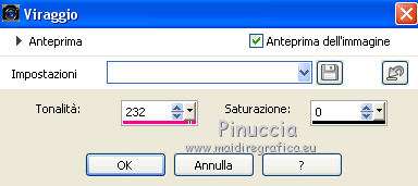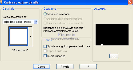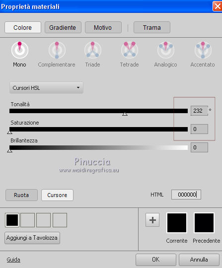 qui puoi trovare qualche risposta ai tuoi dubbi. Se l'argomento che ti interessa non è presente, ti prego di segnalarmelo. Questo tutorial è stato creato con CorelX8, ma può essere realizzato anche con le altre versioni di PSP. Dalla versione X4, il comando Immagine>Rifletti è stato sostituito con Immagine>Capovolgi in orizzontale, e il comando Immagine>Capovolgi con Immagine>Capovolgi in verticale. Nelle versioni X5 e X6, le funzioni sono state migliorate rendendo disponibile il menu Oggetti. Con la nuova versione X7, sono tornati Rifletti/Capovolgi, ma con nuove funzioni. Vedi la scheda sull'argomento qui Per tradurre questo tutorial ho usato PSP X. Occorrente: Un tube a scelta. Il resto del materiale qui Per il tube utilizzato grazie LuzCristina. Filtri in caso di dubbi, ricorda di consultare la mia sezione filtri qui Filters Unlimited 2.0 qui &<Bkg Designers sf10I> - Mirror Bevel (da importare in Unlimited) qui VM Toolbox - MirrororriM qui VM Distortion - Radiator II qui VM Natural - Downstairs qui Flaming Pear - Flexify 2 qui I filtri della serie VM si possono usare da soli o importati in Filters Unlimited (come fare vedi qui) Se un filtro fornito appare con questa icona ![]() Se utilizzi altri tubes e/o altri colori, puoi sperimentare le modalità di miscelatura e opacità più adatte. Nelle ultime versioni di PSP non c'è il gradiente di primo piano/sfondo (Corel_06_029) Trovi i gradienti delle versioni precedenti qui Metti il pennello nella cartella Pennelli. Attenzione, il pennello è composto da due files che non devono essere separati. Vedi gli appunti sui pennelli qui 1. Imposta il colore di primo piano con #fe0100, e il colore di sfondo con il colore #030005. ![]() Passa il colore di primo piano a Gradiente di primo piano/sfondo, stile Lineare. ![]() 2. Apri selections_alpha_prisme. Duplica l'immagine usando la combinazione di tasti maiuscola+D, ![]() oppure Modifica>Copia/Modifica>Incolla come nuova immagine. Chiudi l'originale e lavora sulla copia. L'immagine non è vuota, ma contiene le selezioni salvate sul canale alfa. 3. Riempi l'immagine trasparente con il gradiente.4. Livelli>Duplica. Effetti>Effetti di immagine>Motivo unico. ![]() 5. Effetti>Plugins>Filters Unlimited 2.0 - VM Toolbox - MirrororriM, con i settaggi standard. ![]() 6. Effetti>Plugins>Filters Unlimited 2.0 - VM Distortion - Radiator II, con i settaggi standard. ![]() 7. Effetti>Plugins>Flaming Pear - Flexify 2. ![]() 8. Selezione>Carica/Salva selezione>Carica selezione da canale alfa. La selezione sélection#1 è subito disponibile. Devi soltanto cliccare Carica. ![]() 9. Premi sulla tastiera il tasto CANC ![]() Selezione>Deseleziona. 10. Selezione>Carica/Salva selezione>Carica selezione da canale alfa. Apri il menu delle selezioni e carica sélection#2. ![]() Premi sulla tastiera il tasto CANC. Selezione>Deseleziona. 11. Selezione>Carica/Salva selezione>Carica selezione da canale alfa. Apri il menu delle selezioni e carica sélection#3. ![]() Premi sulla tastiera il tasto CANC. Selezione>Deseleziona. 12. Selezione>Carica/Salva selezione>Carica selezione da canale alfa. Apri il menu delle selezioni e carica sélection#4. ![]() Premi sulla tastiera il tasto CANC. Selezione>Deseleziona. 13. Attiva lo strumento Puntatore ![]() Se stai usando PSP 9 lo strumento Deformazione ,in modalità Scala ![]() spingi i nodi centrali a destra e a sinistra ![]() fino ai bordi ![]() Clicca sulla manina per deselezionare lo strumento.14. Cambia la modalità di miscelatura di questo livello in Luce netta, e abbassa l'opacità al 30%. ![]() 15. Effetti>Effetti di bordo>Aumenta di più. 16. Livelli>Nuovo livello raster. Selezione>Carica/Salva selezione>Carica selezione da canale alfa. Apri il menu delle selezioni e carica sélection#5. ![]() 17. Riempi la selezione con il gradiente.18. Effetti>Plugins>Filters Unlimited 2.0 - VM Natural - Downstairs, con i settaggi standard. ![]() 19. Se stai usando altri colori avrai una schermata molto differente. Prendendo per esempio il colore blu applica questi settaggi. ![]() Poi prendi nota dei valori di Tonalità (H) e Saturazione (S) del tuo colore di sfondo. Regola>Tonalità e Saturazione>Viraggio e trascrivi i valori annotati. ![]() Se stai usando Corel 17/18: apri la paletta del colore e clicca su Cursore ![]() Apri il menu dei cursori e seleziona cursori HSL ![]() E, per applicare il Viraggio, prendi nota dei valori di Tonalità e Saturazione. ![]() 20. Selezione>Deseleziona. 21. Effetti>Plugins>Filters Unlimited 2.0 - &<Bkg Designers sf10I> - Alf's Border Mirror Bevel, con i settaggi standard. ![]() 22. Cambia la modalità di miscelatura di questo livello in Luce netta, e abbassa l'opacità all'80%. ![]() 23. Immagine>Ridimensiona, all'80%, tutti i livelli non selezionato. ![]() 24. Selezione>Seleziona tutto. Selezione>Mobile. Selezione>Immobilizza. 25. Selezione>Modifica>Seleziona bordature selezione. ![]() 26. Riempi con il colore di sfondo.Selezione>Deseleziona. 27. Livelli>Nuovo livello raster. Selezione>Carica/Salva selezione>Carica selezione da canale alfa. Apri il menu delle selezioni e carica nuovamente sélection#5. ![]() 28. Riempi la selezione con il colore di sfondo #030005.Selezione>Modifica>Contrai - 3 pixels. ![]() Premi sulla tastiera il tasto CANC. Selezione>Deseleziona. 29. Immagine>Ridimensiona, al 110%, tutti i livelli non selezionato. 30. Livelli>Duplica. Effetti>Effetti di immagine>Scostamento. ![]() 31. Attiva lo strumento Penna ![]() Linea di stile Pieno, larghezza 2 pixels ![]() 32. Inverti i colori della paletta in modo che il colore scuro passi a colore di primo piano. ![]() 33. Traccia le linee con questo procedimento: (eventualmente chiudi i livelli che ti impediscono di vedere bene quello che stai facendo). clicca sul punto di partenza e vedrai un piccolo quadrato, poi clicca sul punto di arrivo e la linea si traccerà da sola ![]() 34. Ripeti nei quattro angoli ![]() Risultato ![]() 35. Livelli>Converti in livello raster. Livelli>Unisci>Unisci 