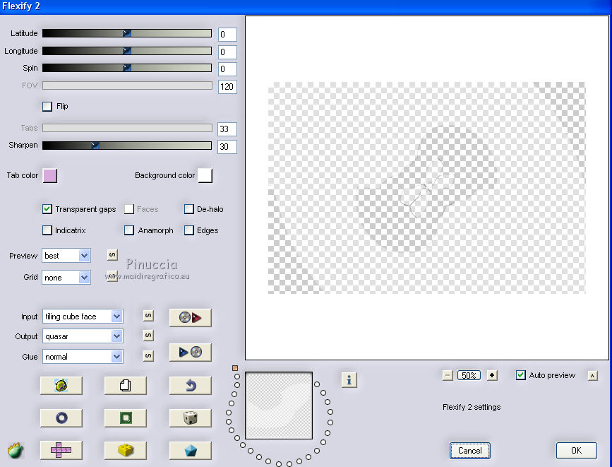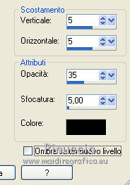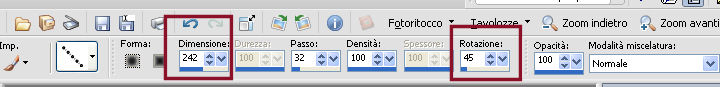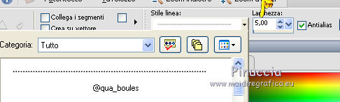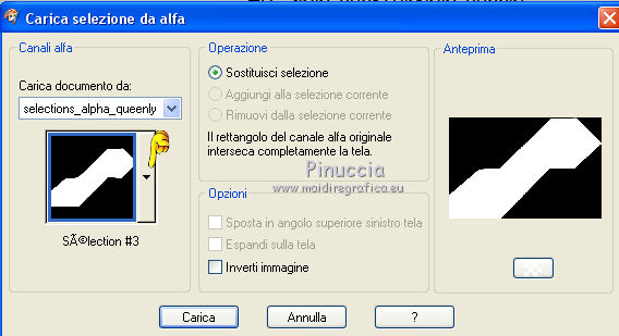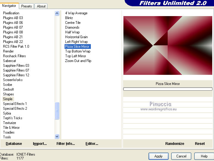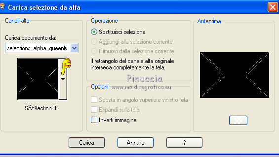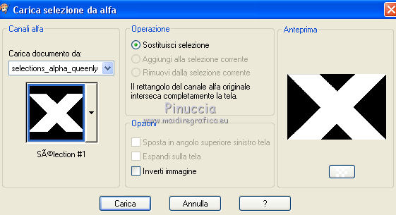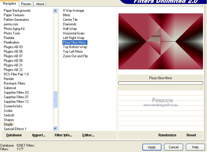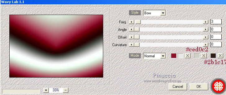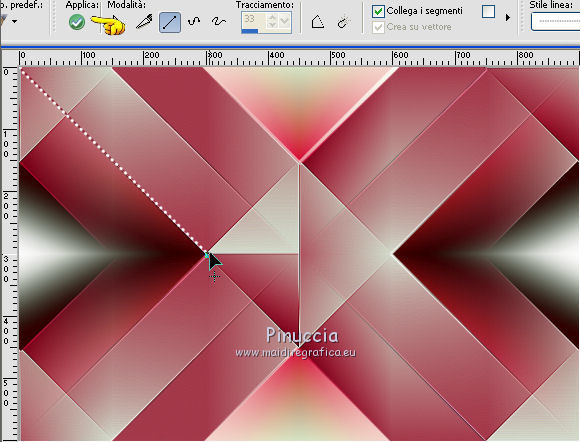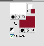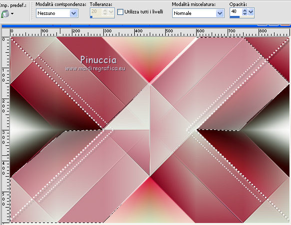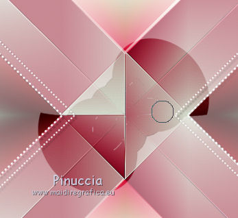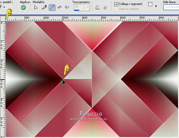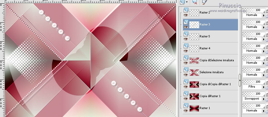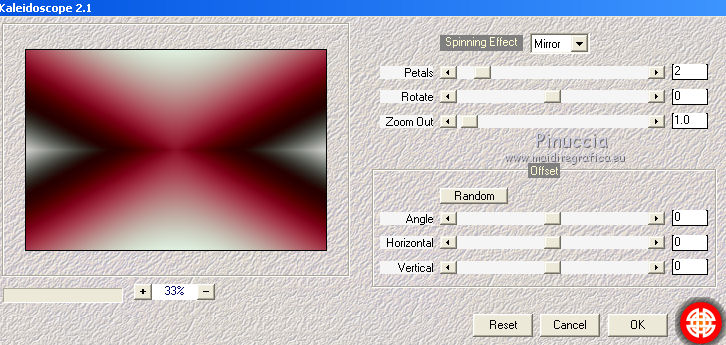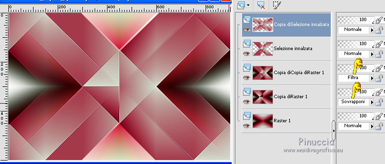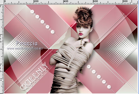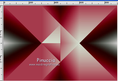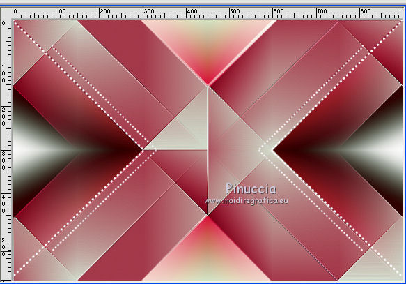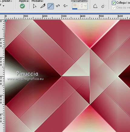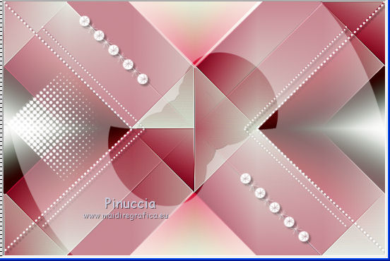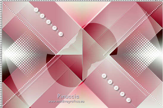 qui puoi trovare qualche risposta ai tuoi dubbi. Se l'argomento che ti interessa non è presente, ti prego di segnalarmelo. Questo tutorial è stato creato con CorelX8, ma può essere realizzato anche con le altre versioni di PSP. Dalla versione X4, il comando Immagine>Rifletti è stato sostituito con Immagine>Capovolgi in orizzontale, e il comando Immagine>Capovolgi con Immagine>Capovolgi in verticale. Nelle versioni X5 e X6, le funzioni sono state migliorate rendendo disponibile il menu Oggetti. Con la nuova versione X7, sono tornati Rifletti/Capovolgi, ma con nuove funzioni. Vedi la scheda sull'argomento qui Per tradurre questo tutorial ho usato PSP X. Occorrente: Un tube a scelta. Il resto del materiale qui Per il tube utilizzato grazie Nara Pamplona. Filtri in caso di dubbi, ricorda di consultare la mia sezione filtri qui Filters Unlimited 2.0 qui Mehdi - Wavy Lab 1.1 qui Mehdi - Kaleidoscope 2.1 qui Flaming Pear - Flexify 2 qui Simple - Pizza Slice Mirror qui I filtri Simpple si possono usare da soli o importati in Filters Unlimited (come fare vedi qui) Se un filtro fornito appare con questa icona ![]() Se utilizzi altri tubes e/o altri colori, puoi sperimentare le modalità di miscelatura e opacità più adatte. Metti la linea di stile @qua_boules nella cartella Linee di stile. Metti i pennelli nella cartella Pennelli. Attenzione, ogni pennello è composto da due files che non devono essere separati. Vedi gli appunti sui pennelli qui 1. Imposta il colore di primo piano con #e8e8e6, e il colore di sfondo con il colore #8b1128. ![]() 2. Apri selections_alpha_queenly. Duplica l'immagine usando la combinazione di tasti maiuscola+D, ![]() oppure Modifica>Copia/Modifica>Incolla come nuova immagine. Chiudi l'originale e lavora sulla copia. L'immagine non è vuota, ma contiene le selezioni salvate sul canale alfa. 3. Effetti>Plugins>Mehdi - Wavy Lab 1.1. Questo filtro lavora con i colori della paletta: il primo è il colore di sfondo, il secondo quello di primo piano; cambia il terzo colore con #ced0c2 e il quarto con #2b1c17. ![]() 4. Effetti>Plugins>Mehdi - Kaleidoscope 2.1. ![]() 5. Livelli>Duplica. Effetti>Plugins>Filters Unlimited 2.0 - Simple - Pizza Slice Mirror. ![]() 6. Livelli>Duplica. Di nuovo Effetti>Plugins>Filters Unlimited 2.0 - Simple - Pizza Slice Mirror. ![]() Dovresti avere questo. ![]() 7. Selezione>Carica/Salva selezione>Carica selezione da canale alfa. La selezione sélection#1 è subito disponibile. Devi soltanto cliccare Carica. ![]() Selezione>Innalza selezione a livello. Selezione>Deseleziona. 8. Livelli>Duplica. Effetti>Effetti di immagine>Motivo unico. ![]() 9. Effetti>Effetti di bordo>Aumenta di più. 10. Cambia la modalità di miscelatura del livello Copia di Raster 1 in Sovrapponi, e del livello della seconda copia in Filtra (o secondo i tuoi colori). Per cambiare le modalità di miscelatura dei livelli non occorre attivare il livello, se la tua paletta si presenta così. ![]() per visualizzare la paletta dei livelli come nell'esempio, vedi qui 11. Rimani posizionato sul livello superiore. Imposta il colore di primo piano con il colore bianco #ffffff. ![]() 12. Se hai problemi con lo strumento Penna, puoi sostituire questo punto, con il punto 16 Attiva lo strumento Penna ![]() Cerca e seleziona la linea di style @qua_boules ![]() dimensioni 5, e seleziona collega segmenti e crea vettore ![]() Traccia una linea cliccando sul punto di partenza, e vedrai un piccolo quadrato se non vedi il quadretto, controlla di aver selezionato Collega segmenti poi clicca sul punto di arrivo ![]() e la linea si traccerà da sola. ![]() Ripeti per applicare una linea in basso ![]() Livelli>Converti in livello raster. 13. Livelli>Duplica. Immagine>Rifletti. Livelli>Unisci>Unisci giù. 14. Livelli>Duplica. Immagine>Ridimensiona, all'80%, tutti i livelli non selezionato. ![]() E dovresti avere questo ![]() Livelli>Unisci>Unisci giù. 15. Effetti>Effetti 3D>Sfalsa ombra, con i settaggi precedenti. ![]() ******** in sostituzione dei punti 12-15 16. Livelli>Nuovo livello raster. Selezione>Carica/Salva selezione>Carica selezione da canale alfa. Apri il menu delle selezioni e carica sélection#2. ![]() Riempi la selezione con il colore bianco.Selezione>Deseleziona. Effetti>Effetti 3D>Sfalsa ombra. ![]() ******* 17. Livelli>Nuovo livello raster. Selezione>Carica/Salva selezione>Carica selezione da canale alfa. Apri il menu delle selezioni e carica sélection#3. ![]() Abbassa l'opacità dello strumento Riempimento a 40, e riempi la selezione con il colore bianco.![]() Selezione>Deseleziona. 18. Effetti>Plugins>Flaming Pear - Flexify 2. ![]() 19. Attiva lo strumento Bacchetta magica ![]() e clicca nelle figure centrali per selezionarle. ![]() Premi sulla tastiera il tasto CANC ![]() Selezione>Deseleziona. eventualmente, attiva lo strumento Gomma ![]() eventuali tracce rimaste visibili ![]() 20. Livelli>Nuovo livello raster. Attiva lo strumento Pennello ![]() Cerca e seleziona il pennello Deco_Danetta-11-29-07-Christmas006, rotazione 45 ![]() Applica il pennello due volte come nell'esempio, cliccando con il tasto sinistro del mouse, per usare il colore bianco di primo piano. ![]() 21. Effetti>Effetti 3D>Sfalsa ombra, con i settaggi precedenti. ![]() 22. Livelli>Nuovo livello raster. Seleziona il pennello @qua_queenly ![]() e applicalo cliccando con il tasto sinistro del mouse per usare il colore bianco di primo piano. ![]() 23. Livelli>Duplica. Immagine>Rifletti. Livelli>Unisci>Unisci giù. ![]() 24. Effetti>Effetti 3D>Sfalsa ombra, con i settaggi precedenti. ![]() 25. Attiva il livello raster 2. Livelli>Disponi>Porta in alto. 26. Attiva il livello Raster 3. Porta questo livello sotto il livello Raster 2. ![]() 27. Attiva il livello superiore. Apri il tube TubeNaraPamplona 1531 e vai a Modifica>Copia. Torna al tuo lavoro e vai a Modifica>Incolla come nuovo livello. Immagine>Ridimesiona, all'80%, tutti i livelli non selezionato. Spostalo un po' più a destra.Effetti>Effetti 3D>Sfalsa ombra.