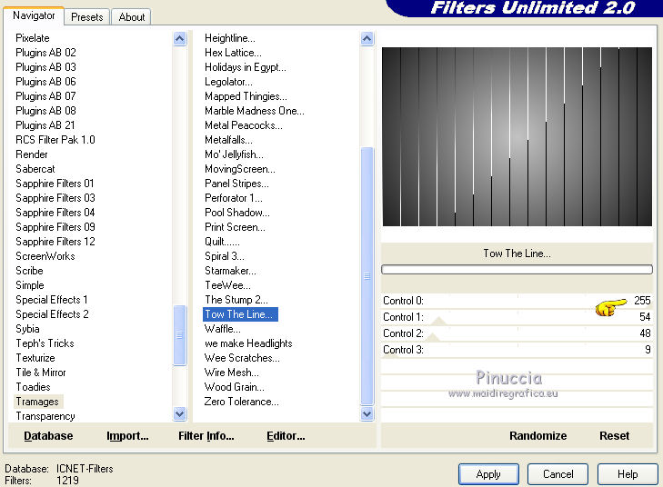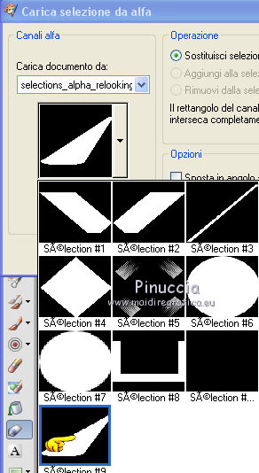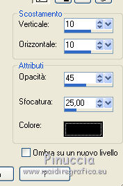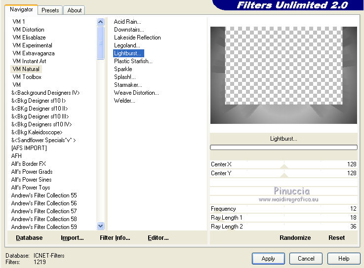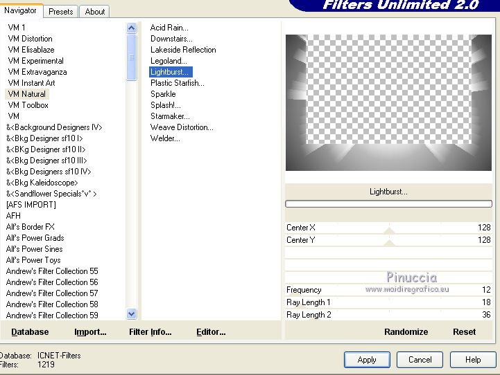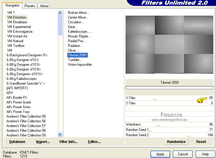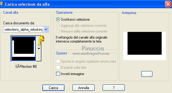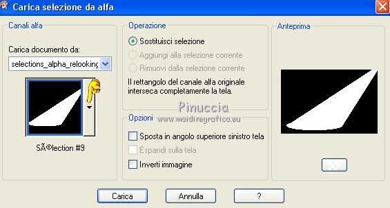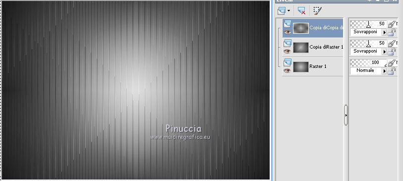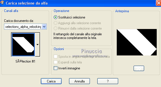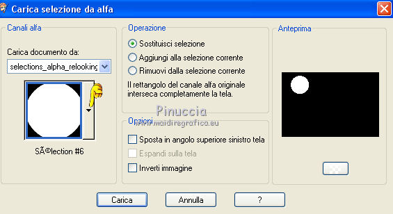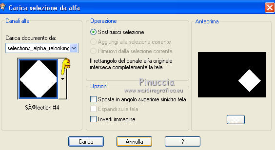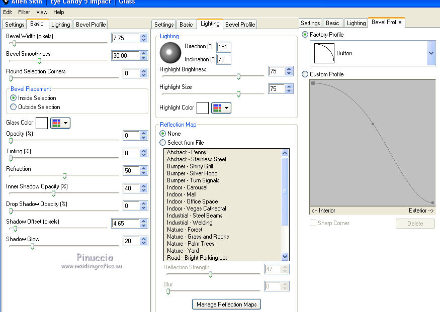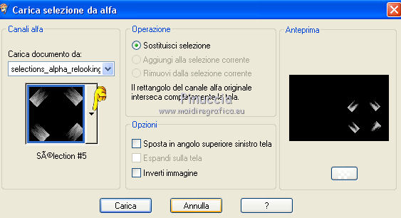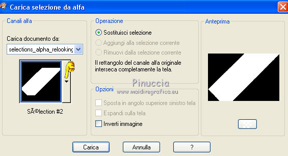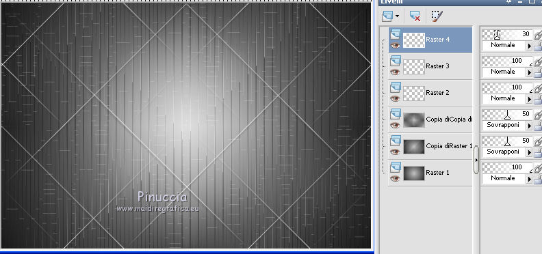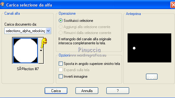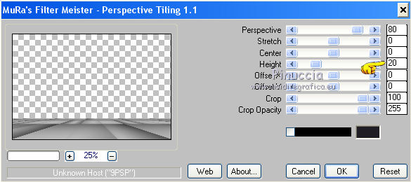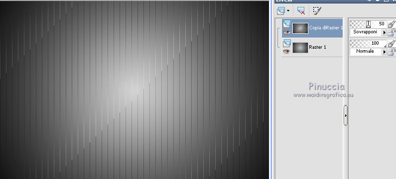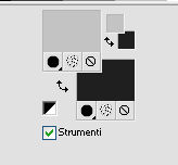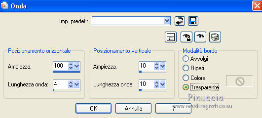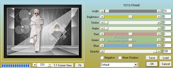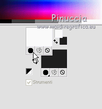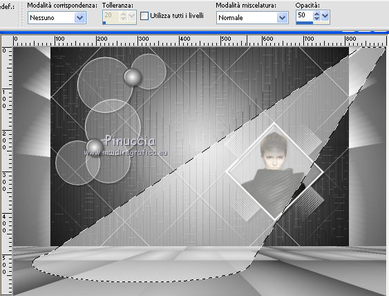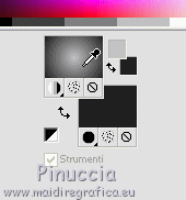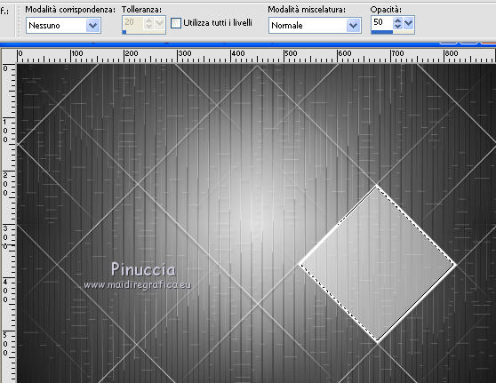 qui puoi trovare qualche risposta ai tuoi dubbi. Se l'argomento che ti interessa non è presente, ti prego di segnalarmelo. Questo tutorial è stato creato con CorelX7, ma può essere realizzato anche con le altre versioni di PSP. Dalla versione X4, il comando Immagine>Rifletti è stato sostituito con Immagine>Capovolgi in orizzontale, e il comando Immagine>Capovolgi con Immagine>Capovolgi in verticale. Nelle versioni X5 e X6, le funzioni sono state migliorate rendendo disponibile il menu Oggetti. Con la nuova versione X7, sono tornati Rifletti/Capovolgi, ma con nuove funzioni. Vedi la scheda sull'argomento qui Per tradurre questo tutorial ho usato PSP X. Occorrente: Materiale qui Per i tubes grazie Babette. Filtri in caso di dubbi, ricorda di consultare la mia sezione filtri qui Filters Unlimited 2.0 qui VM Natural - Lightburst qui VM Distortion - Tilomat 2000 qui Tramages - Tow the line qui Alien Skin Eye Candy 5 Impact - Glass qui AAA Frames - Foto Frame qui Mura's Meister - Perspective Tiling qui I filtri VM Natural e VM Distortion si possono usare da soli o importati in Filters Unlimited (come fare vedi qui) Se un filtro fornito appare con questa icona A seconda della versione di Unlimited utilizzata potresti ottenere risultati differenti. Per il mio esempio, per avere un risultato simile a quello del tutorial originale, ho usato la versione di Unlimited che non si installa, ma è composta da files in formato 8bf. La trovi qui ![]() Se utilizzi altri tubes e/o altri colori, puoi sperimentare le modalità di miscelatura e opacità più adatte. Metti il preset Cliccando sul file una o due volte (a seconda delle tue impostazioni), automaticamente il preset si installerà nella cartella corretta. perchè uno o due clic vedi qui 1. Imposta il colore di primo piano con #c3c3c3, e il colore di sfondo con #202020. ![]() Passa il colore di primo piano a Gradiente di primo piano/sfondo, stile Sprazzo di luce. ![]() 2. Apri selections_alpha_relooking. Duplica l'immagine usando la combinazione di tasti maiuscola+D, oppure Modifica>Copia/Modifica>Incolla come nuova immagine. Chiudi l'originale e lavora sulla copia. L'immagine non è vuota, ma contiene le selezioni salvate sul canale alfa. 3. Riempi l'immagine trasparente con il gradiente.4. Livelli>Duplica. Effetti>Plugins>Filters Unlimited 2.0 - Tramages - Tow the line. ![]() 5. Cambia la modalità di miscelatura di questo livello in Sovrapponi, e abbassa l'opacità al 50%. ![]() 6. Livelli>Duplica. Immagine>Rifletti. con PSPX7: Immagine>Rifletti>Rifletti orizzontale 7. Effetti>Effetti di immagine>Motivo unico. ![]() Risultato: ![]() 8. Livelli>Nuovo livello raster. Selezione>Carica/Salva selezione>Carica selezione da canale alfa. La selezione sélection#1 è subito disponibile. Devi soltanto cliccare Carica. ![]() 9. Imposta il colore di primo piano con il colore bianco: Clicca con il tasto destro del mouse sulla paletta per avere la tabella dei colori recenti: il bianco è sempre l'ultimo colore della tabella. Clicca sulla palettina per impostarlo. ![]() Riempi la selezione con il colore bianco #ffffff.10. Selezione>Modifica>Contrai - 2 pixels. ![]() Premi sulla tastiera il tasto CANC ![]() Selezione>Deseleziona. 11. Effetti>Effetti di immagine>Motivo unico, con i settaggi precedenti. ![]() 12. Effetti>Effetti 3D>Sfalsa ombra. ![]() 13. Livelli>Nuovo livello raster. Selezione>Carica/Salva selezione>Carica selezione da canale alfa. Apri il menu delle selezioni e carica sélection#2. ![]() 14. Riempi la selezione con il colore bianco #ffffff.Selezione>Modifica>Contrai - 2 pixels. Premi sulla tastiera il tasto CANC ![]() Selezione>Deseleziona. 15. Effetti>Effetti di immagine>Motivo unico, con i settaggi precedenti. ![]() 16. Effetti>Effetti 3D>Sfalsa ombra, con i settaggi precedenti. ![]() 17. Livelli>Nuovo livello raster. Selezione>Carica/Salva selezione>Carica selezione da canale alfa. Apri il menu delle selezioni e carica sélection#3. ![]() 18. Riempi la selezione con il colore bianco #ffffff.Selezione>Deseleziona. 19. Effetti>Effetti di distorsione>Onda. ![]() 20. Abbassa l'opacità di questo livello al 30%. ![]() Regola>Messa a fuoco>Accentua messa a fuoco. 21. Effetti>Effetti 3D>Sfalsa ombra. ![]() 22. Livelli>Nuovo livello raster. Selezione>Carica/Salva selezione>Carica selezione da canale alfa. Apri il menu delle selezioni e carica sélection#4. ![]() Riempi la selezione con il colore bianco #ffffff.23. Selezione>Modifica>Contrai - 5 pixels. ![]() Premi sulla tastiera il tasto CANC ![]() Abbassa l'opacità dello strumento Riempimento a 50, e riempi la selezione con il colore bianco.![]() 24. Apri il tube babette-754-14, e vai a Modifica>Copia. Torna al tuo lavoro e vai a Modifica>Incolla come nuovo livello. 25. Immagine>Ridimensiona, all'80%, tutti i livelli non selezionato. ![]() 26. Posiziona correttamente il tube nell'area selezionata.![]() Selezione>Inverti. Premi sulla tastiera il tasto CANC. Di nuovo Selezione Inverti. 27. Effetti>Plugins>Alien Skin Eye Candy 5 Impact - Glass. Seleziona il preset @qua_20 e ok. ![]() Questi i settaggi che puoi copiare in caso di problemi con il preset. ![]() Selezione>Deseleziona. 28. Livelli>Unisci>Unisci giù. 29. Effetti>Effetti 3D>Sfalsa ombra, con i settaggi precedenti. ![]() 30. Livelli>Nuovo livello raster. Selezione>Carica/Salva selezione>Carica selezione da canale alfa. Apri il menu delle selezioni e carica sélection#5. ![]() 31. Riporta l'opacità dello strumento riempimento a 100 e riempi la selezione con il colore bianco.Selezione>Deseleziona. 32. Effetti>Effetti 3D>Sfalsa ombra, con i settaggi precedenti. ![]() 33. Livelli>Nuovo livello raster. Selezione>Carica/Salva selezione>Carica selezione da canale alfa. Apri il menu delle selezioni e carica sélection#6. ![]() 34. Riempi la selezione con il colore bianco #ffffff,opacità sempre a 100 Selezione>Modifica>Contrai - 2 pixels. ![]() Premi sulla tastiera il tasto CANC. 35. Abbassa l'opacità dello strumento Riempimento a 30, e riempi 