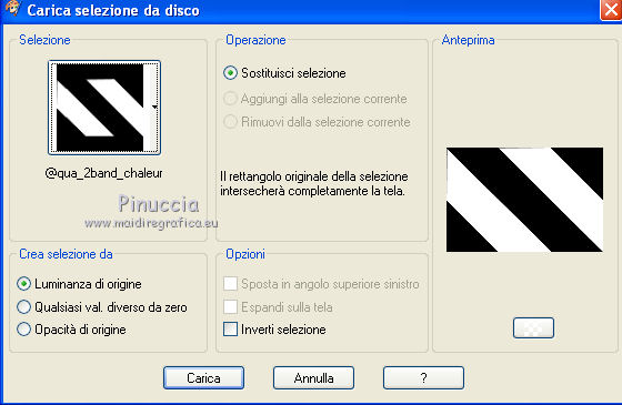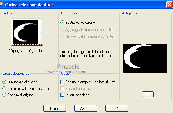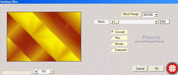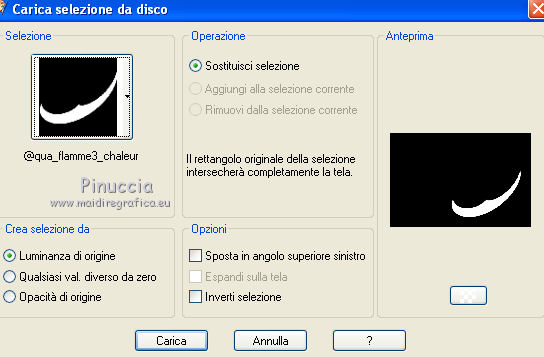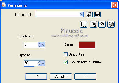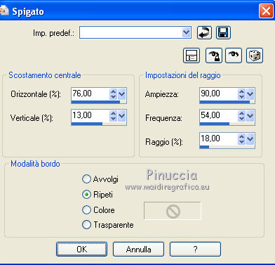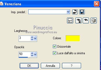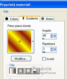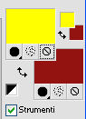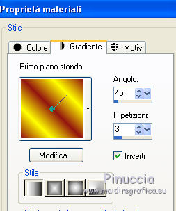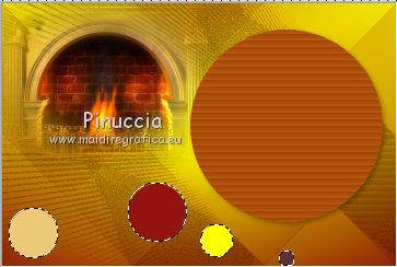 qui puoi trovare qualche risposta ai tuoi dubbi. Se l'argomento che ti interessa non è presente, ti prego di segnalarmelo. Questo tutorial è stato creato con PSP X3, ma può essere eseguito anche con le altre versioni di PSP. Per tradurlo, ho usato PSP X. Occorrente: Materiale qui Per il tube della donna grazie Tocha e per il tube del camino grazie Luna. Grazie a tutti i creatori di tubes per le loro immagini. Lascia intatto il nome del tube. Il © appartiene all'artista originale. Mantieni il credito di chi ha creato il tube. Filtri in caso di dubbi, ricorda di consultare la mia sezione filtri qui Mehdi qui ![]() Apri il font e minimizzalo. Lo troverai nella lista dei font disponibili quando ti servirà. Metti la maschera nella cartella Maschere. Metti le selezioni nella cartella Selezioni. Questa la paletta dei colori usati in questo tutorial. ![]() 1. Imposta il colore di primo piano con #ffff00, e il colore di sfondo con #921511. ![]() 2. Apri una nuova immagine trasparente 900 x 600 pixels. Effetti>Plugins>Mehdi - Wavy Lab i primi due colori devono essere i tuoi colori di sfondo e primo piano ![]() 3. Passa il colore di primo piano a Gradiente. ![]() Livelli>Nuovo livello raster. Riempi la selezione con il gradiente.4. Regola>Sfocatura>Sfocatura gaussiana - raggio 25. ![]() 5. Effetti>Plugins>Mehdi - Sorting Tiles. ![]() 6. Livelli>Duplica. Immagine>Rifletti. Abbassa l'opacità di questo livello al 50%. Livelli>Unisci>Unisci giù. 7. Effetti>Effetti di bordo>Aumenta di più. Cambia la modalità di miscelatura di questo livello in Moltiplica, e abbassa l'opacità al 50%. 8. Livelli>Nuovo livello raster. Selezione>Carica/Salva selezione>Carica selezione da disco. Cerca e carica la selezione @qua_2band_chaleur. ![]() Imposta il colore di primo piano con #ebc976, e riempi la selezione con il colore di primo piano.Selezione>Deseleziona. 9. Effetti>Effetti di trama>Veneziana, con il colore di sfondo #921511. ![]() 10. Cambia la modalità di miscelatura di questo livello in Moltiplica e abbassa l'opacità al 50%. 11. Effetti>Effetti di distorsione>Spigato. ![]() Effetti>Effetti di bordo>Aumenta di più. 12. Apri il tube lunapaisagem396 e vai a Modifica>Copia. Torna al tuo lavoro e vai a Modifica>Incolla come nuovo livello. 13. Livelli>Carica/Salva maschera>Carica maschera da disco. Cerca e carica la maschera 20-20. ![]() Livelli>Unisci>Unisci gruppo. 14. Di nuovo: Livelli>Carica/Salva maschera>Carica maschera da disco. La maschera 20-20 è già presente, devi soltanto cliccare Carica. Livelli>Unisci>Unisci gruppo. 15. Sposta il tube in alto a sinistra.16. Livelli>Nuovo livello raster. Selezione>Carica/Salva selezione>Carica selezione da disco. Cerca e carica la selezione @qua_1rond_chaleur. ![]() Riempi la selezione con il colore di sfondo #921511.Selezione>Deseleziona. 17. Effetti>Effetti di trama>Veneziana - con il colore #ffff00. ![]() 18. Effetti>Effetti 3D>Sfalsa ombra. ![]() 19. Livelli>Nuovo livello raster. Selezione>Carica/Salva selezione>Carica selezione da disco. Cerca e carica la selezione @qua_ronds_chaleur. ![]() 20. Imposta lo strumento Riempimento in modalità Valore RGB ![]() Riempi ogni cerchio con un colore differente,aggiungendo ogni volta, prima di riempire, un nuovo livello. ![]() 21. Su ogni livello applica l'Effetto Veneziana, e seguendo il colore, seleziona orizzontale o no, a tuo piacimento. Su ciascuno dei quattro livelli applica la modalità di miscelatura che più ti piace. Per tutti e quattro i livelli: abbassa l'opacità al 50%, e applica l'Effetto Sfalsa ombra, con i settaggi precedenti. 22. Attiva il livello superiore. Livelli>Nuovo livello raster. Selezione>Carica/Salva selezione>Carica selezione da disco. Cerca e carica la selezione @qua_cor1_chaleur. ![]() Imposta nuovamente il colore di primo piano con il colore #ffff00, e riempi la selezione con il colore di primo piano.Selezione>Deseleziona. 23. Effetti>Effetti 3D>Sfalsa ombra. ![]() 24. Livelli>Nuovo livello raster. Selezione>Carica/Salva selezione>Carica selezione da disco. Cerca e carica la selezione @qua_cor2_chaleur. ![]() Riempi la selezione con il colore #921511.Selezione>Deseleziona. 25. Effetti>Effetti 3D>Sfalsa ombra. ![]() 26. Livelli>Nuovo livello raster. Selezione>Carica/Salva selezione>Carica selezione da disco. Cerca e carica la selezione @qua_flamme1_chaleur. ![]() Riporta il colore di primo piano a Gradiente. ![]() Riempi la selezione con questo gradiente.Selezione>Deseleziona. 27. Effetti>Effetti di trama>Veneziana - con il colore #921511. ![]() 28. Abbassa l'opacità di questo livello al 50%. 29. Effetti>Effetti 3D>Sfalsa ombra, con i settaggi precedenti. 30. Livelli>Nuovo livello raster. Selezione>Carica/Salva selezione>Carica selezione da disco. Cerca e carica la selezione @qua_flamme2_chaleur. ![]() 31. Cambia i settaggi del gradiente, selezionando Inverti. ![]() Riempi la selezione con il gradiente.Selezione>Deseleziona. 32. Effetti>Effetti di trama>Veneziana, con i settaggi precedenti. Effetti>Effetti 3D>Sfalsa mbra, con i settaggi precedenti. 33. Livelli>Nuovo livello raster. Selezione>Carica/Salva selezione>Carica selezione da disco. Cerca e carica la selezione @qua_flamme3_chaleur. ![]() Riempi la selezione con il gradiente.Selezione>Deseleziona. 34. Effetti>Effetti di trama>Veneziana, con i settaggi precedenti. Abbassa l'opacità di questo livello al 75%. 35. Effetti>Effetti 3D>Sfalsa ombra, con i settaggi precedenti. 36. Apri il tube Tocha 23622, e vai a Modifica>Copia. Torna al tuo lavoro e vai a Modifica>Incolla come nuovo livello. Immagine>Ridimensiona, al 50%, tutti i livelli non selezionato. Posiziona il tube a destra, come nel mio esempio.37. Effetti>Effetti 3D>Sfalsa ombra. ![]() 38. Immagine>Aggiungi bordatura, 2 pixels, simmetriche, con il colore #921511. Immagine>Aggiungi bordatura, 35 pixels, simmetriche, con il colore #ffff00. Seleziona questo bordo con la bacchetta magica ![]() 39. Livelli>Nuovo livello raster. Riempi la selezione con il gradiente.Selezione>D