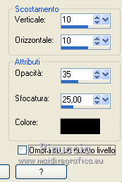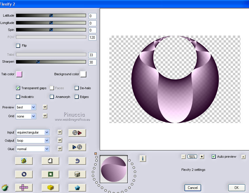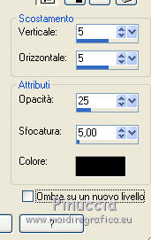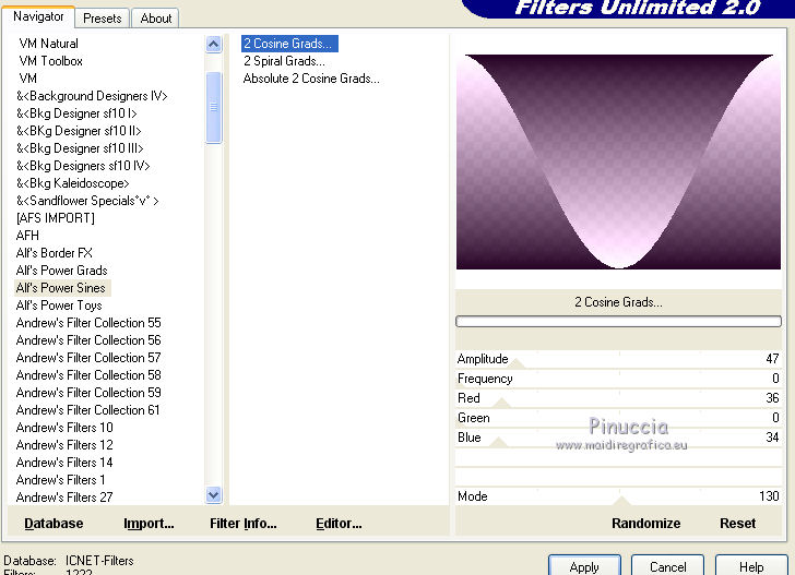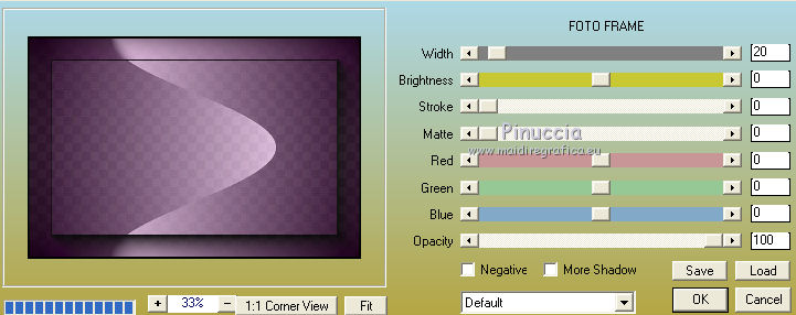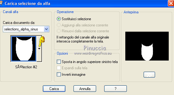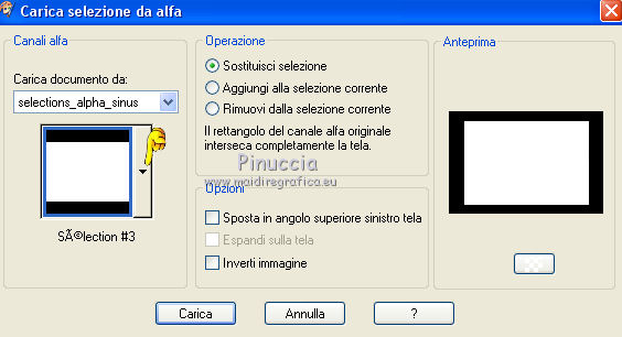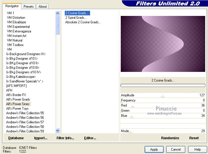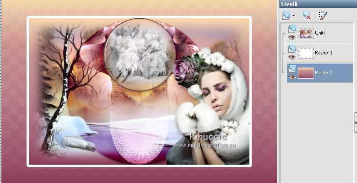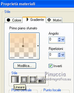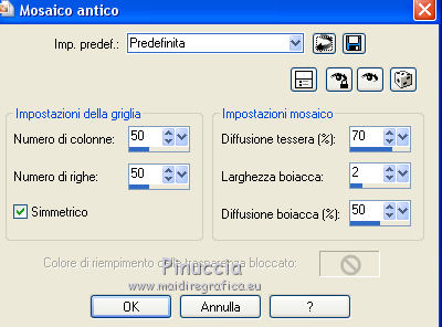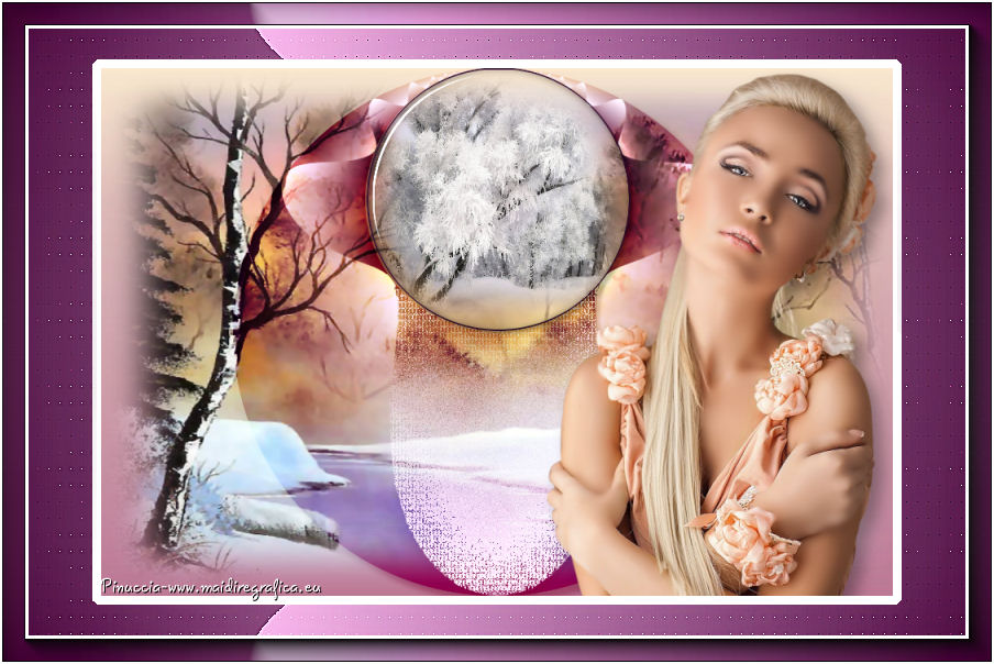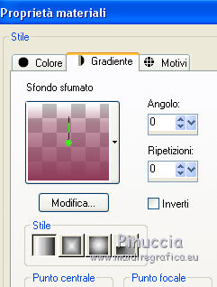 qui puoi trovare qualche risposta ai tuoi dubbi. Se l'argomento che ti interessa non è presente, ti prego di segnalarmelo. Questo tutorial è stato creato con CorelX7, ma può essere realizzato anche con le altre versioni di PSP. Dalla versione X4, il comando Immagine>Rifletti è stato sostituito con Immagine>Capovolgi in orizzontale, e il comando Immagine>Capovolgi con Immagine>Capovolgi in verticale. Nelle versioni X5 e X6, le funzioni sono state migliorate rendendo disponibile il menu Oggetti. Con la nuova versione X7, sono tornati Rifletti/Capovolgi, ma con nuove funzioni. Vedi la scheda sull'argomento qui Per tradurre questo tutorial ho usato PSP X. Occorrente: Materiale qui Per i tubes grazie Maryse, Min@ e Sorensen. Filtri in caso di dubbi, ricorda di consultare la mia sezione filtri qui Filters Unlimited 2.0 qui Alf's Power Sines - 2Cosine Grads qui L&K's - L&K's Zitah qui Alien Skin Eye Candy 5 Impact - Glass qui AAA Frames - Foto Frame qui Flaming Pear - Flexify 2 qui I filtri Alf's Power Sines si possono usare da soli o importati in Filters Unlimited (come fare vedi qui) Se un filtro fornito appare con questa icona A seconda della versione di Unlimited utilizzata potresti ottenere risultati differenti. Per il mio esempio, per avere un risultato simile a quello del tutorial originale, ho usato la versione di Unlimited che non si installa, ma è composta da files in formato 8bf. La trovi qui ![]() Se utilizzi altri tubes e/o altri colori, puoi sperimentare le modalità di miscelatura e opacità più adatte. Metti il preset Cliccando sul file una o due volte (a seconda delle tue impostazioni), automaticamente il preset si installerà nella cartella corretta. perchè uno o due clic vedi qui 1. Imposta il colore di primo piano con #f8d6ab, e il colore di sfondo con #8c3c58. ![]() 2. Apri selections_alpha_sinus. Duplica l'immagine usando la combinazione di tasti maiuscola+D, oppure Modifica>Copia/Modifica>Incolla come nuova immagine. Chiudi l'originale e lavora sulla copia. L'immagine non è vuota, ma contiene le selezioni salvate sul canale alfa. 2. Selezione>Seleziona tutto. Apri il tube Sorensen_DesignsMistjan137-10 e vai a Modifica>Copia. Torna al tuo lavoro e vai a Modifica>Incolla nella selezione. Selezione>Deseleziona. 3. Livelli>Nuovo livello raster. Livelli>Disponi>Sposta giù. 4. Passa il colore di primo piano a Gradiente, e seleziona il gradiente primo piano sfumato, stile Lineare. ![]() Passa il colore di sfondo a Gradiente, e seleziona il gradiente sfondo sfumato, stile Lineare. ![]() ![]() 5. Riempi il livello cliccando con il tasto sinistro per riempire con il gradiente di primo piano,e poi clicca con il tasto destro del riempire con il gradiente di sfondo. (e avrai il gradiente di primo piano in alto e il gradiente di sfondo in basso). ![]() 6. Livelli>Duplica. Livelli>Disponi>Porta in alto. 7. Effetti>Plugins>Filters Unlimited 2.0 - Alf's Power Sines - 2 Cosine Grads ![]() 8. Effetti>Plugins>Flaming Pear - Flexify 2. ![]() 9. Effetti>Effetti 3D>Sfalsa ombra. ![]() 10. Cambia la modalità di miscelatura di questo livello in Sovrapponi. ![]() 11. Livelli>Nuovo livello raster. Selezione>Carica/Salva selezione>Carica selezione da canale alfa. La selezione sélection#1 è subito disponibile. Devi soltanto cliccare Carica. ![]() 12. Imposta il colore di primo piano con il colore bianco, e il colore di sfondo con il colore scuro #361233. ![]() 13. Riempi la selezione con il colore scuro di sfondo #361233.Selezione>Modifica>Contrai - 2 pixels. ![]() Premi sulla tastiera il tasto CANC ![]() 14. Apri il tube Mina-inverno04-10.11.13 e vai a Modifica>Copia. Torna al tuo lavoro e vai a Modifica>Incolla nella selezione. 15. Effetti>Plugins>Alien Skin Eye Candy 5 Impact - Glass. Seleziona il preset @qua_21 e ok. ![]() Questi i settaggi che puoi copiare in caso di problemi con il preset. ![]() 16. Effetti>Effetti 3D>Sfalsa ombra. ![]() Selezione>Deseleziona. 17. Attiva nuovamente il livello Copia di Raster 2. ![]() 18. Selezione>Carica/Salva selezione>Carica selezione da canale alfa. Apri il menu delle selezioni e carica sélection#2. ![]() 19. Effetti>Effetti di trama>Mosaico antico, con i settaggi standard. ![]() 20. Effetti>Effetti 3D>Sfalsa ombra, con i settaggi precedenti. ![]() Selezione>Deseleziona. 21. Attiva nuovamente il livello superiore. Apri il tube MR_Winter Woman with Hooded Cotton 1, e vai a Modifica>Copia. Torna al tuo lavoro e vai a Modifica>Incolla come nuovo livello. Immagine>Ridimensiona, al 60%, tutti i livelli non selezionato. Sposta il tube in basso a destra.![]() 22. Effetti>Effetti 3D>Sfalsa ombra. ![]() 23. Attiva il livello inferiore - Raster 2. Livelli>Duplica. Chiudi il livello Raster 2. ![]() Livelli>Unisci>Unisci visibile. 24. Immagine>Ridimensiona, all'80%, tutti i livelli non selezionato. 25. Selezione>Carica/Salva selezione>Carica selezione da canale alfa. Apri il menu delle selezioni e carica sélection#3. ![]() 26. Livelli>Nuovo livello raster. Livelli>Disponi>Sposta giù. Selezione>Modifica>Espandi - 4 pixels. ![]() Riempi la selezione con il colore bianco #ffffff.Selezione>Deseleziona. 27. Riapri e attiva il livello Raster 2. ![]() Effetti>Plugins>Filters Unlimited 2.0 - Alf's Power Sines - 2Cosine Grads. ![]() se stai usando altri colori, gioca sui settaggi Red, Green e Blue. 28. Effetti>Plugins>L&K's - L&K's Zitah. ![]() Regola>Messa a fuoco>Accentua messa a fuoco. 29. Effetti>Plugins>AAA Frames - Foto Frame. ![]() 30. Firma il tuo lavoro. 31. Immagine>Aggiungi bordatura, 2 pixels, simmetriche, colore bianco. Salva in formato jpg. Per questo esempio ho usato un tube di Min@ ![]() ![]() Le vostre versioni. Grazie ![]() Olimpia ![]() Rossella ![]() Se hai problemi o dubbi, o trovi un link non funzionante, o anche soltanto per un saluto, scrivimi. 14 Febbraio 2015 |